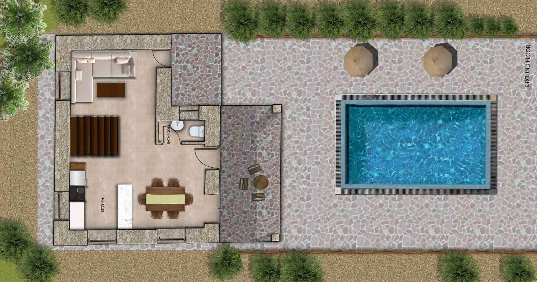 The outdoor area of the villa is a true paradise, thoughtfully designed to offer maximum privacy and comfort. Enjoy your private swimming pool, relaxing lounge area, and a range of amenities that keep both adults and children entertained throughout the day.