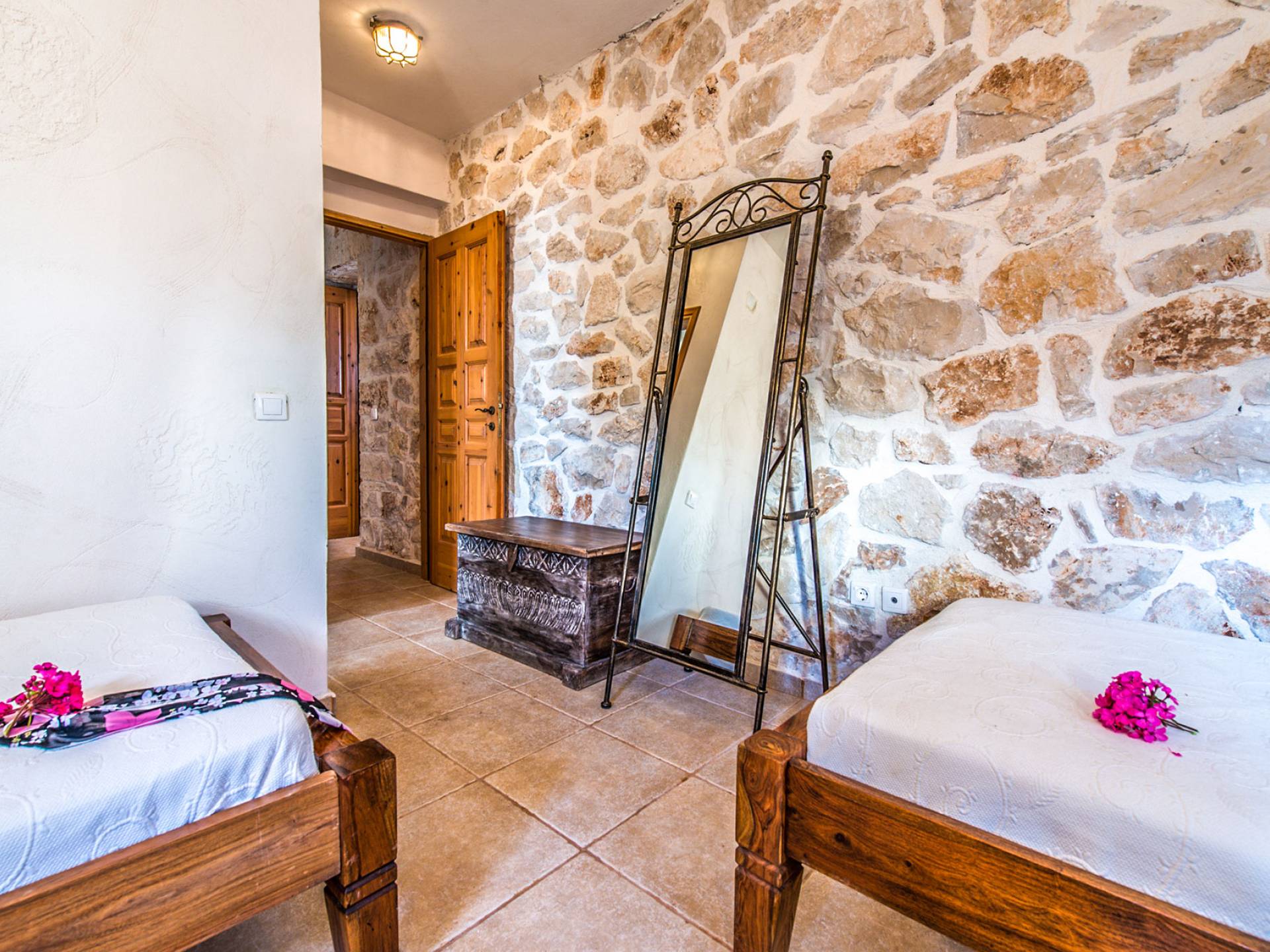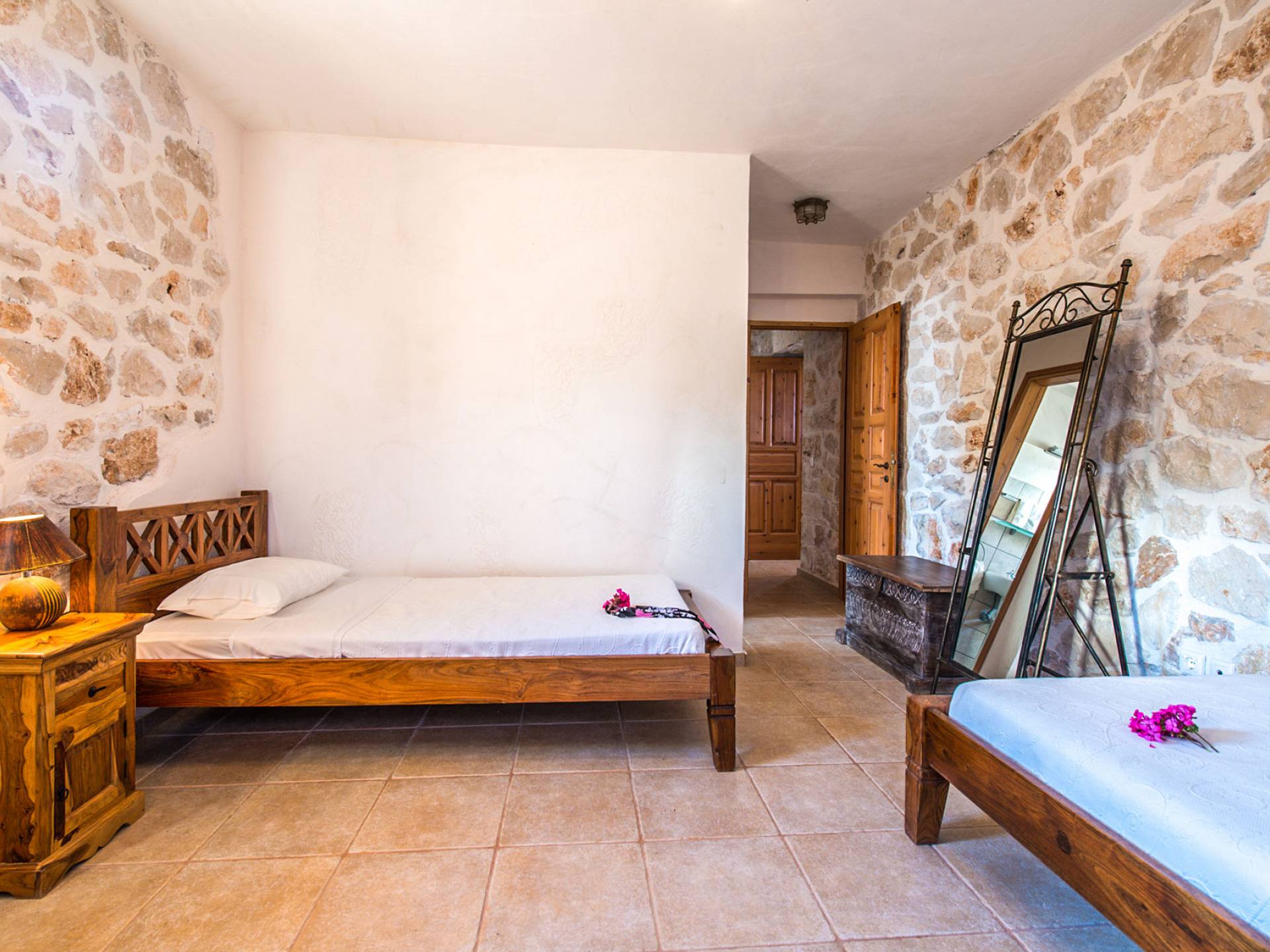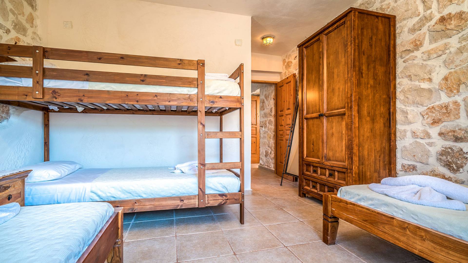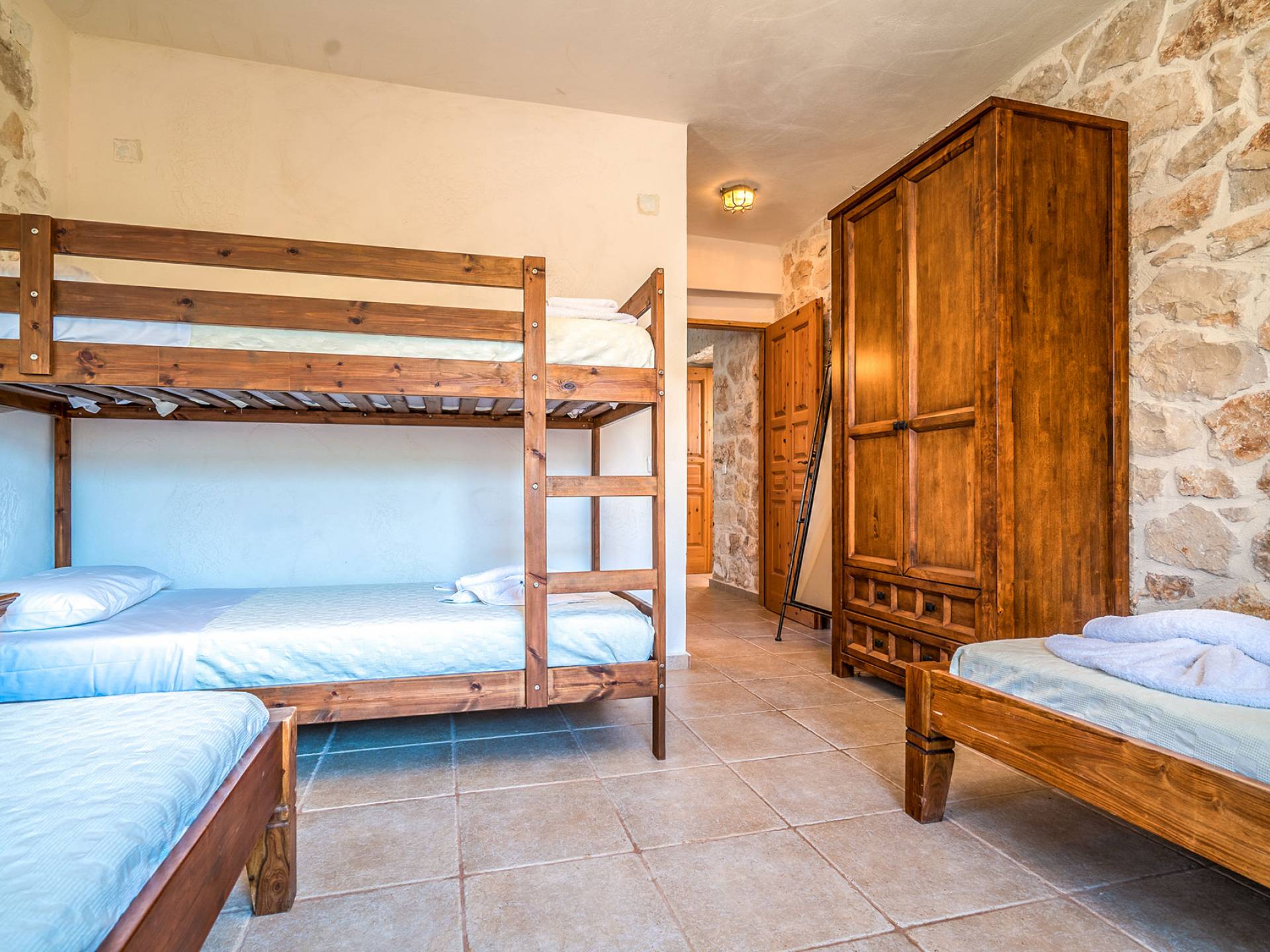 Πρώτος όροφος: Δίκλινο υπνοδωμάτιο με ιδιωτικό ντους. Ισόγειο: Δίκλινο υπνοδωμάτιο με ιδιωτικό μπάνιο. Δίκλινο υπνοδωμάτιο με 2 μονά κρεβάτια, 2 μονά κρεβάτια, 1 κουκέτα και ιδιωτικό μπάνιο με ντους.