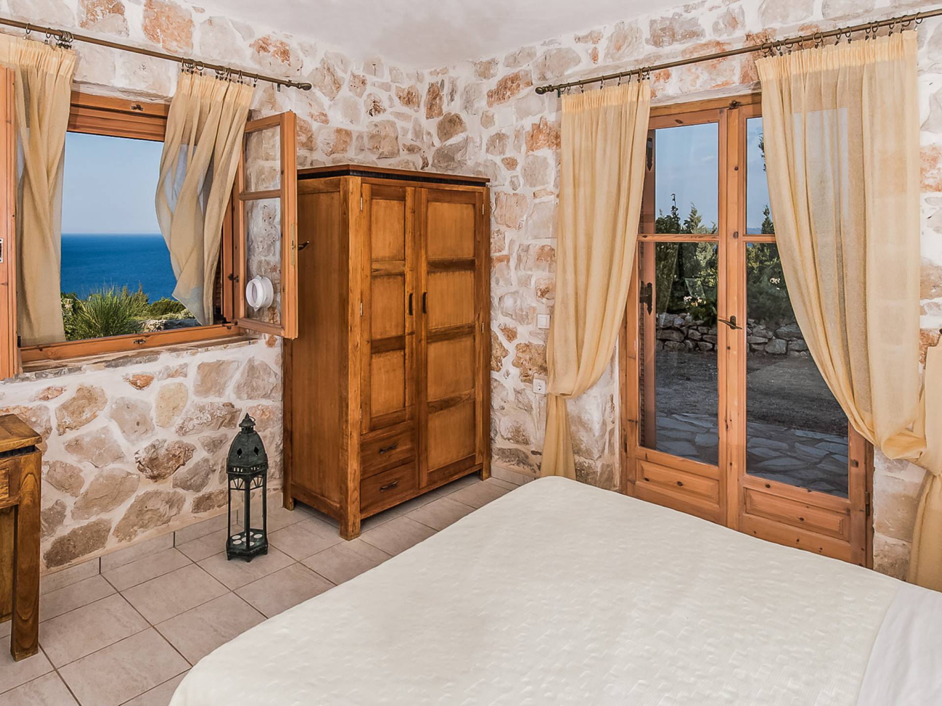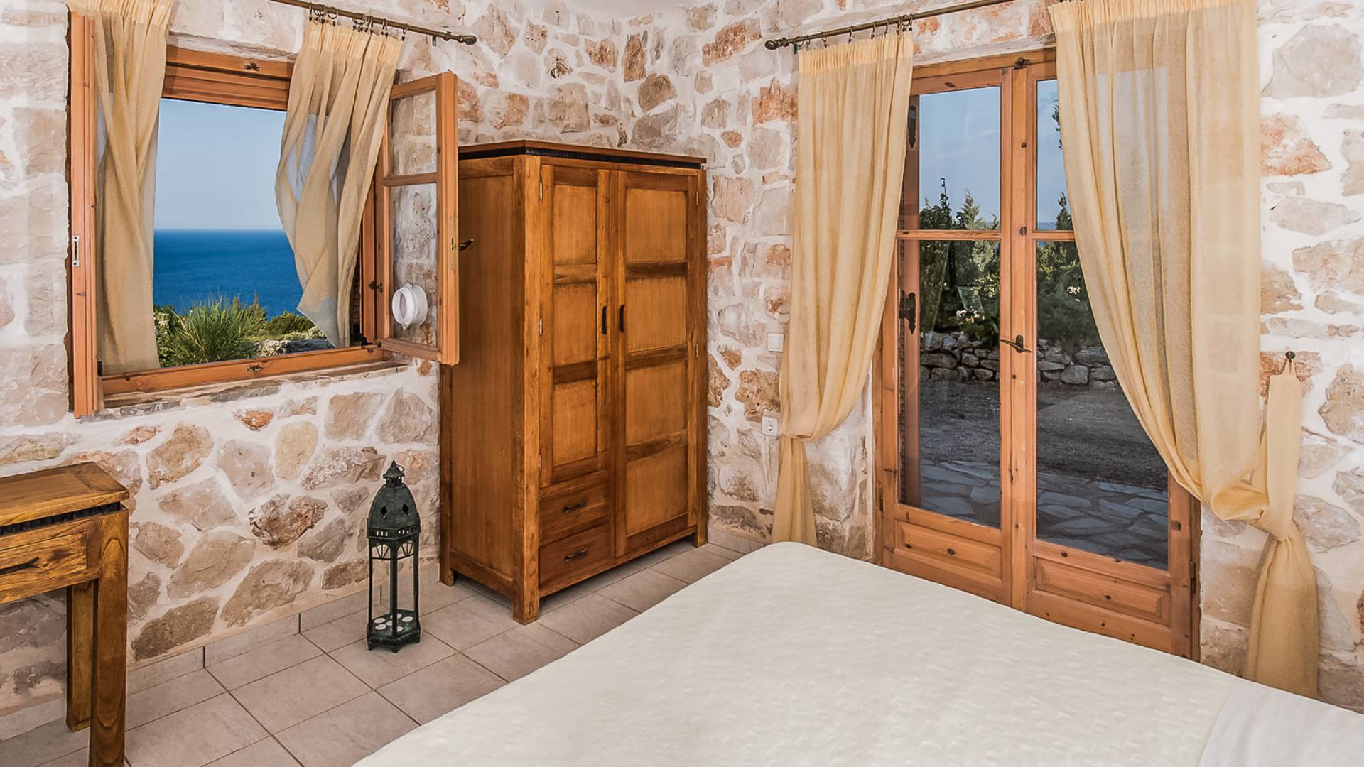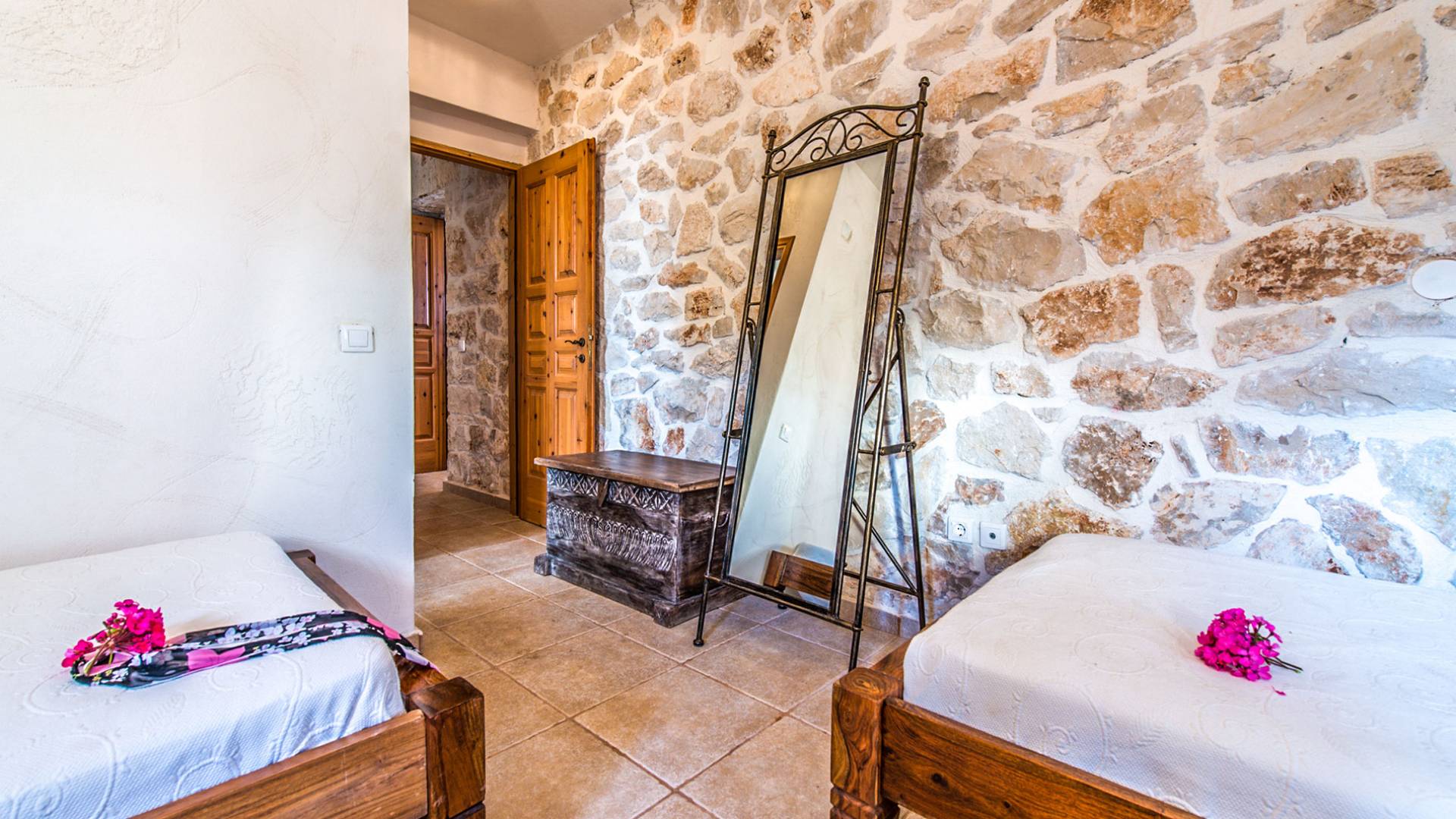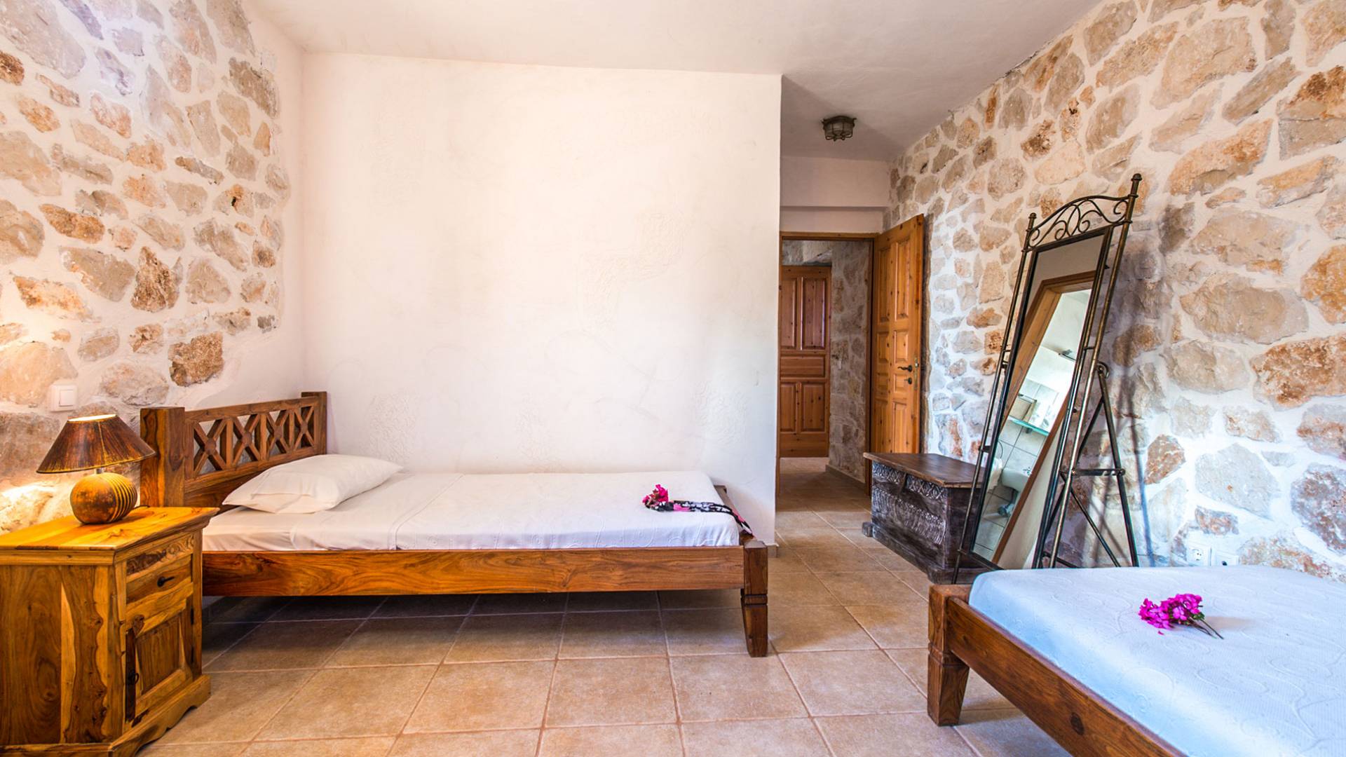 Πρώτος όροφος: Δίκλινο υπνοδωμάτιο με ιδιωτικό ντους. Ισόγειο: Δίκλινο υπνοδωμάτιο με ιδιωτικό μπάνιο. Δίκλινο υπνοδωμάτιο με 2 μονά κρεβάτια, 2 μονά κρεβάτια, 1 κουκέτα και ιδιωτικό μπάνιο με ντους.