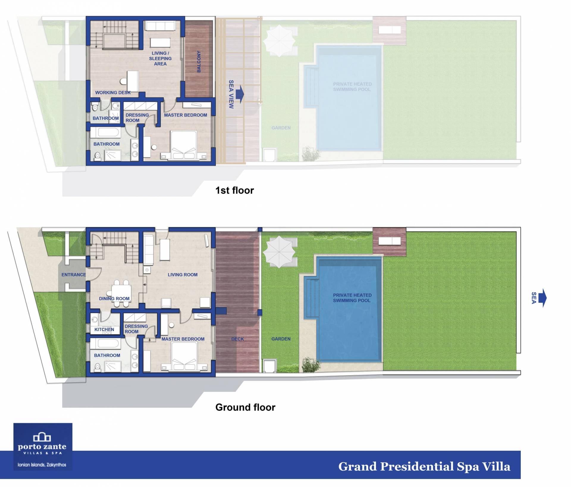 Αυτή η πολυτελής βίλα αποτελείται από μια είσοδο, δύο κύρια υπνοδωμάτια με king-size κρεβάτια, δύο ιδιωτικά μαρμάρινα μπάνια με μπανιέρα τζακούζι και ξεχωριστή καμπίνα ντους με συσκευές υδραυλικού πίδακα, γκαρνταρόμπα, Πολυτελώς διακοσμημένος χώρος καθιστικού και τραπεζαρίας, ένα επιπλέον ξεχωριστό καθιστικό (1ος όροφος) που μπορεί να μετατραπεί σε χώρο ύπνου για 2 παιδιά ή 1 ενήλικα και έχει πρόσβαση στο δικό του ξεχωριστό 3ο μπάνιο, μια προσωπική επιφάνεια εργασίας με iMac Desktop και μια μικρή πλήρως εξοπλισμένη κουζίνα.