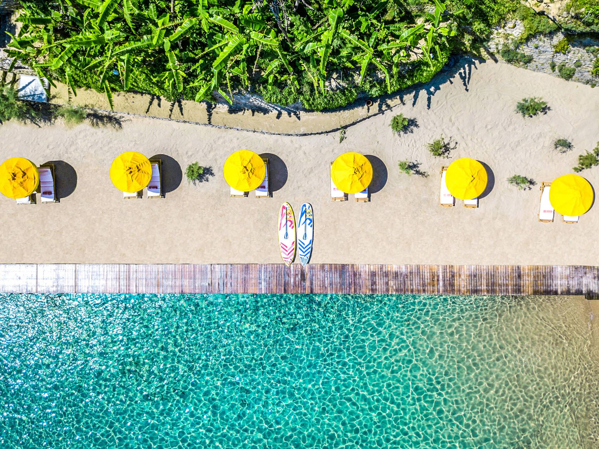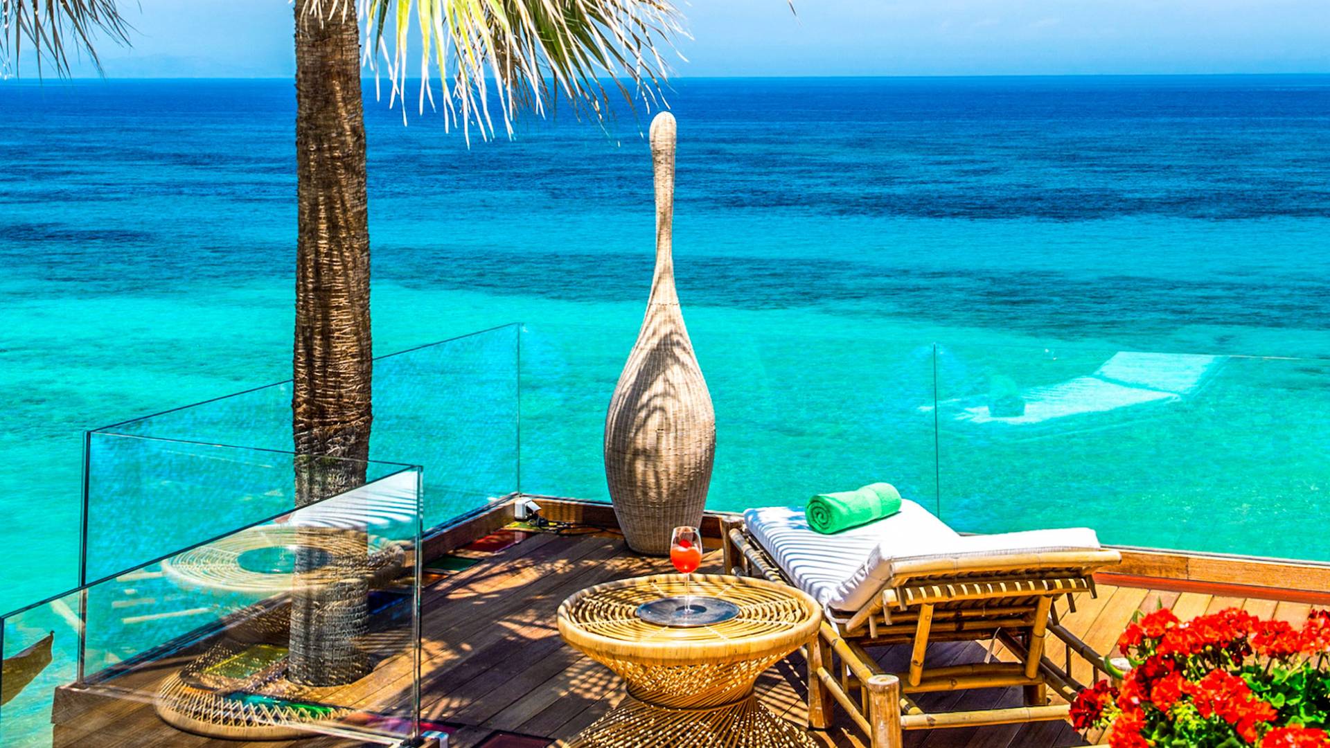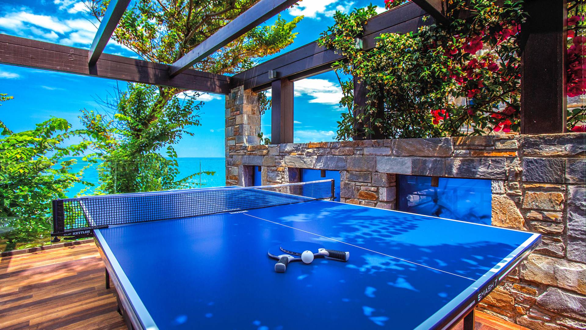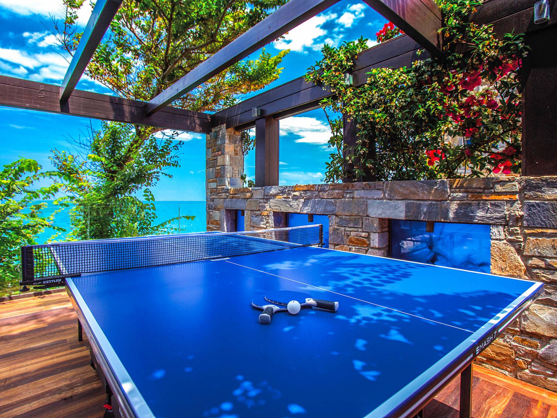 Από το υπνοδωμάτιο και το σαλόνι (ισόγειο), οι πανοραμικές γυάλινες πόρτες οδηγούν σε ένα ιδιωτικό κατάστρωμα που έχει πρόσβαση σε ιδιωτική πισίνα ελεγχόμενης θερμοκρασίας και έναν όμορφα διαμορφωμένο τροπικό κήπο με ξαπλώστρες, έπιπλα κήπου από ξύλο τικ, υπαίθριο ντους και τραπεζαρία.