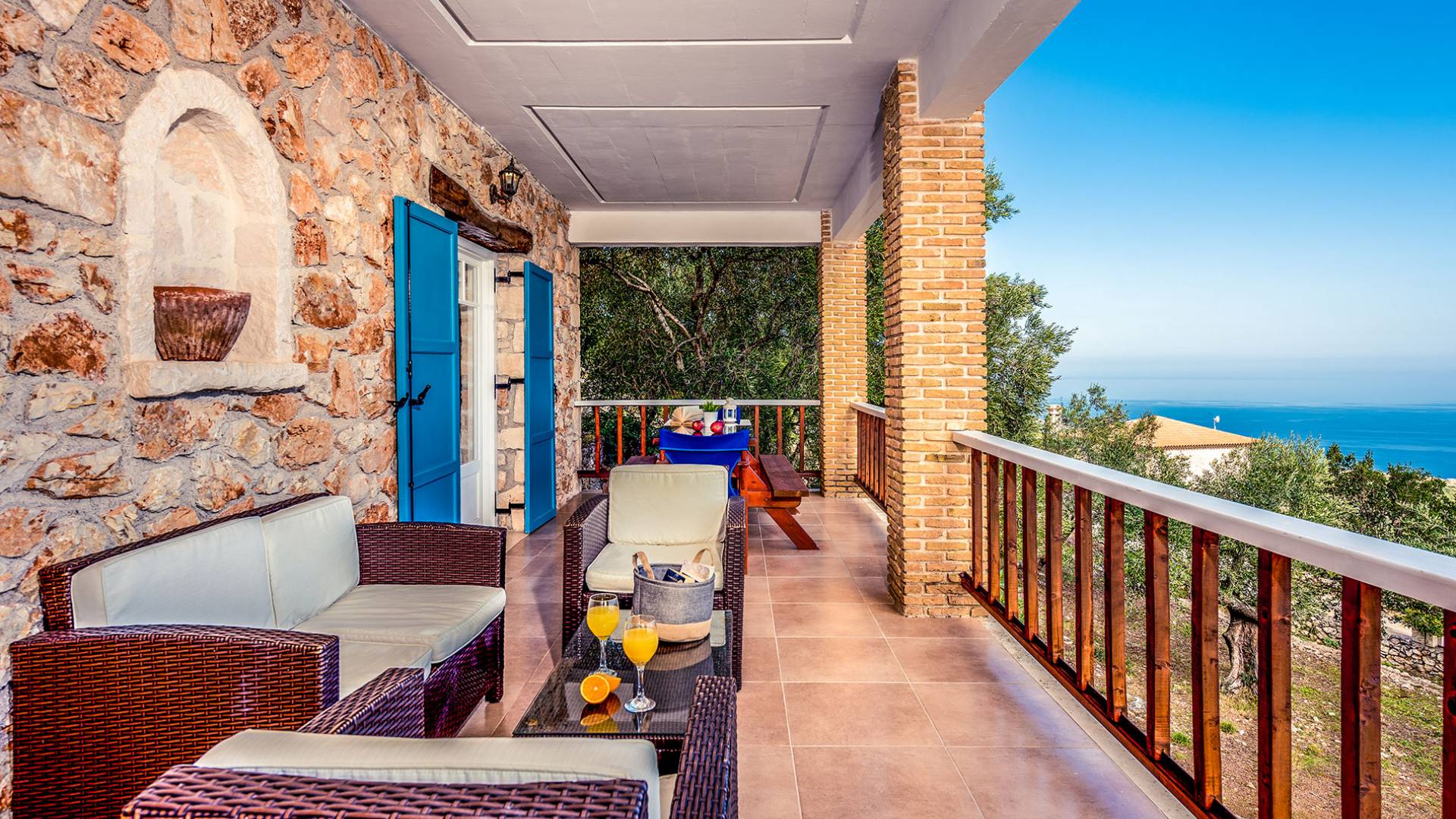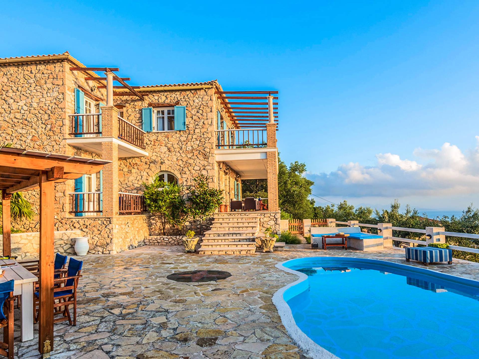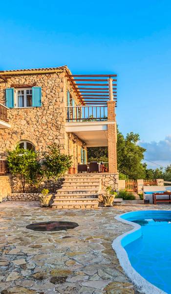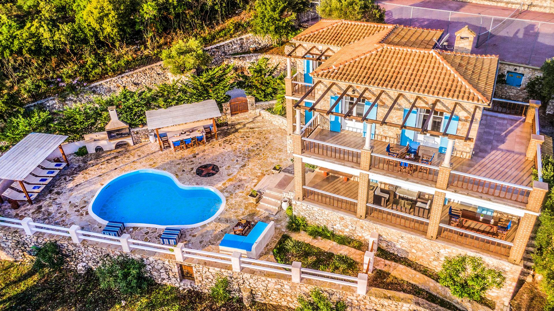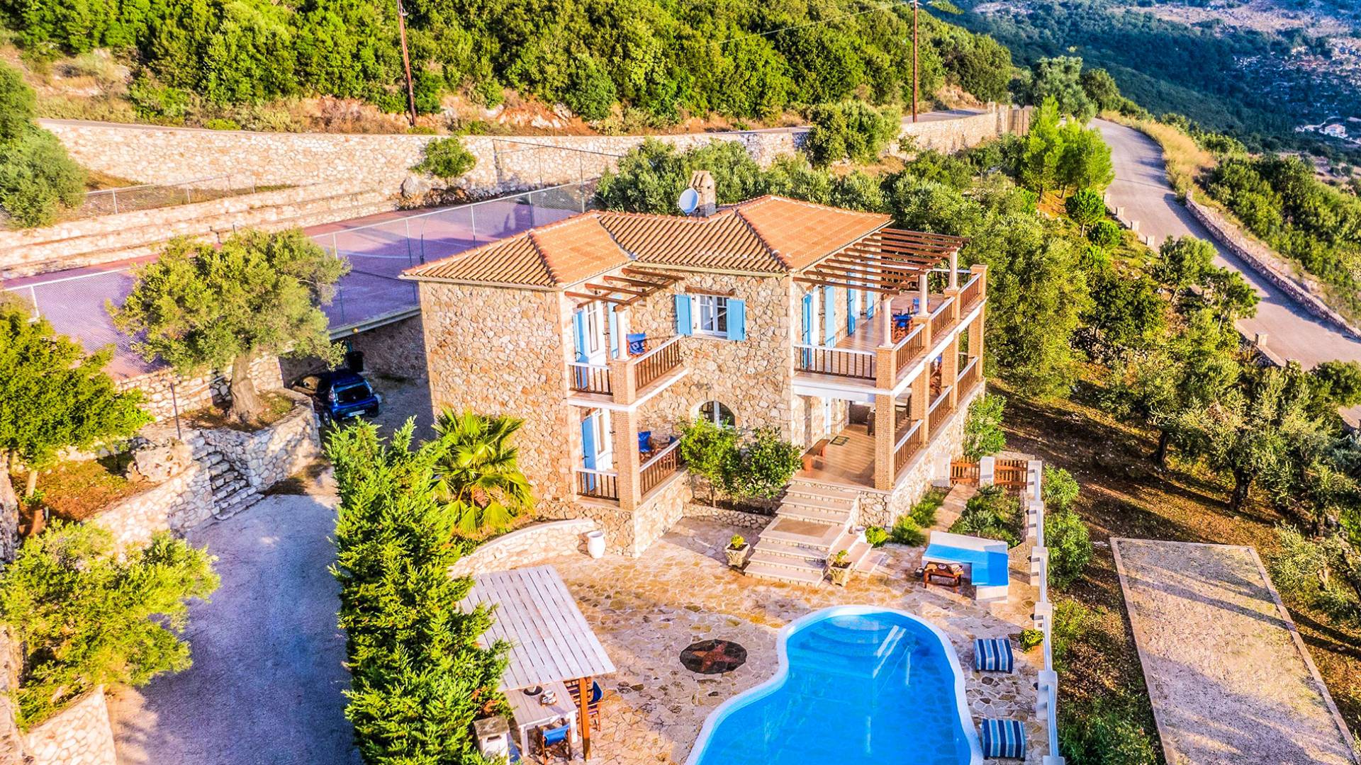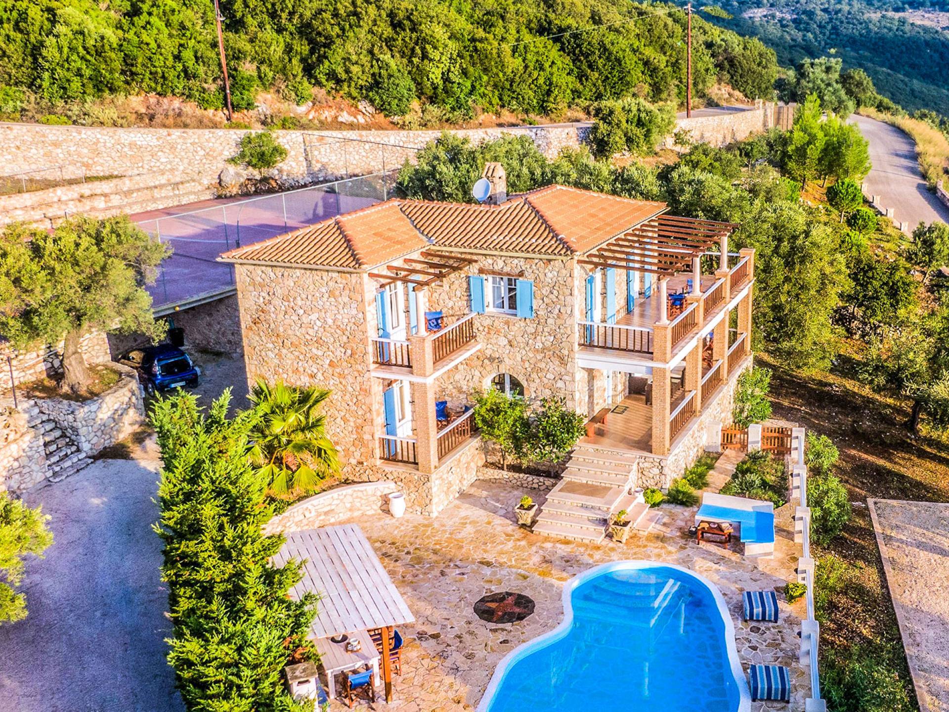 Στο ισόγειο υπάρχει μια πλήρως εξοπλισμένη κουζίνα με όλες τις απαραίτητες συσκευές και σκεύη, σαλόνι με τζάκι, τραπεζαρία, υπνοδωμάτιο με διπλό κρεβάτι και μπάνιο. Υπάρχει έξοδος στη βεράντα από το σαλόνι, με υπέροχη θέα στο Ιόνιο Πέλαγος και την πισίνα. Υπάρχουν 2 υπνοδωμάτια στον πρώτο όροφο, με δικό τους μπαλκόνι και θέα στη θάλασσα και την πισίνα, ενώ το μεγάλο υπνοδωμάτιο διαθέτει υδρομασάζ.