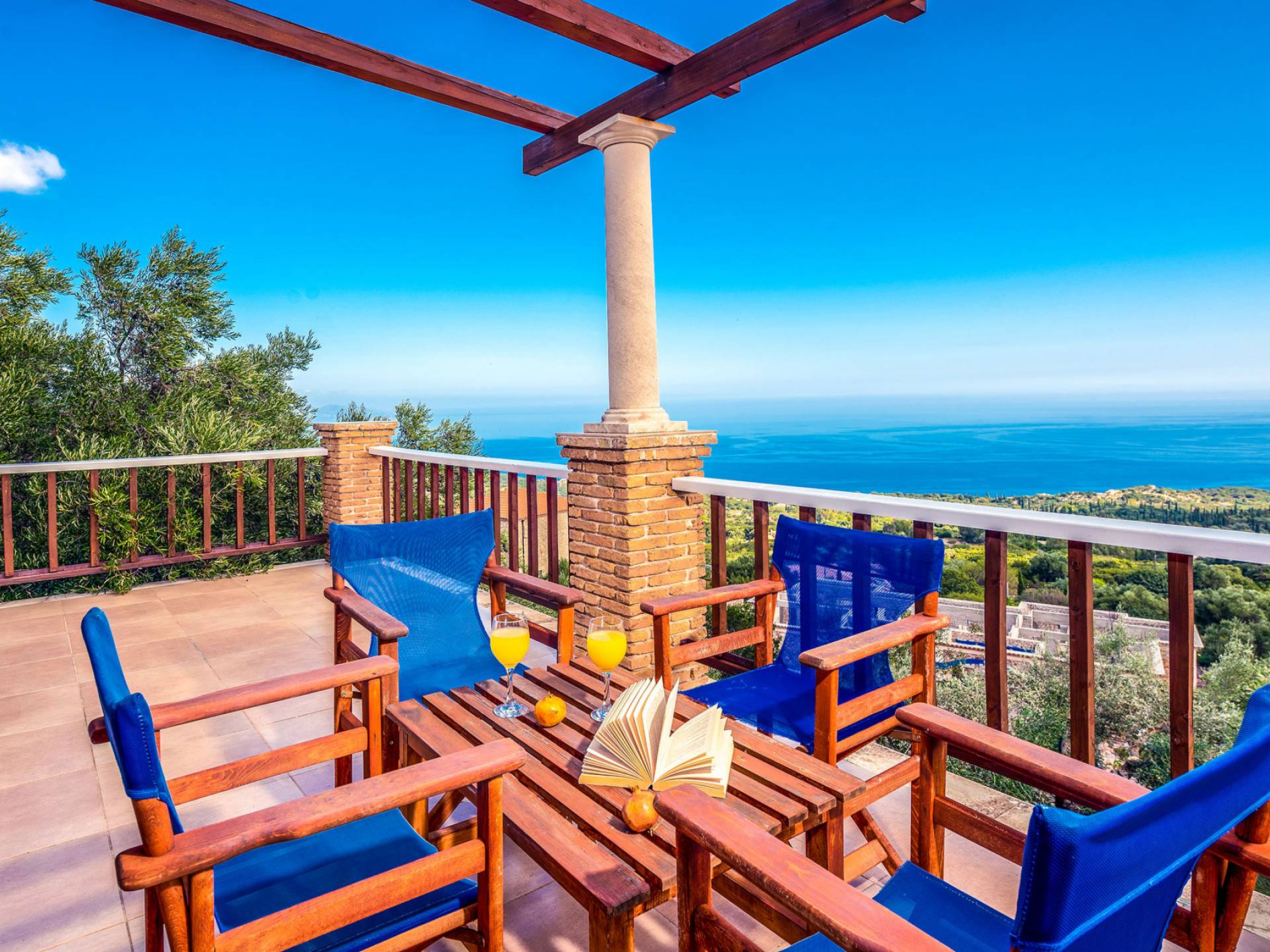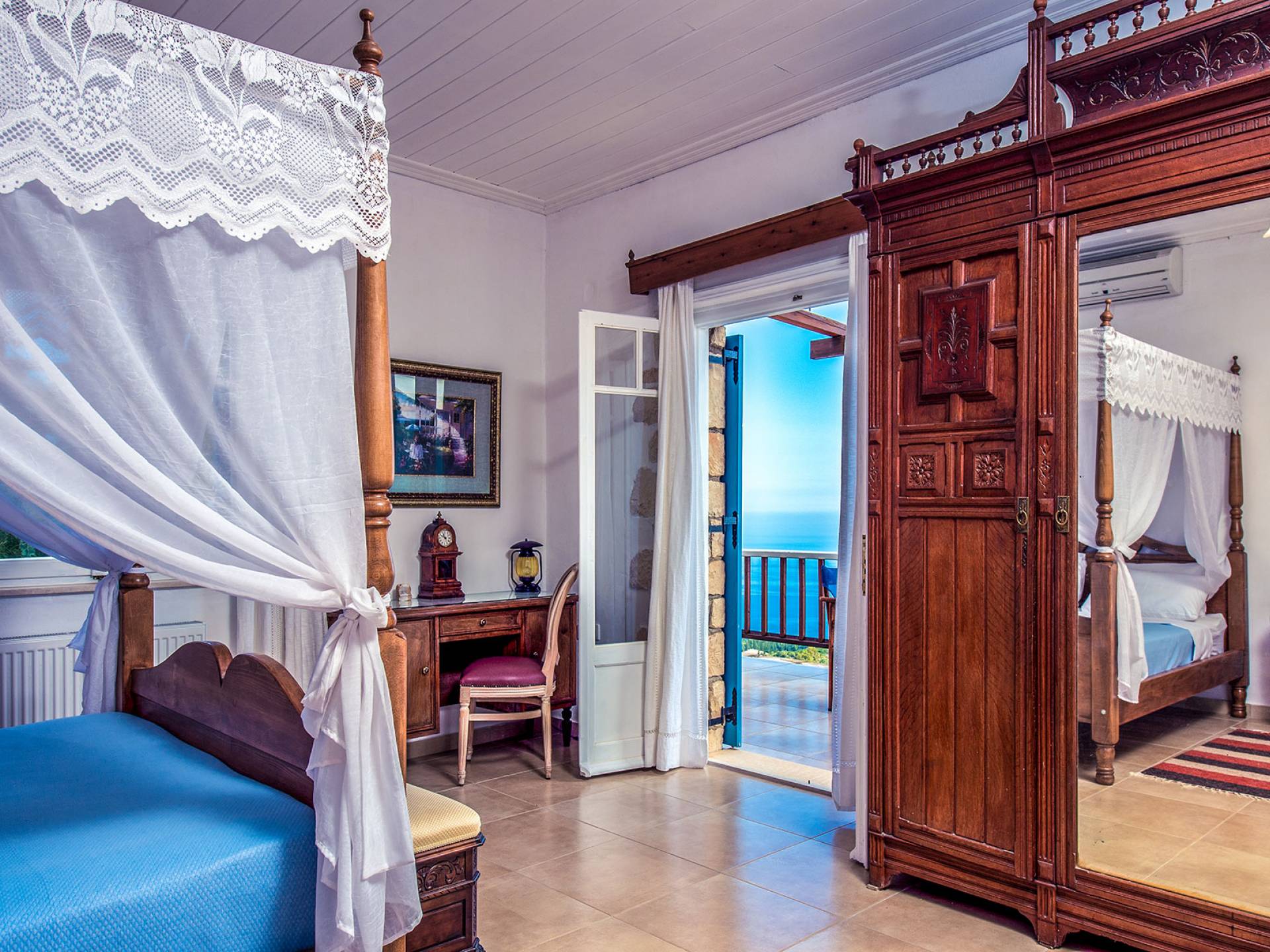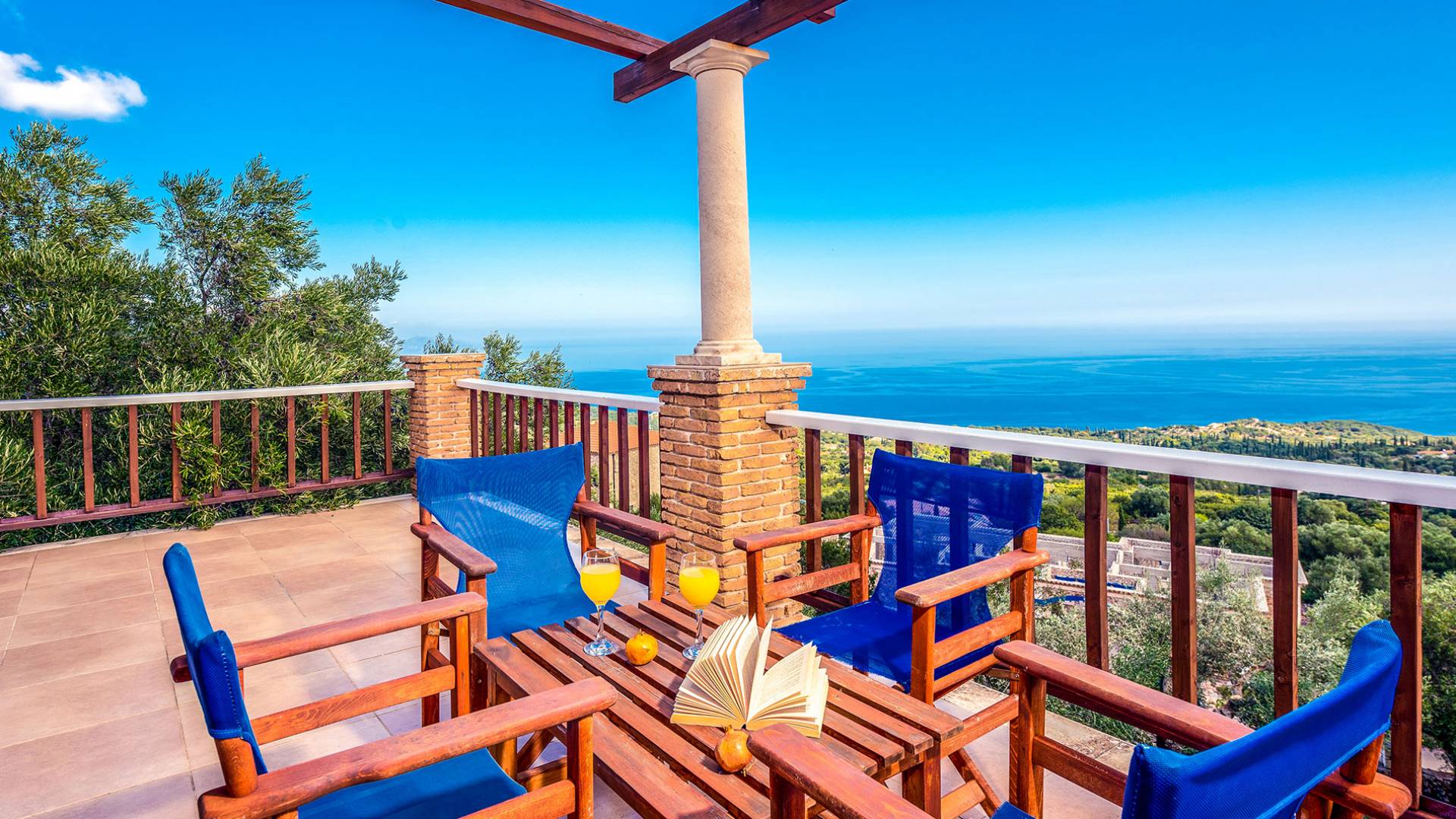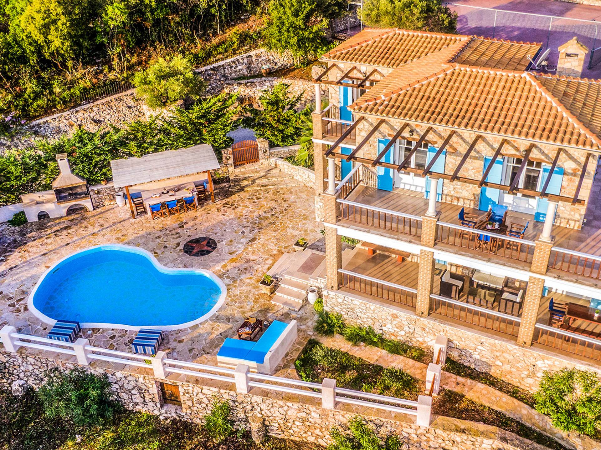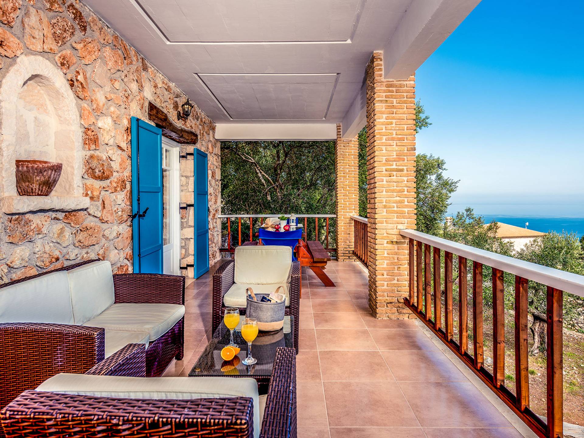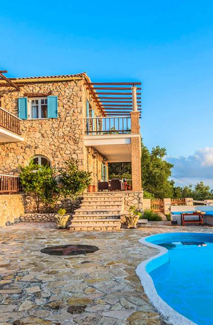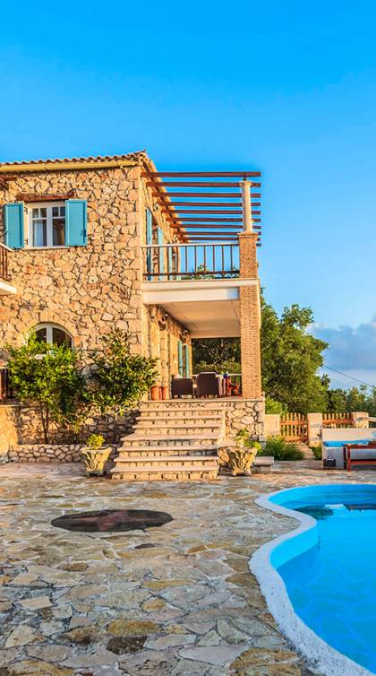 Στο ισόγειο υπάρχει μια πλήρως εξοπλισμένη κουζίνα με όλες τις απαραίτητες συσκευές και σκεύη, σαλόνι με τζάκι, τραπεζαρία, υπνοδωμάτιο με διπλό κρεβάτι και μπάνιο. Υπάρχει έξοδος στη βεράντα από το σαλόνι, με υπέροχη θέα στο Ιόνιο Πέλαγος και την πισίνα. Υπάρχουν 2 υπνοδωμάτια στον πρώτο όροφο, με δικό τους μπαλκόνι και θέα στη θάλασσα και την πισίνα, ενώ το μεγάλο υπνοδωμάτιο διαθέτει υδρομασάζ.