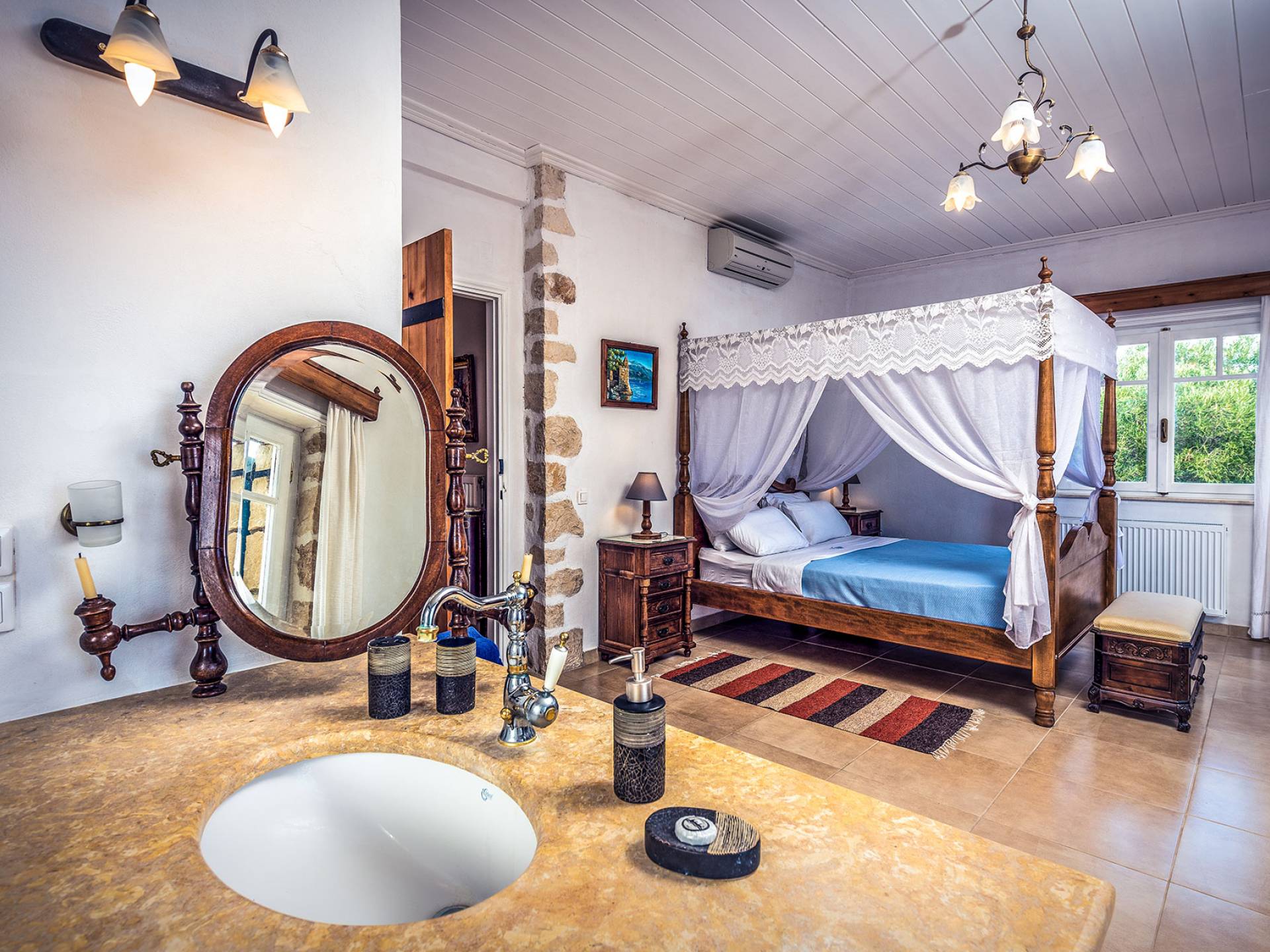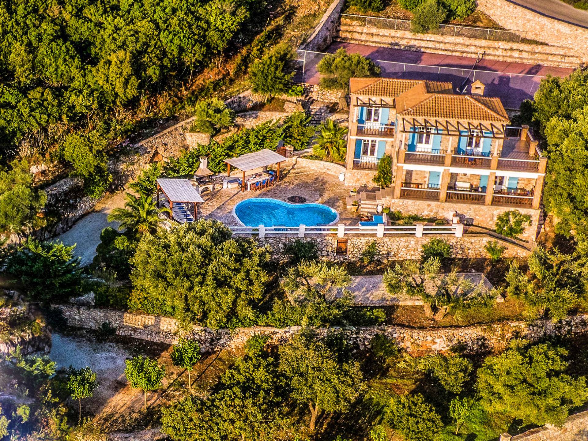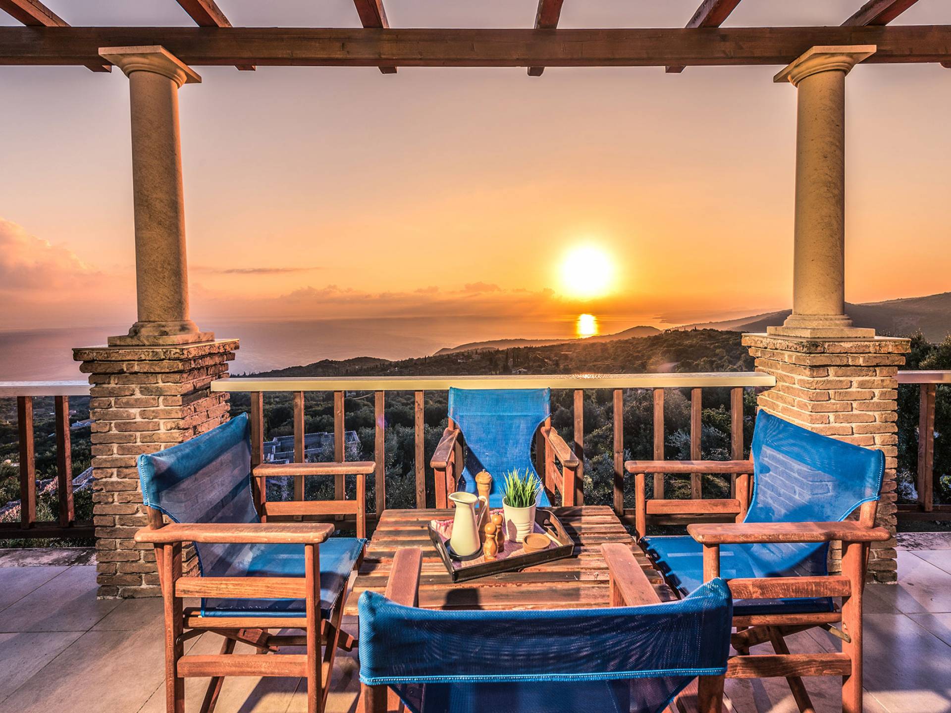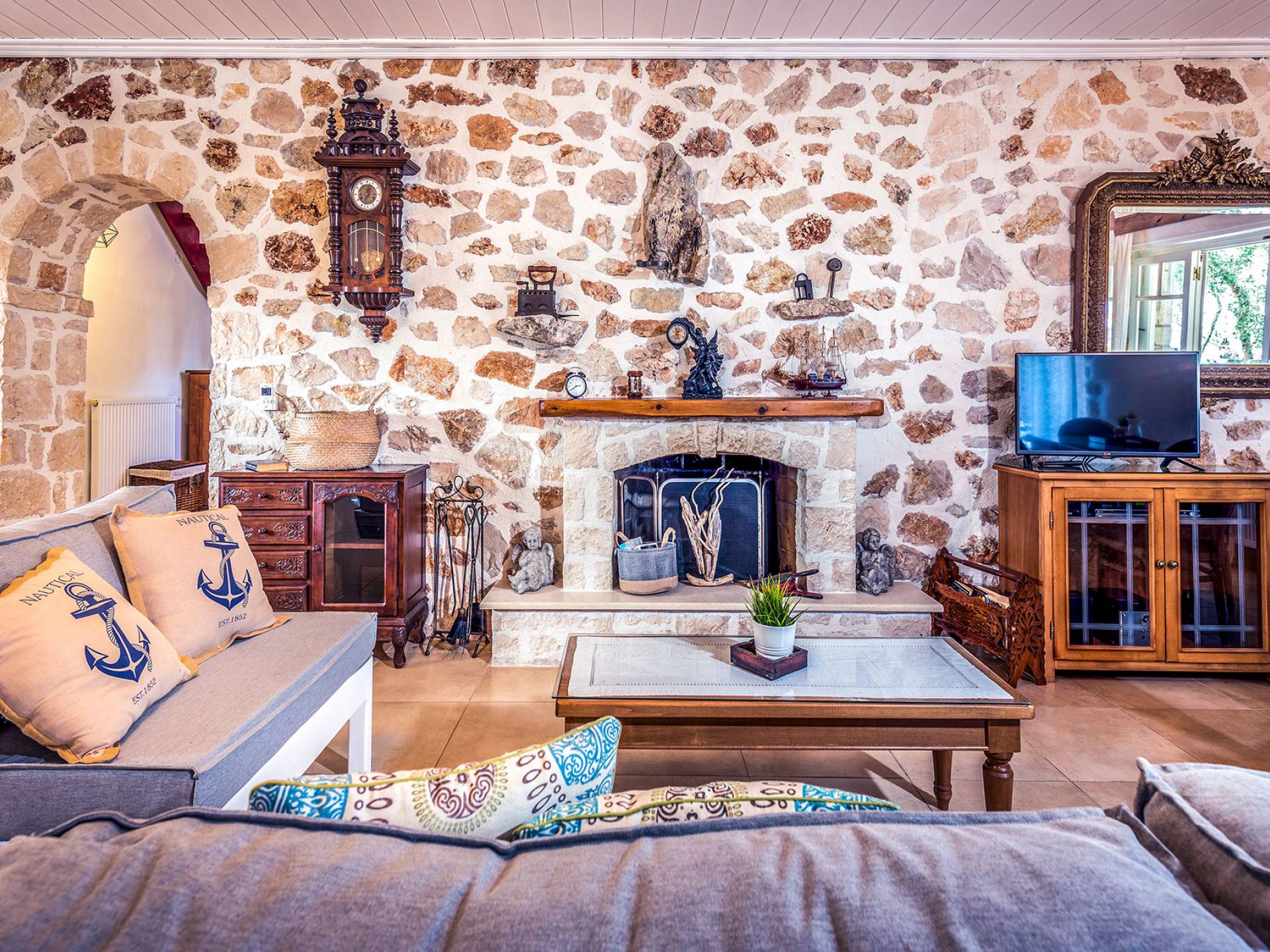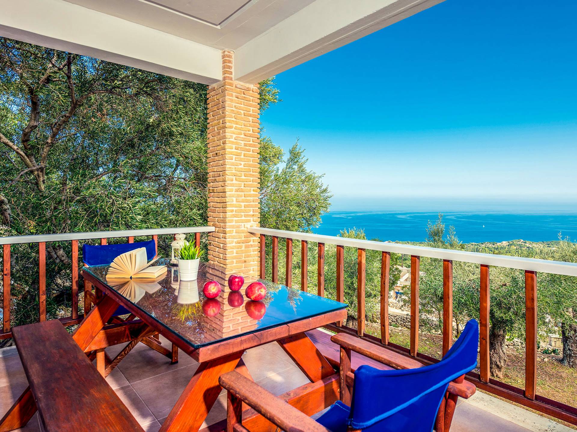 Στο ισόγειο υπάρχει μια πλήρως εξοπλισμένη κουζίνα με όλες τις απαραίτητες συσκευές και σκεύη, σαλόνι με τζάκι, τραπεζαρία, υπνοδωμάτιο με διπλό κρεβάτι και μπάνιο. Υπάρχει έξοδος στη βεράντα από το σαλόνι, με υπέροχη θέα στο Ιόνιο Πέλαγος και την πισίνα. Υπάρχουν 2 υπνοδωμάτια στον πρώτο όροφο, με δικό τους μπαλκόνι και θέα στη θάλασσα και την πισίνα, ενώ το μεγάλο υπνοδωμάτιο διαθέτει υδρομασάζ.