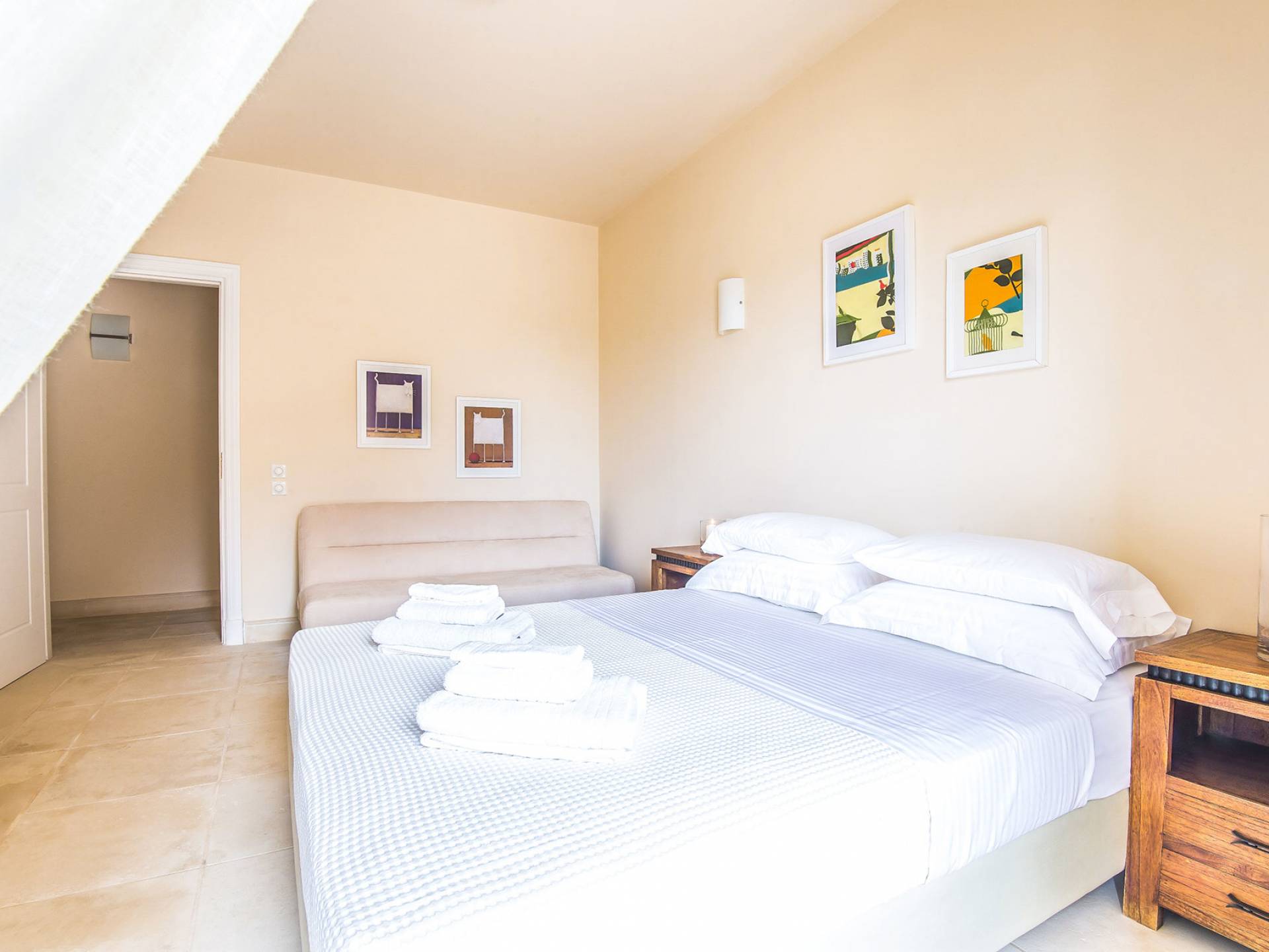 Το ανώτερο επίπεδο αποτελείται από ένα φωτεινό κομψό σαλόνι με τζάκι, μια γοητευτική ευρύχωρη τραπεζαρία, και τα δύο έχουν άμεση πρόσβαση στον χώρο της πισίνας και υπέροχη θέα στη θάλασσα, μια πλήρως εξοπλισμένη κουζίνα, WC επισκεπτών, ένα ευρύχωρο master δωμάτιο με ένα ιδιωτικό μπάνιο και μια μεγάλη βεράντα που προσφέρει υπέροχη θέα στη θάλασσα. Η πολυτελής είσοδος καλωσορίζει τους επισκέπτες με τη ζεστή ατμόσφαιρα και τον αρχιτεκτονικό σχεδιασμό. Το κατώτερο επίπεδο αποτελείται από δύο δίκλινα υπνοδωμάτια με ιδιωτικό μπάνιο, playroom, WC επισκεπτών, αποθήκη, ανεξάρτητο ξενώνα που προσφέρει δίκλινο υπνοδωμάτιο με ιδιωτικό μπάνιο και πλήρως εξοπλισμένη κουζίνα, ένα υπνοδωμάτιο με δύο μονά κρεβάτια. Οι εσωτερικοί χώροι είναι πολύ ευρύχωροι και ευάεροι με άπλετο φως της ημέρας να διαπερνά τα μεγάλα παράθυρα. Η σύγχρονη αρχιτεκτονική, ο κομψός σχεδιασμός και οι σύγχρονες ανέσεις διαθέτουν τις εγκαταστάσεις αυτής της Βίλας.