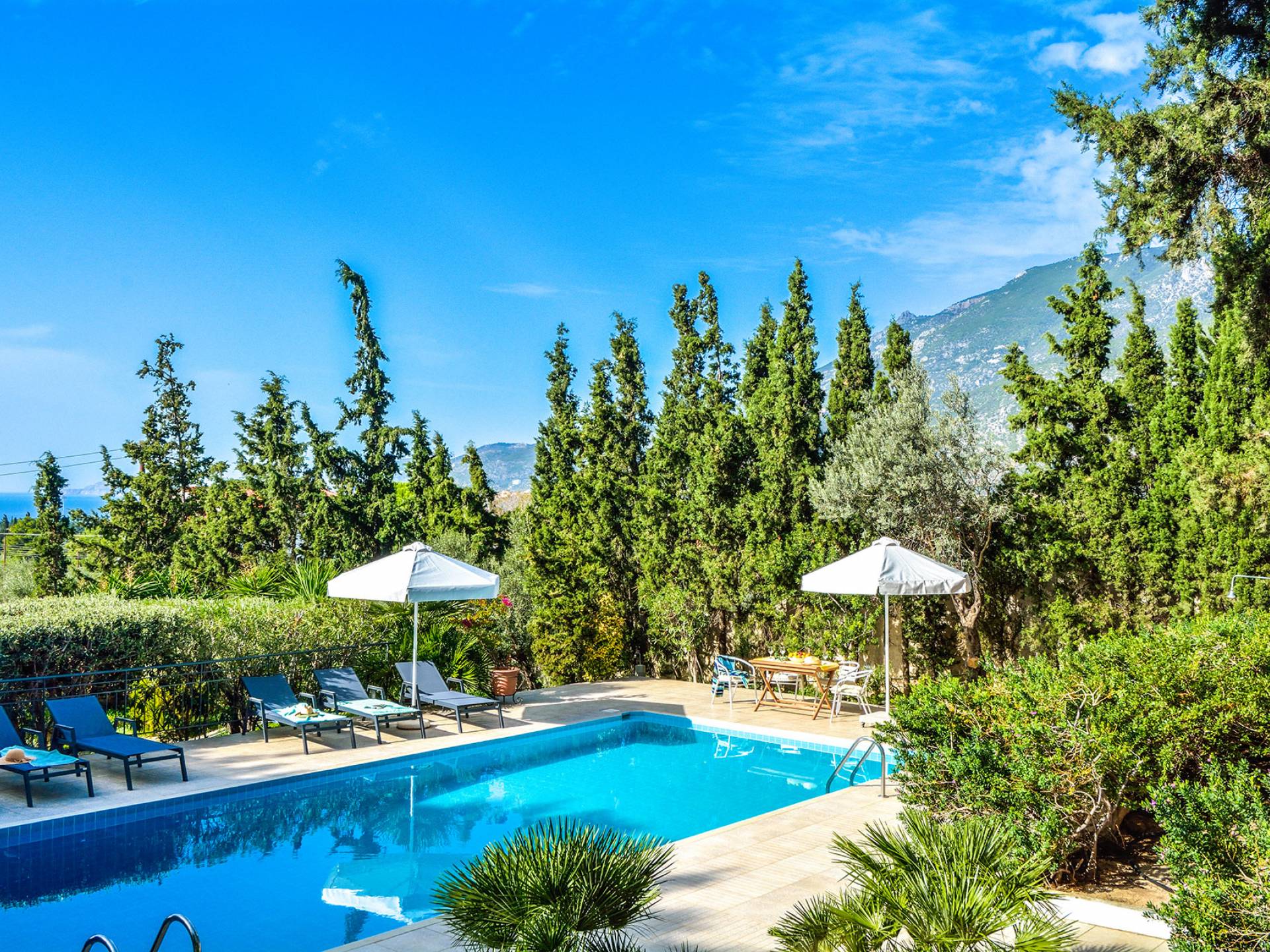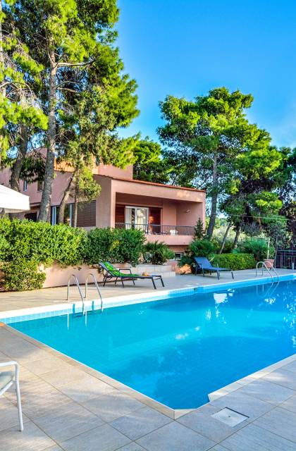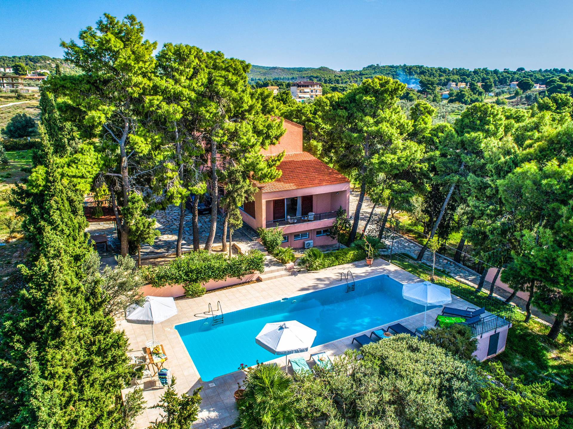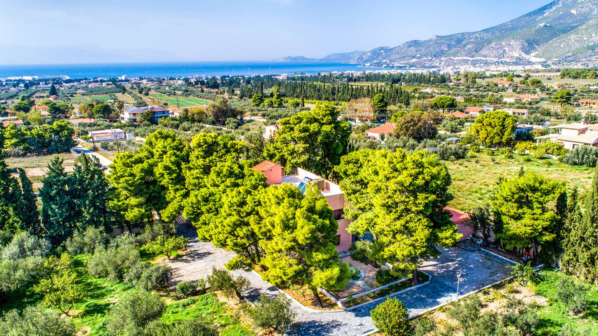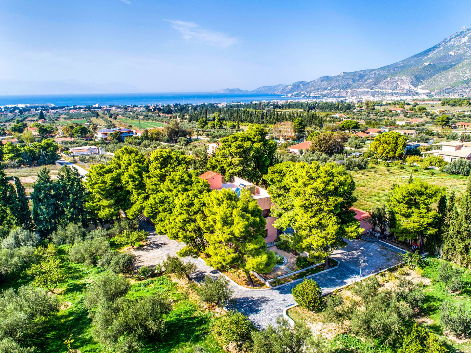 Μια ήσυχη περιφραγμένη έκταση 6 στρεμμάτων από πεύκα, κυπαρίσσια, ελιές, πορτοκαλιές, λεμονιές και καλλωπιστικά φυτά, με μια εξαιρετική μεγάλη πισίνα, ένα ειδικό γαλλικό δωμάτιο μπιλιάρδου και μόλις 10 λεπτά από την απίστευτη ακτή του Λουτρακίου μήκους 3,5 χιλιομέτρων, γεμάτη με ταβέρνες, μπαρ, ιαματικά λουτρά, σε μικρή απόσταση από το καζίνο και τα Γεράνια Όρη, με οργανωμένες δραστηριότητες, πεζοπορία, αναρρίχηση, ιππασία, ορειβασία και πολλά μοναστήρια. Επίσης, το κανάλι της Κορίνθου (Bungee Jumping), σχολές καταδύσεων και κολύμβησης με αναπνευστήρα και τόσους πολλούς κοντινούς προορισμούς της αρχαιότητας και της τέχνης.