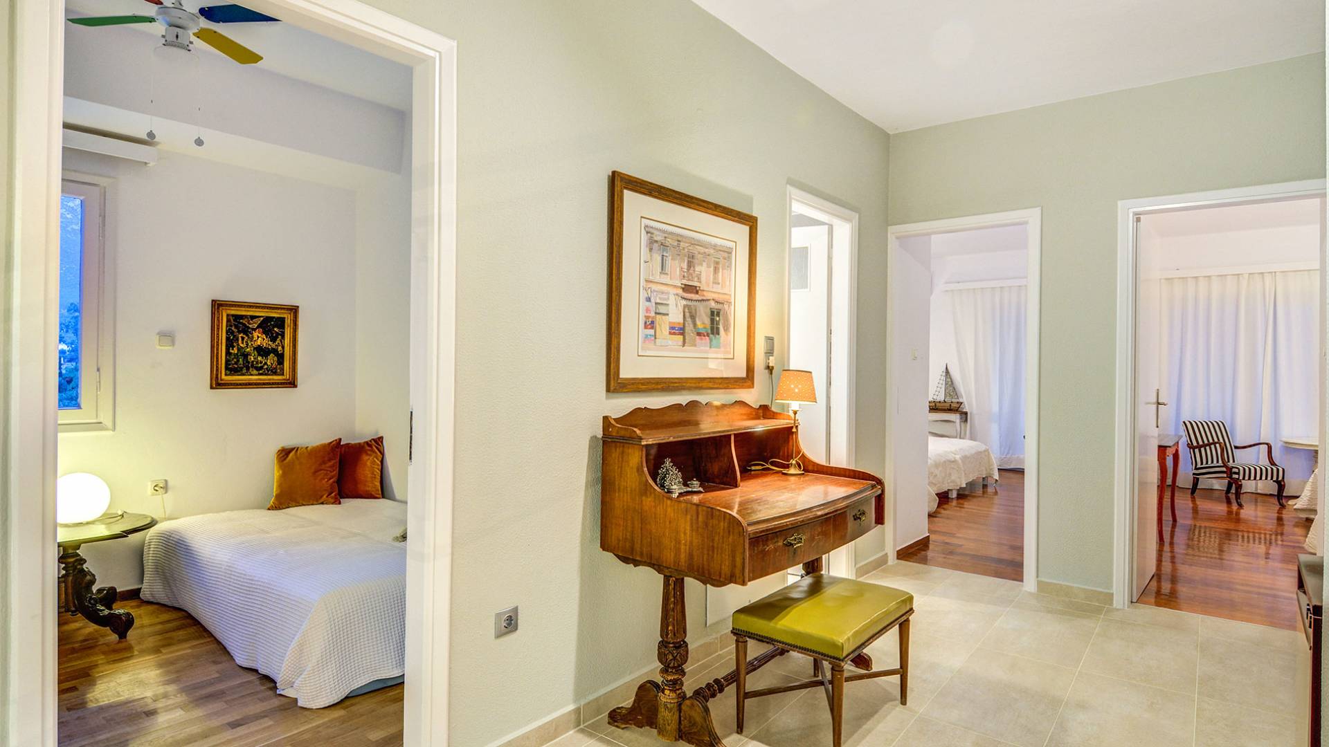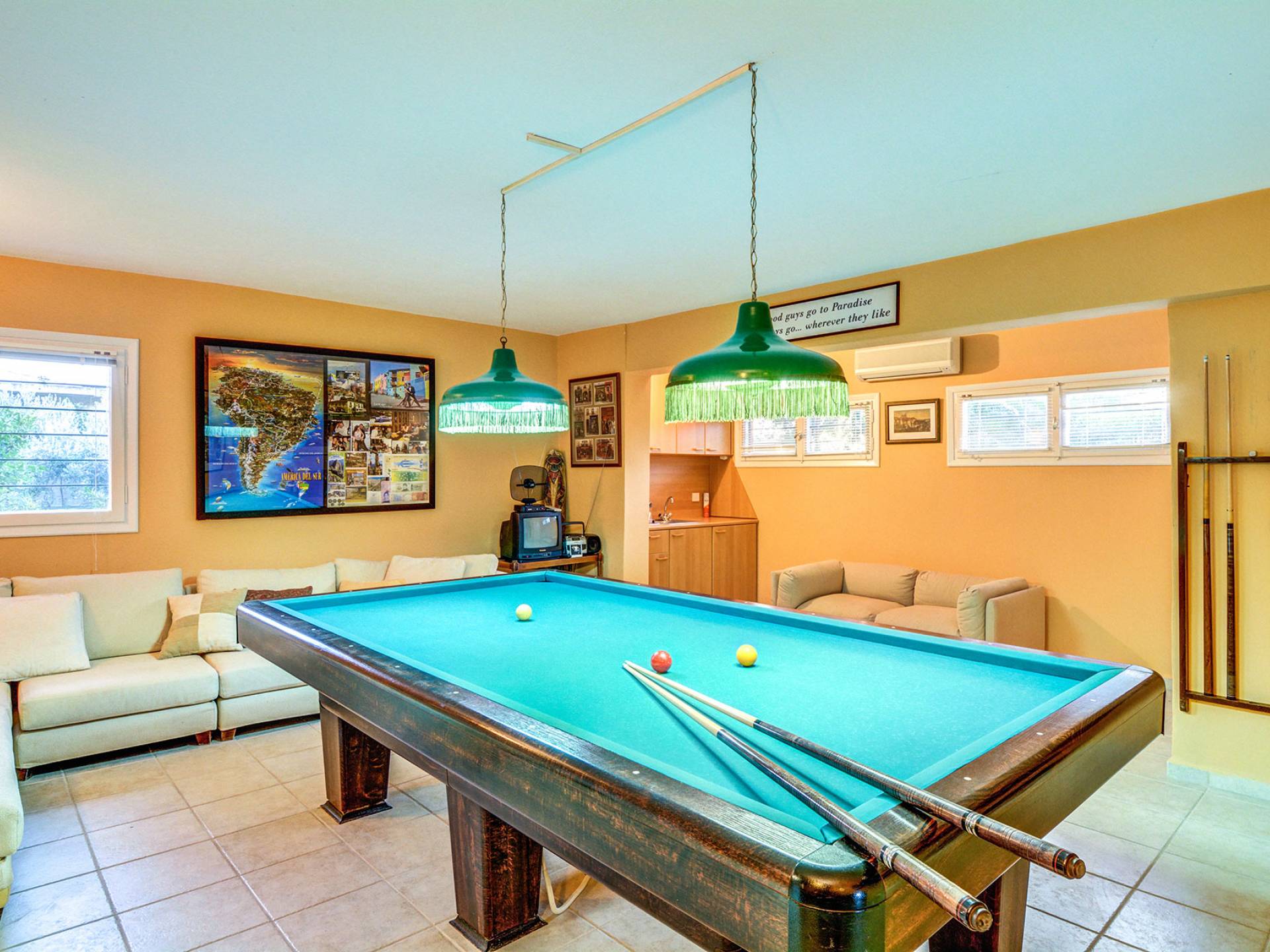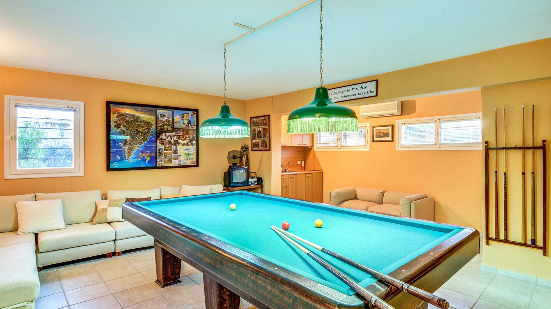 Στον επάνω όροφο από μια μεγάλη αίθουσα, υπάρχουν 2 μεγάλα υπνοδωμάτια με βεράντες με διπλά και μονά κρεβάτια, ένα μικρότερο υπνοδωμάτιο με δύο μονά κρεβάτια και 2 μπάνια. Όλα τα μπάνια διαθέτουν στεγνωτήρα μαλλιών. Στο ημιυπόγειο, υπάρχει ένα ενδιαφέρον γαλλικό σνούκερ δωμάτιο με μεγάλο γωνιακό καναπέ, μικρή κουζίνα και μπάνιο με ντους.