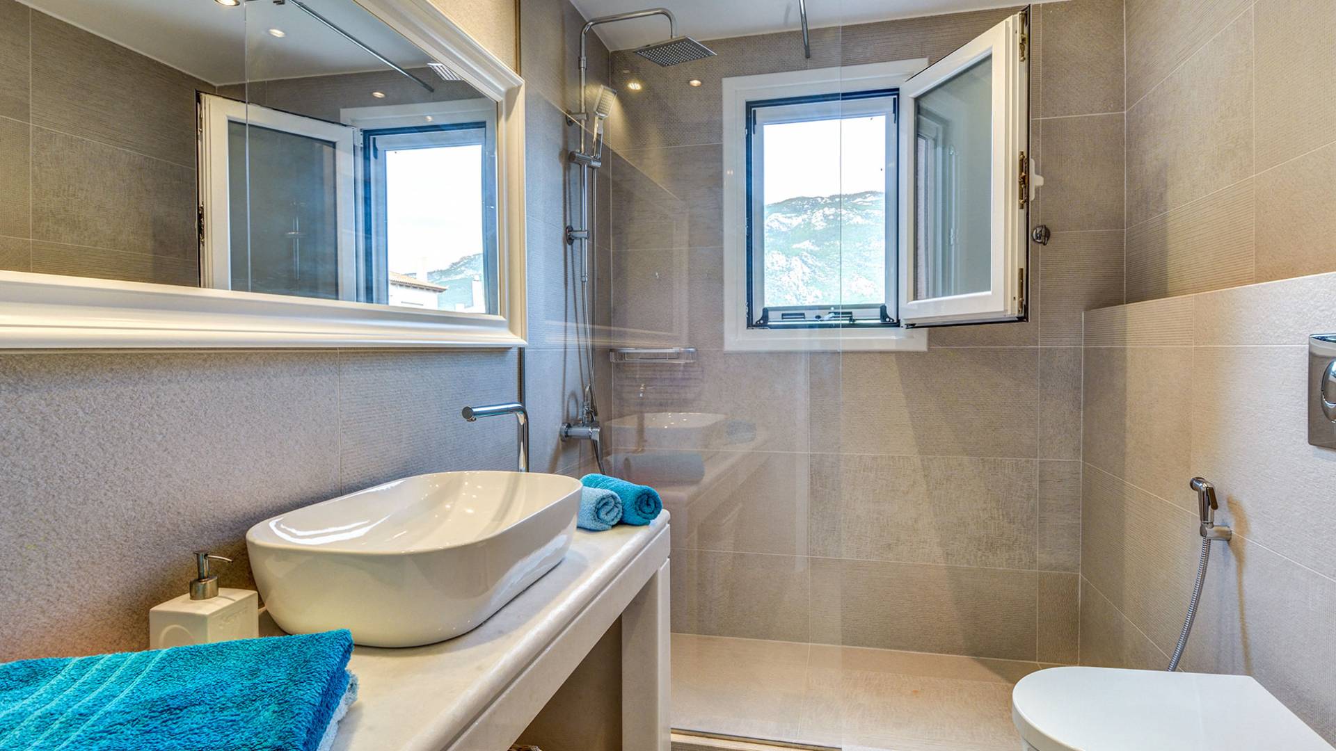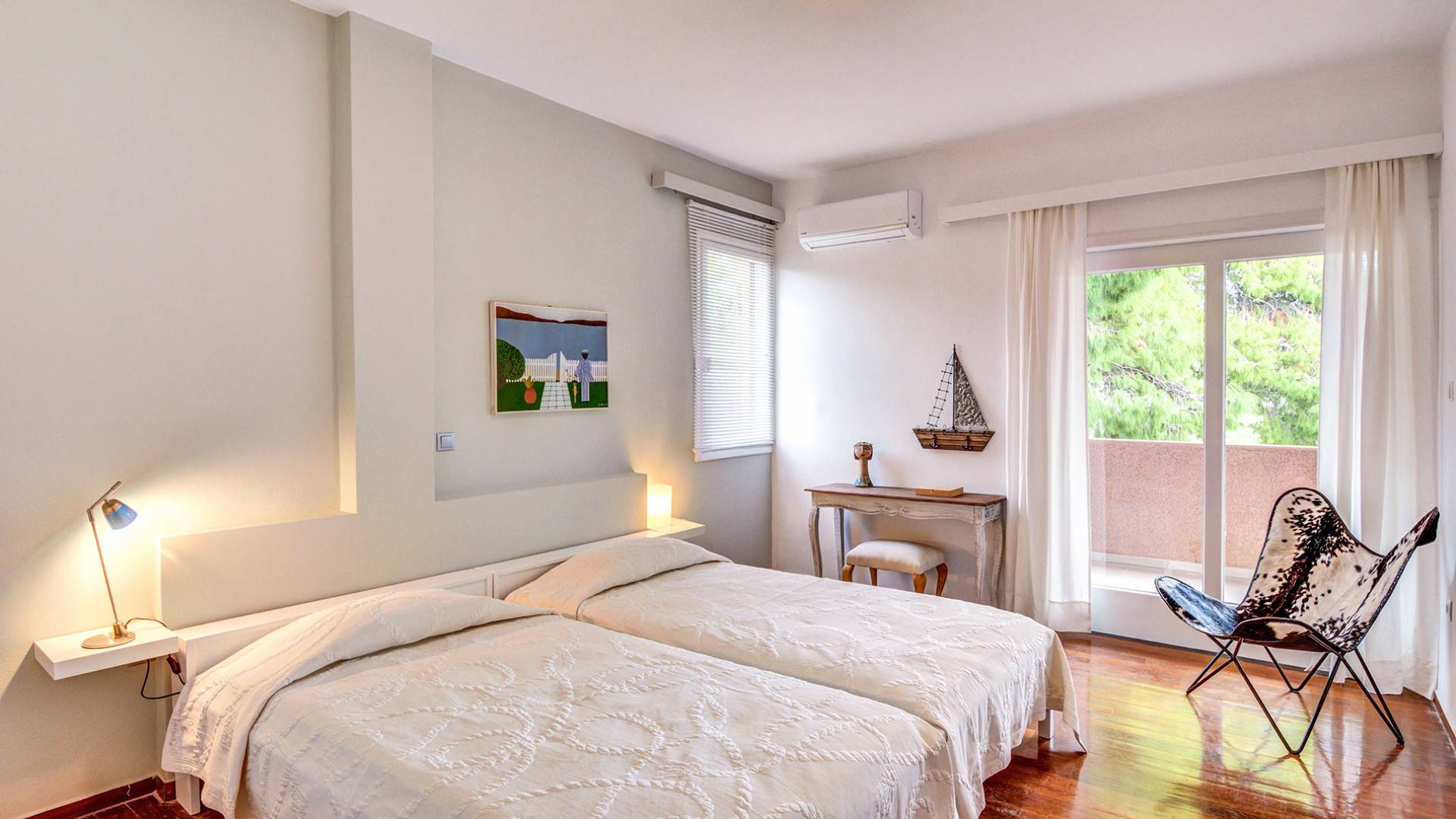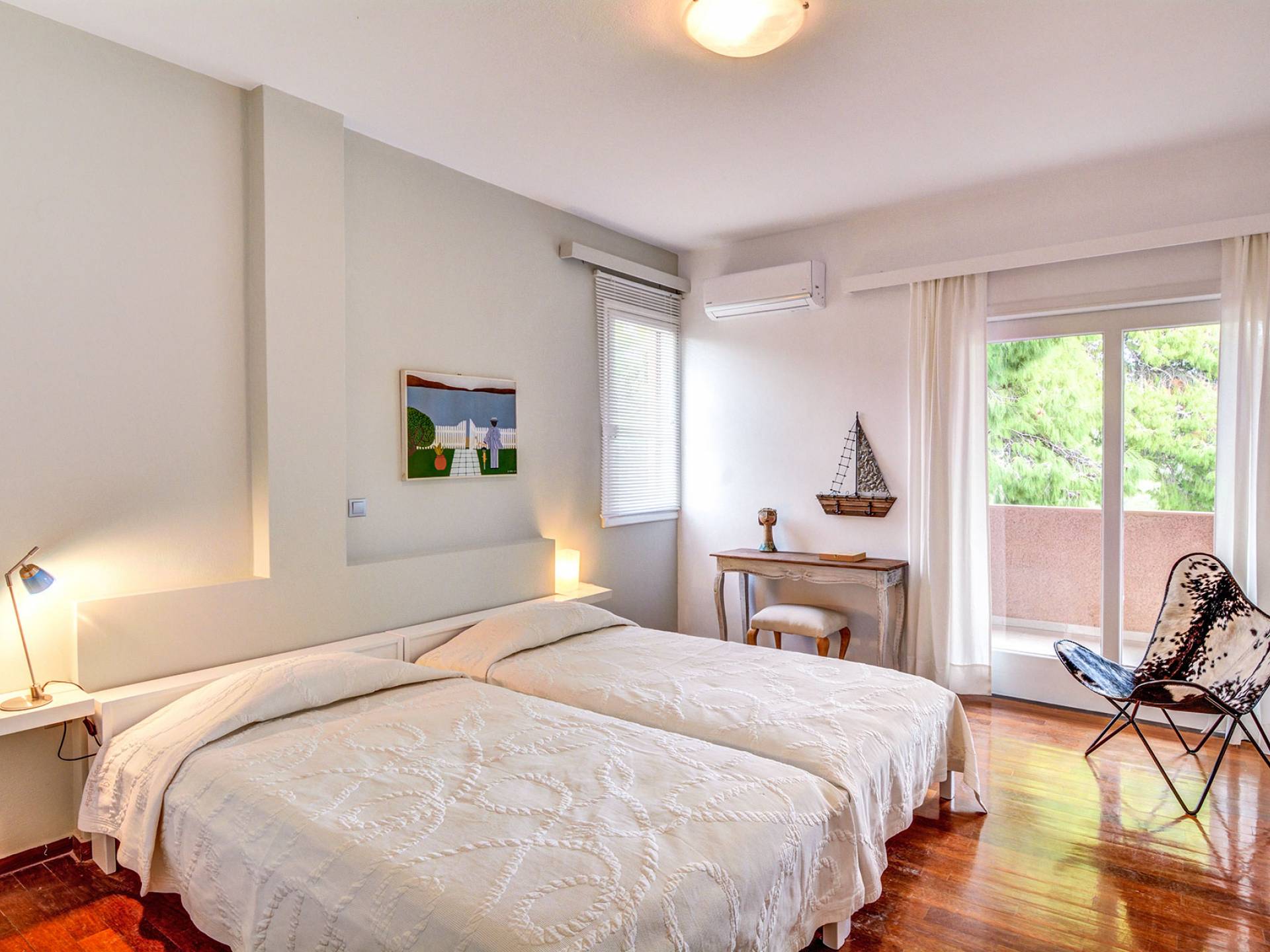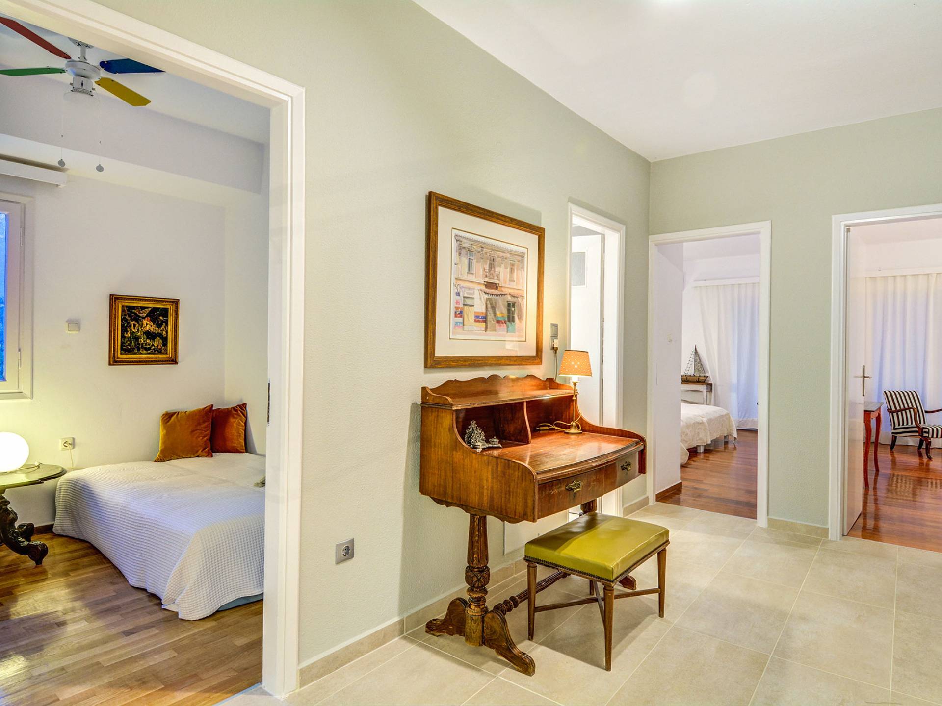 Στον επάνω όροφο από μια μεγάλη αίθουσα, υπάρχουν 2 μεγάλα υπνοδωμάτια με βεράντες με διπλά και μονά κρεβάτια, ένα μικρότερο υπνοδωμάτιο με δύο μονά κρεβάτια και 2 μπάνια. Όλα τα μπάνια διαθέτουν στεγνωτήρα μαλλιών. Στο ημιυπόγειο, υπάρχει ένα ενδιαφέρον γαλλικό σνούκερ δωμάτιο με μεγάλο γωνιακό καναπέ, μικρή κουζίνα και μπάνιο με ντους.
