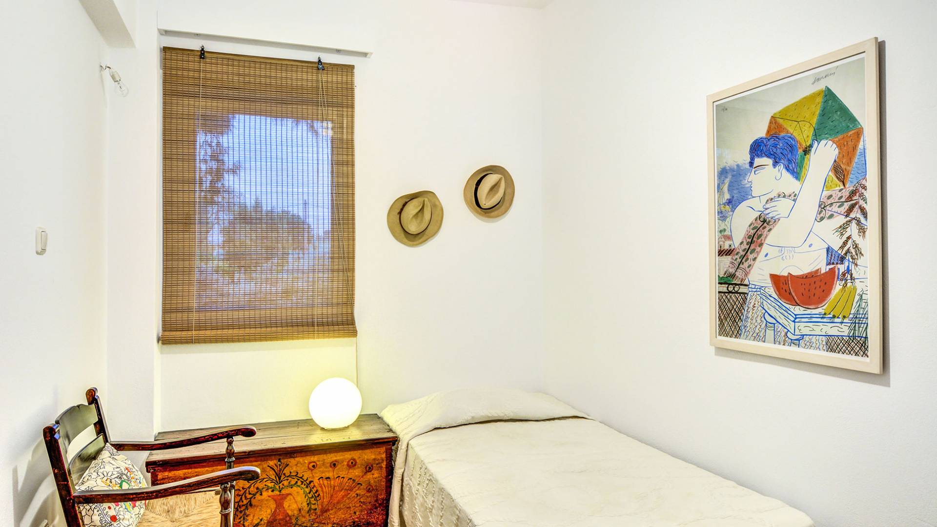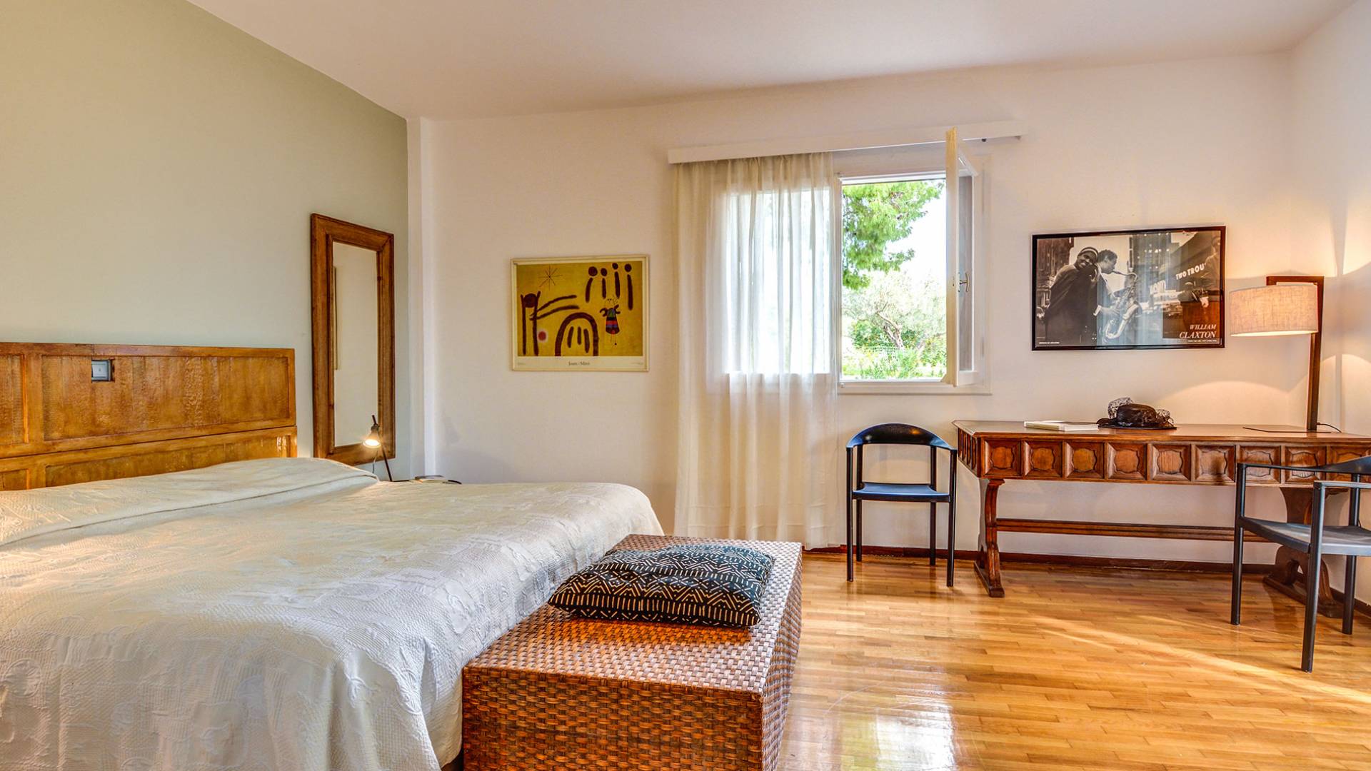 Στο ισόγειο, υπάρχει ένα υψηλό σαλόνι, τραπεζαρία με τζάκι με μεγάλα παράθυρα και μια ευρύχωρη βεράντα με θέα στη θάλασσα, την πισίνα και μέρος του κτήματος. Επίσης, στο ισόγειο βρίσκεται η ελκυστική και ανεξάρτητη κουζίνα, πλήρως εξοπλισμένη με τραπέζι φαγητού. Στο ισόγειο, υπάρχει επίσης ένα μεγάλο υπνοδωμάτιο με διπλό ή δύο μονά κρεβάτια με μεγάλη βεράντα, ένα μικρό υπνοδωμάτιο με ένα μονό κρεβάτι, και τα δύο υπνοδωμάτια εξυπηρετούνται από ένα μεγάλο μπάνιο με ντους και πλυντήριο ρούχων.