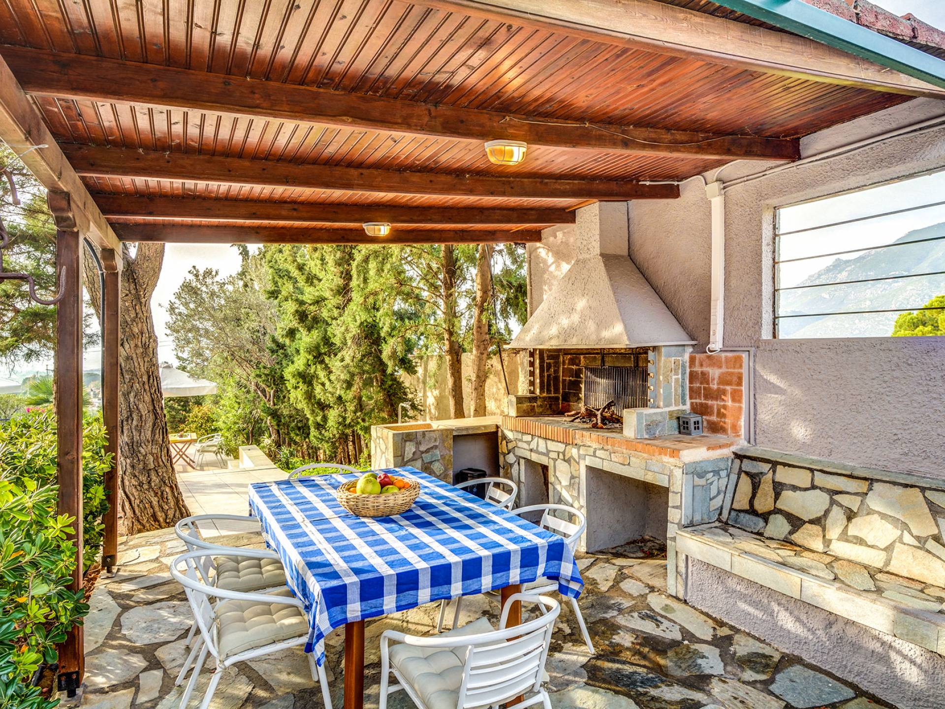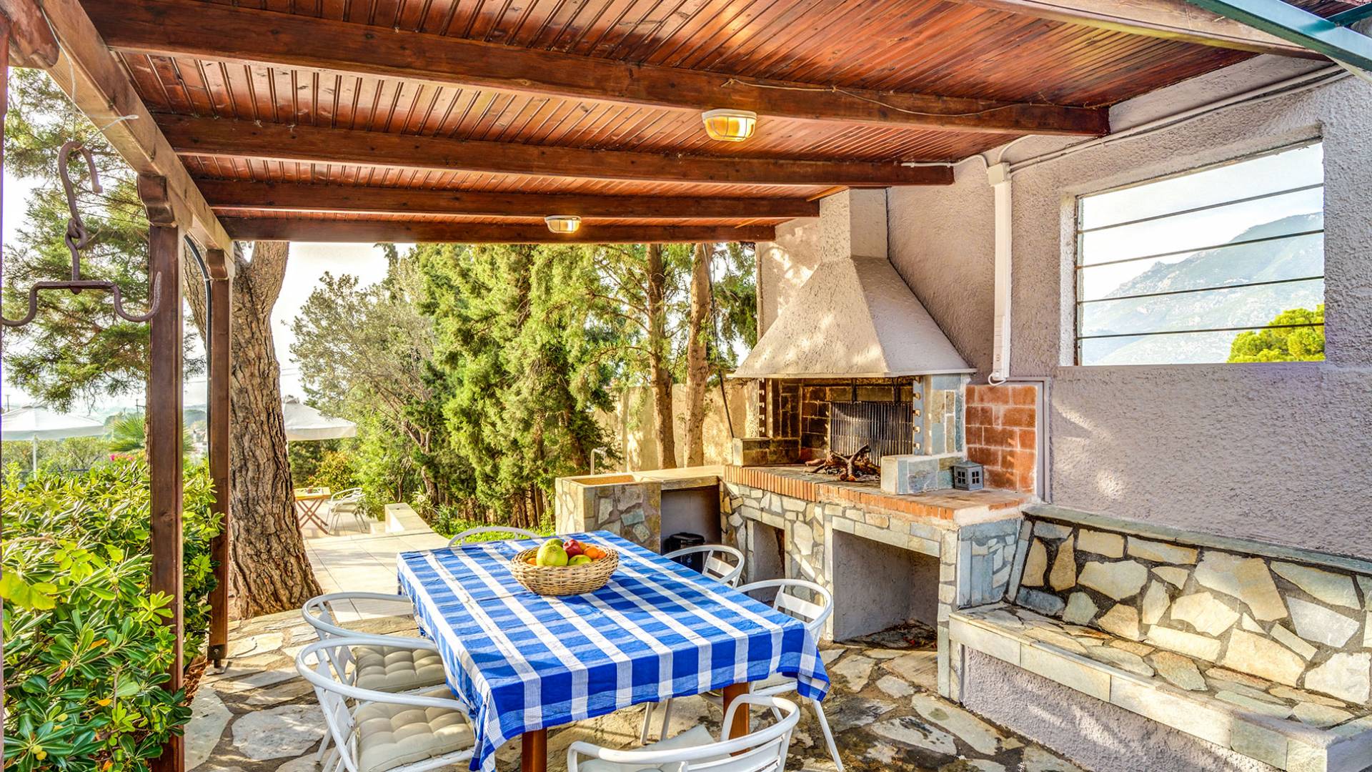 Κοντά στο μπάρμπεκιου, υπάρχει ένα δωμάτιο με ξυλόσομπα και τζάκι. Εδώ υπάρχει ένα ντους ξεχωριστό από το ντους πισίνας. Μεγάλα πλακόστρωτα μονοπάτια οδηγούν στο υπόλοιπο κτήμα και στις αυλές με θέα στη θάλασσα. Υπάρχουν 4 θέσεις στάθμευσης, αλλά υπάρχουν και άλλοι χώροι στάθμευσης εντός του κτήματος για έως και 10 αυτοκίνητα.