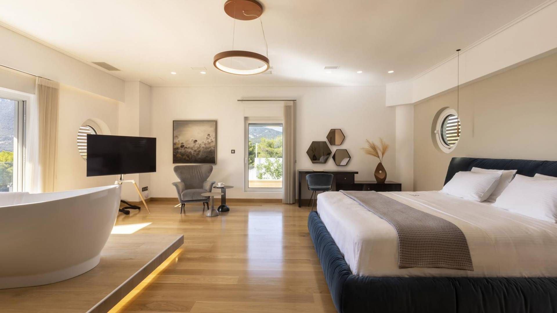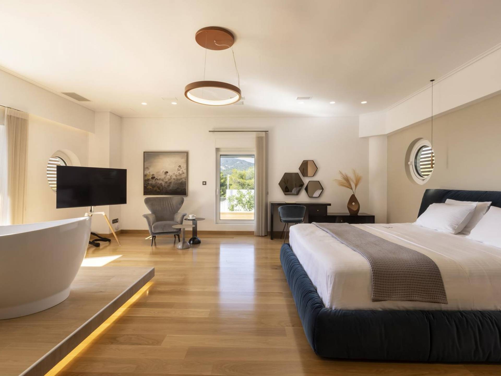 Στον δεύτερο όροφο, υπάρχουν τρία master υπνοδωμάτια, τύπου σουίτας μεγαλύτερα από όλα τα υπόλοιπα, με πανοραμική θέα στη θάλασσα και στο βουνό. Πρωτόγνωρα συναισθήματα και μοναδικές ανέσεις σας περιμένουν στη Villa Utopia. Μια αρχιτεκτονική δομή υψηλής αισθητικής με εσωτερική διάταξη υψηλών προδιαγραφών. Λίγο έξω από την Αθήνα, ένα μοναδικό κτίριο σε εξωτερική και εσωτερική αρχιτεκτονική σας περιμένει για να ζήσετε μια εμπειρία στη ζωή σας. Διακοσμημένο με κορυφαίους οίκους, προσφέρει αξιοθαύμαστες ανέσεις και υπηρεσίες. Σε συνδυασμό με το φυσικό εξωτερικό περιβάλλον, η εμπειρία σας απογειώνεται
