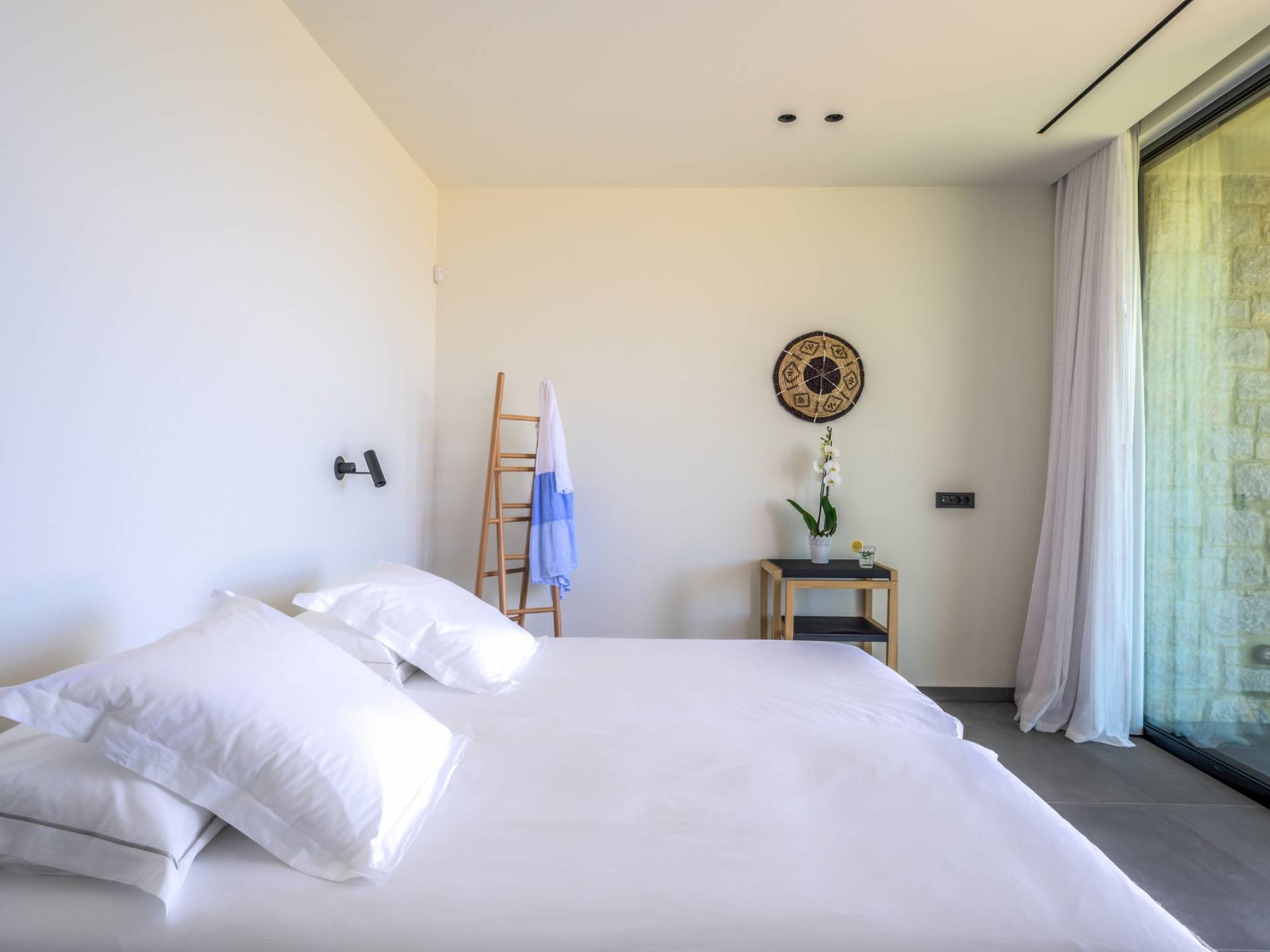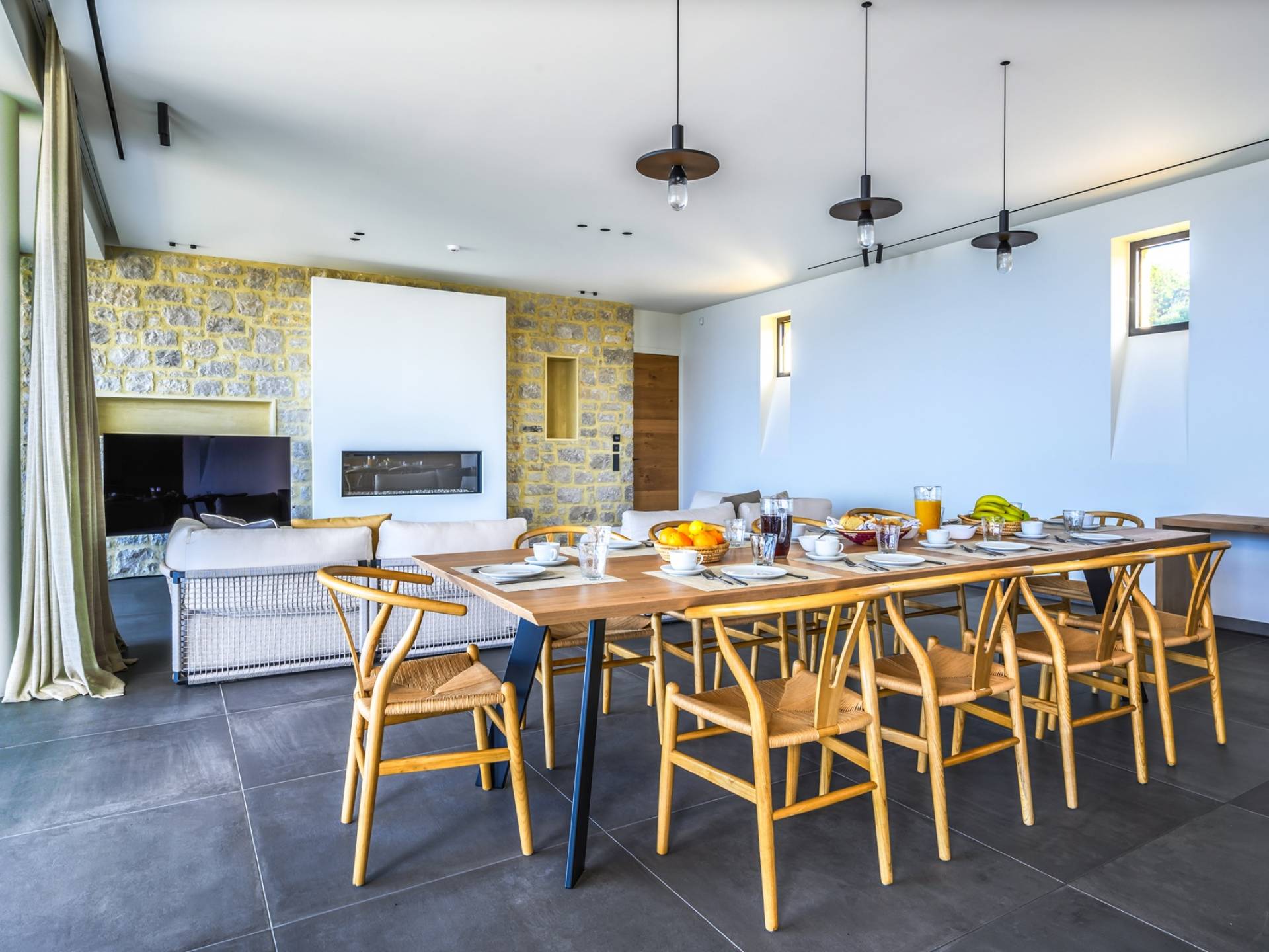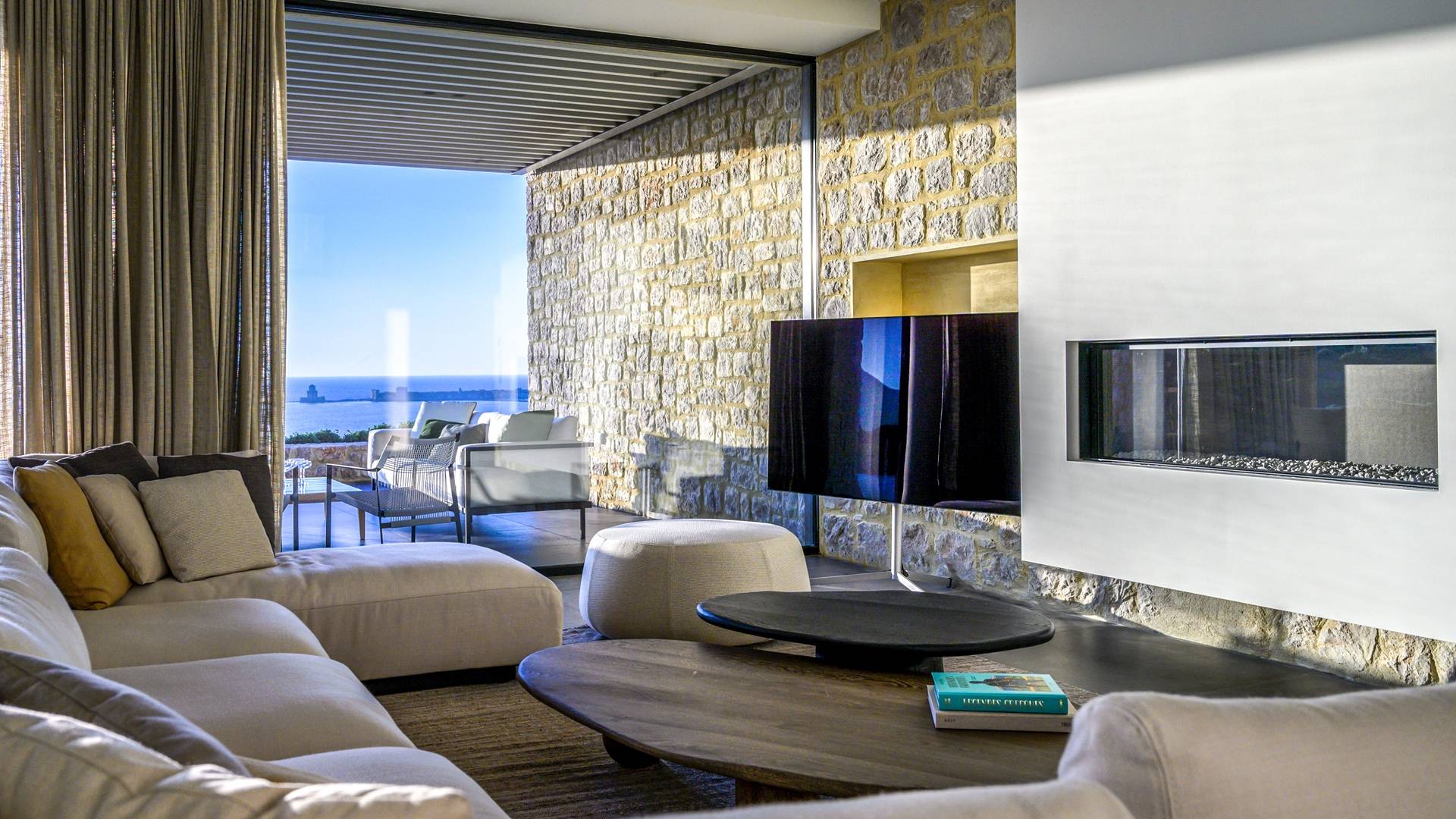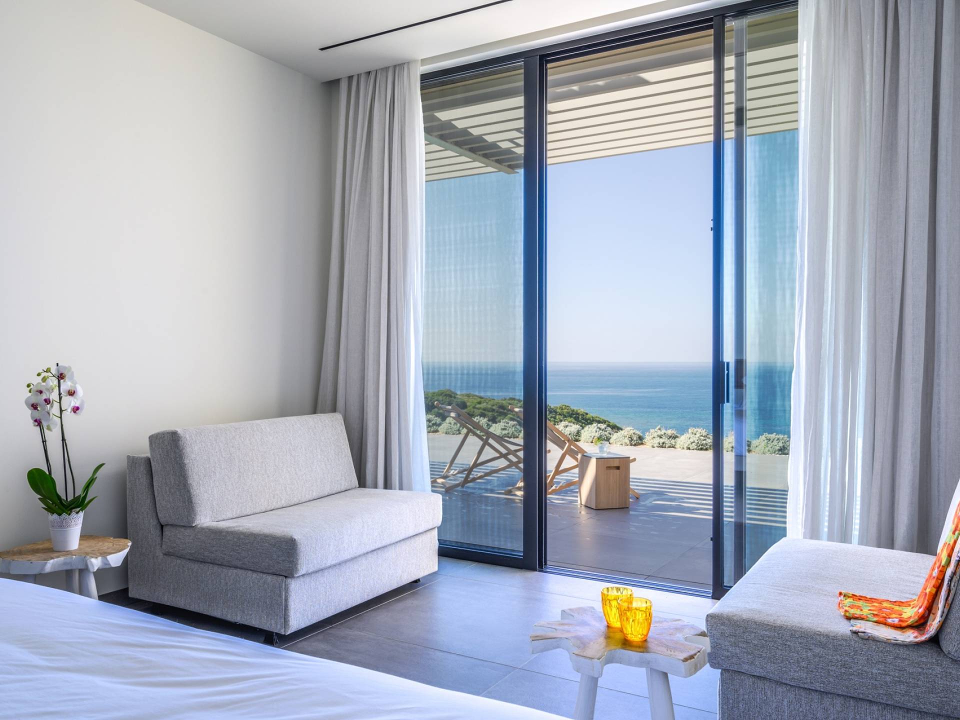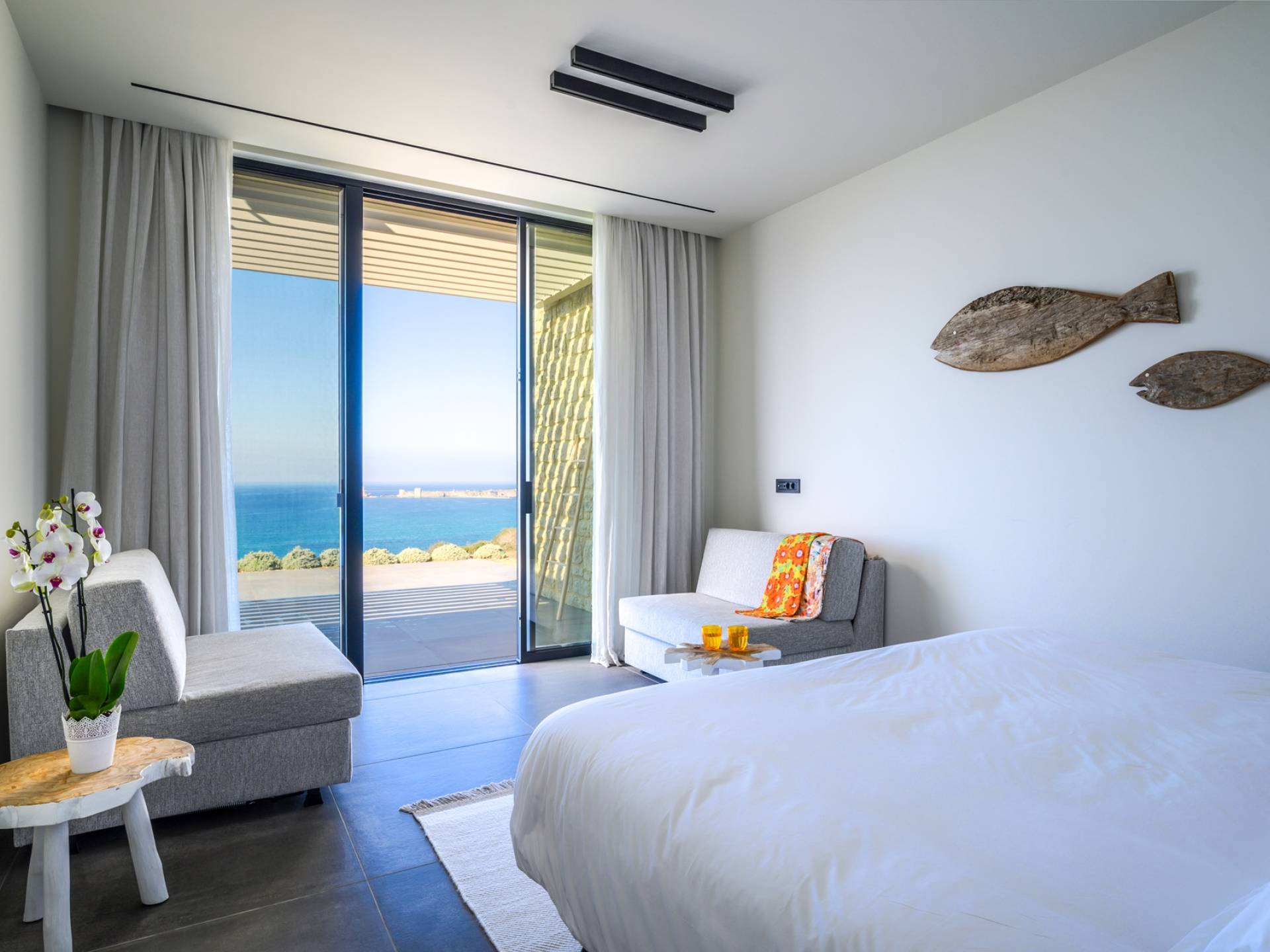 Το εσωτερικό της Liades End Villa είναι ένα όμορφο και ευρύχωρο μέρος με μινιμαλιστικό στυλ και άφθονο φυσικό φως. Τα απαλά γκρι σε συνδυασμό με το βαθύ μπλε της θάλασσας δημιουργούν μια καταπραϋντική παλέτα ενώ μια αίσθηση ζεστασιάς δημιουργείται από φυσικά υλικά όπως το ξύλο και η πέτρα. Όλα τα υπνοδωμάτια έχουν θέα στη θάλασσα, κάτι που εξασφαλίζει ένα ευχάριστο ξύπνημα!