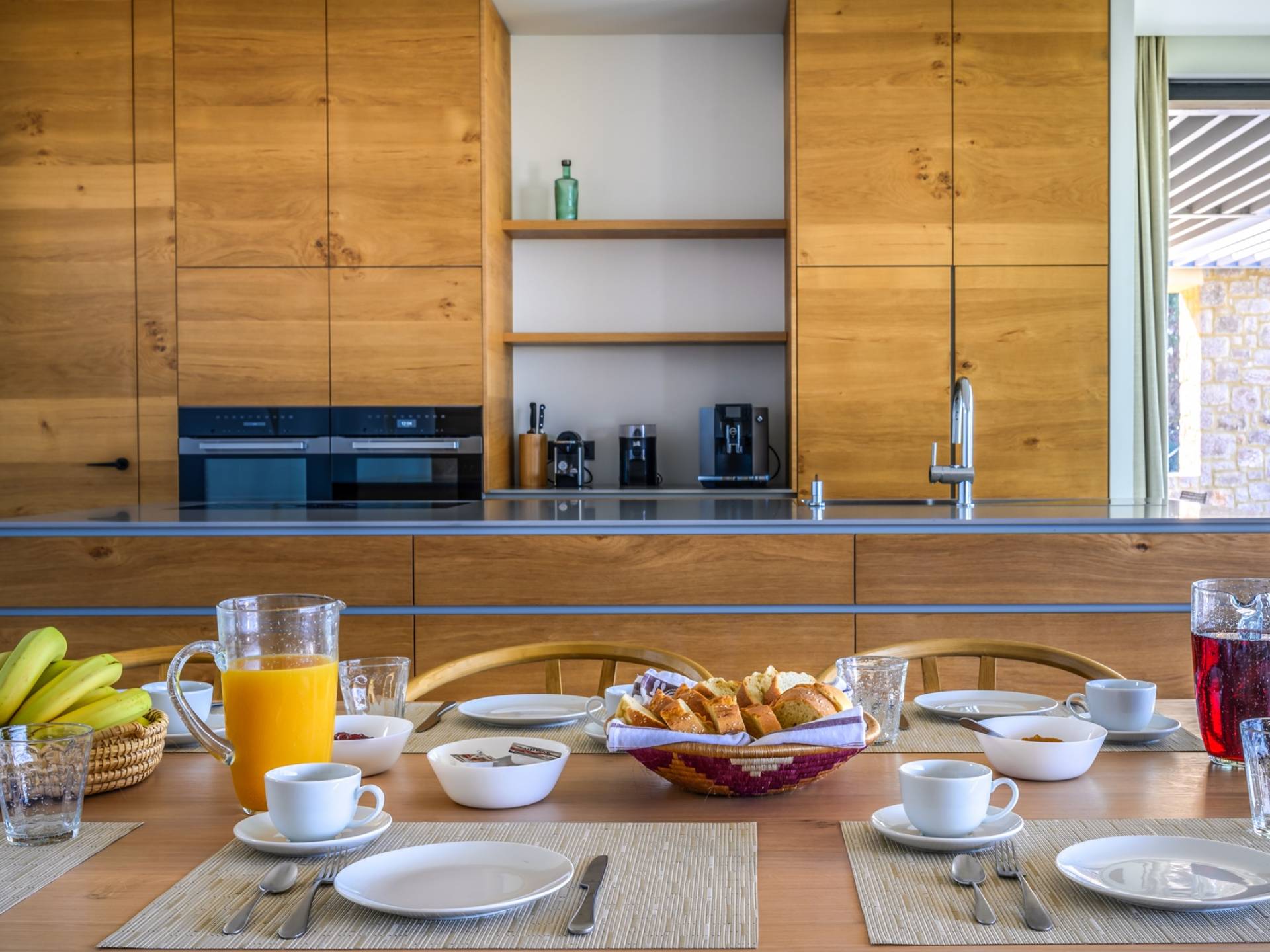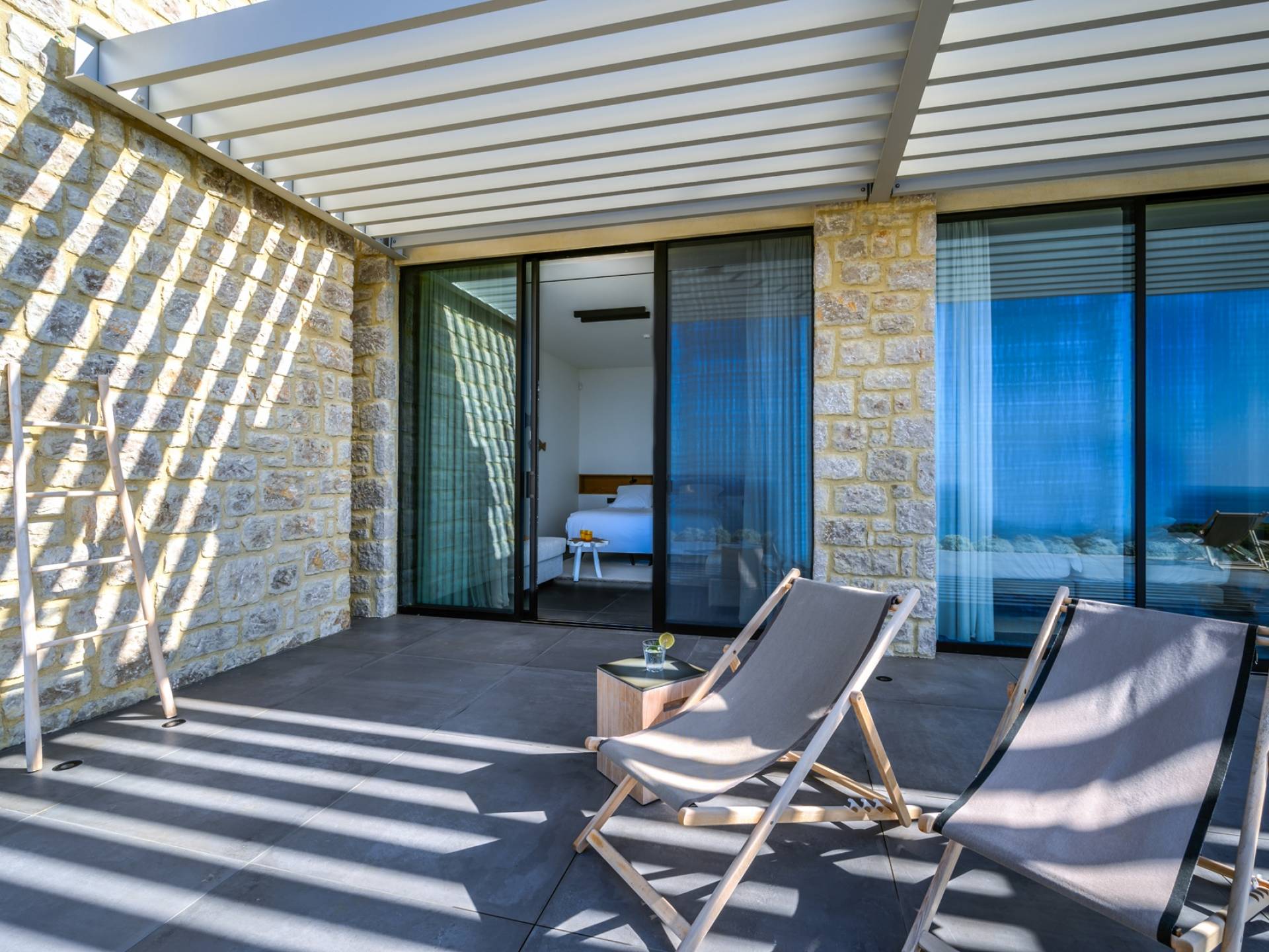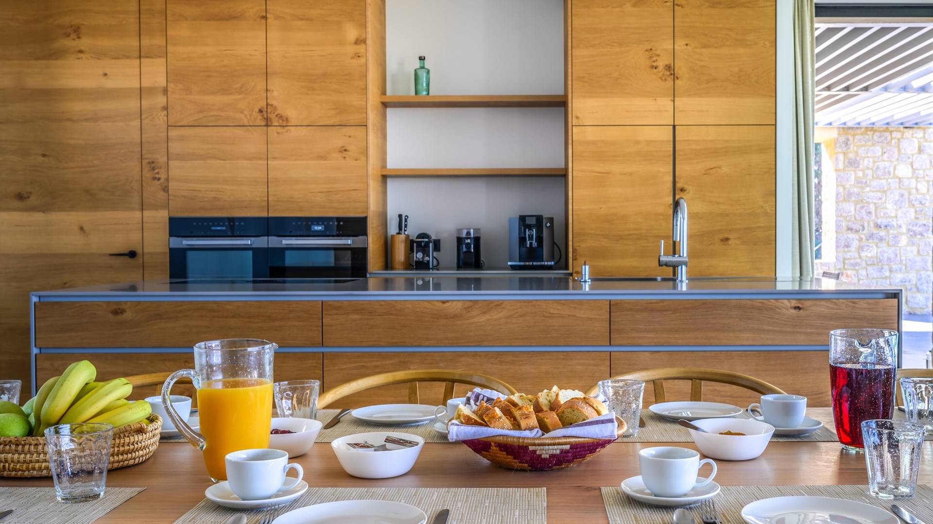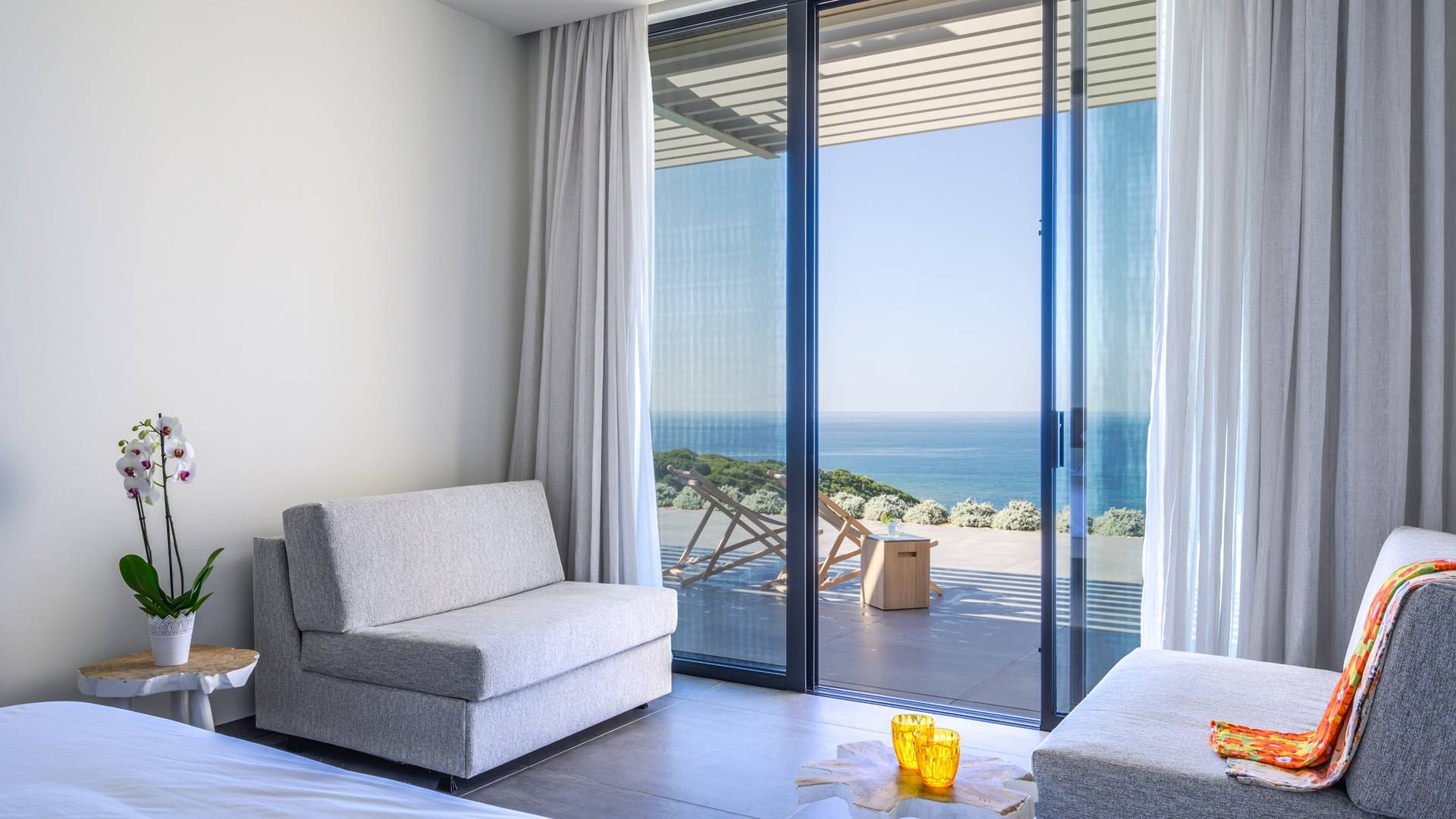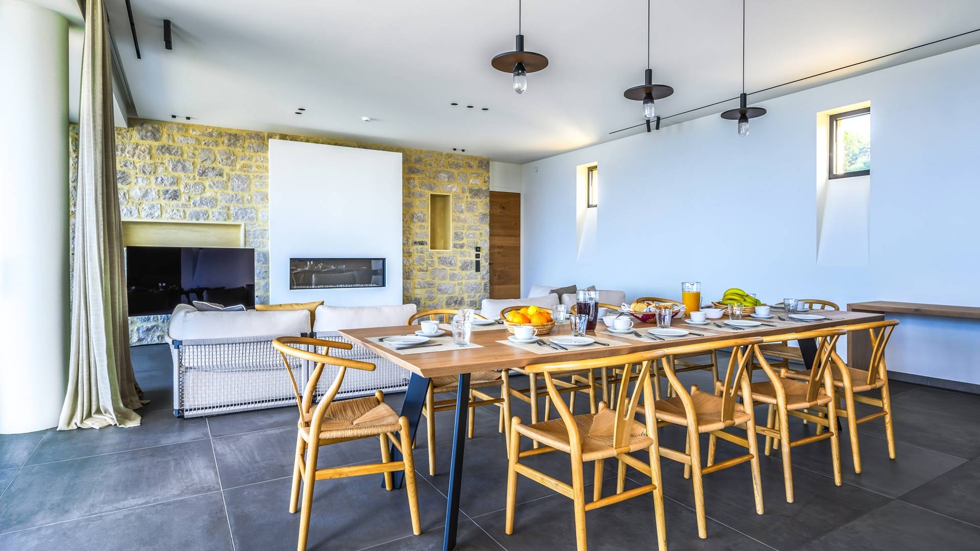 Το εσωτερικό της Liades End Villa είναι ένα όμορφο και ευρύχωρο μέρος με μινιμαλιστικό στυλ και άφθονο φυσικό φως. Τα απαλά γκρι σε συνδυασμό με το βαθύ μπλε της θάλασσας δημιουργούν μια καταπραϋντική παλέτα ενώ μια αίσθηση ζεστασιάς δημιουργείται από φυσικά υλικά όπως το ξύλο και η πέτρα. Όλα τα υπνοδωμάτια έχουν θέα στη θάλασσα, κάτι που εξασφαλίζει ένα ευχάριστο ξύπνημα!
