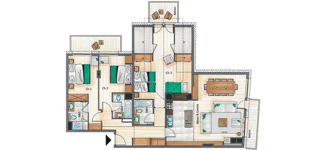Αυτό το διαμέρισμα διαθέτει δύο υπνοδωμάτια με διπλό κρεβάτι, ένα υπνοδωμάτιο ιδανικό για παιδιά, μια κουκέτα και δύο μονά κρεβάτια καθώς και τρία ιδιωτικά μπάνια. Το φωτεινό σαλόνι με τηλεόραση και τζάκι διαθέτει επίσης πλήρως εξοπλισμένη νησίδα κουζίνας και τραπεζαρία. Θα εκτιμήσετε επίσης το μπαλκόνι με θέα στην κορυφή του Saulire. Κατά τη διάρκεια των διακοπών σας, μπορείτε να επωφεληθείτε από μια θέση στάθμευσης στον ιδιωτικό χώρο στάθμευσης αυτοκινήτων, ένα ντουλάπι σκι και πρόσβαση Wi-Fi.