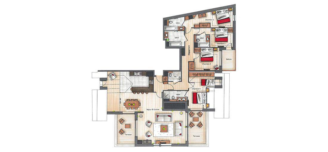Αυτό το ρετιρέ διαθέτει τρία υπνοδωμάτια με διπλό κρεβάτι, ένα υπνοδωμάτιο με διπλό κρεβάτι και ένα μονό κρεβάτι καθώς και τέσσερα μπάνια. Το υπέροχο σαλόνι με τηλεόραση και τζάκι διαθέτει επίσης πλήρως εξοπλισμένη κουζίνα και τραπεζαρία. Θα εκτιμήσετε επίσης τα δύο μεγάλα επιπλωμένα μπαλκόνια, που προσφέρουν πανοραμική θέα στα βουνά. Κατά τη διάρκεια των διακοπών σας, μπορείτε να επωφεληθείτε από μια θέση στάθμευσης στον ιδιωτικό χώρο στάθμευσης αυτοκινήτων, ένα ντουλάπι σκι και πρόσβαση Wi-Fi.