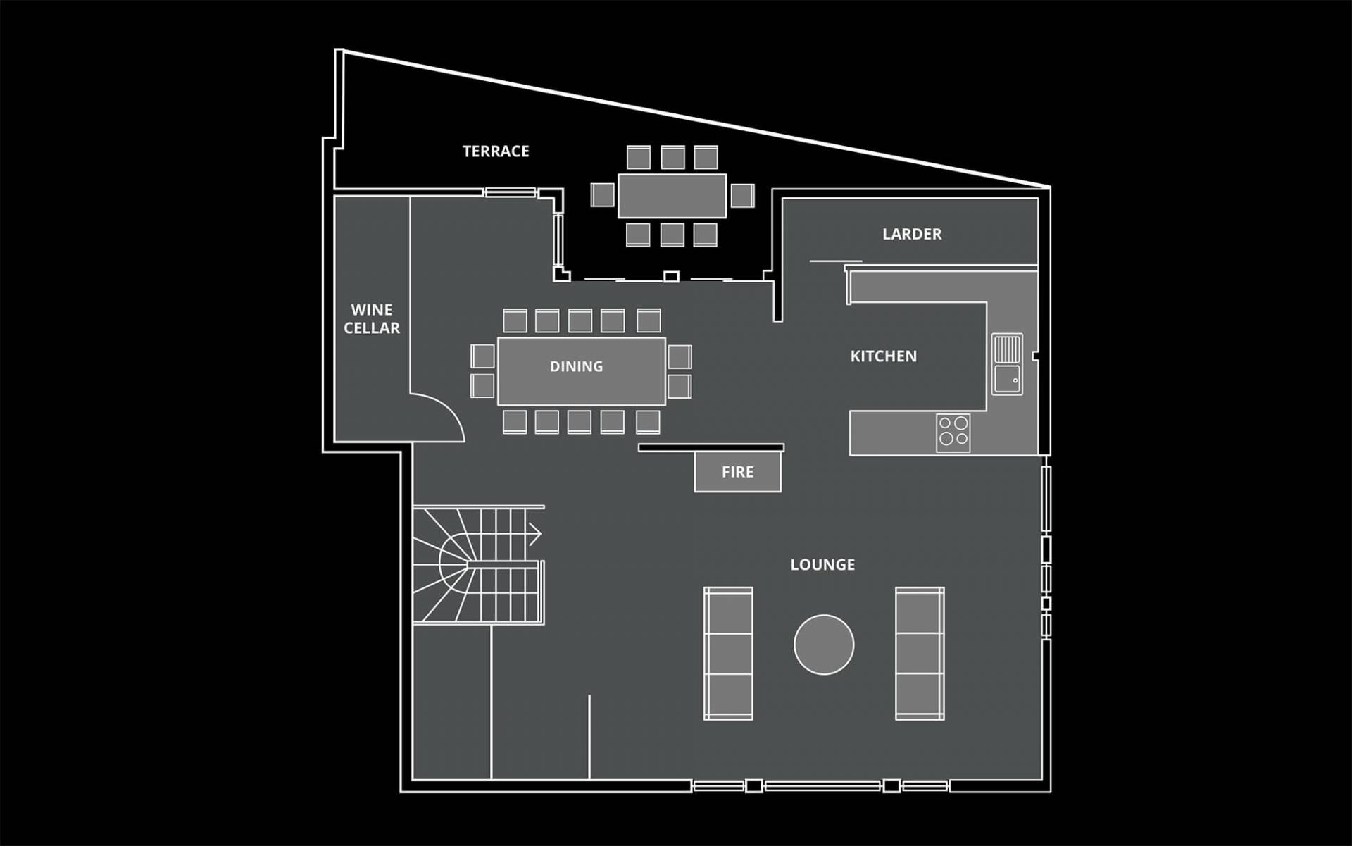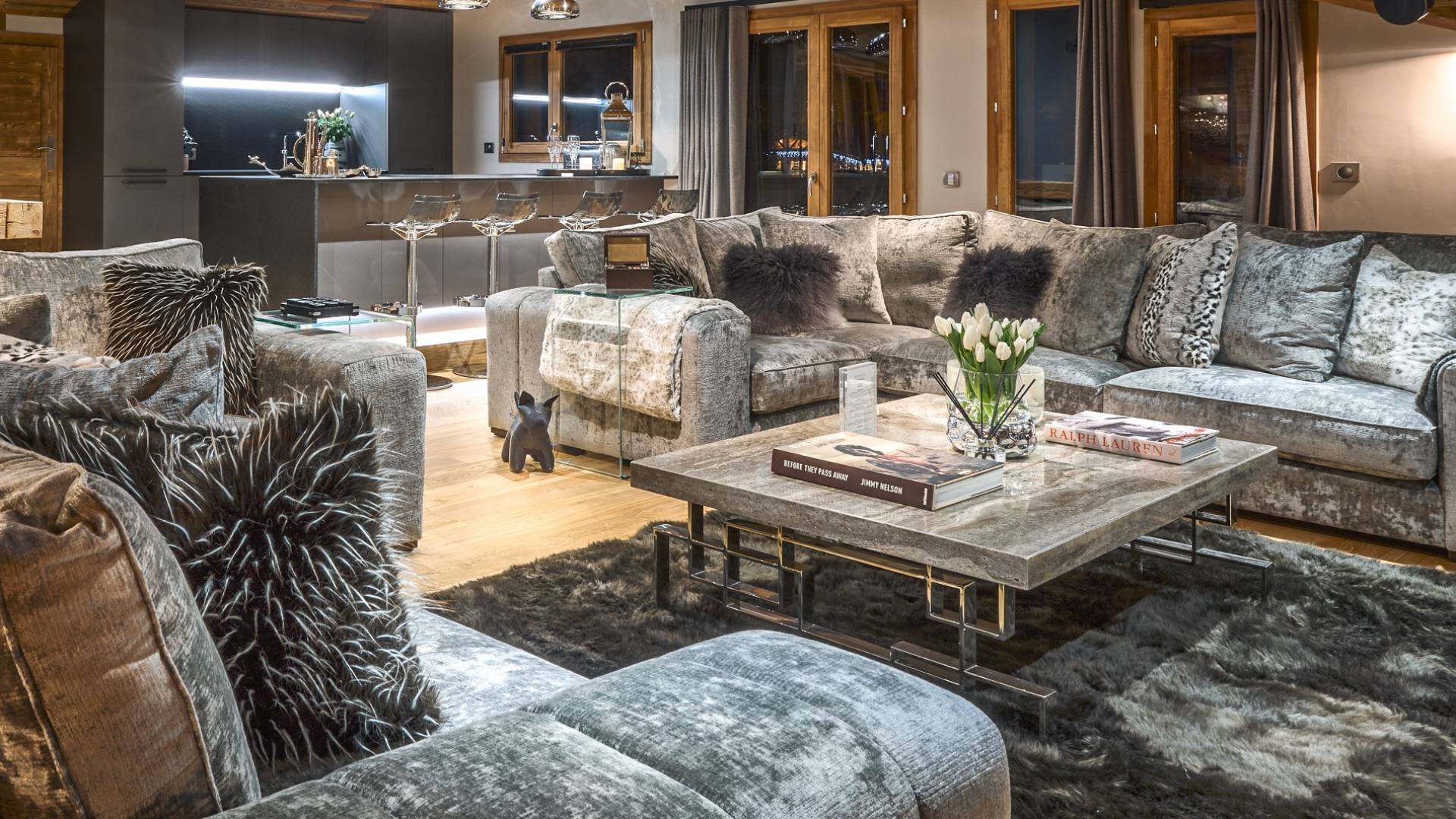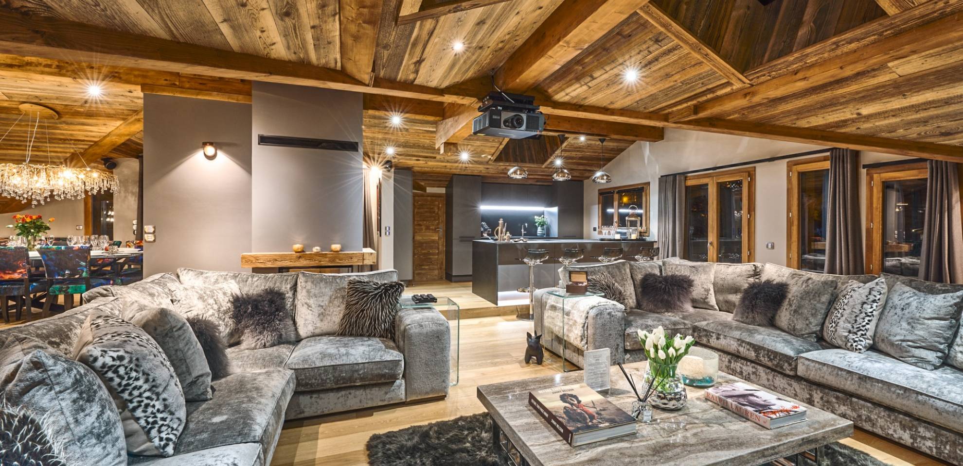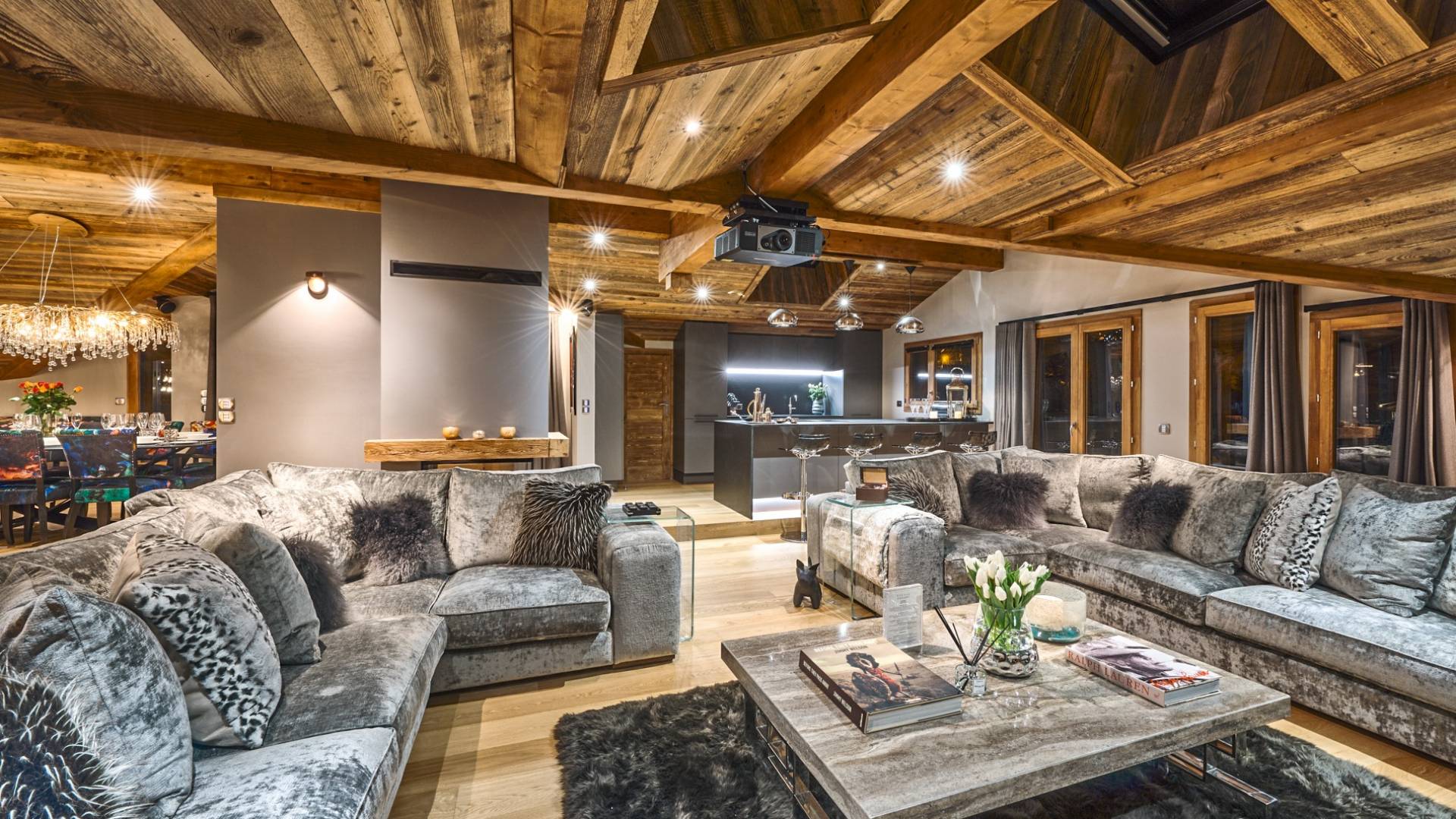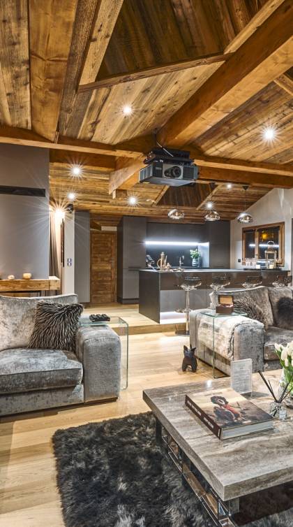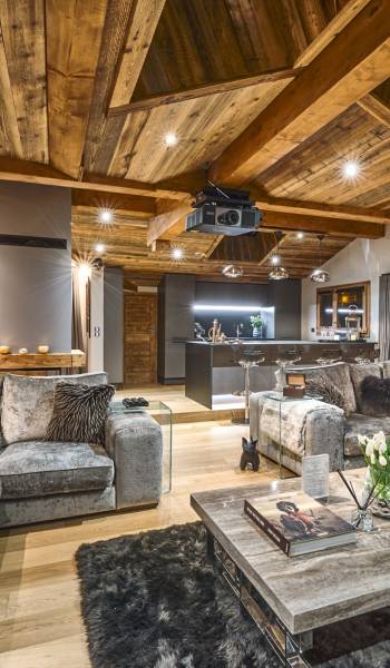 Ένα μεγάλο σαλόνι με δύο όμορφους καναπέδες έχει θέα στο θέρετρο μέσω παραθύρων από το δάπεδο μέχρι την οροφή. Ένας προβολέας ταινιών και μια μεγάλη αναπτυσσόμενη οθόνη μετατρέπουν αυτό το καθιστικό σε έναν κινηματογράφο για να απολαύσετε όλη την οικογένεια. Υπάρχουν πολλά καθίσματα για να μπορούν όλοι να χαλαρώσουν και να απολαύσουν μια ταινία μαζί μετά από μια κουραστική μέρα στα βουνά. Για όσους μπορεί να χρειαστεί να εργαστούν κατά τη διάρκεια των διακοπών τους, ένα γραφείο και μια καρέκλα γραφείου βρίσκεται στη γωνία του δωματίου.