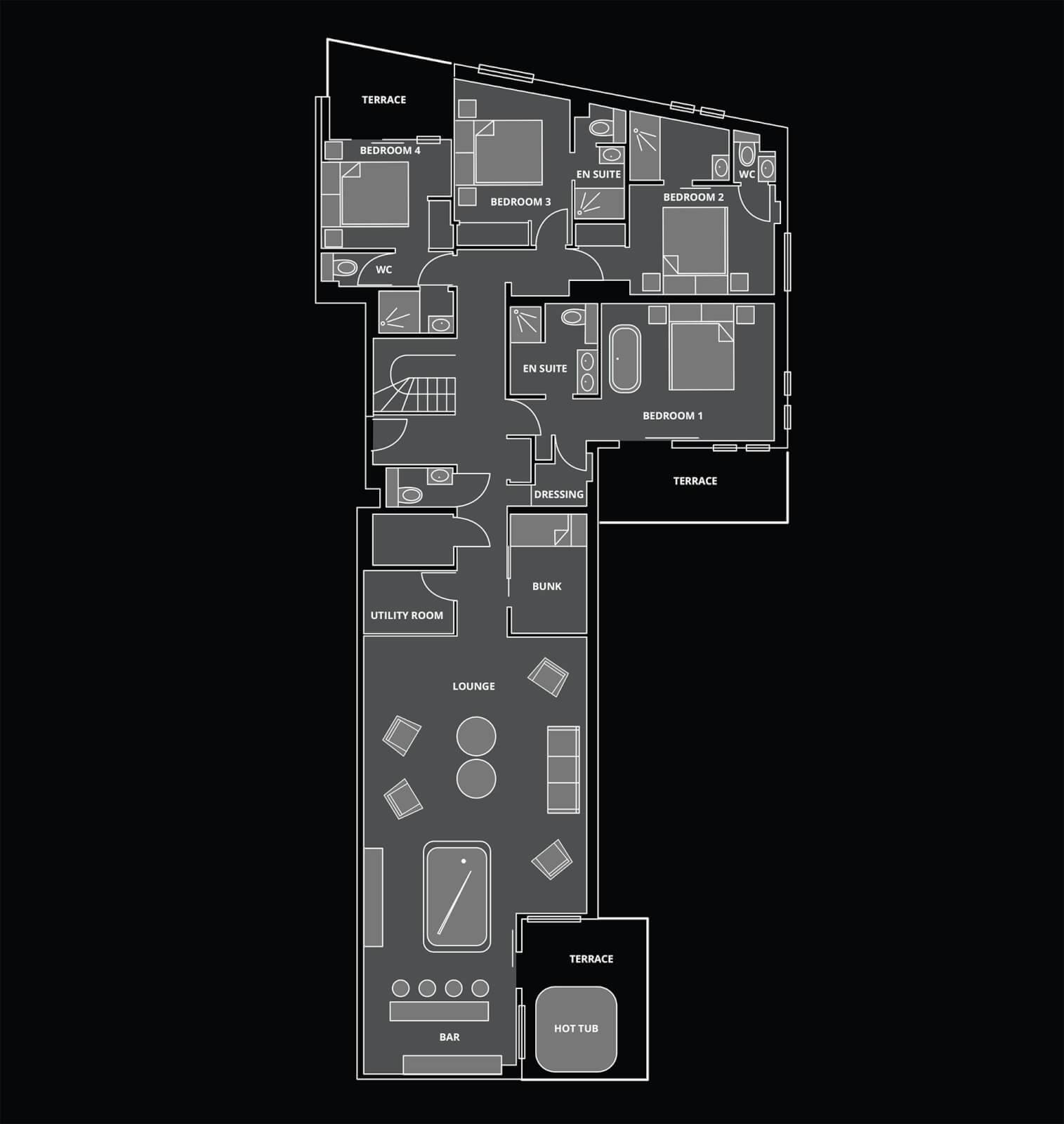 Όπως και με την κύρια σουίτα, τρία από τα άλλα υπνοδωμάτια μπορούν να διαμορφωθούν ως υπνοδωμάτια με king size ή 2 μονά κρεβάτια, επιτρέποντας τη μέγιστη ευελιξία για τους επισκέπτες. Αυτά τα υπνοδωμάτια είναι πολύ ευρύχωρα με άφθονο χώρο αποθήκευσης και ντουλάπα. Καθένα έχει όμορφα εξοπλισμένο ιδιωτικό μπάνιο και θέα στο γραφικό αλπικό χωριό. Το δωμάτιο 4 διαθέτει μεγάλο μπαλκόνι με ξαπλώστρες που προσφέρουν χώρο για να κρυφτούν και να απολαύσουν τη θέα.
