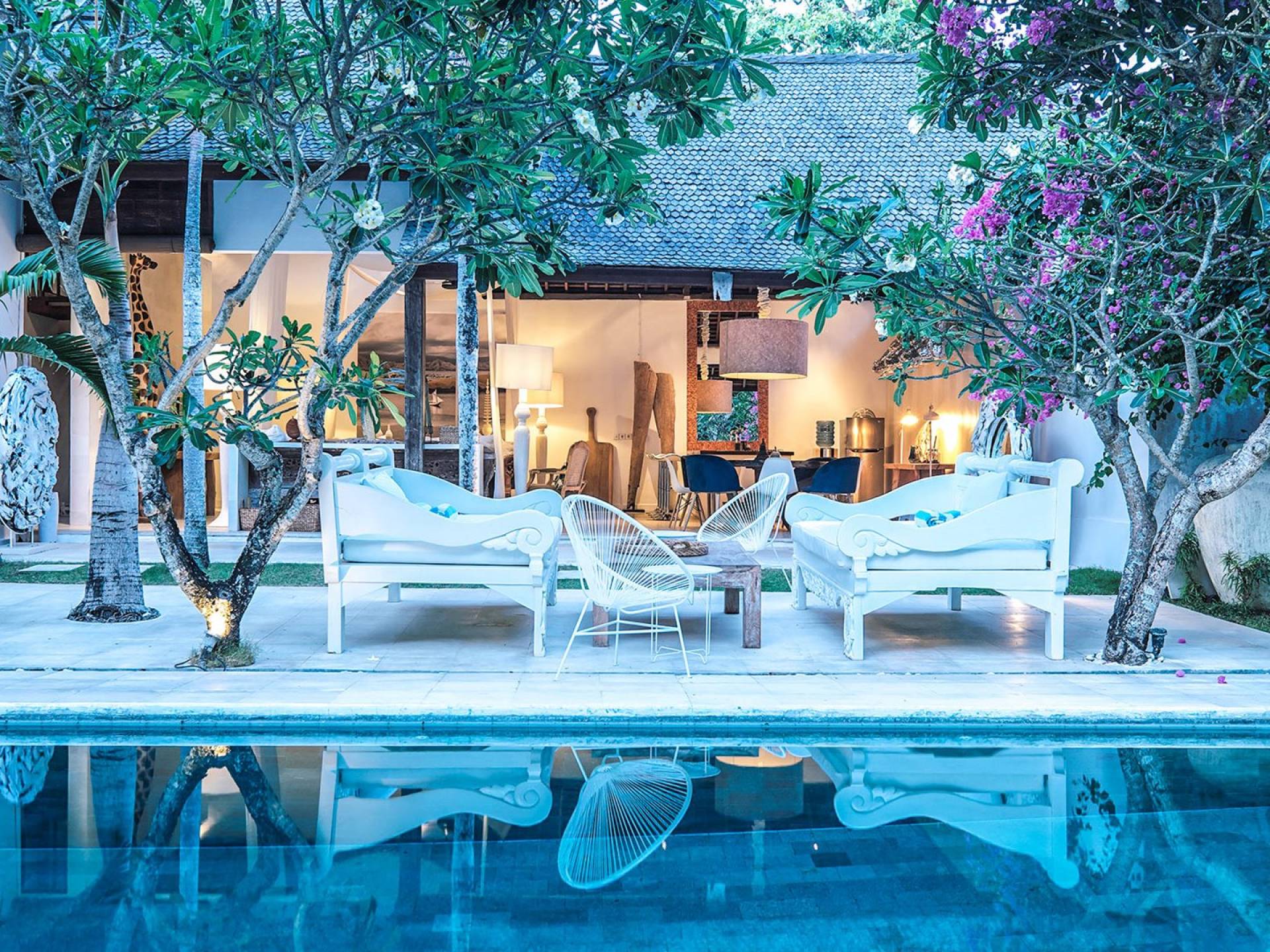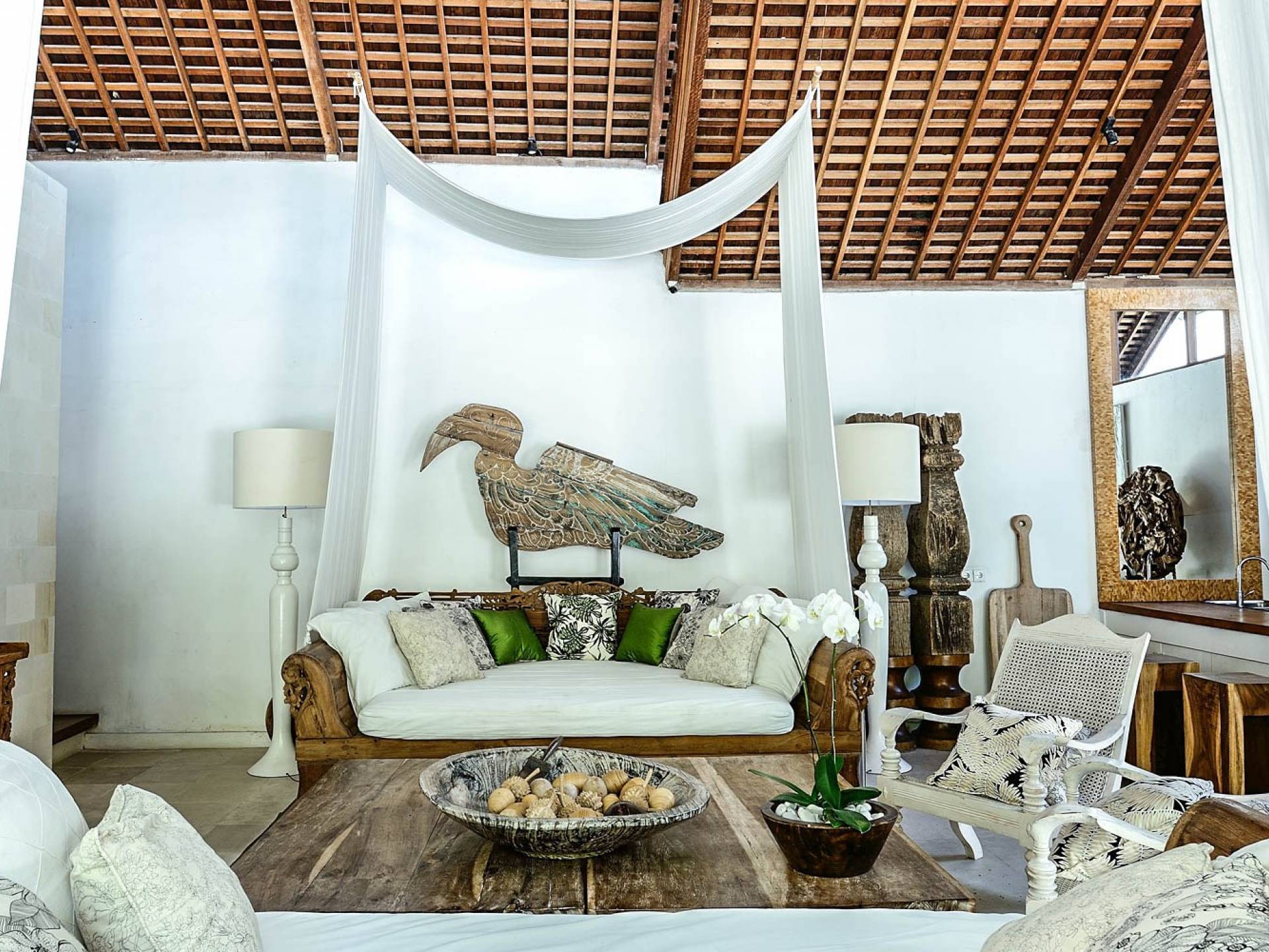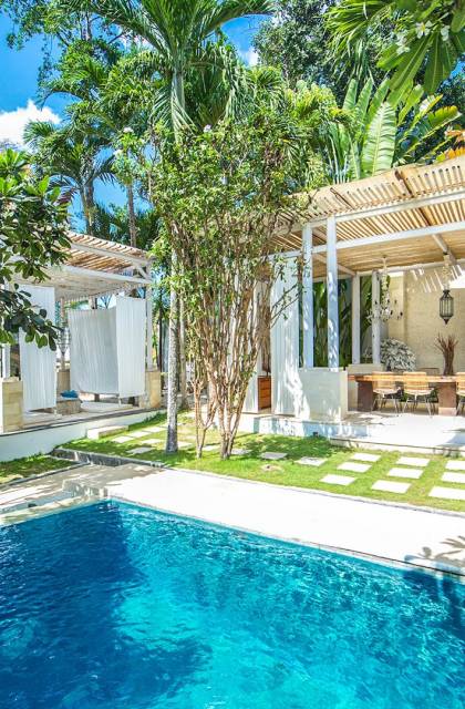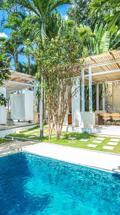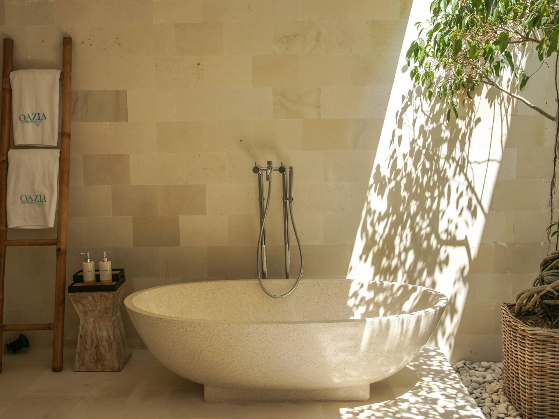 Η πισίνα 13 x 5 μέτρων γίνεται ένας τεράστιος καθρέφτης τη νύχτα, που αντανακλά τα δέντρα frangipani και τις απαλές κουρτίνες. Ο συνδυασμός λευκών υφασμάτων, ασβεστόλιθου, ξυλείας φυσικής παλαίωσης, αντίκες και μοντέρνας τέχνης δημιουργεί μια ατμόσφαιρα ονειρικής και γοητείας. Η Villa OAZIA White διαθέτει 2 master υπνοδωμάτια και 2 ξεχωριστά δωμάτια, τα οποία είναι προσβάσιμα μέσω μιας εκπληκτικής γέφυρας ποταμού. Όλα διαθέτουν μοναδικά υπαίθρια μπάνια και μπανιέρες, ώστε οι επισκέπτες να μπορούν να απομονωθούν.