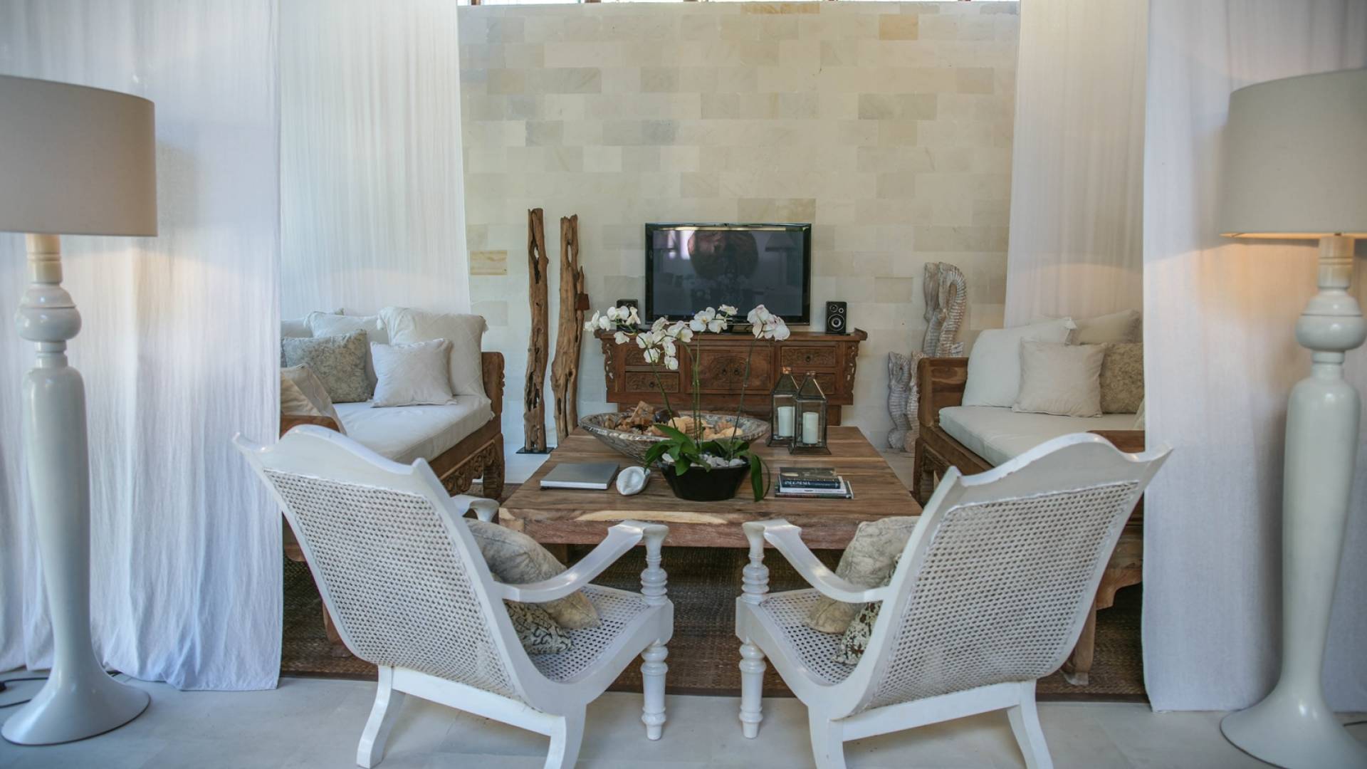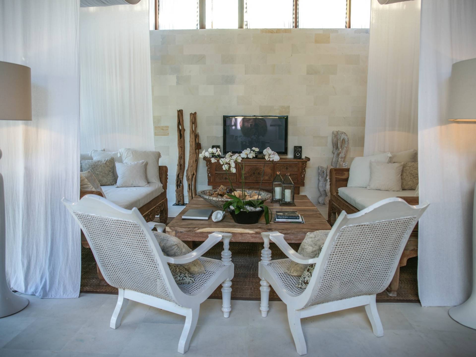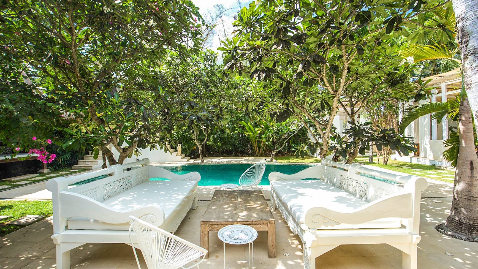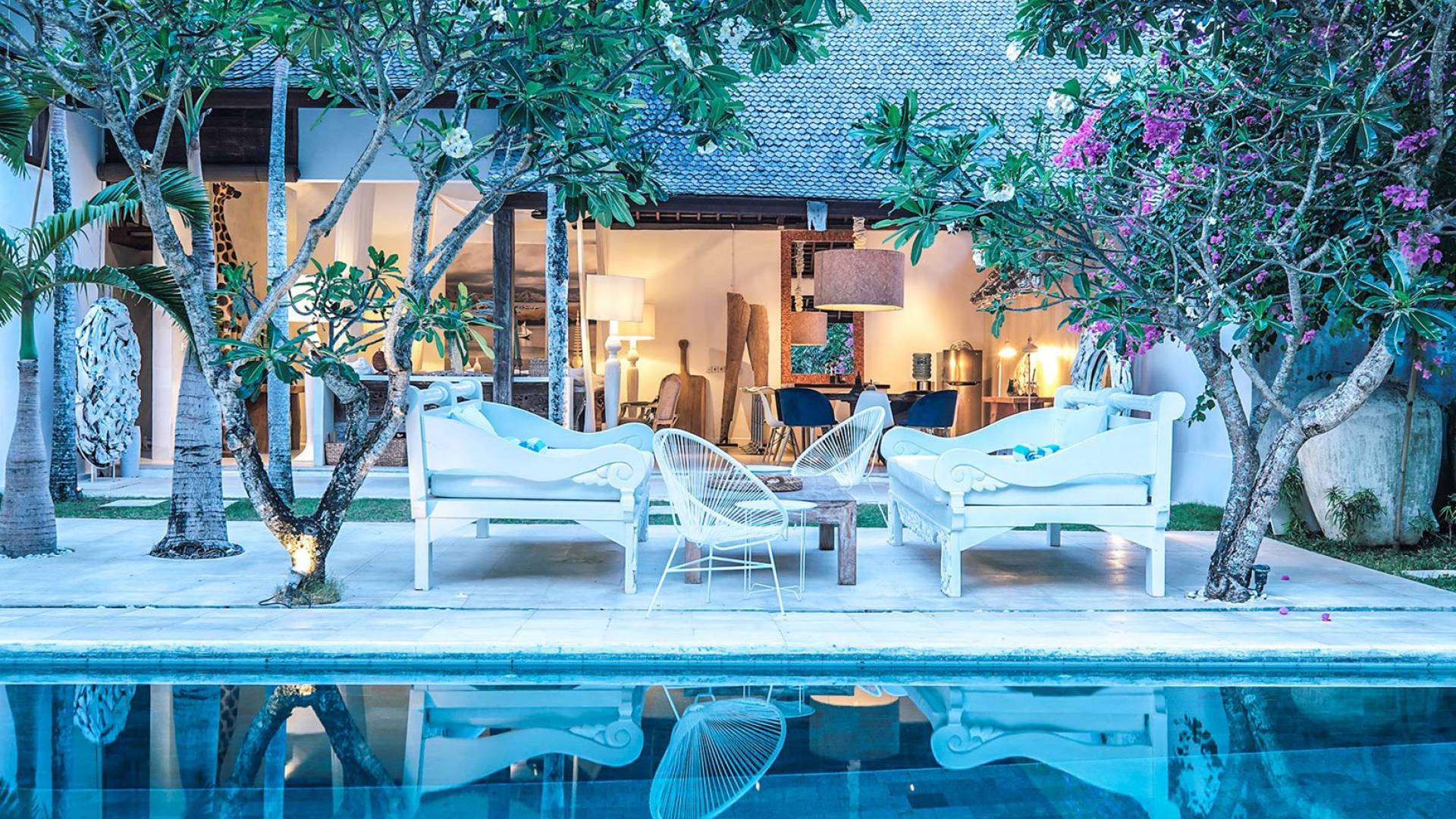 Η πισίνα 13 x 5 μέτρων γίνεται ένας τεράστιος καθρέφτης τη νύχτα, που αντανακλά τα δέντρα frangipani και τις απαλές κουρτίνες. Ο συνδυασμός λευκών υφασμάτων, ασβεστόλιθου, ξυλείας φυσικής παλαίωσης, αντίκες και μοντέρνας τέχνης δημιουργεί μια ατμόσφαιρα ονειρικής και γοητείας. Η Villa OAZIA White διαθέτει 2 master υπνοδωμάτια και 2 ξεχωριστά δωμάτια, τα οποία είναι προσβάσιμα μέσω μιας εκπληκτικής γέφυρας ποταμού. Όλα διαθέτουν μοναδικά υπαίθρια μπάνια και μπανιέρες, ώστε οι επισκέπτες να μπορούν να απομονωθούν.