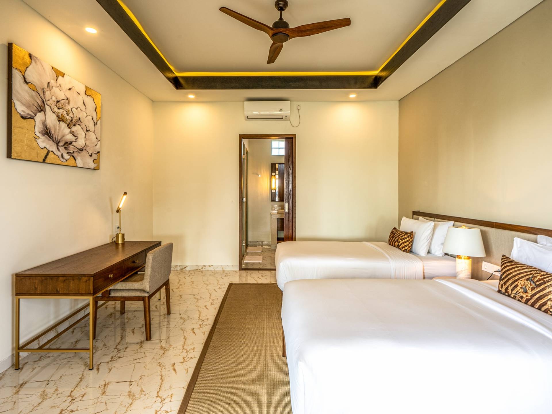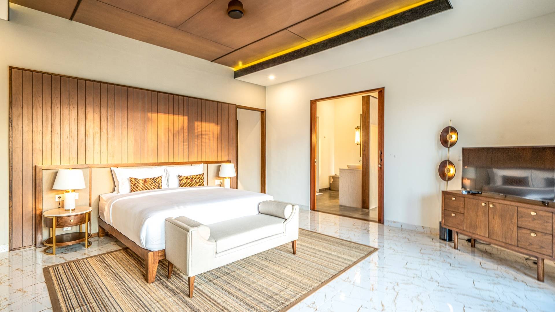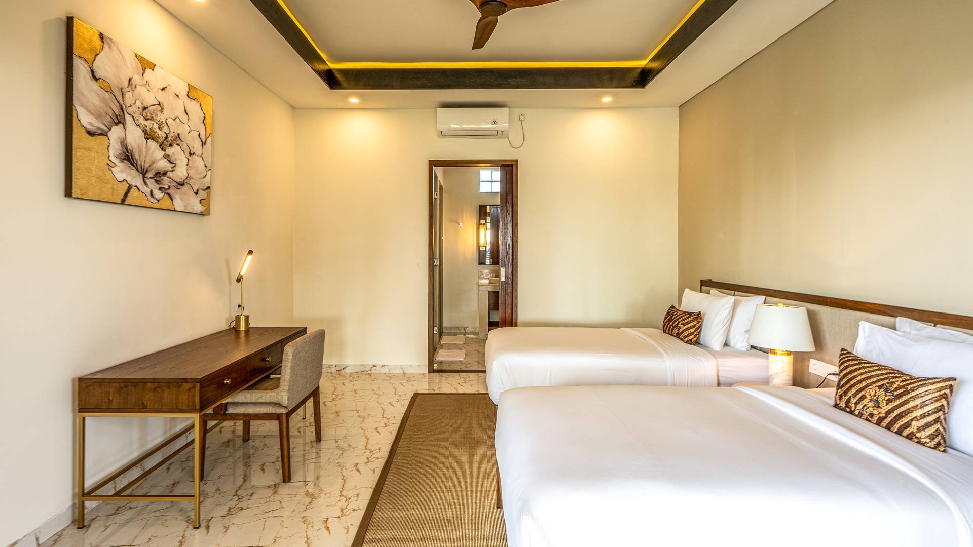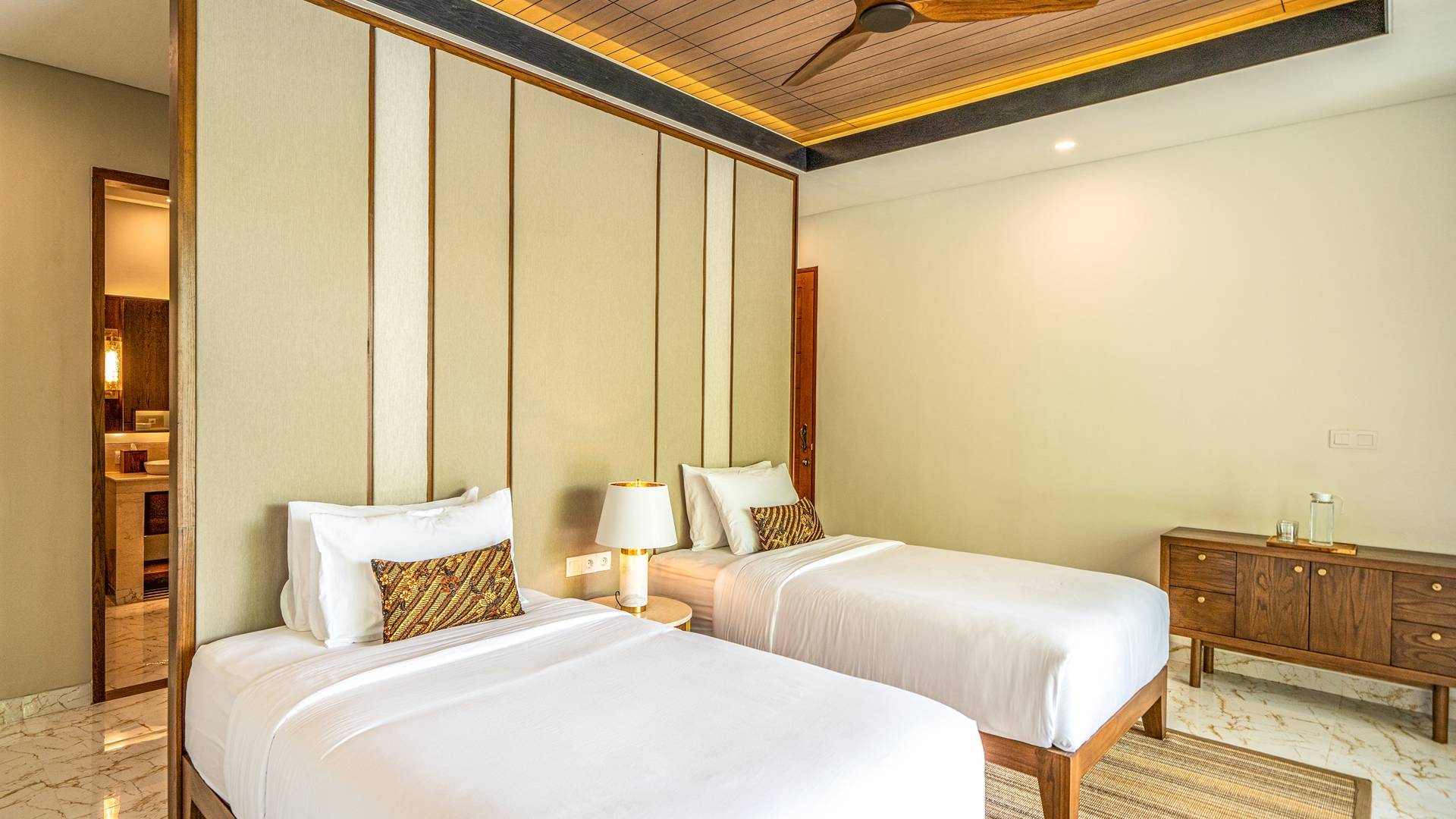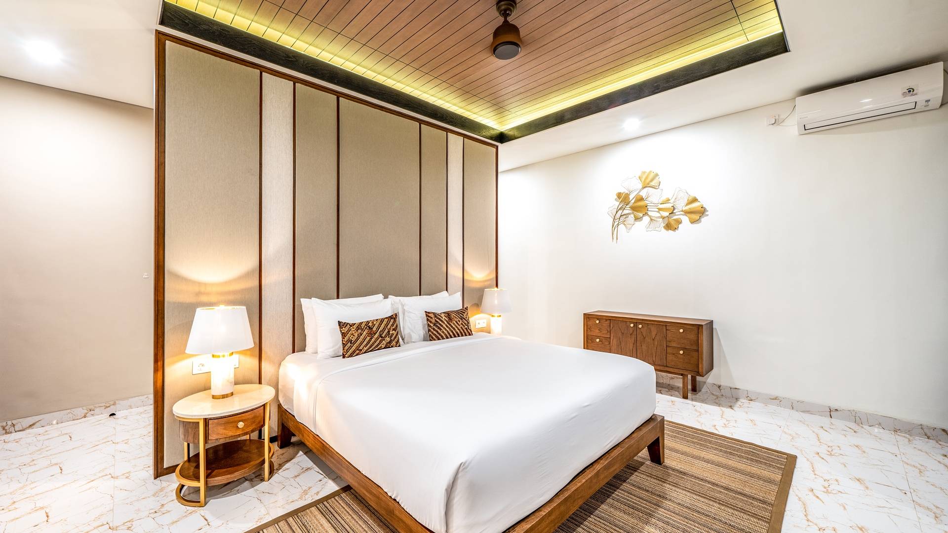 Εκθέτοντας πέντε υπνοδωμάτια σε δύο ορόφους, το καθένα διαθέτει τη δική του ντουλάπα από το δάπεδο μέχρι την οροφή, AC και ανεμιστήρα οροφής. Το κυρίως υπνοδωμάτιο στον τελευταίο όροφο διαθέτει τηλεόραση και μεγάλη ντουλάπα, καθώς και μπάνιο. Και τα τρία υπνοδωμάτια στον τελευταίο όροφο συνδέονται με μια μεγάλη βεράντα με ζιγκ-ζαγκ με θέα στην καταπράσινη πισίνα του κήπου από κάτω. Τα δύο υπνοδωμάτια στο ισόγειο συνδέονται μεταξύ τους, έχουν δική τους βεράντα καθώς και άμεση πρόσβαση στον κήπο της πισίνας. Από τα πέντε υπνοδωμάτια, τα τρία χρησιμοποιούν κρεβάτια queen με τα υπόλοιπα δύο μονά κρεβάτια.