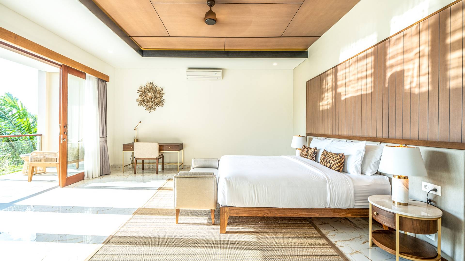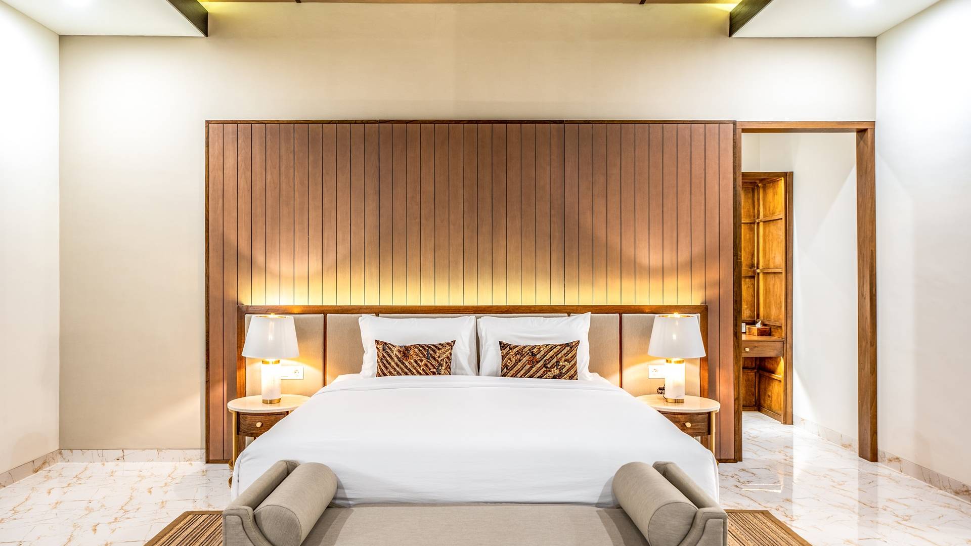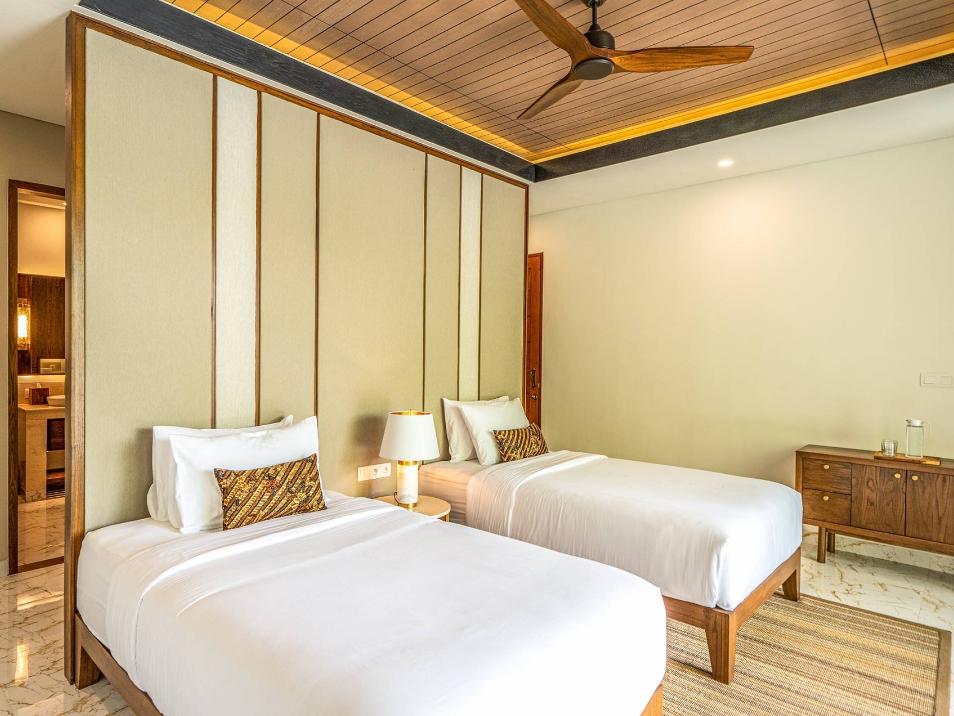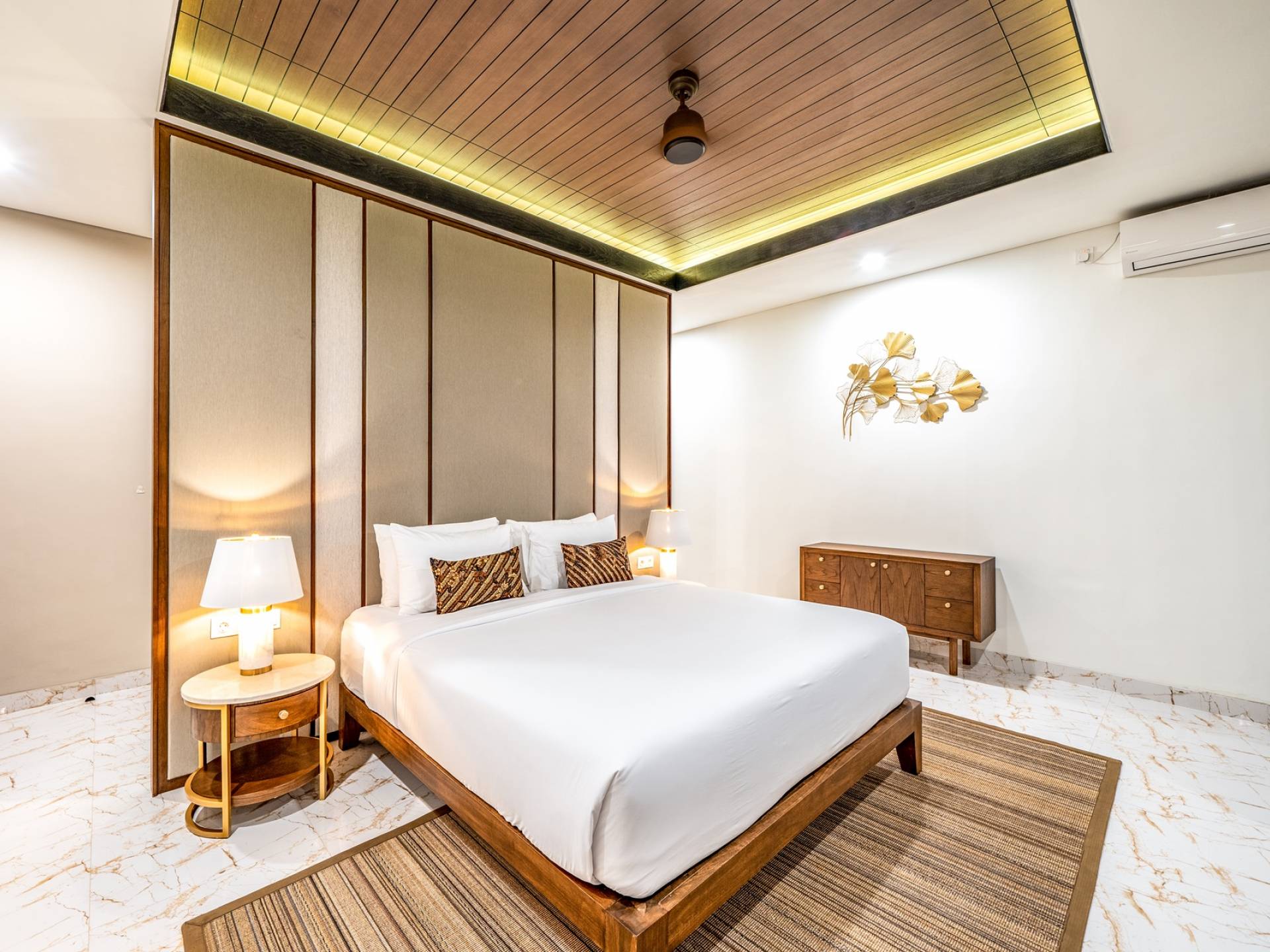 Εκθέτοντας πέντε υπνοδωμάτια σε δύο ορόφους, το καθένα διαθέτει τη δική του ντουλάπα από το δάπεδο μέχρι την οροφή, AC και ανεμιστήρα οροφής. Το κυρίως υπνοδωμάτιο στον τελευταίο όροφο διαθέτει τηλεόραση και μεγάλη ντουλάπα, καθώς και μπάνιο. Και τα τρία υπνοδωμάτια στον τελευταίο όροφο συνδέονται με μια μεγάλη βεράντα με ζιγκ-ζαγκ με θέα στην καταπράσινη πισίνα του κήπου από κάτω. Τα δύο υπνοδωμάτια στο ισόγειο συνδέονται μεταξύ τους, έχουν δική τους βεράντα καθώς και άμεση πρόσβαση στον κήπο της πισίνας. Από τα πέντε υπνοδωμάτια, τα τρία χρησιμοποιούν κρεβάτια queen με τα υπόλοιπα δύο μονά κρεβάτια.