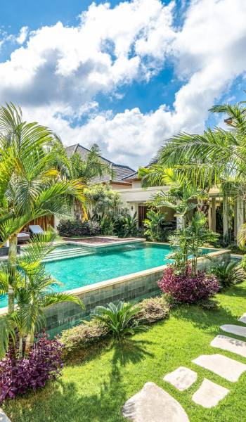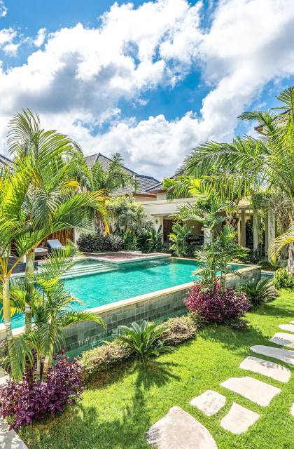 Η φύση βρίσκεται στο επίκεντρο της Villa Reillo. Όπου και να κοιτάξετε, η σαρωτική χλωρίδα γεμίζει το πλαίσιο. Το επίκεντρο του εξωτερικού χώρου είναι η υπερυψωμένη πισίνα σε σχήμα Τ, η οποία είναι υπέροχα στριμωγμένη από πλούσια βλάστηση κάθε είδους. Από τα παραδοσιακά τροπικά φυτά μέχρι τα αμπέλια που κυλούν στο μπαλκόνι, από το χαμηλό φύτρωτο γρασίδι μέχρι τα πανύψηλα δέντρα, αυτό το πολύχρωμο οικοσύστημα ευδοκιμεί και προσδίδει ένα αποτέλεσμα που εμπλουτίζει την ψυχή. Στην άκρη της πισίνας, ένα κιόσκι πολλαπλών χρήσεων στέκεται ακριβώς δίπλα στον ήλιο. Για υπαίθριους ψυχαγωγικούς σκοπούς, υπάρχει επίσης ένας εκτεταμένος χλοώδης χώρος στη βεράντα του τελευταίου ορόφου, μαζί με δύο χαρακτηριστικά νερού.