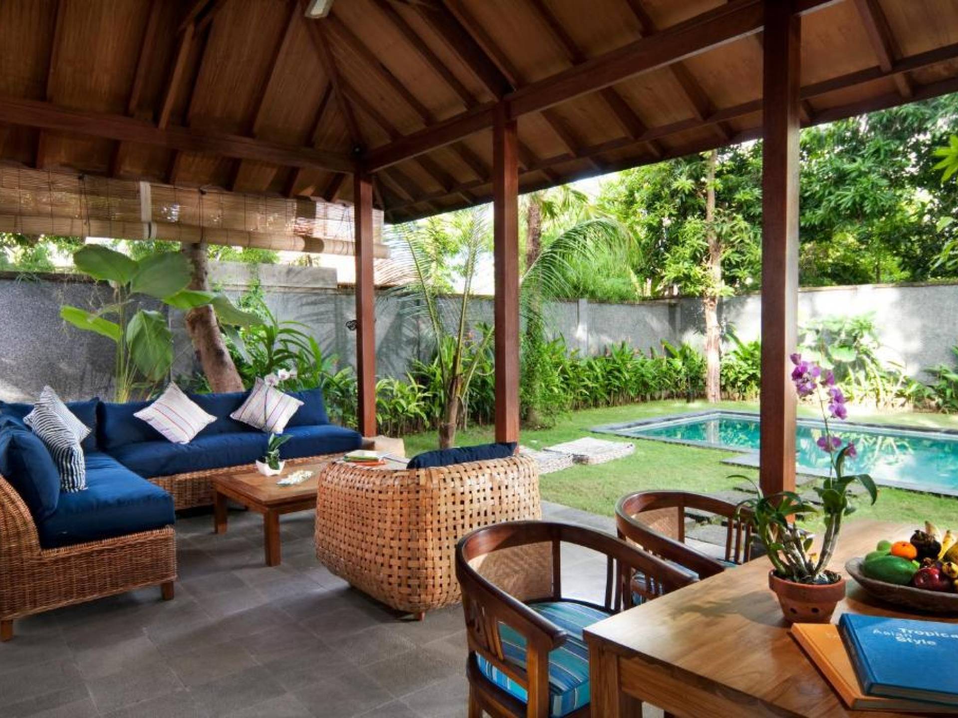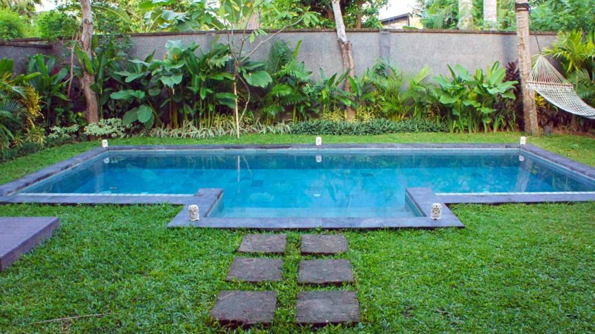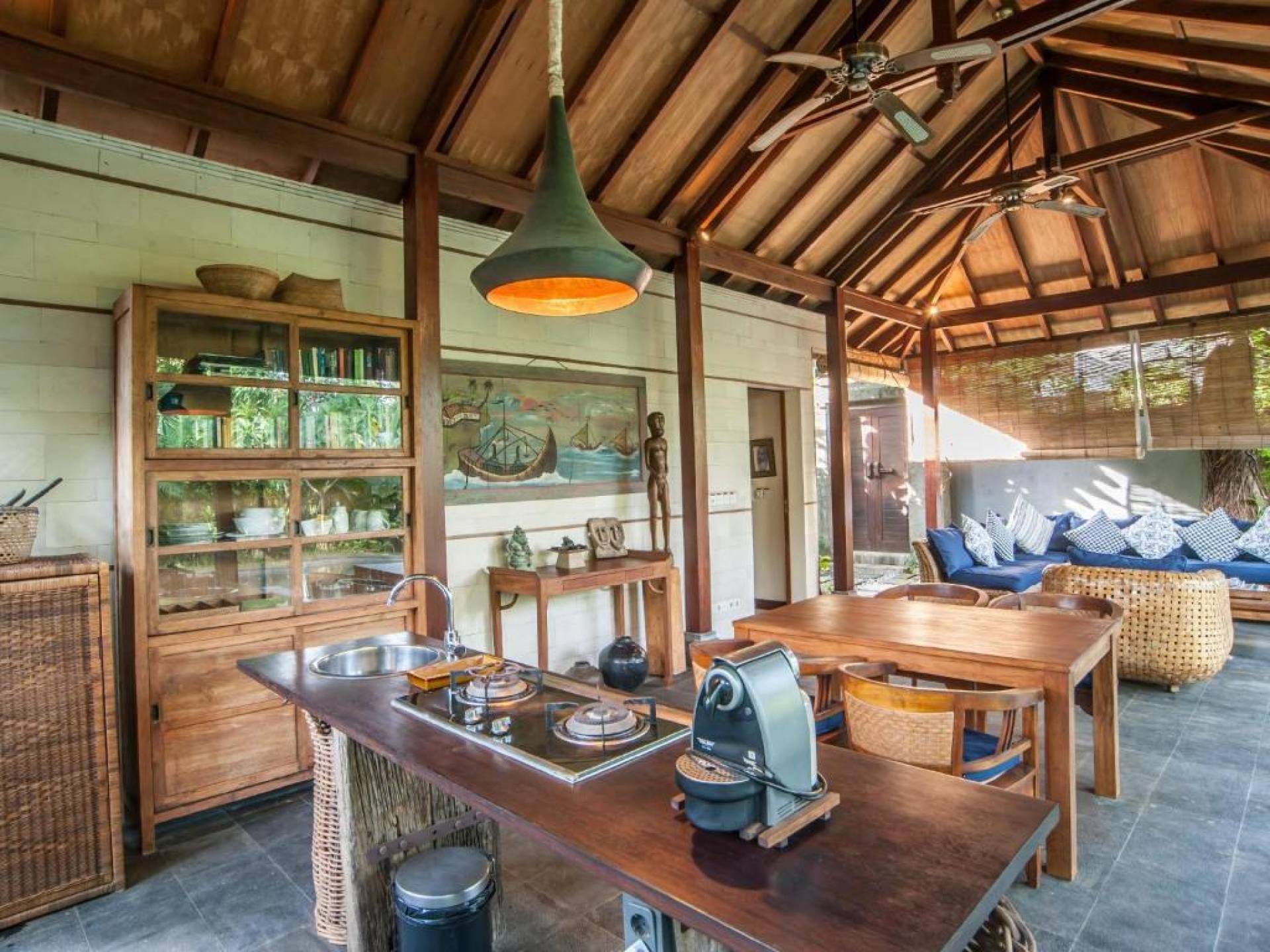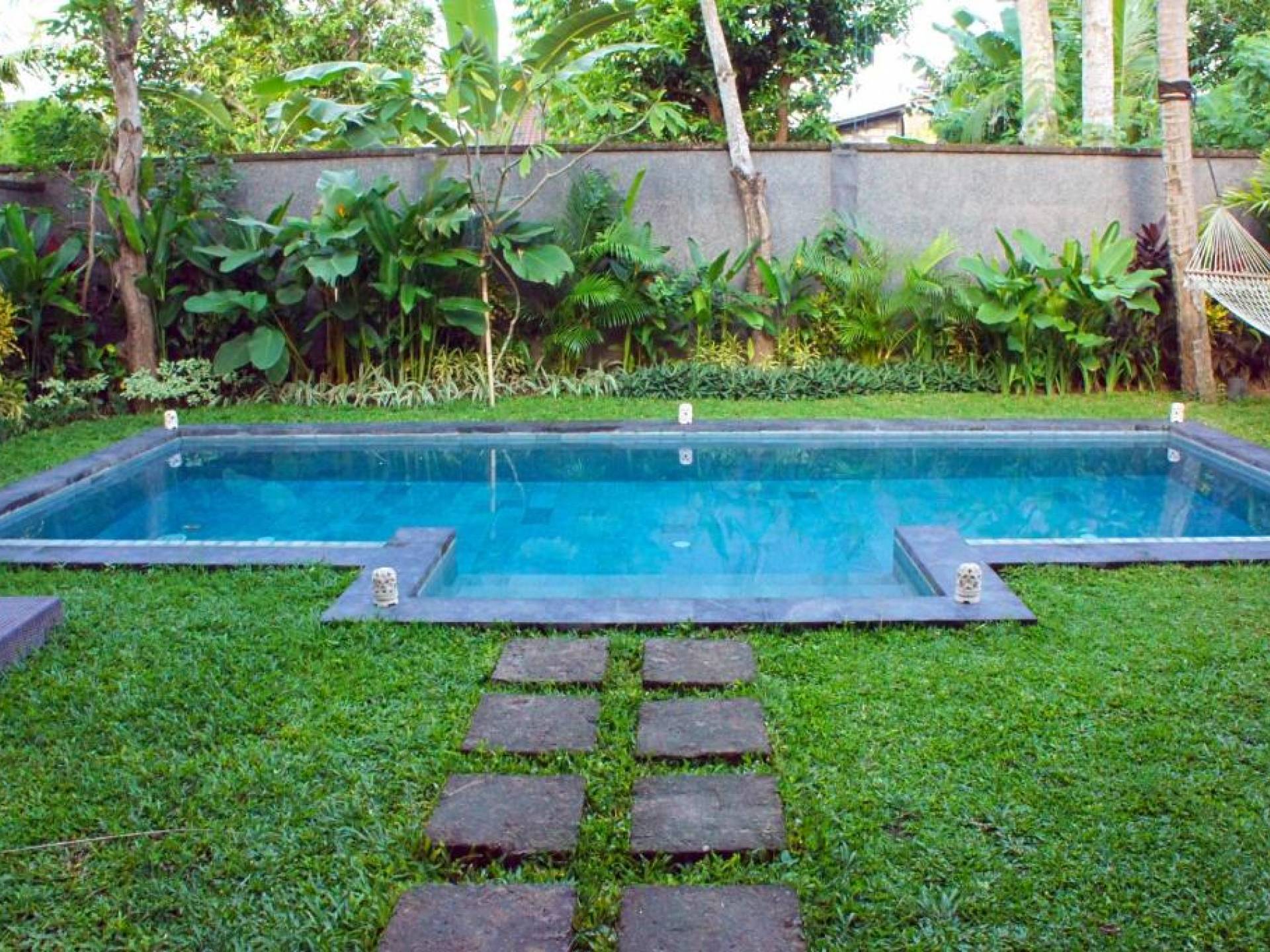 Συμπληρώνει τη ρύθμιση μια πλήρως εξοπλισμένη κουζίνα με επιτραπέζια σκεύη, ψυγείο, καφετιέρα Nespresso και διανομή πόσιμου νερού. Ο ιδιωτικός κήπος περιβάλλει την κομψή μαύρη και πράσινη πέτρινη πισίνα 9 μέτρων, όπου οι επισκέπτες μας μπορούν να χαλαρώσουν και να κάνουν ηλιοθεραπεία στην αιώρα ή στις ξαπλώστρες. Στο εσωτερικό, το πολυτελές υπνοδωμάτιο είναι επιπλωμένο σε μοντέρνο στιλ. - κρεβάτι μεγέθους είναι εξοπλισμένο με κουνουπιέρα, ανεμιστήρες οροφής, κλιματισμό, δορυφορική τηλεόραση επίπεδης οθόνης, DVD player και βάση σύνδεσης για i-pod. Το μπάνιο με ξύλινο πάτωμα έχει δύο πέτρινες σκαλιστές νιπτήρες, μια κομψή μπανιέρα από μαύρη πέτρα και ξεχωριστό ντους και τουαλέτα.