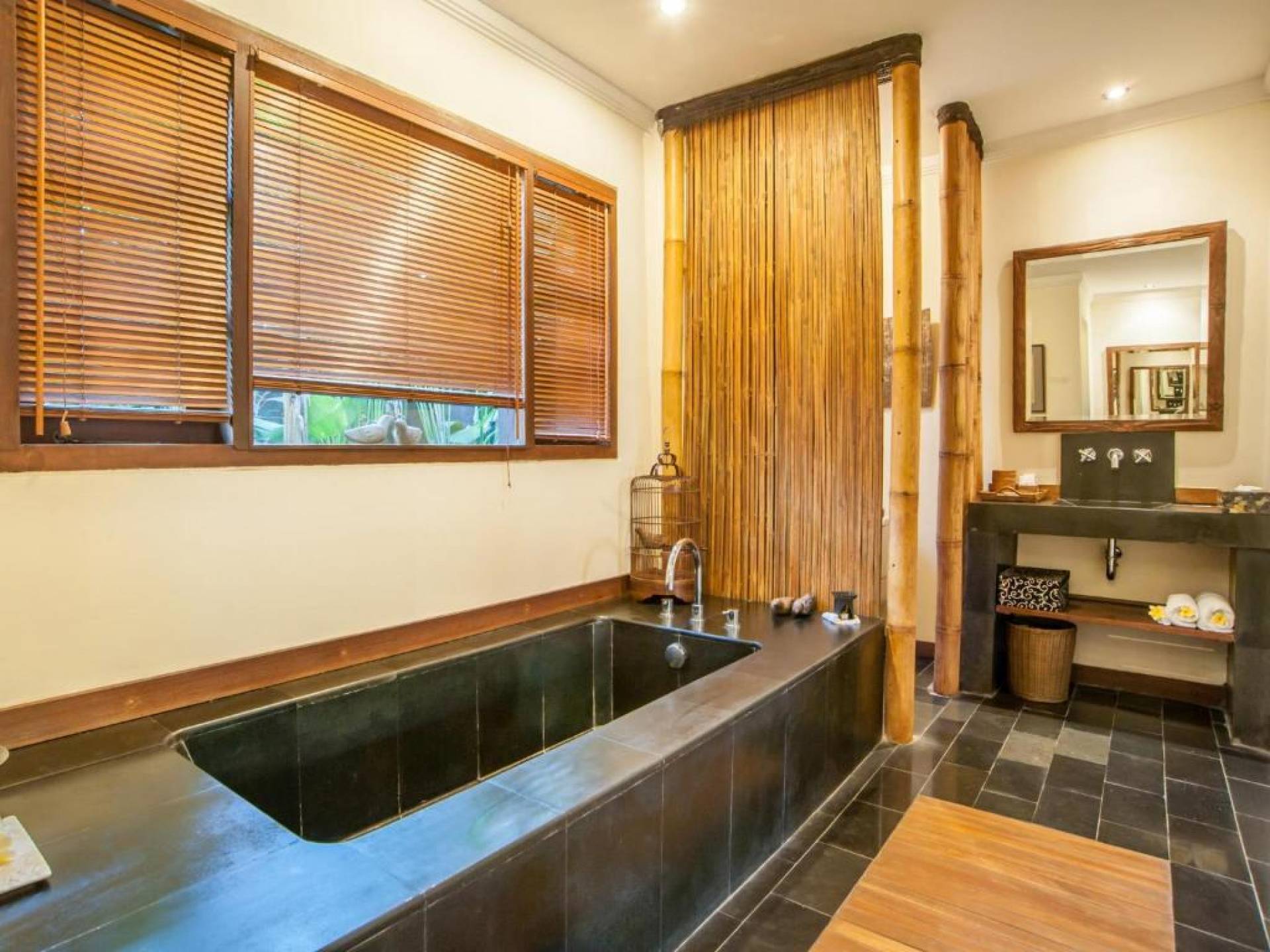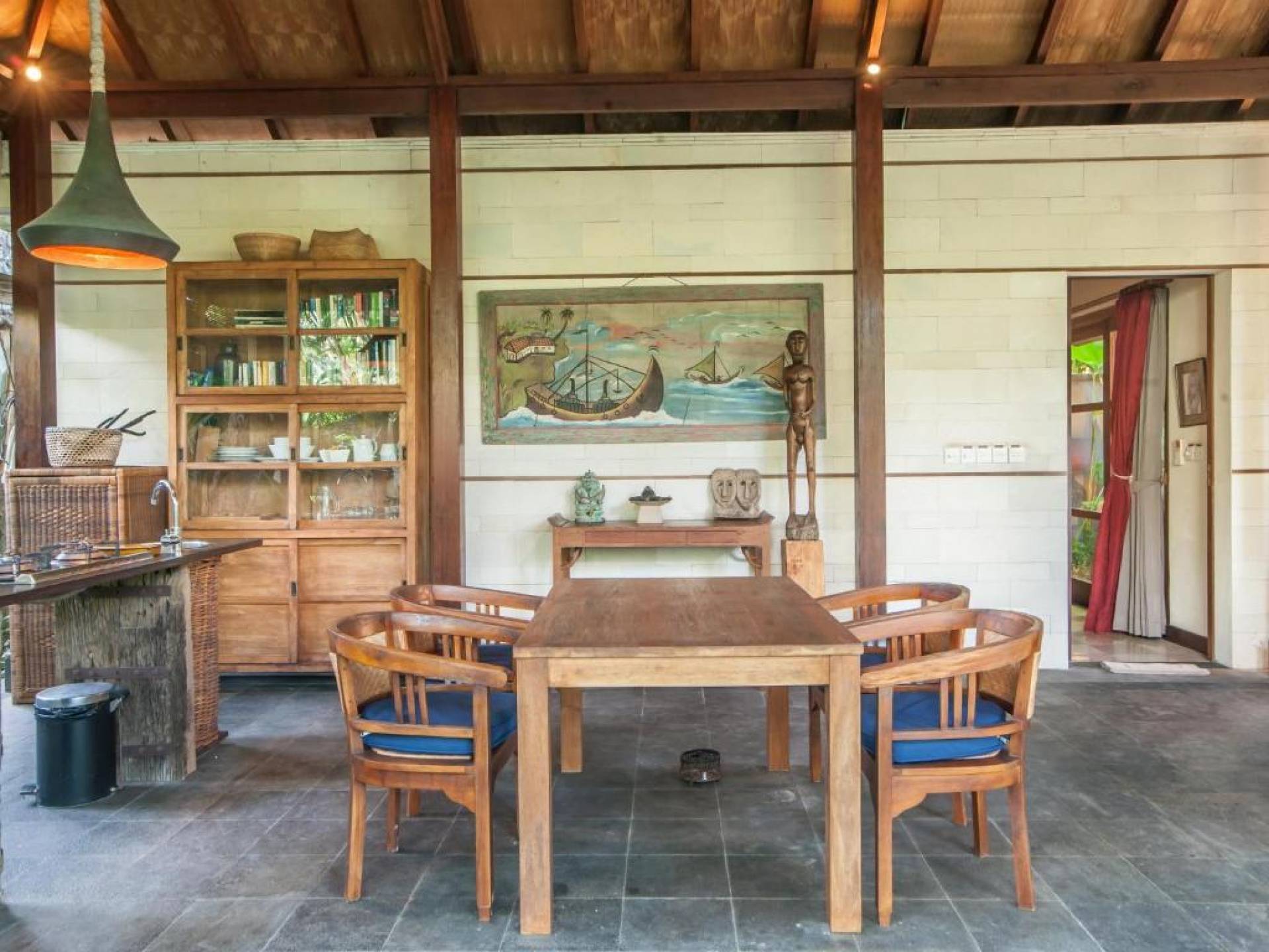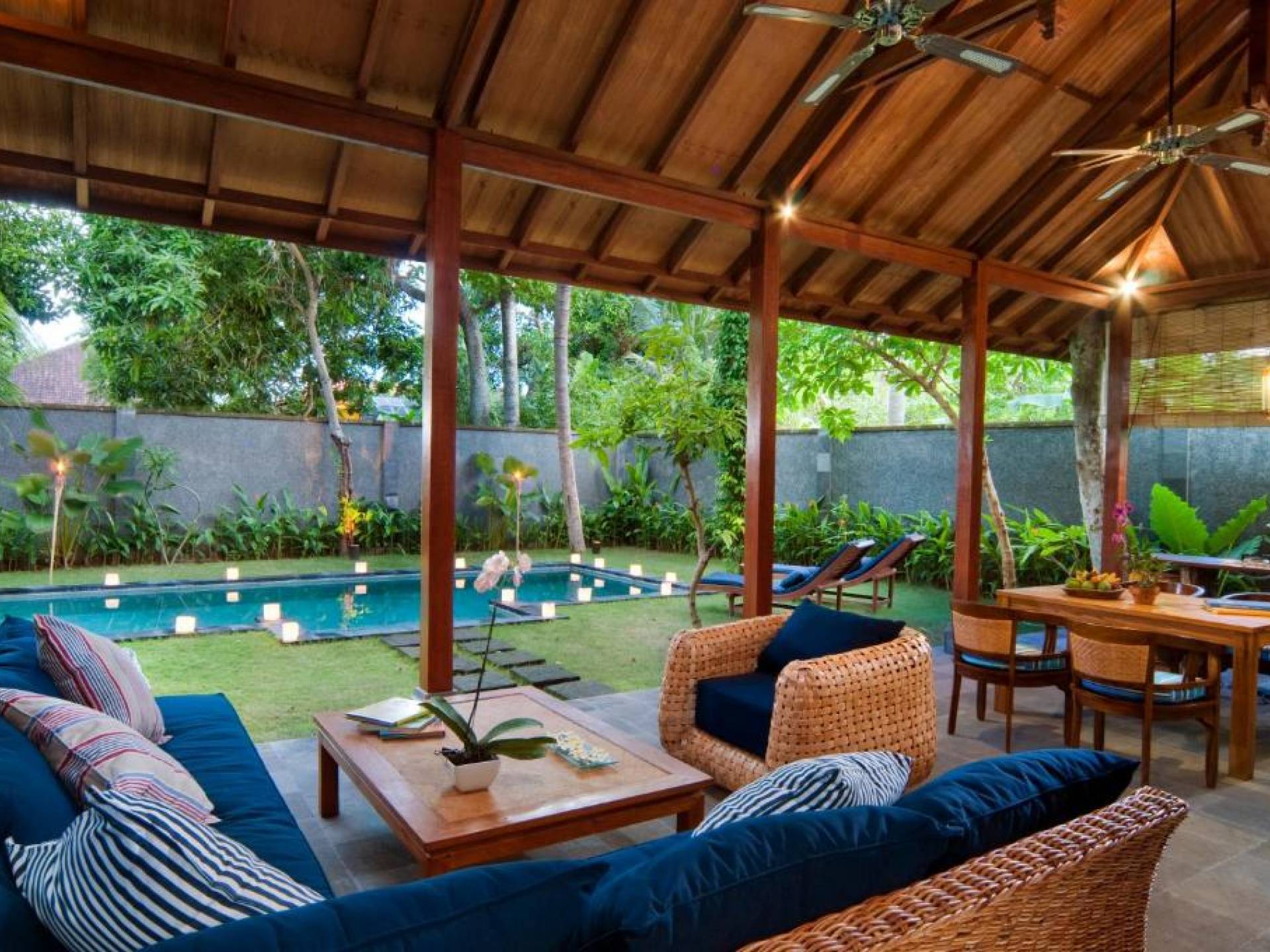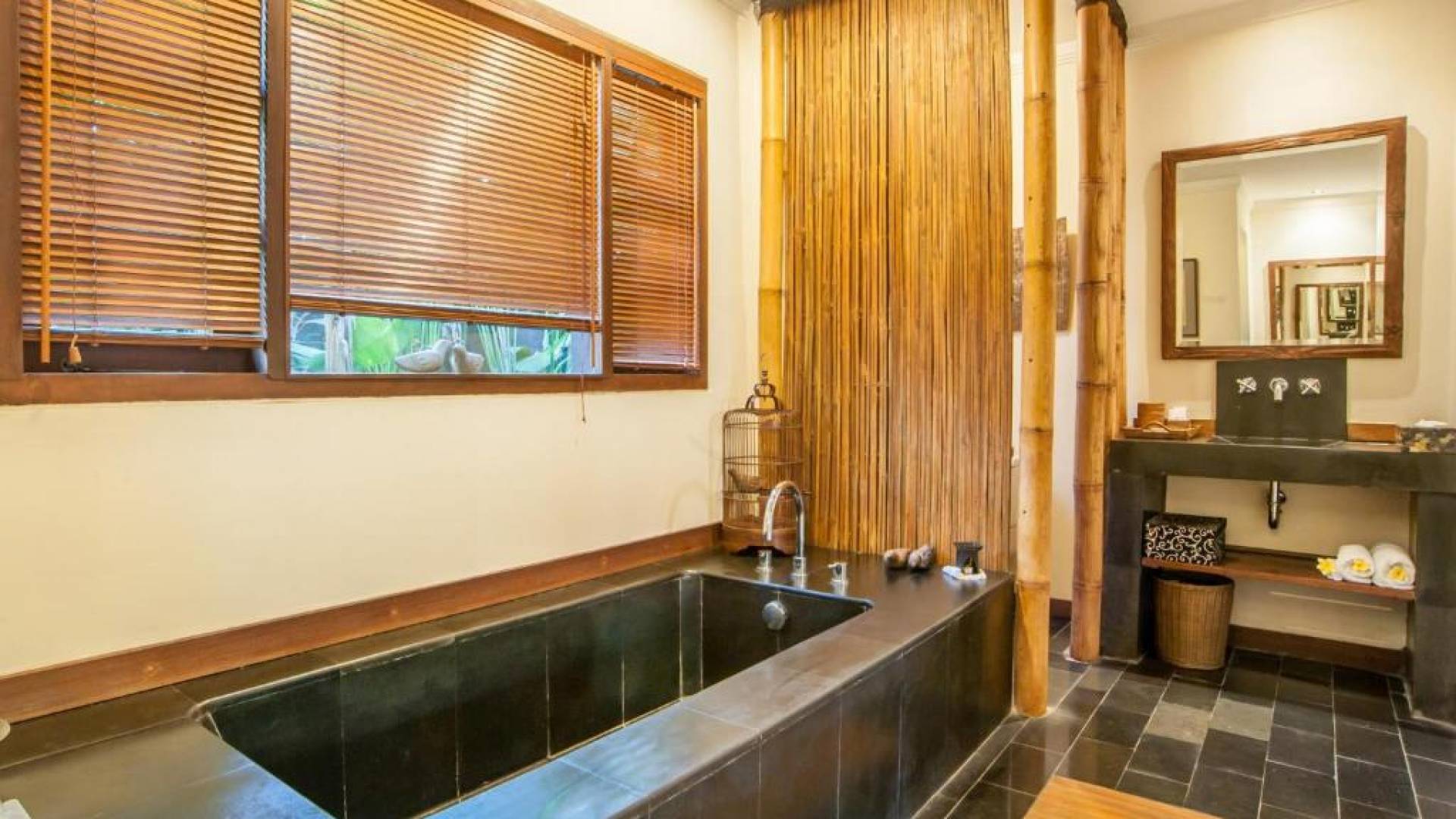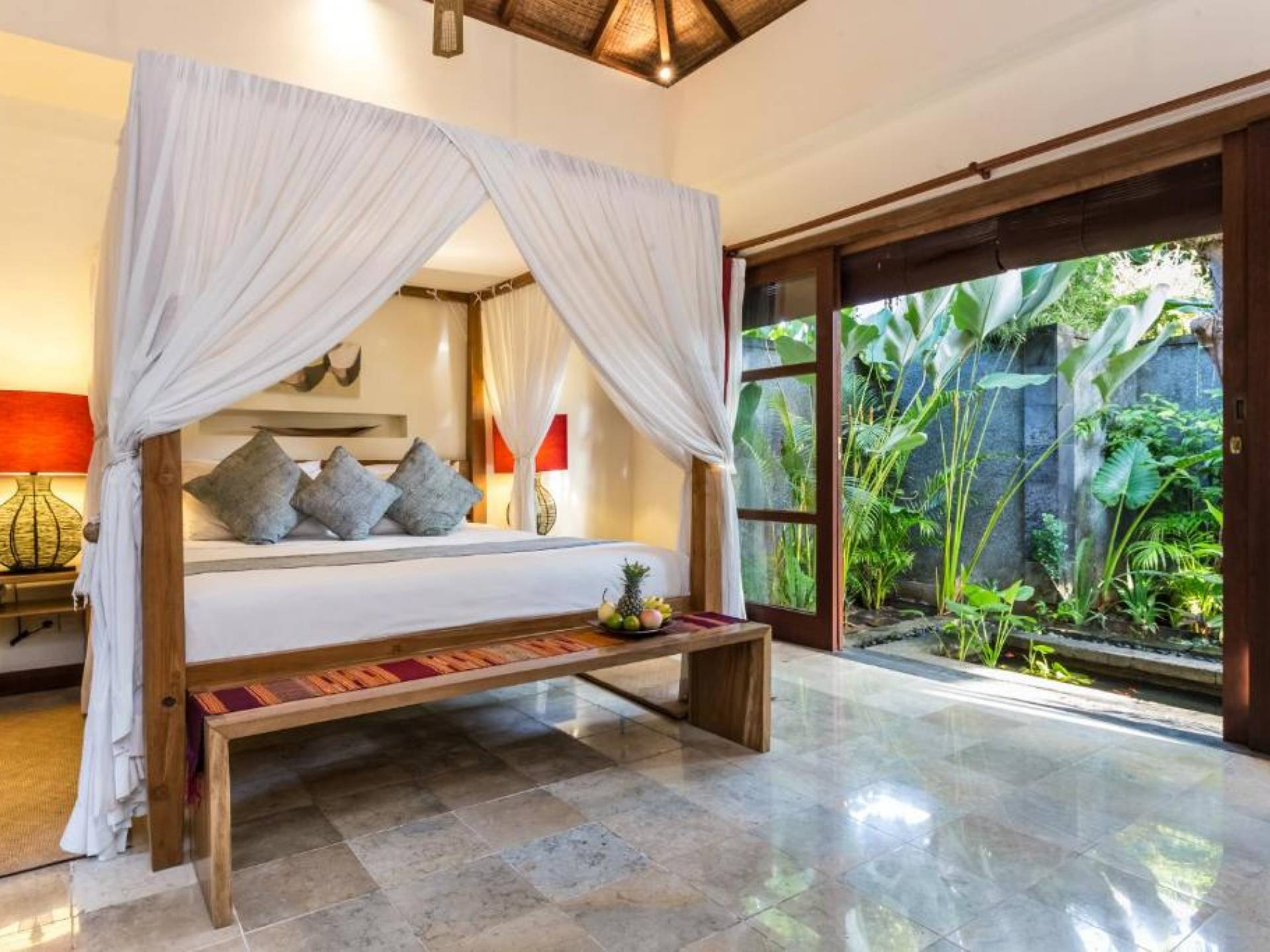 Συμπληρώνει τη ρύθμιση μια πλήρως εξοπλισμένη κουζίνα με επιτραπέζια σκεύη, ψυγείο, καφετιέρα Nespresso και διανομή πόσιμου νερού. Ο ιδιωτικός κήπος περιβάλλει την κομψή μαύρη και πράσινη πέτρινη πισίνα 9 μέτρων, όπου οι επισκέπτες μας μπορούν να χαλαρώσουν και να κάνουν ηλιοθεραπεία στην αιώρα ή στις ξαπλώστρες. Στο εσωτερικό, το πολυτελές υπνοδωμάτιο είναι επιπλωμένο σε μοντέρνο στιλ. - κρεβάτι μεγέθους είναι εξοπλισμένο με κουνουπιέρα, ανεμιστήρες οροφής, κλιματισμό, δορυφορική τηλεόραση επίπεδης οθόνης, DVD player και βάση σύνδεσης για i-pod. Το μπάνιο με ξύλινο πάτωμα έχει δύο πέτρινες σκαλιστές νιπτήρες, μια κομψή μπανιέρα από μαύρη πέτρα και ξεχωριστό ντους και τουαλέτα.