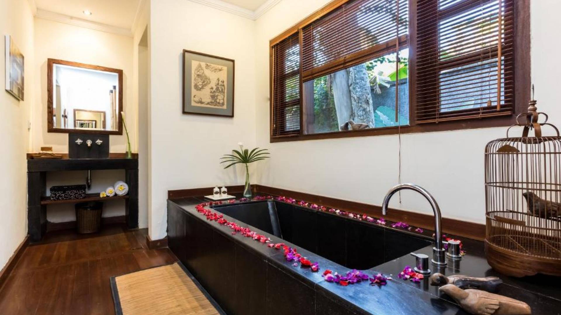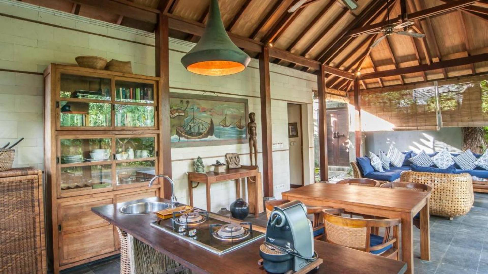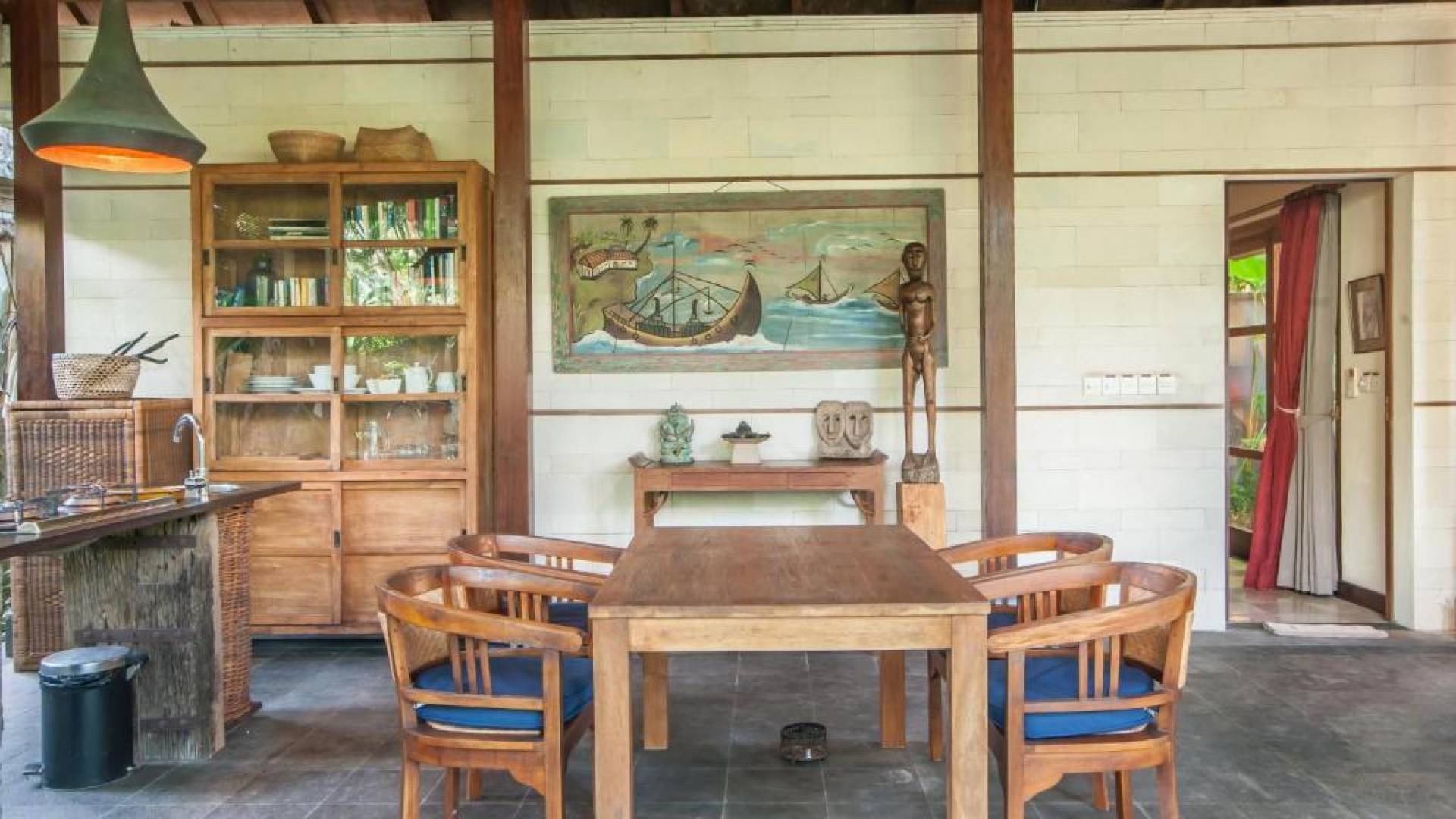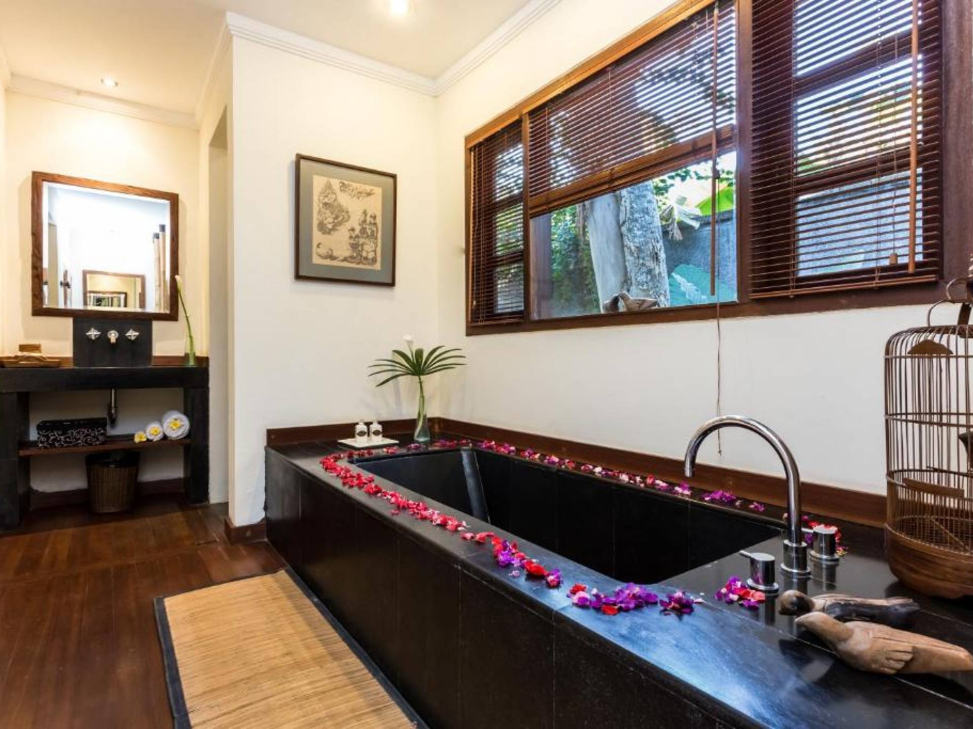 Συμπληρώνει τη ρύθμιση μια πλήρως εξοπλισμένη κουζίνα με επιτραπέζια σκεύη, ψυγείο, καφετιέρα Nespresso και διανομή πόσιμου νερού. Ο ιδιωτικός κήπος περιβάλλει την κομψή μαύρη και πράσινη πέτρινη πισίνα 9 μέτρων, όπου οι επισκέπτες μας μπορούν να χαλαρώσουν και να κάνουν ηλιοθεραπεία στην αιώρα ή στις ξαπλώστρες. Στο εσωτερικό, το πολυτελές υπνοδωμάτιο είναι επιπλωμένο σε μοντέρνο στιλ. - κρεβάτι μεγέθους είναι εξοπλισμένο με κουνουπιέρα, ανεμιστήρες οροφής, κλιματισμό, δορυφορική τηλεόραση επίπεδης οθόνης, DVD player και βάση σύνδεσης για i-pod. Το μπάνιο με ξύλινο πάτωμα έχει δύο πέτρινες σκαλιστές νιπτήρες, μια κομψή μπανιέρα από μαύρη πέτρα και ξεχωριστό ντους και τουαλέτα.