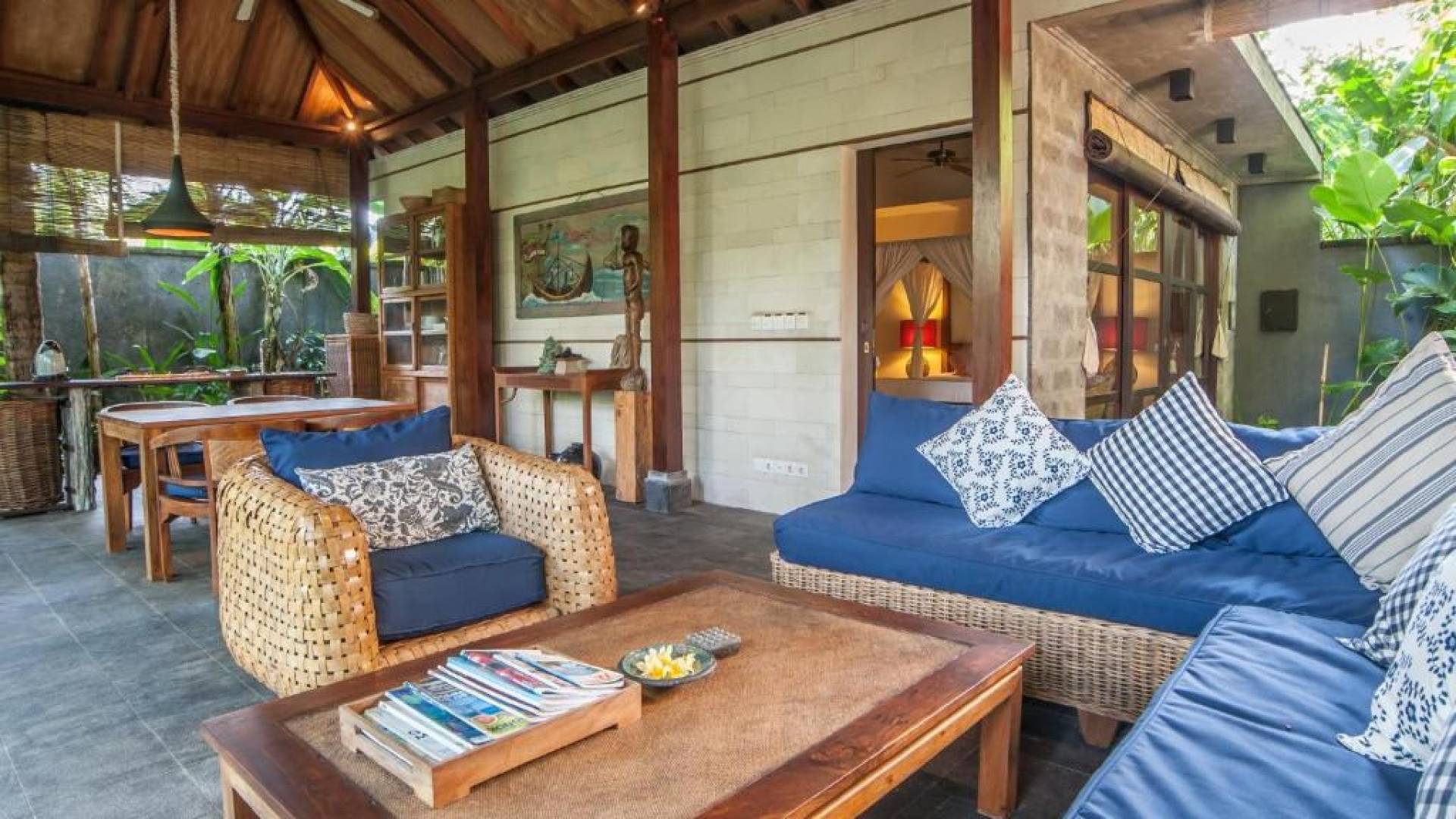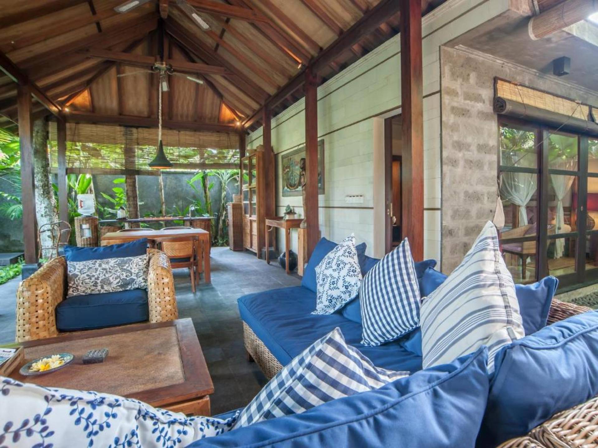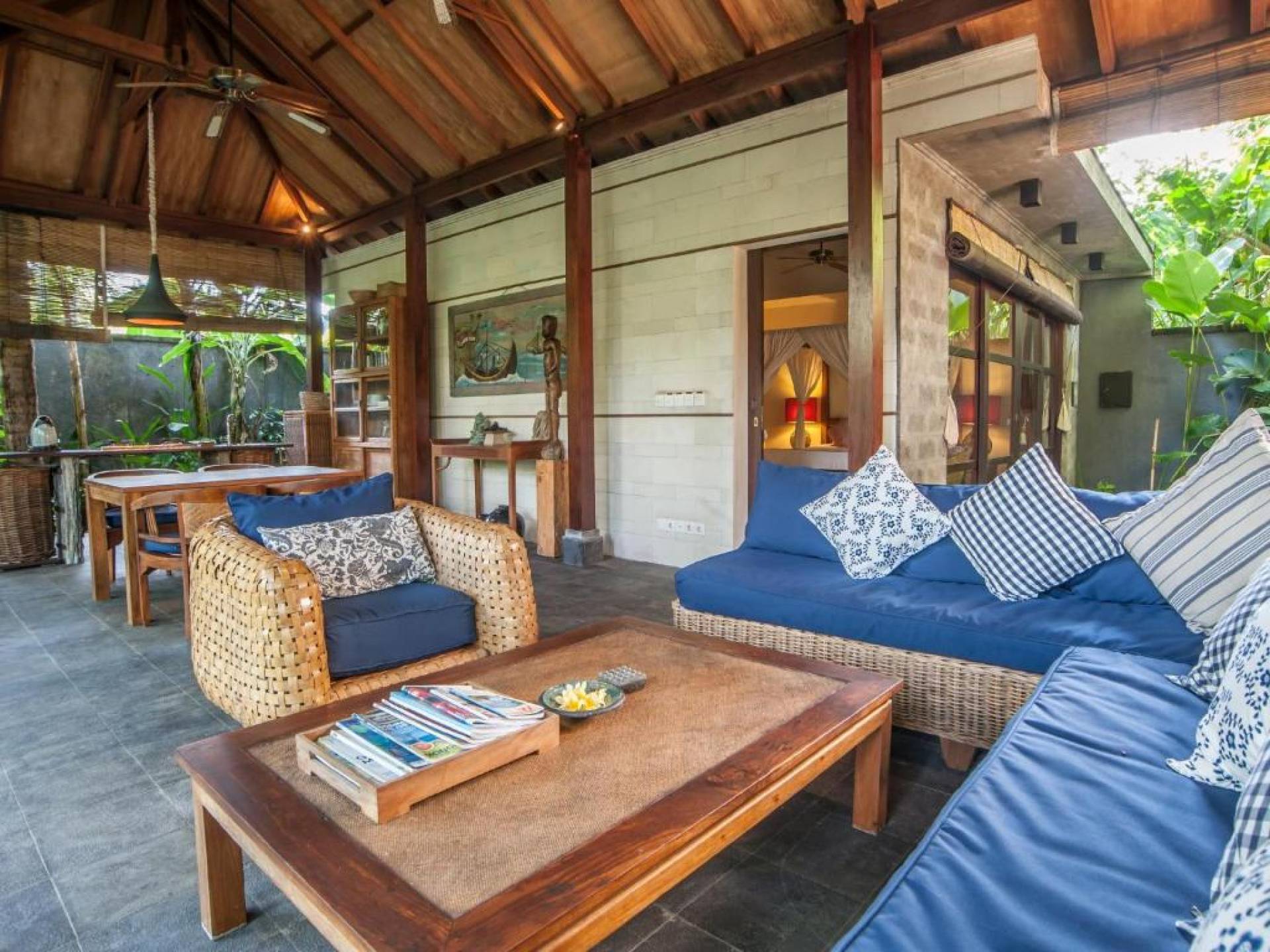 Η Villa Gecko Bali αποτελείται από ένα ανοιχτό σαλόνι επιπλωμένο με κομψό καναπέ από ρατάν, τραπεζάκι και τραπεζαρία με καρέκλες, βιβλιοθήκη με βιβλία και DVD και δύο ανεμιστήρες οροφής.