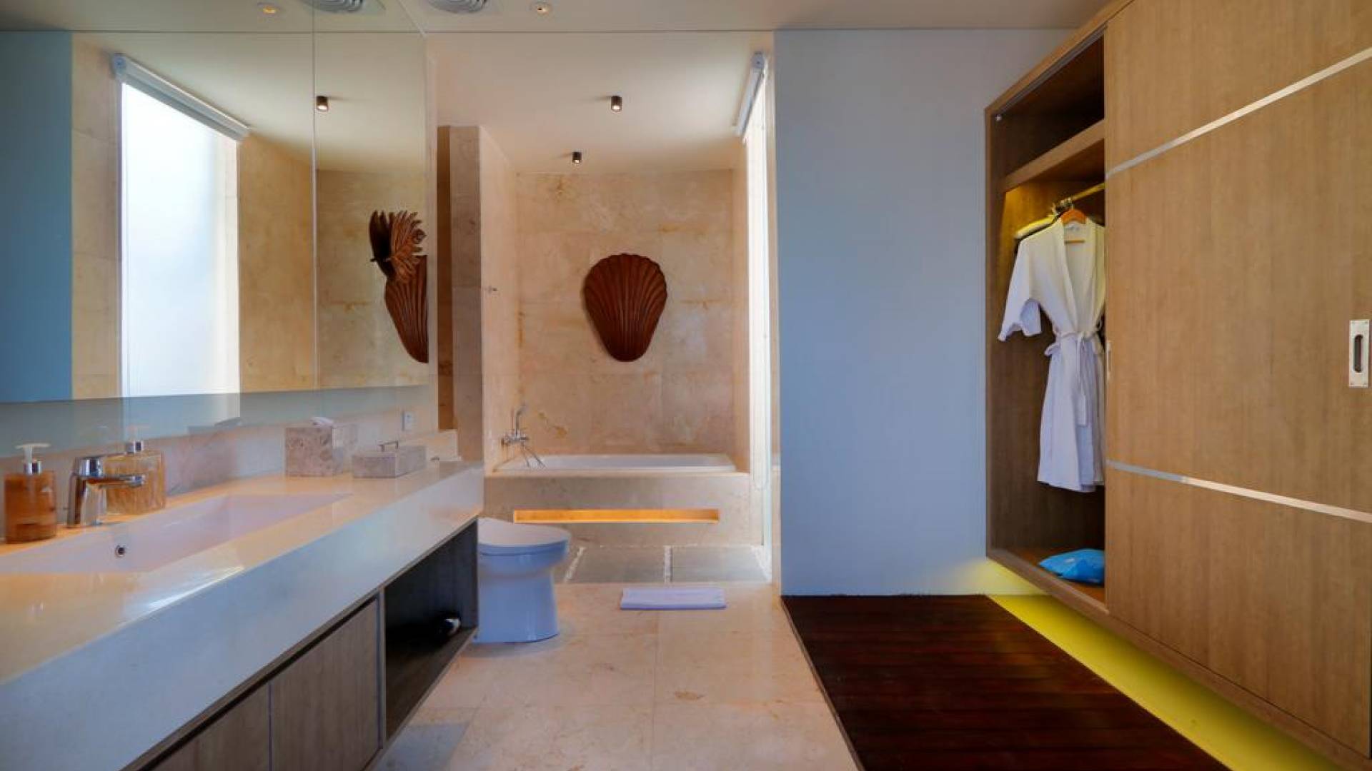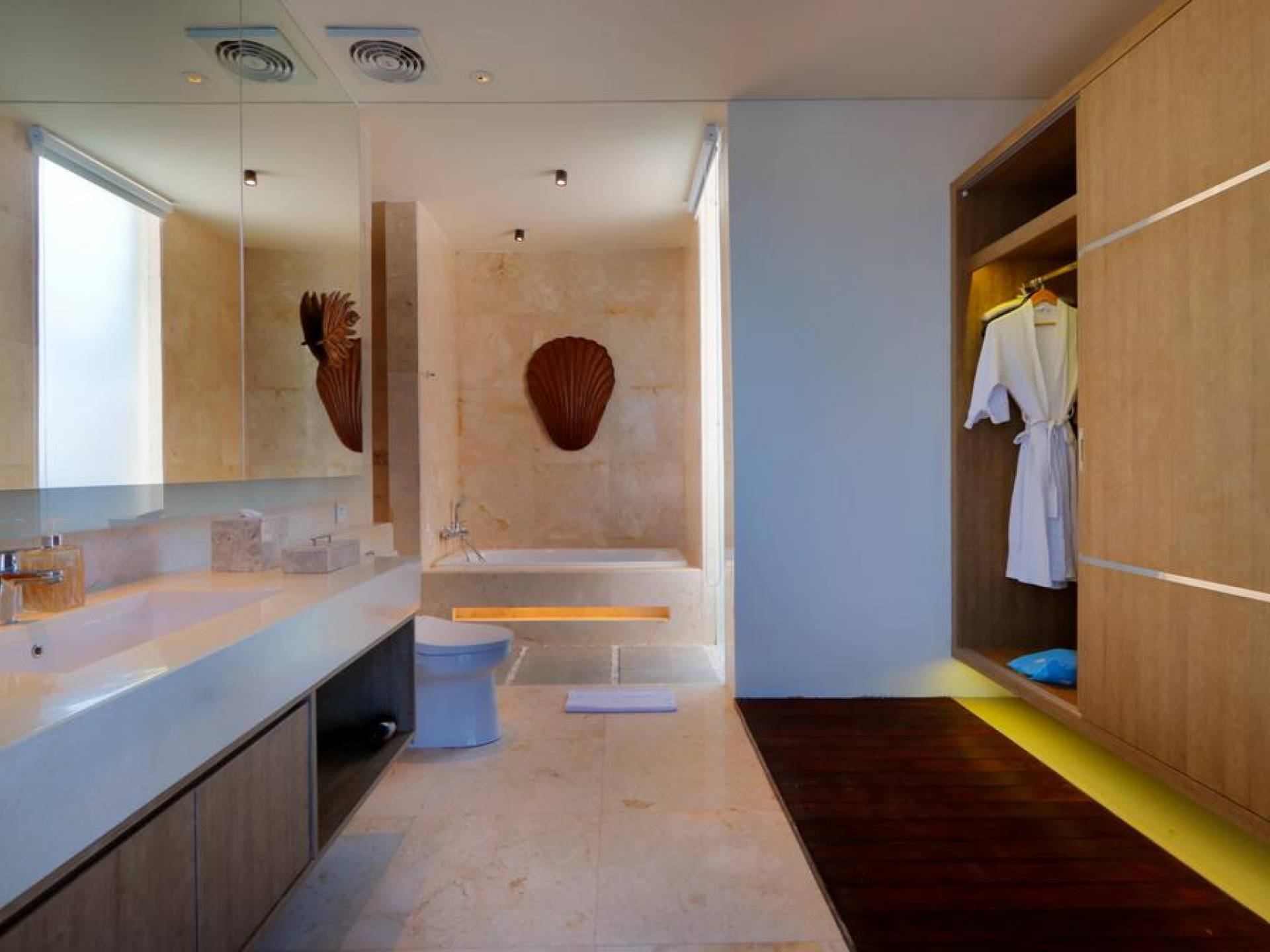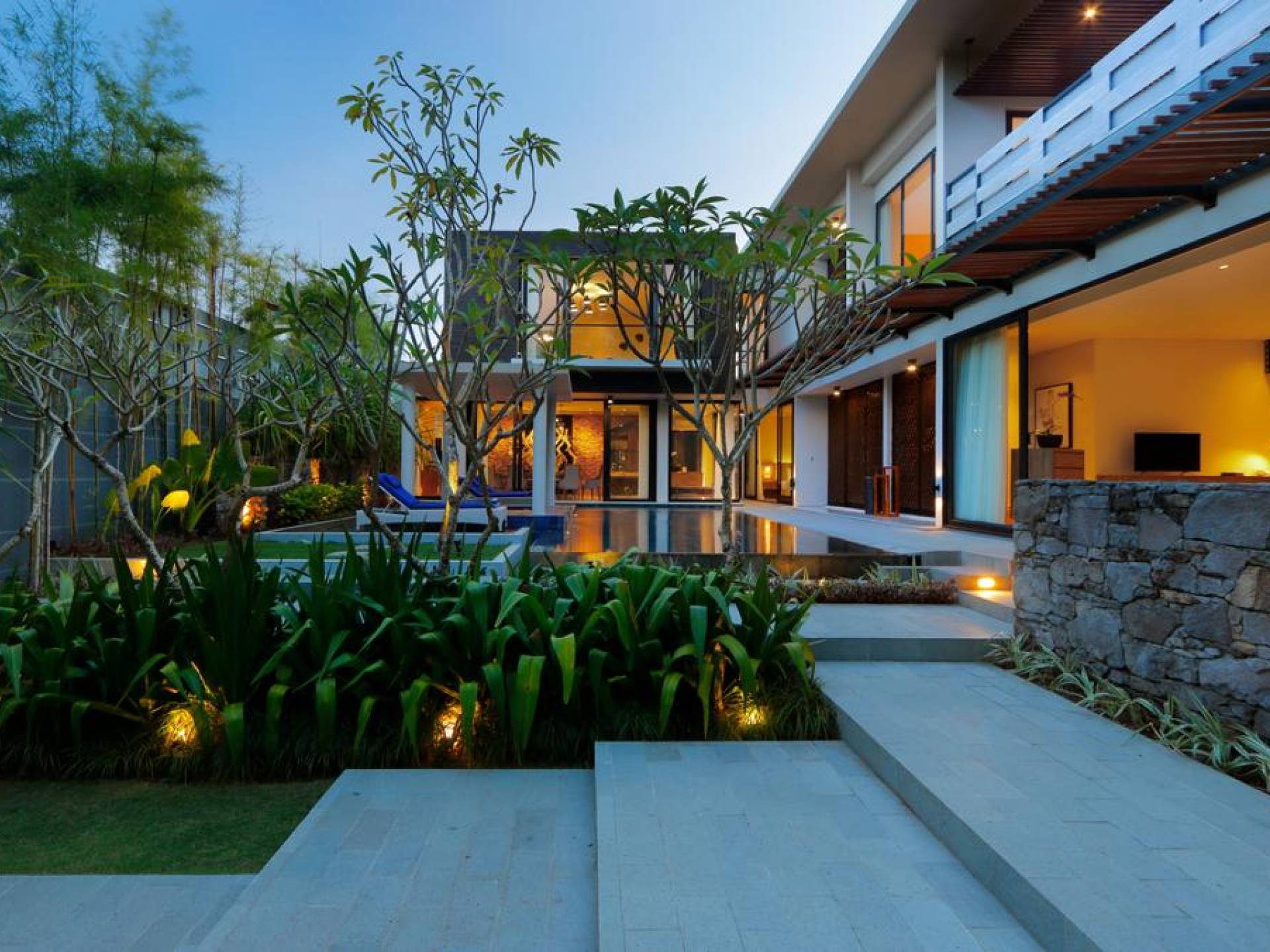 Το υπνοδωμάτιο στον τελευταίο όροφο έχει το δικό του μπαλκόνι με θέα στο κεντρικό τεμάχιο που είναι η πισίνα του κήπου και το πυκνό φύλλωμα της γύρω περιοχής. Τα κομψά μπάνια είναι ευρύχωρα με ημι-ανοιχτή δομή οροφής που επιτρέπουν άφθονο φυσικό φως. Διακοσμημένα με λευκά μάρμαρα, με φυσικά πέτρες σε μέρη, πιθανότατα καταλήγετε περισσότερο στο μπάνιο από ό, τι σκοπεύετε. Όλα τα μπάνια είναι εξοπλισμένα με μπανιέρες και τα ντους είναι εξοπλισμένα με ανέσεις σε επίπεδο θέρετρου.