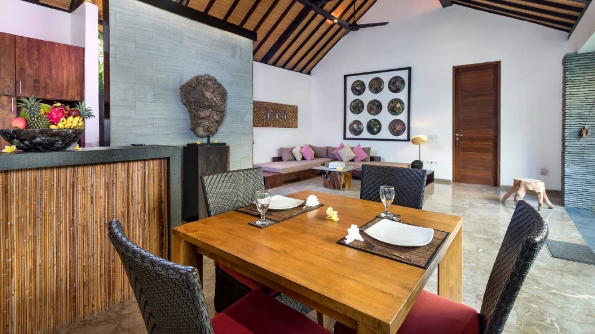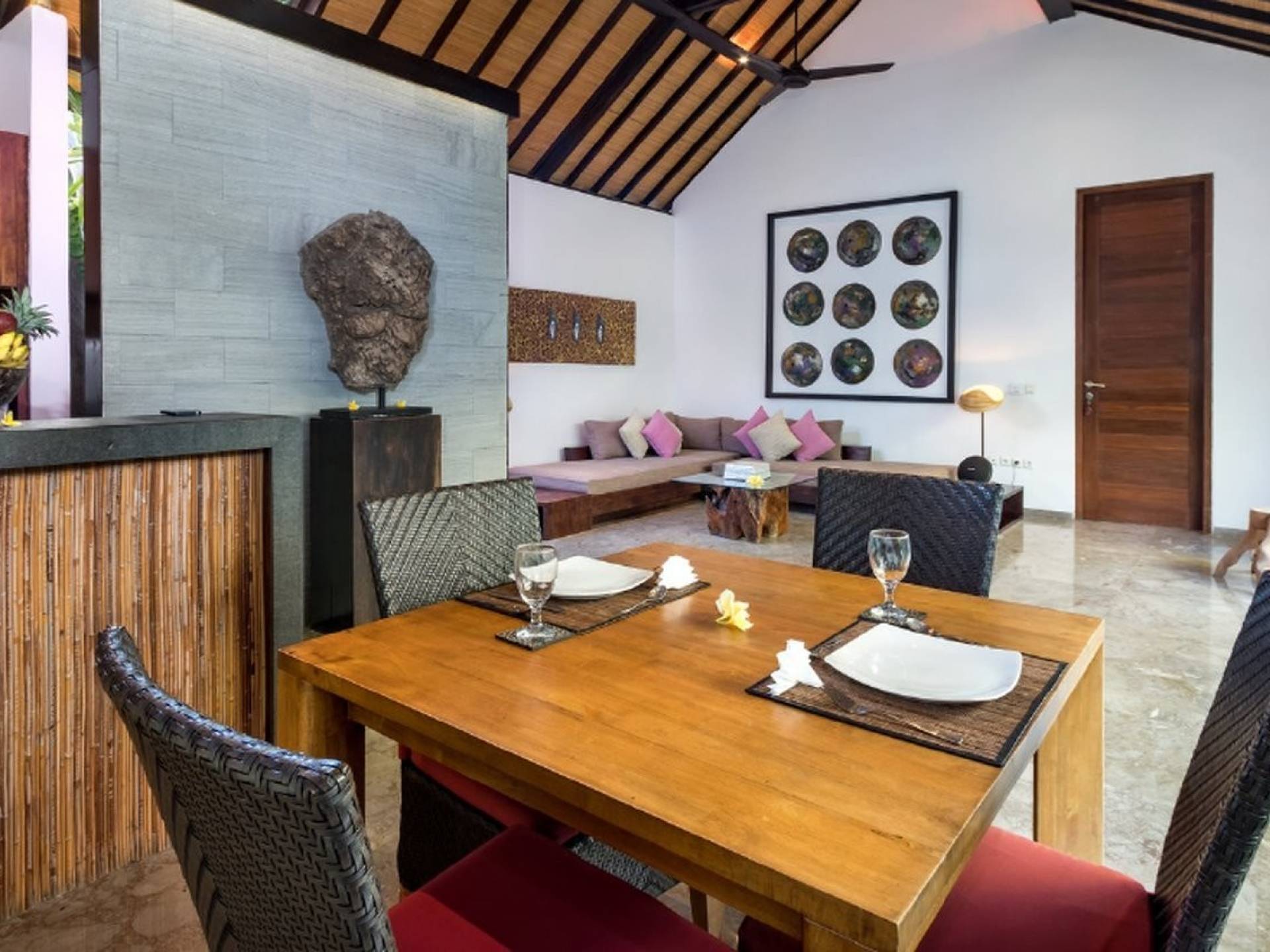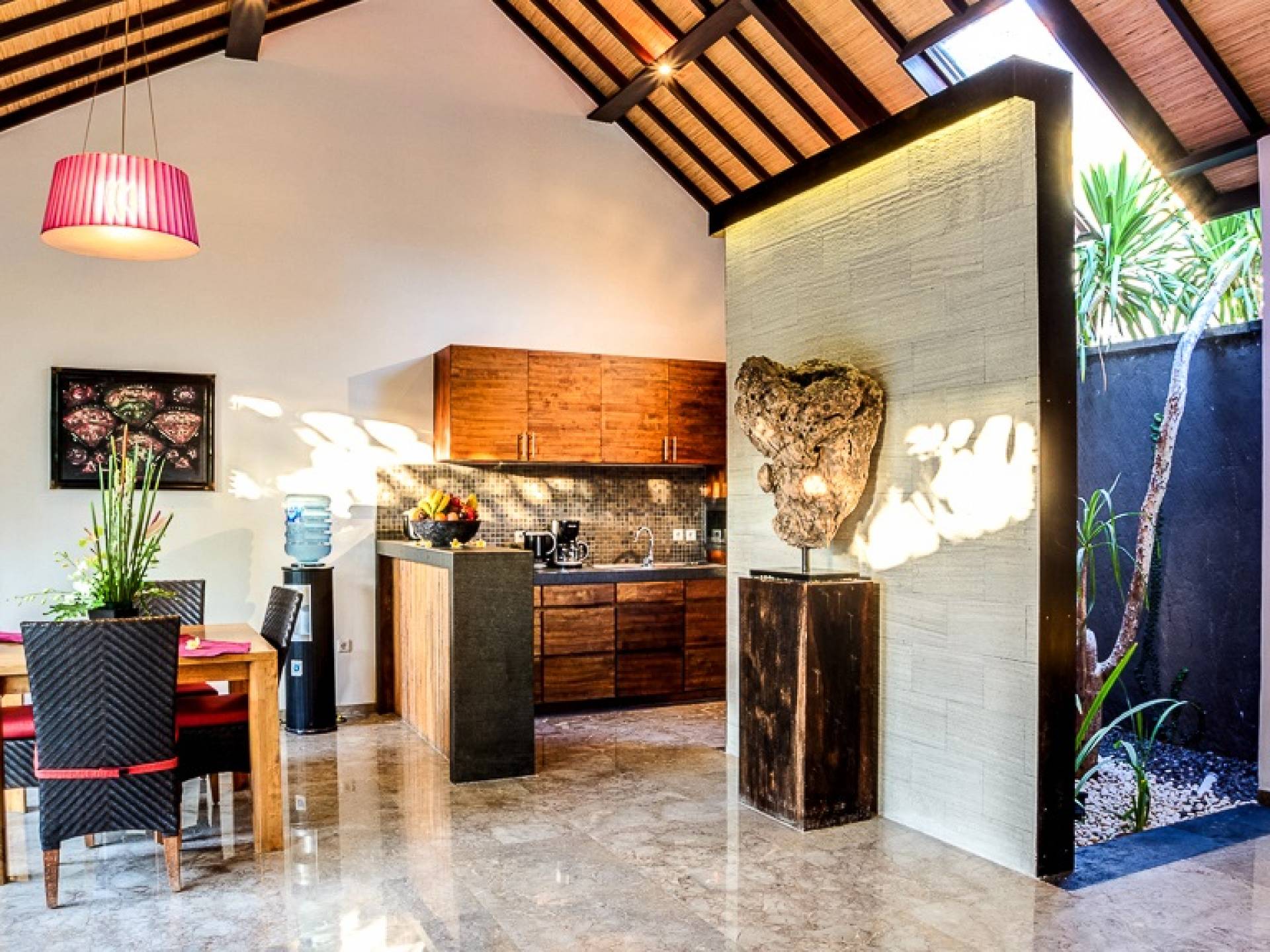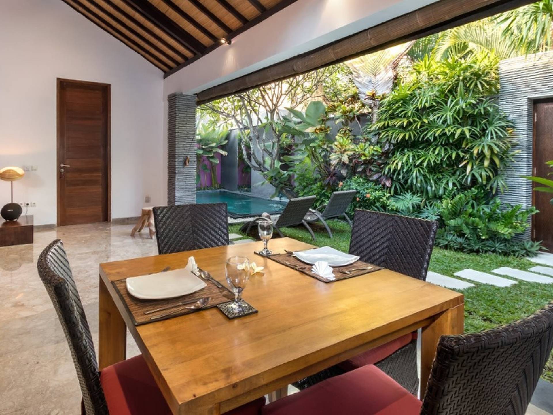 Το περίπτερο διαθέτει παραδοσιακή μπαλινέζικη ταράτσα με ψηλό ρυθμό, γυαλιστερό μαρμάρινο δάπεδο και υπάρχουν παραθυρόφυλλα από μπαμπού για να διαμορφώσετε τον ενιαίο χώρο διαβίωσης σε έναν άνετο ημι-εσωτερικό χώρο διαβίωσης. Στη γωνία κάθεται ένας κομψός καναπές από καστόρι/τικ όπου μπορείτε να χαλαρώσετε με ένα βιβλίο ή να αγκαλιάσετε με το αγαπημένο σας πρόσωπο. Το 4θέσιο τραπέζι από ξύλο είναι όπου μπορείτε να απολαύσετε πρωινό, μεσημεριανό και βραδινό με θέα στον κήπο και την πισίνα. Η κουζίνα είναι κάτι παραπάνω από καλά εξοπλισμένη και χωρίζεται από την τραπεζαρία με ένα μπαρ πρωινού.