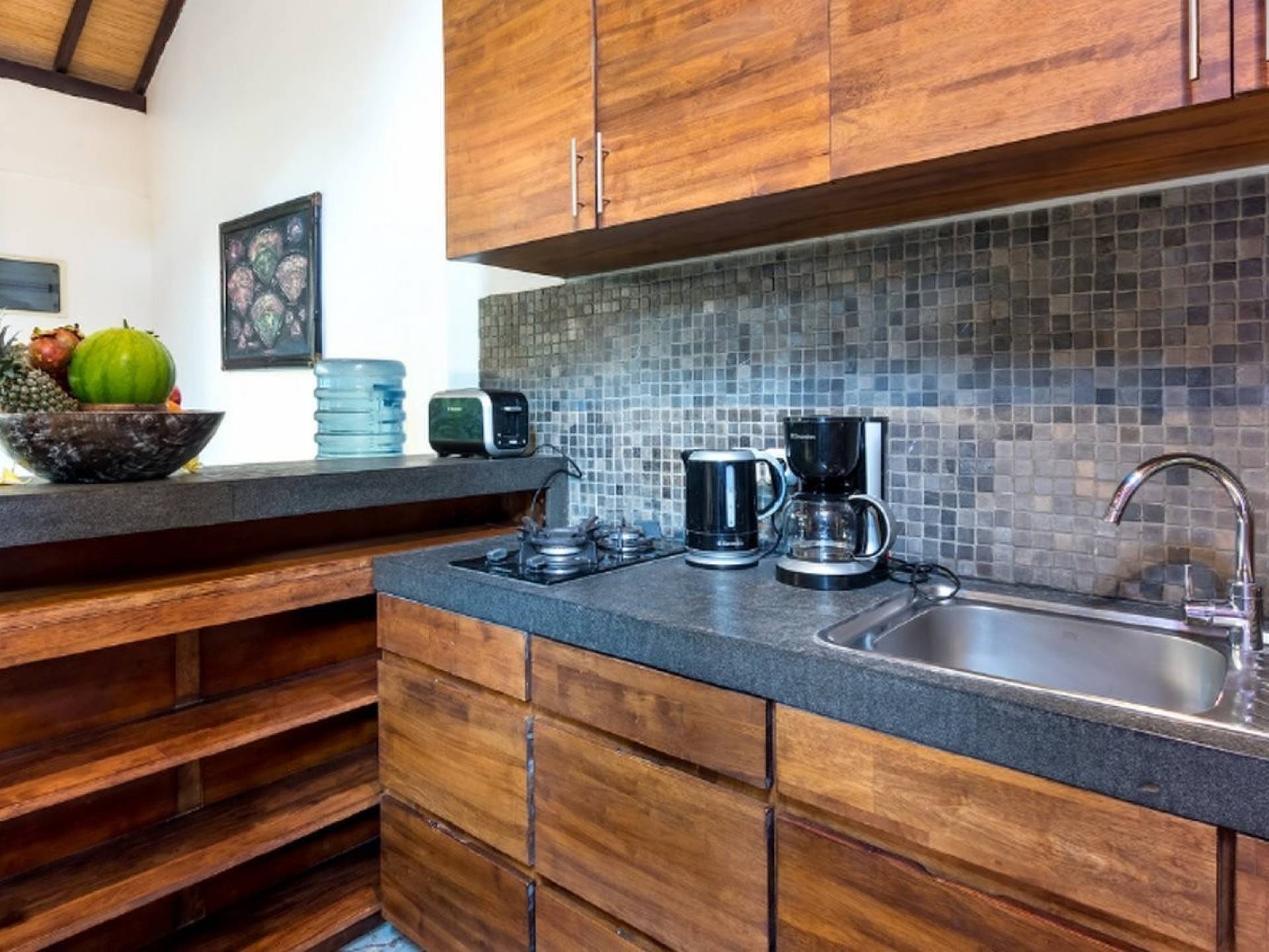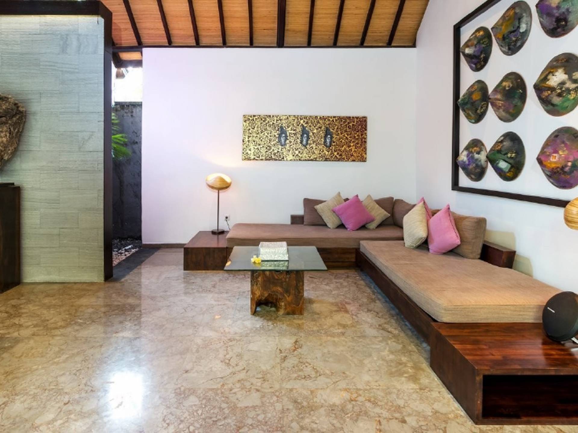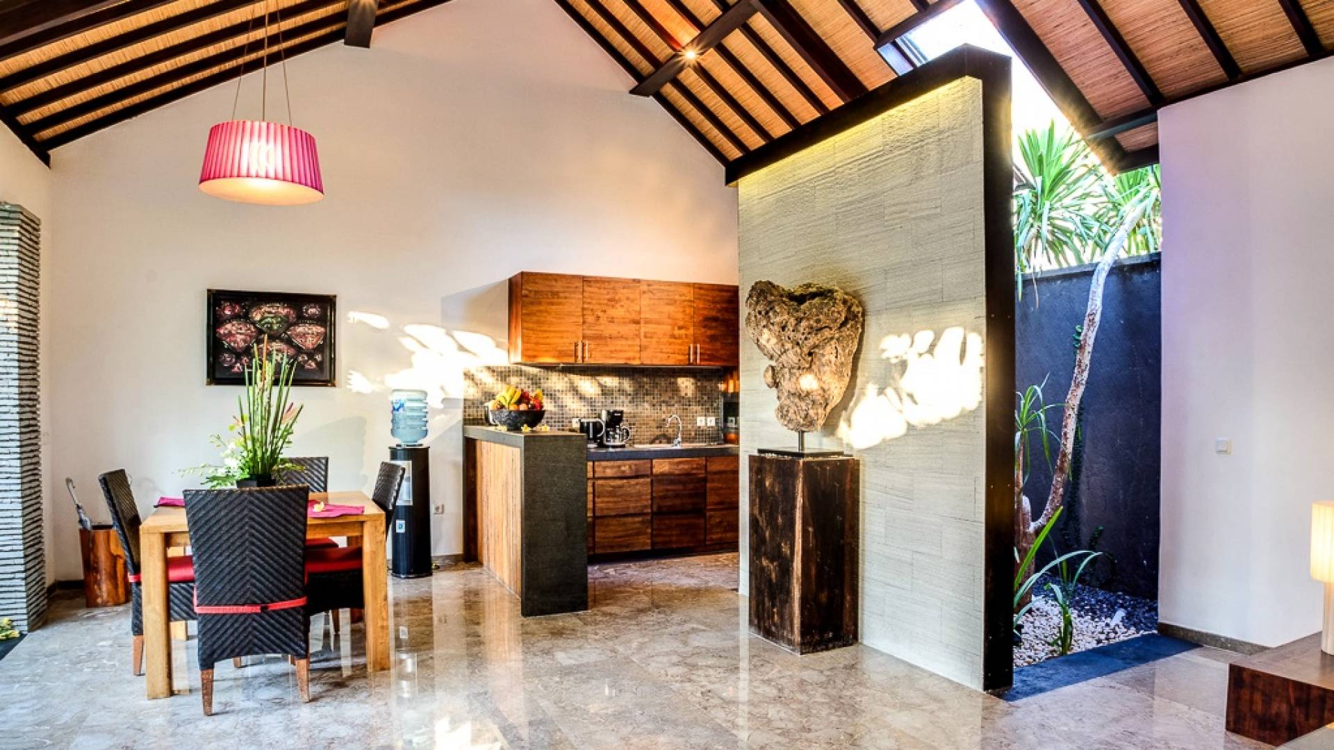 Το περίπτερο διαθέτει παραδοσιακή μπαλινέζικη ταράτσα με ψηλό ρυθμό, γυαλιστερό μαρμάρινο δάπεδο και υπάρχουν παραθυρόφυλλα από μπαμπού για να διαμορφώσετε τον ενιαίο χώρο διαβίωσης σε έναν άνετο ημι-εσωτερικό χώρο διαβίωσης. Στη γωνία κάθεται ένας κομψός καναπές από καστόρι/τικ όπου μπορείτε να χαλαρώσετε με ένα βιβλίο ή να αγκαλιάσετε με το αγαπημένο σας πρόσωπο. Το 4θέσιο τραπέζι από ξύλο είναι όπου μπορείτε να απολαύσετε πρωινό, μεσημεριανό και βραδινό με θέα στον κήπο και την πισίνα. Η κουζίνα είναι κάτι παραπάνω από καλά εξοπλισμένη και χωρίζεται από την τραπεζαρία με ένα μπαρ πρωινού.