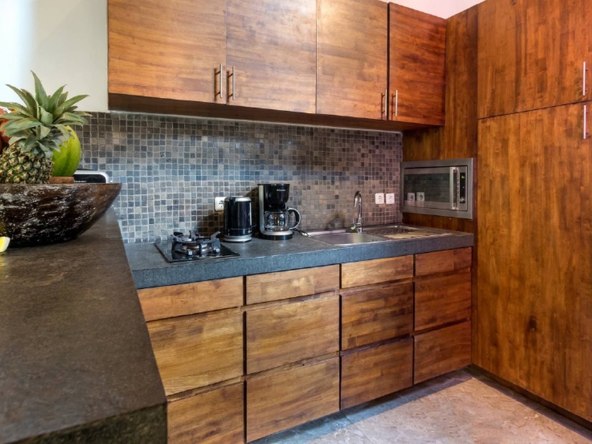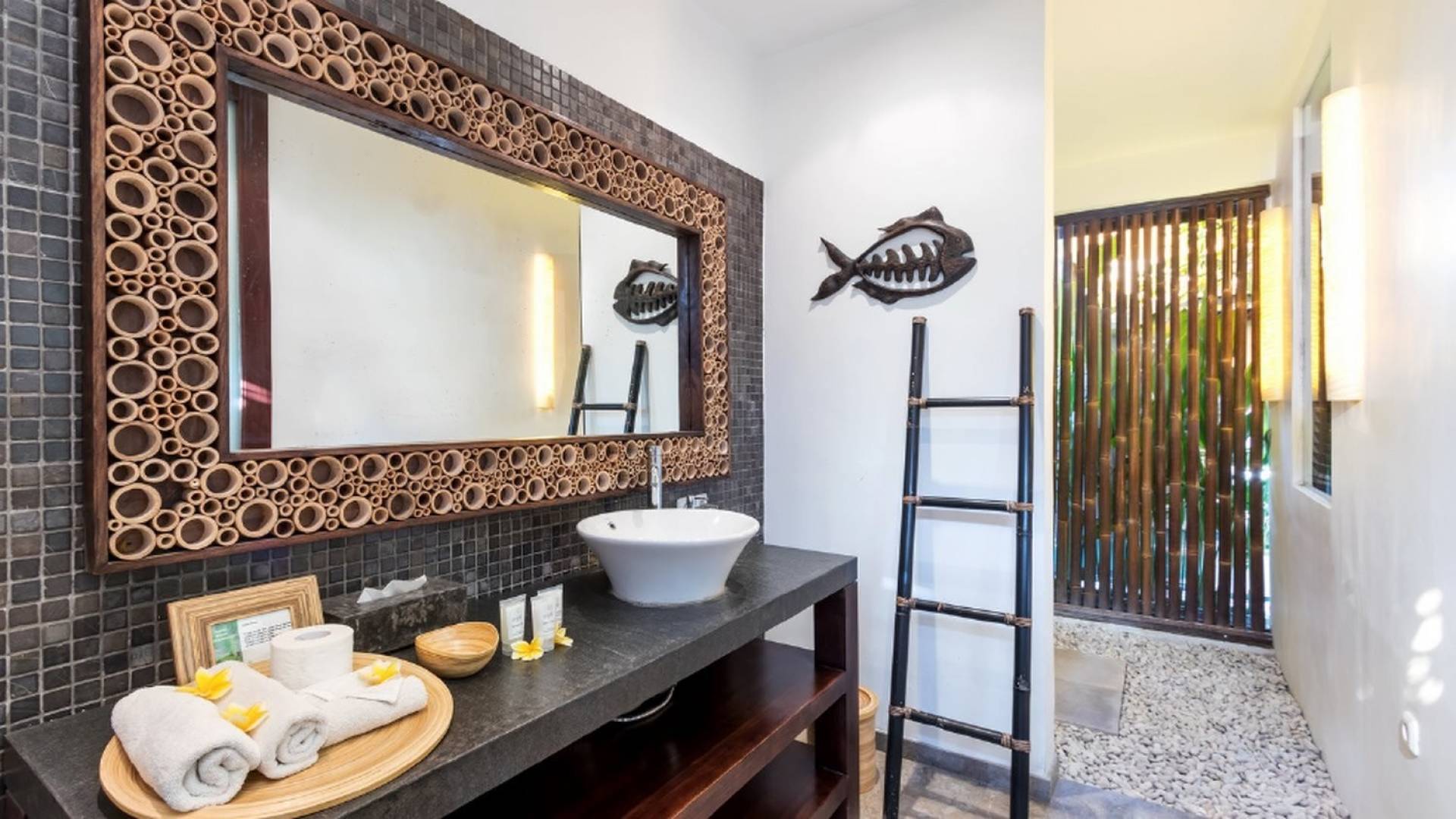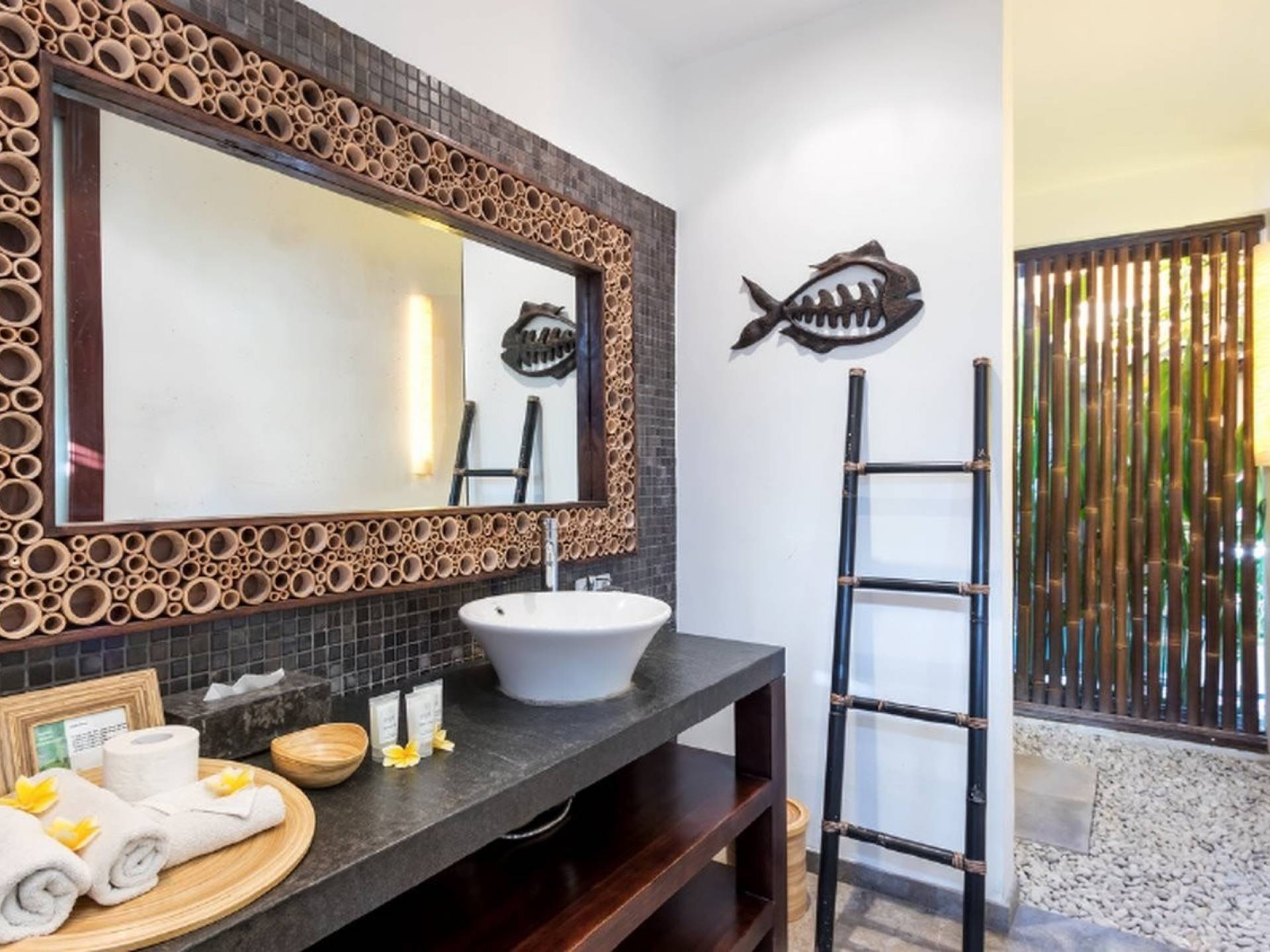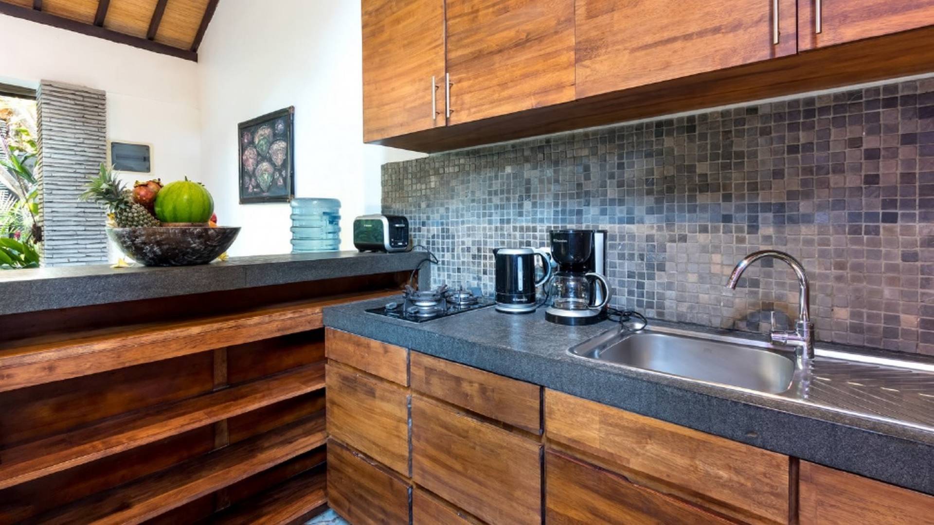 Το περίπτερο διαθέτει παραδοσιακή μπαλινέζικη ταράτσα με ψηλό ρυθμό, γυαλιστερό μαρμάρινο δάπεδο και υπάρχουν παραθυρόφυλλα από μπαμπού για να διαμορφώσετε τον ενιαίο χώρο διαβίωσης σε έναν άνετο ημι-εσωτερικό χώρο διαβίωσης. Στη γωνία κάθεται ένας κομψός καναπές από καστόρι/τικ όπου μπορείτε να χαλαρώσετε με ένα βιβλίο ή να αγκαλιάσετε με το αγαπημένο σας πρόσωπο. Το 4θέσιο τραπέζι από ξύλο είναι όπου μπορείτε να απολαύσετε πρωινό, μεσημεριανό και βραδινό με θέα στον κήπο και την πισίνα. Η κουζίνα είναι κάτι παραπάνω από καλά εξοπλισμένη και χωρίζεται από την τραπεζαρία με ένα μπαρ πρωινού.