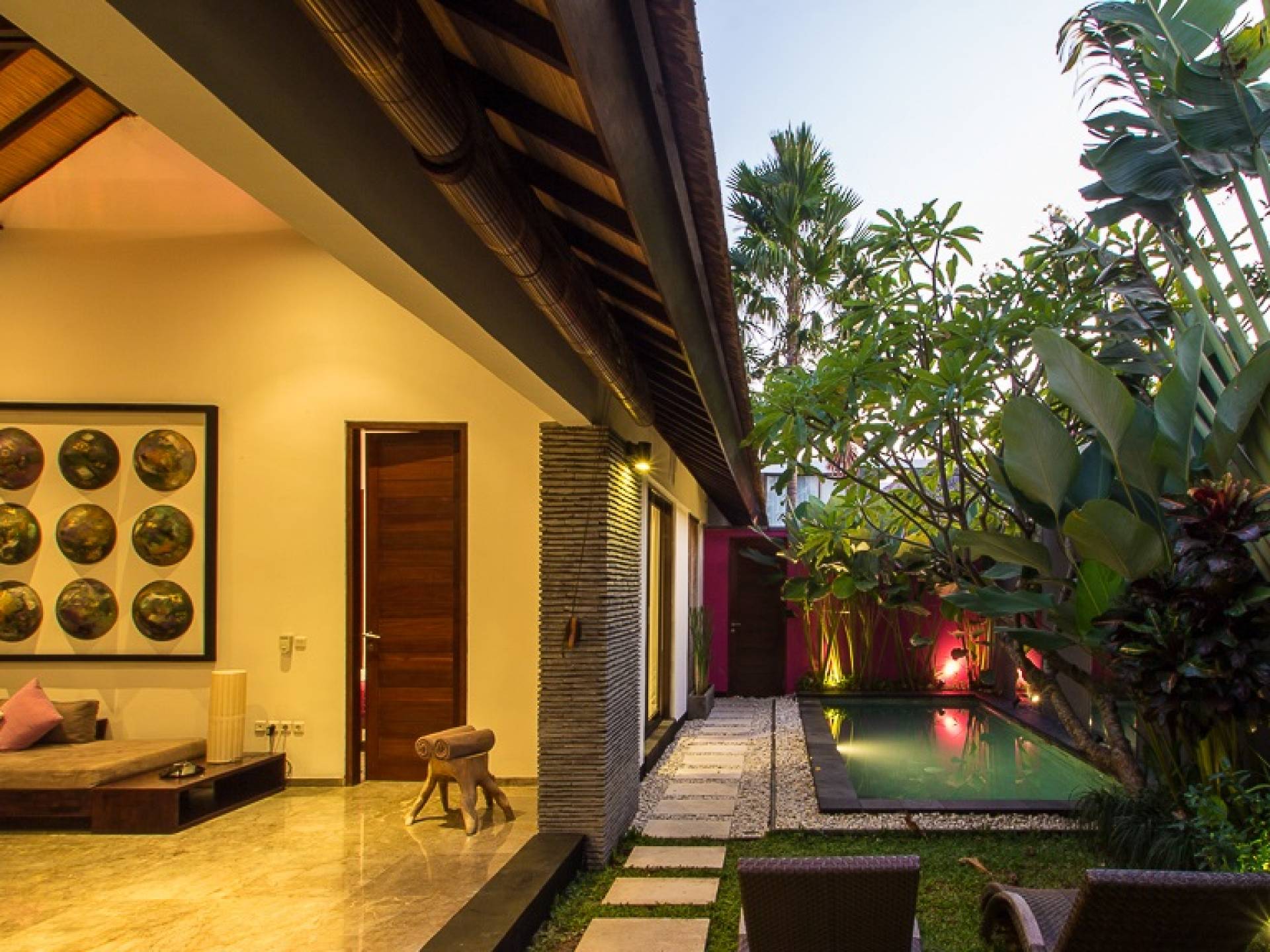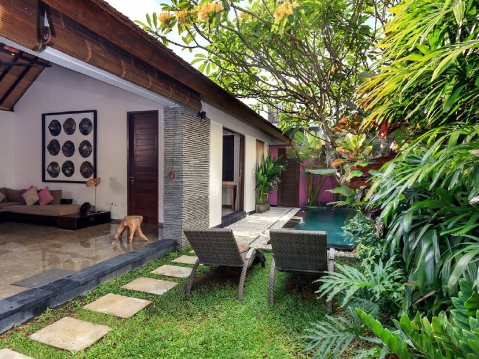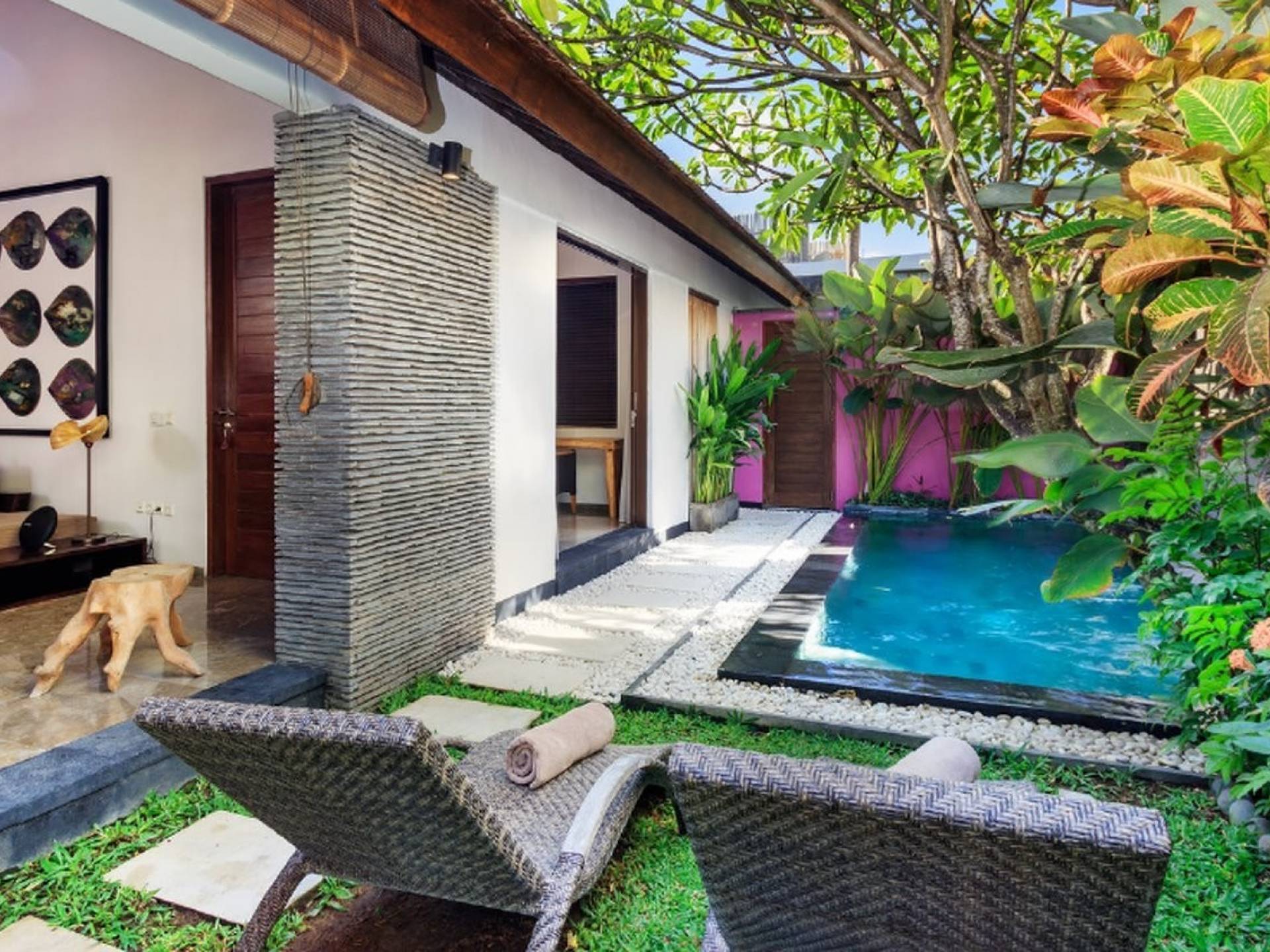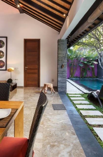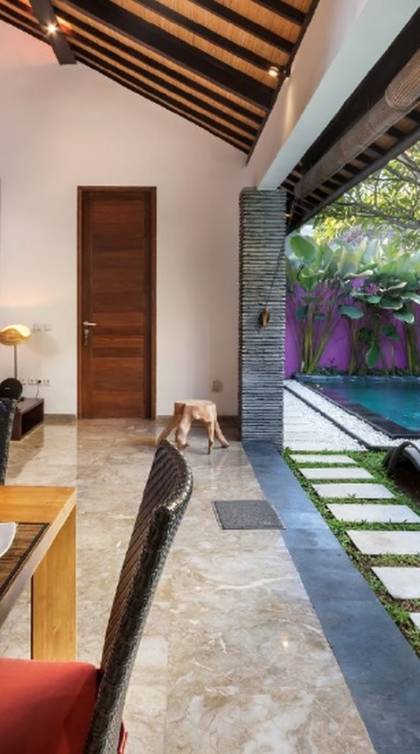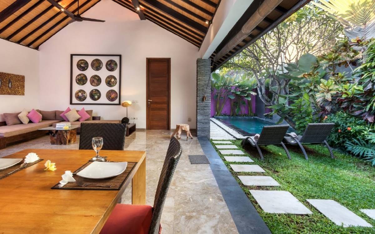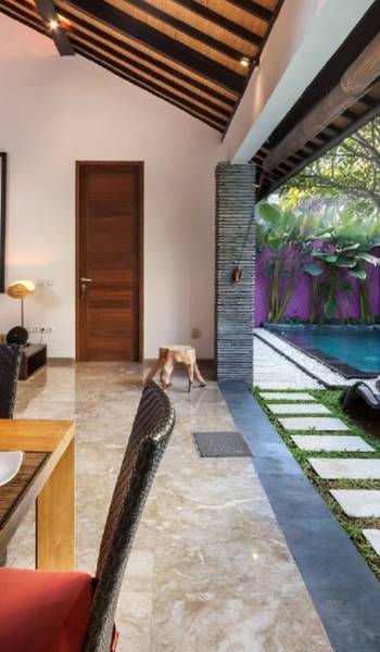 Το Villa Anjali Purple Seminyak είναι το πιο οικείο και ρομαντικό από τα 4 πολυτελή καταφύγια στις βίλες Anjali στο Petitenget, Seminyak. Αυτό το απομονωμένο συγκρότημα βίλας είναι κρυμμένο μακριά από τα πλήθη στην άκρη ενός ρυζιού και όμως ο θόρυβος και η μόδα του κεντρικού Σεμινιάκ είναι μόλις λίγα μέτρα μακριά, επιτρέποντας στους επισκέπτες να εξερευνήσουν αυτή τη δημοφιλή παραλιακή πόλη με τα πόδια. Το Villa Anjali Purple σας καλωσορίζει θερμά στον όμορφο τροπικό κήπο που σας περιμένει ακριβώς πίσω από τον παραδοσιακό μπαλινέζικο τοίχο «aling-aling», που προορίζεται να κρατήσει μακριά τα κακά πνεύματα και τους κακούς δαίμονες. Η ιδιωτική πισίνα 3 x 6 μέτρων αστράφτει σαν μια μικρή όαση, περιτριγυρισμένη από ένα τροπικό δέντρο φραγκιπάνι, καταπράσινο πράσινο και λευκές πέτρες του ποταμού. Οι τεράστιοι καθρέφτες που πλαισιώνονται στον τοίχο του κήπου αντανακλούν αυτά τα τροπικά φυτά και δέντρα, δίνοντας στον κήπο μια μεγάλη αίσθηση χώρου.