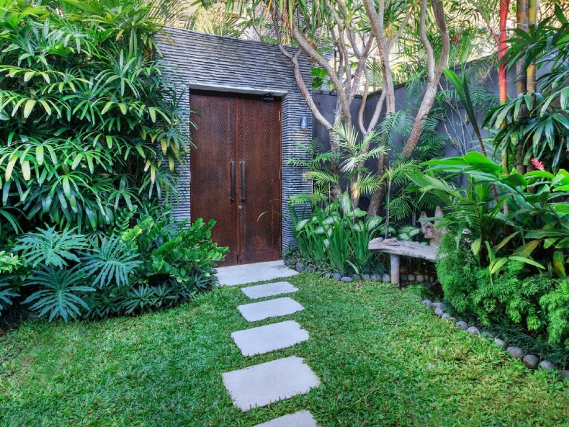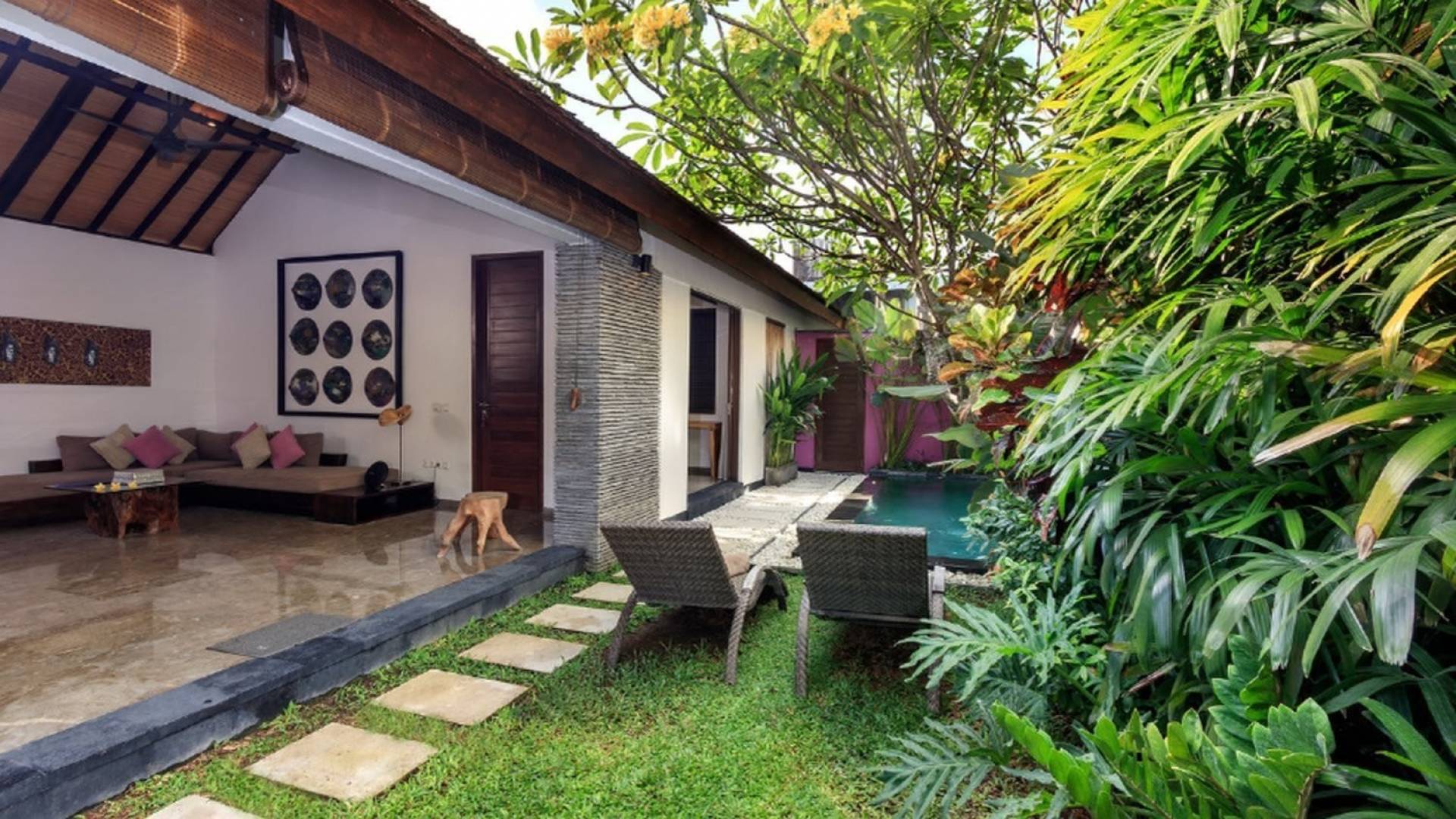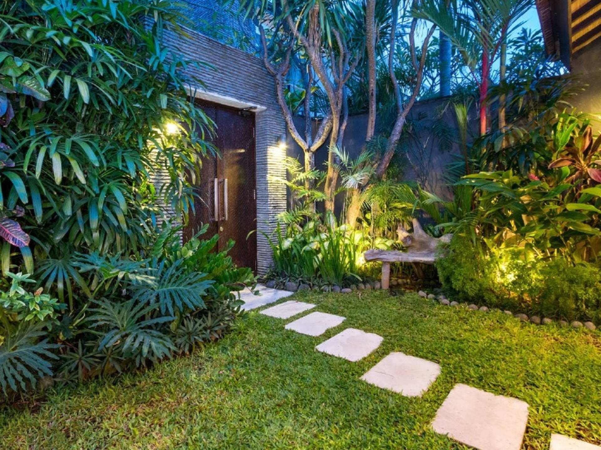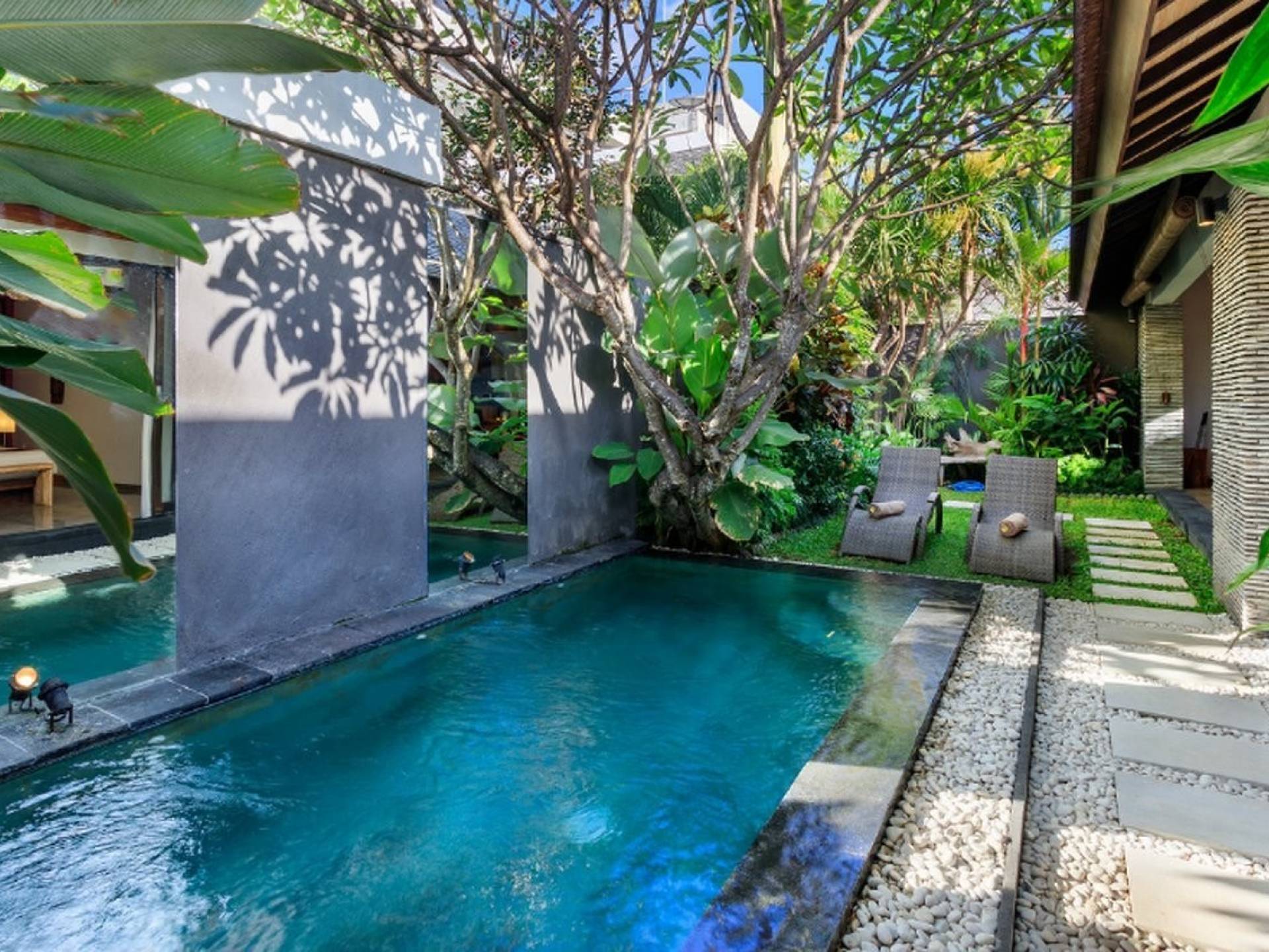 Το Villa Anjali Purple Seminyak είναι το πιο οικείο και ρομαντικό από τα 4 πολυτελή καταφύγια στις βίλες Anjali στο Petitenget, Seminyak. Αυτό το απομονωμένο συγκρότημα βίλας είναι κρυμμένο μακριά από τα πλήθη στην άκρη ενός ρυζιού και όμως ο θόρυβος και η μόδα του κεντρικού Σεμινιάκ είναι μόλις λίγα μέτρα μακριά, επιτρέποντας στους επισκέπτες να εξερευνήσουν αυτή τη δημοφιλή παραλιακή πόλη με τα πόδια. Το Villa Anjali Purple σας καλωσορίζει θερμά στον όμορφο τροπικό κήπο που σας περιμένει ακριβώς πίσω από τον παραδοσιακό μπαλινέζικο τοίχο «aling-aling», που προορίζεται να κρατήσει μακριά τα κακά πνεύματα και τους κακούς δαίμονες. Η ιδιωτική πισίνα 3 x 6 μέτρων αστράφτει σαν μια μικρή όαση, περιτριγυρισμένη από ένα τροπικό δέντρο φραγκιπάνι, καταπράσινο πράσινο και λευκές πέτρες του ποταμού. Οι τεράστιοι καθρέφτες που πλαισιώνονται στον τοίχο του κήπου αντανακλούν αυτά τα τροπικά φυτά και δέντρα, δίνοντας στον κήπο μια μεγάλη αίσθηση χώρου.