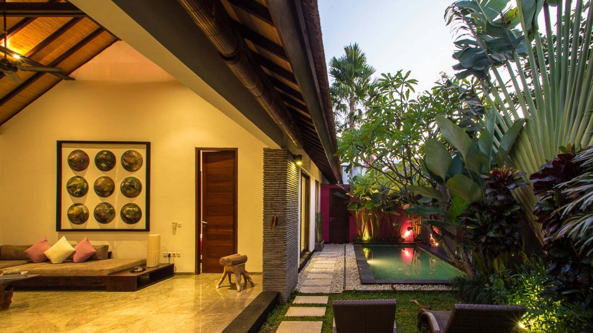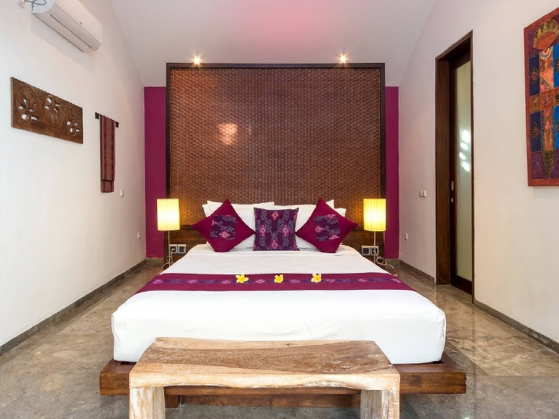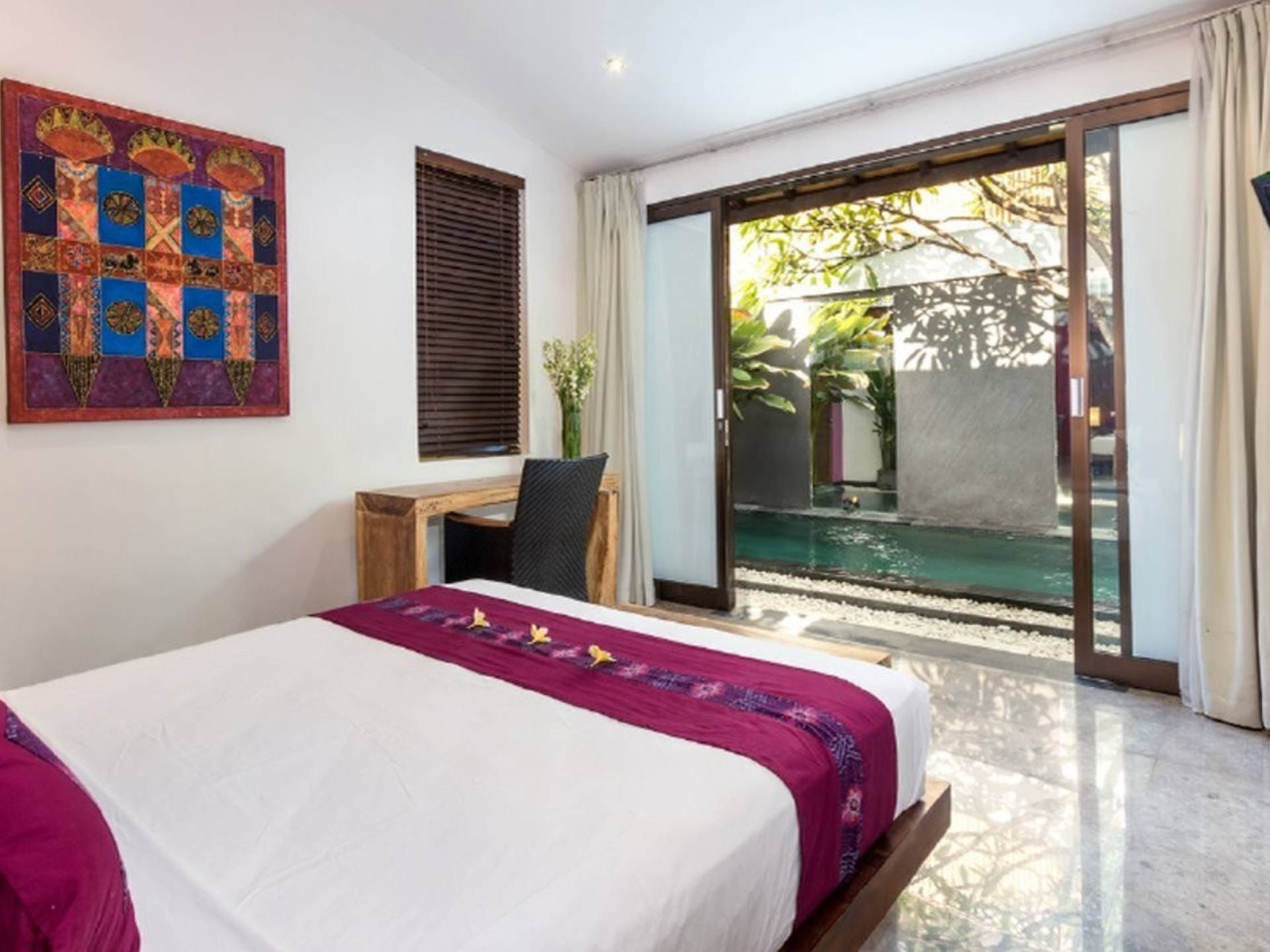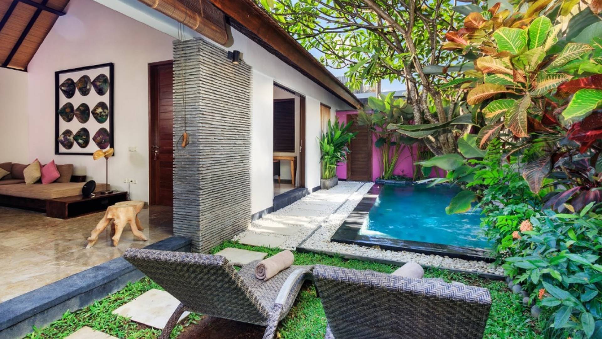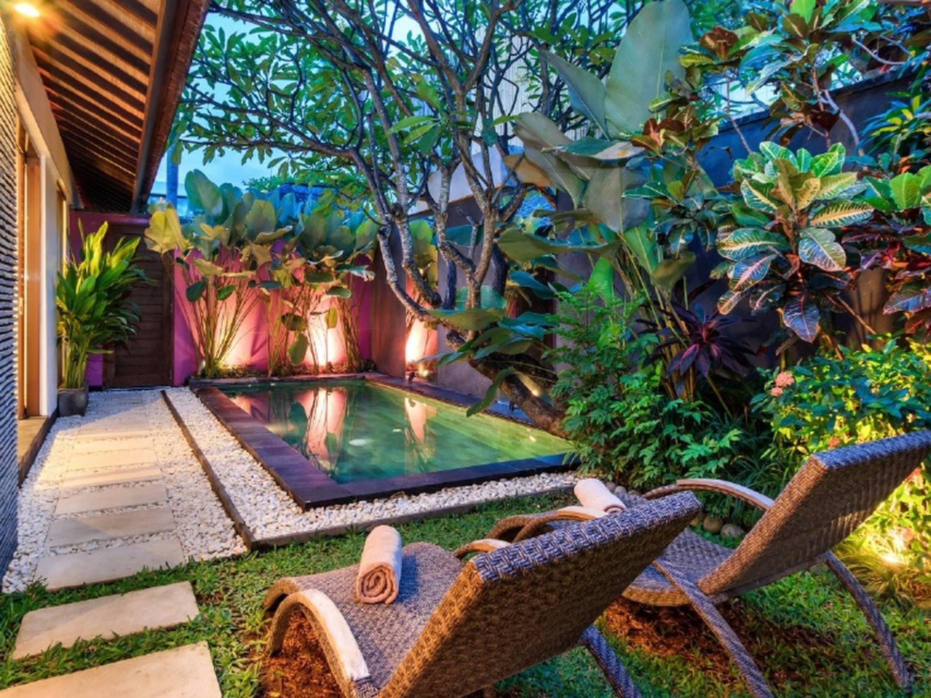 Το Villa Anjali Purple Seminyak είναι το πιο οικείο και ρομαντικό από τα 4 πολυτελή καταφύγια στις βίλες Anjali στο Petitenget, Seminyak. Αυτό το απομονωμένο συγκρότημα βίλας είναι κρυμμένο μακριά από τα πλήθη στην άκρη ενός ρυζιού και όμως ο θόρυβος και η μόδα του κεντρικού Σεμινιάκ είναι μόλις λίγα μέτρα μακριά, επιτρέποντας στους επισκέπτες να εξερευνήσουν αυτή τη δημοφιλή παραλιακή πόλη με τα πόδια. Το Villa Anjali Purple σας καλωσορίζει θερμά στον όμορφο τροπικό κήπο που σας περιμένει ακριβώς πίσω από τον παραδοσιακό μπαλινέζικο τοίχο «aling-aling», που προορίζεται να κρατήσει μακριά τα κακά πνεύματα και τους κακούς δαίμονες. Η ιδιωτική πισίνα 3 x 6 μέτρων αστράφτει σαν μια μικρή όαση, περιτριγυρισμένη από ένα τροπικό δέντρο φραγκιπάνι, καταπράσινο πράσινο και λευκές πέτρες του ποταμού. Οι τεράστιοι καθρέφτες που πλαισιώνονται στον τοίχο του κήπου αντανακλούν αυτά τα τροπικά φυτά και δέντρα, δίνοντας στον κήπο μια μεγάλη αίσθηση χώρου.