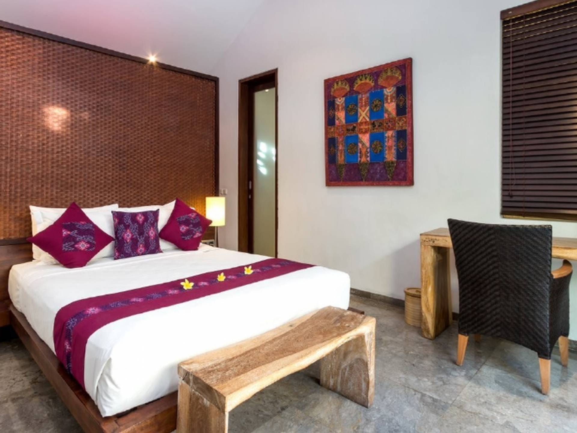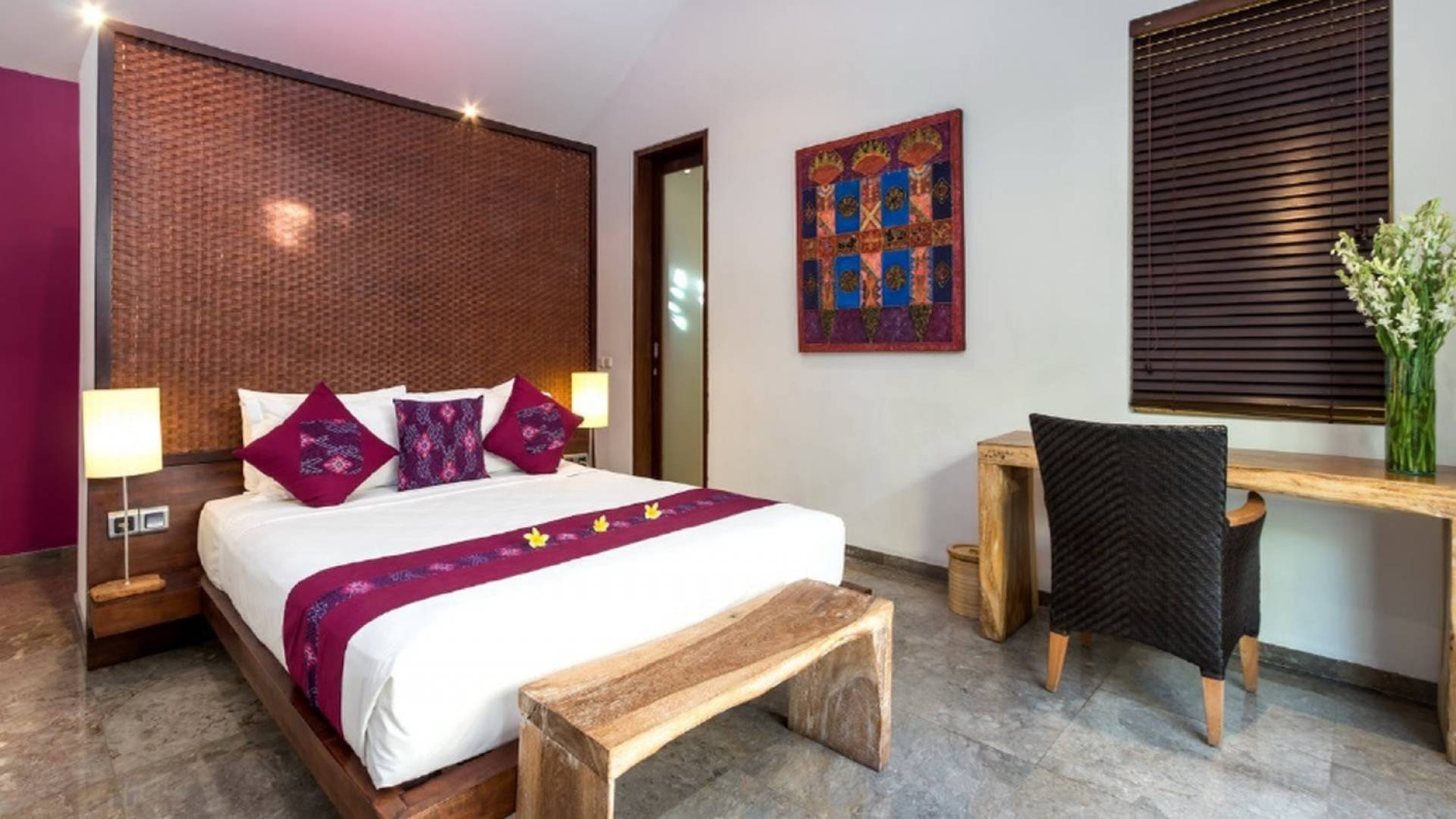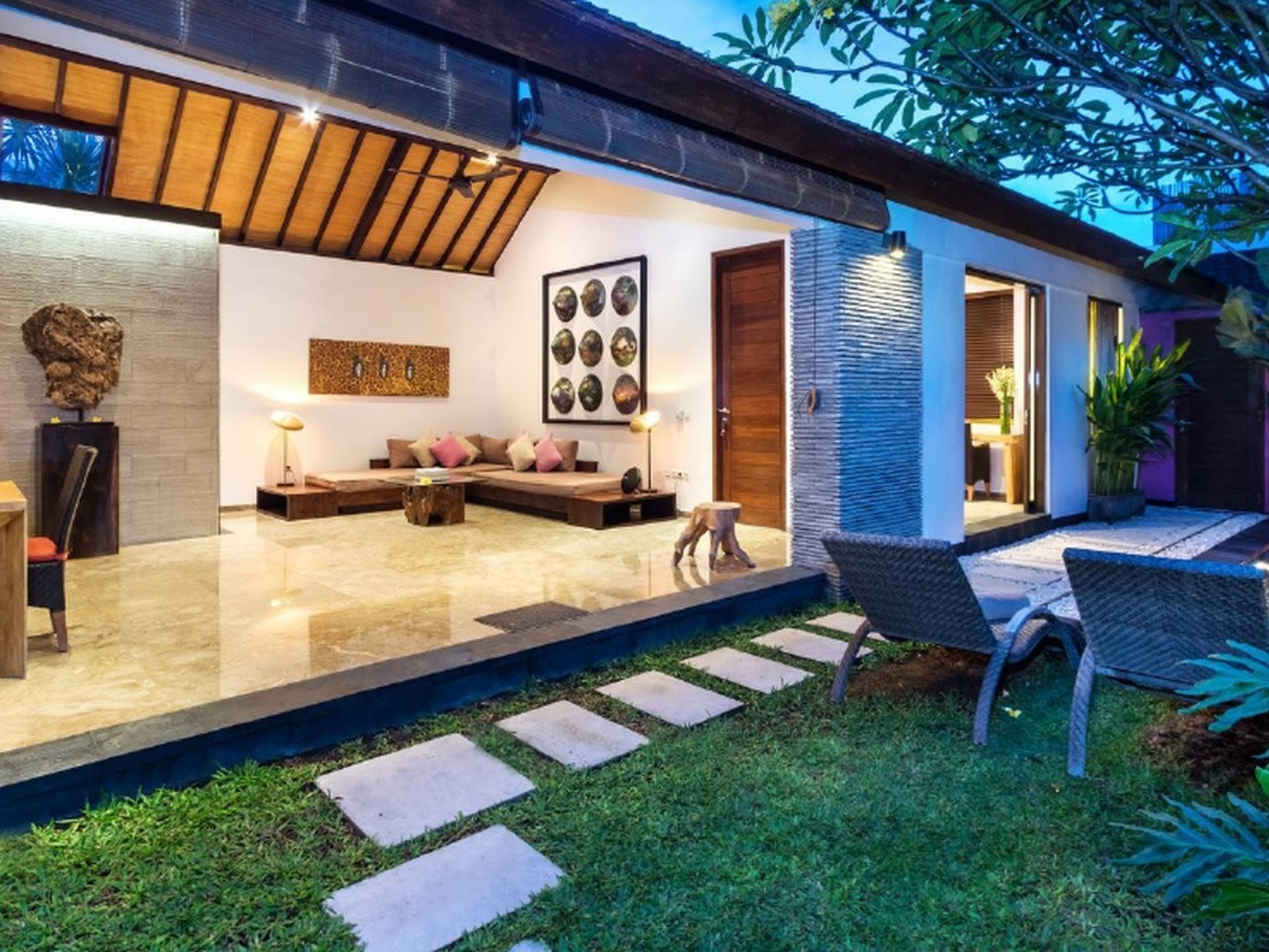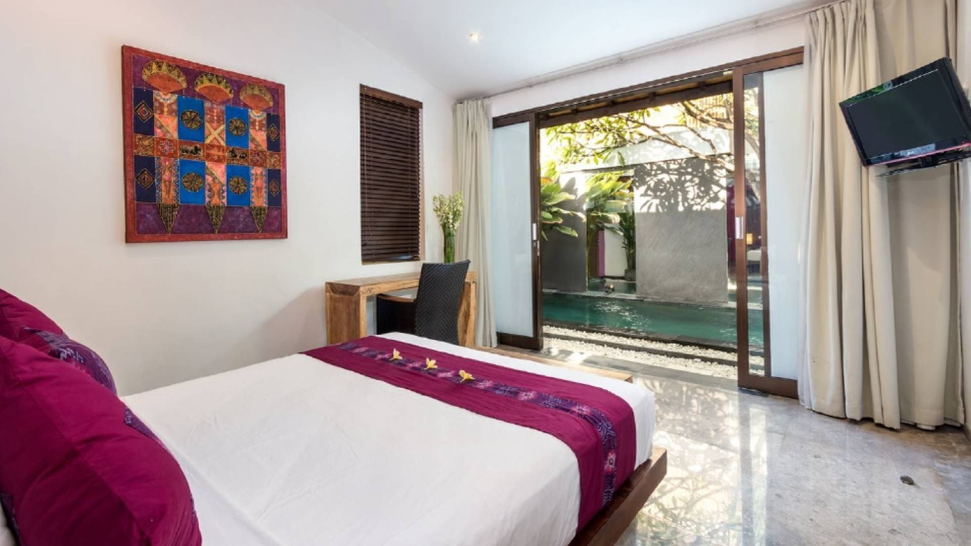 Το Villa Anjali Purple Seminyak είναι το πιο οικείο και ρομαντικό από τα 4 πολυτελή καταφύγια στις βίλες Anjali στο Petitenget, Seminyak. Αυτό το απομονωμένο συγκρότημα βίλας είναι κρυμμένο μακριά από τα πλήθη στην άκρη ενός ρυζιού και όμως ο θόρυβος και η μόδα του κεντρικού Σεμινιάκ είναι μόλις λίγα μέτρα μακριά, επιτρέποντας στους επισκέπτες να εξερευνήσουν αυτή τη δημοφιλή παραλιακή πόλη με τα πόδια. Το Villa Anjali Purple σας καλωσορίζει θερμά στον όμορφο τροπικό κήπο που σας περιμένει ακριβώς πίσω από τον παραδοσιακό μπαλινέζικο τοίχο «aling-aling», που προορίζεται να κρατήσει μακριά τα κακά πνεύματα και τους κακούς δαίμονες. Η ιδιωτική πισίνα 3 x 6 μέτρων αστράφτει σαν μια μικρή όαση, περιτριγυρισμένη από ένα τροπικό δέντρο φραγκιπάνι, καταπράσινο πράσινο και λευκές πέτρες του ποταμού. Οι τεράστιοι καθρέφτες που πλαισιώνονται στον τοίχο του κήπου αντανακλούν αυτά τα τροπικά φυτά και δέντρα, δίνοντας στον κήπο μια μεγάλη αίσθηση χώρου.