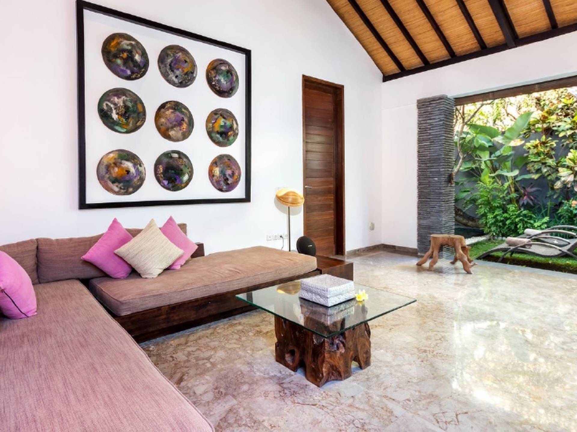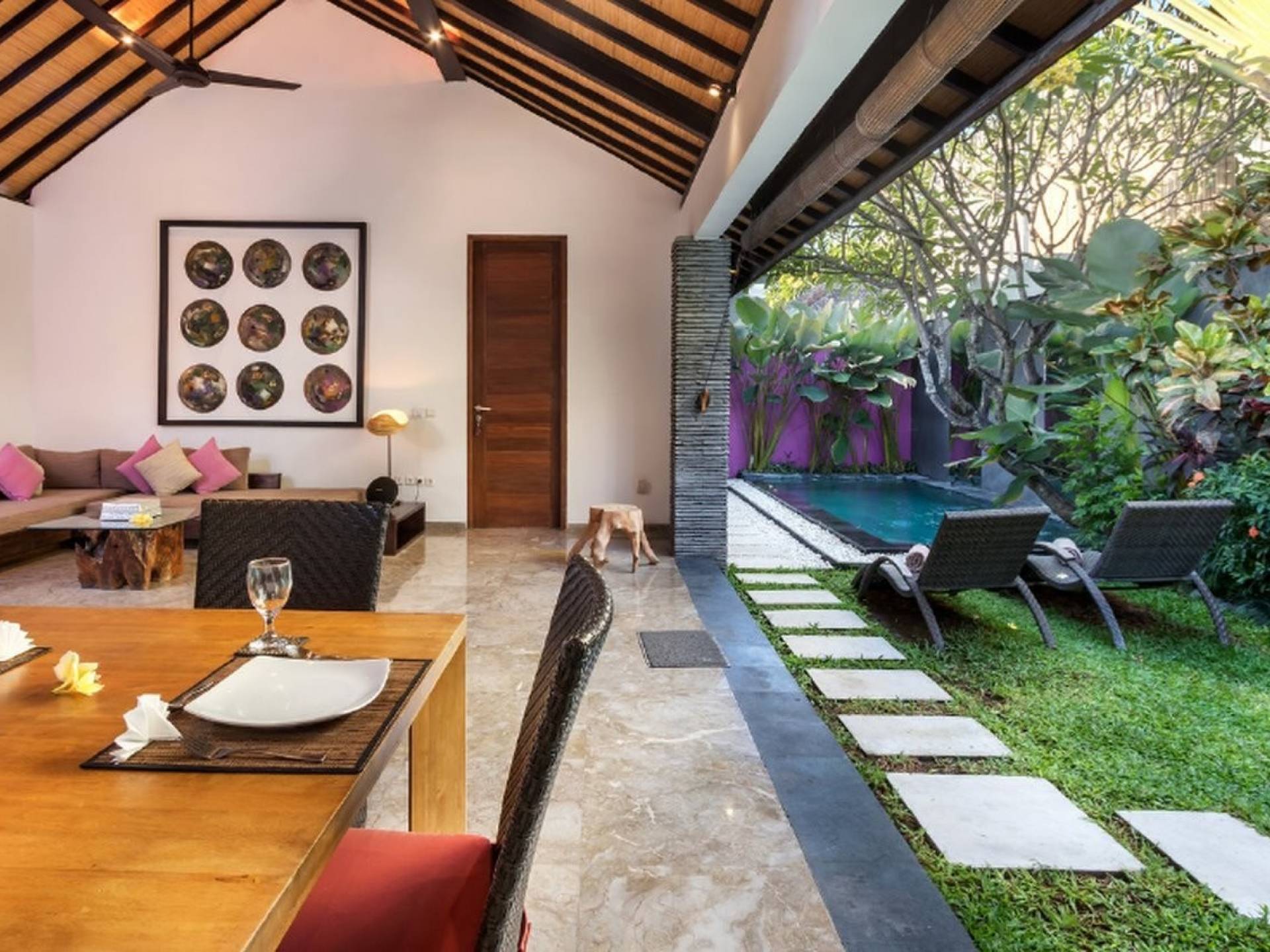 Υπάρχουν δύο ξαπλώστρες από μπαστούνι παντός καιρού τοποθετημένες δίπλα στην πισίνα για ηλιοθεραπεία και χαλάρωση κάτω από τον τροπικό ουρανό του Μπαλί. Το σαλόνι ενιαίας διαρρύθμισης του Villa Anjali Purple είναι ευρύχωρο και διαθέτει γωνιά σαλονιού καναπέ, τραπεζαρία και μοντέρνα κουζίνα. Ο εσωτερικός σχεδιασμός είναι κομψός και εκλεπτυσμένος, με υπέροχα έπιπλα προσαρμοσμένης σχεδίασης, ενδιαφέροντα έργα τέχνης και όλες τις σύγχρονες ανέσεις που απαιτούνται για την ιδιωτική εξοχική σας πισίνα. Γλυκές αποχρώσεις του μωβ και του ματζέντα εμπνέονται στις λεπτομέρειες του εσωτερικού σχεδιασμού, δίνοντας σε αυτή τη βίλα μια τέλεια ρομαντική αίσθηση για όλα τα ζευγάρια και τα πουλιά που ταξιδεύουν στο νησί του Μπαλί.