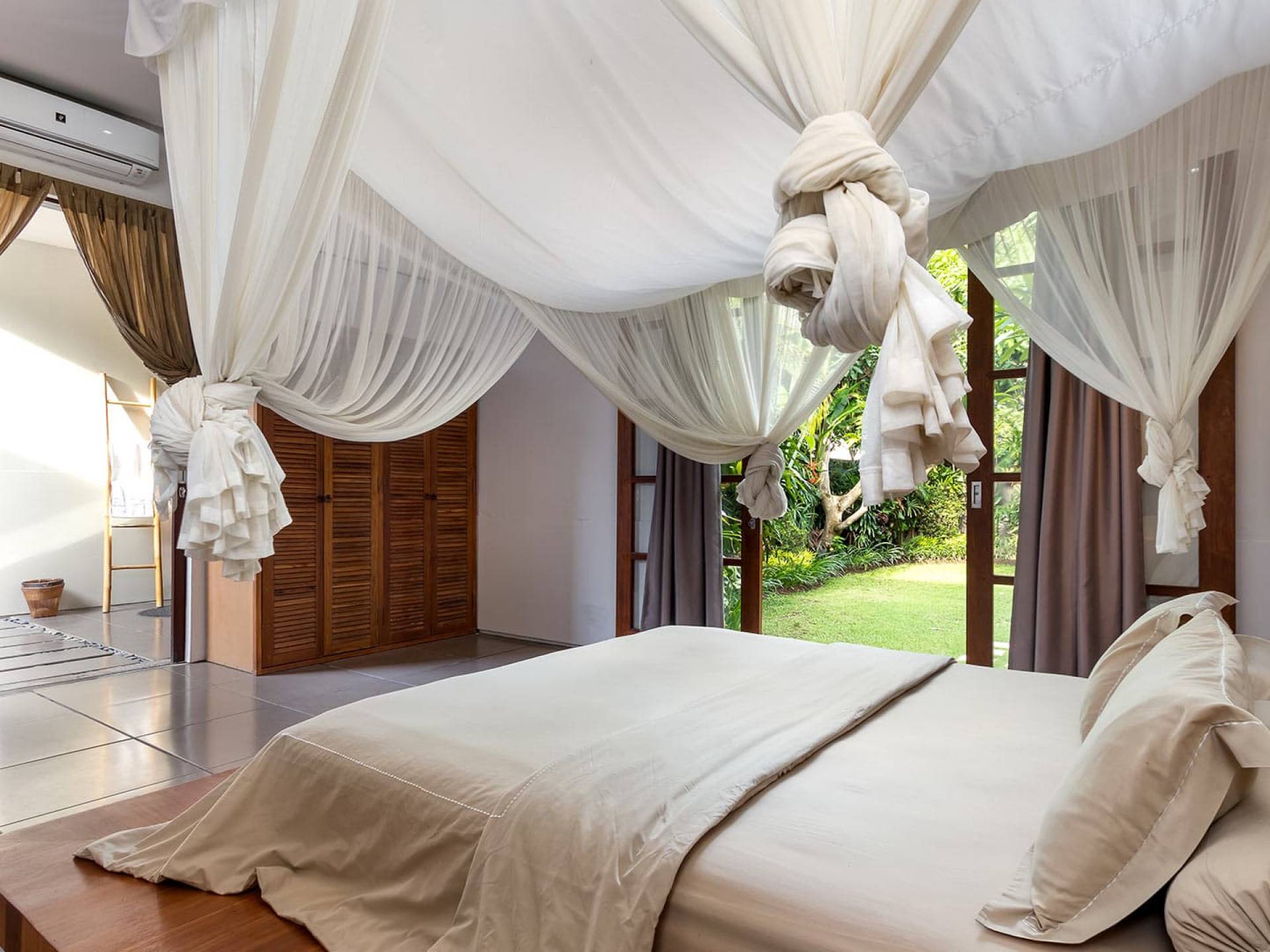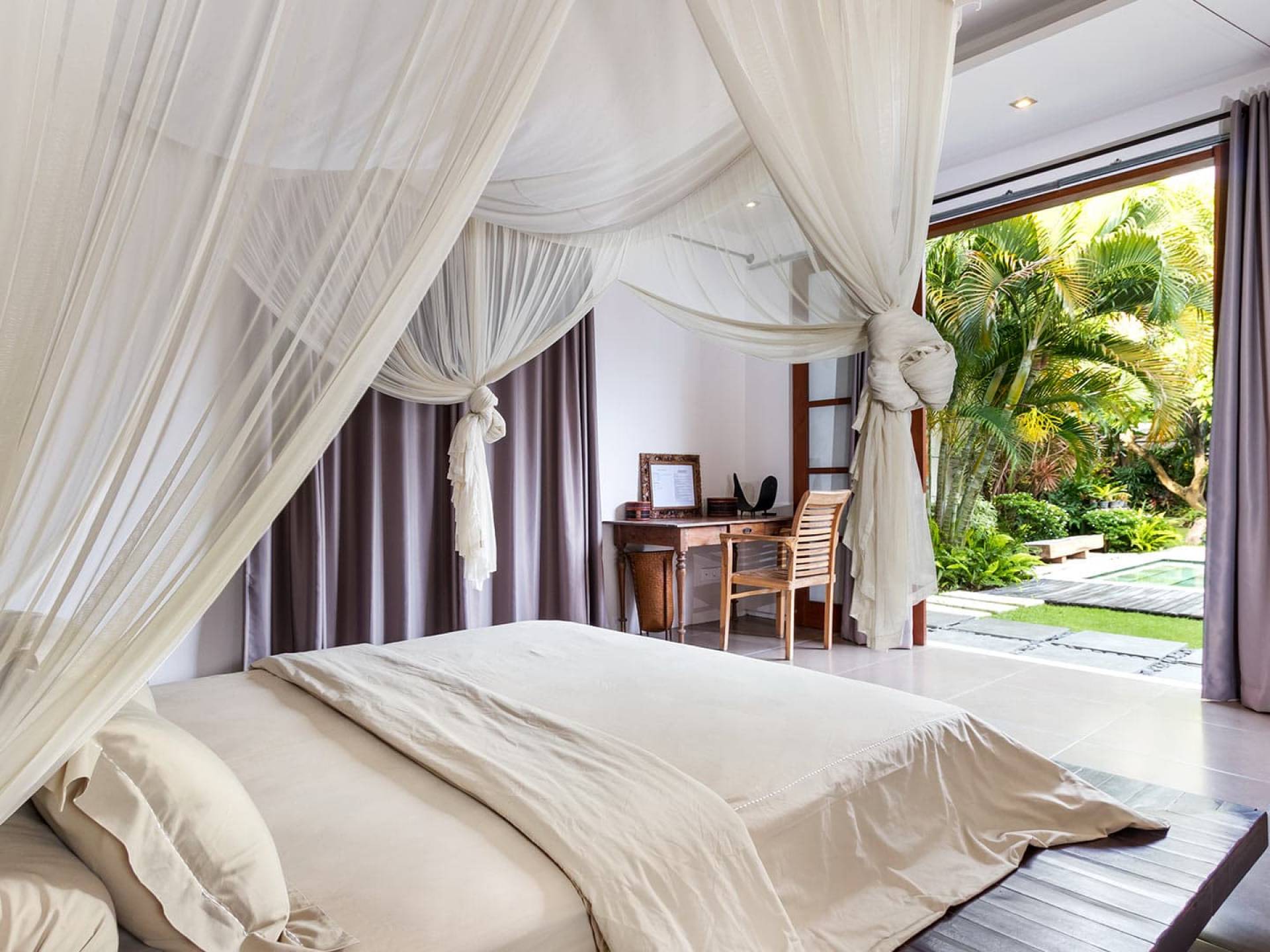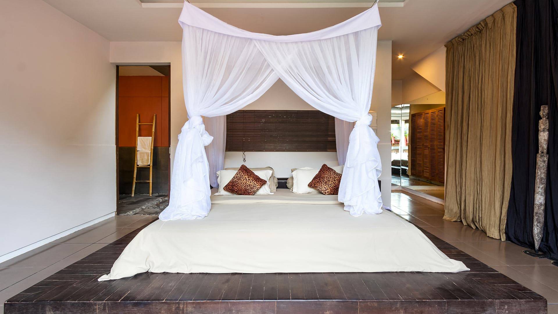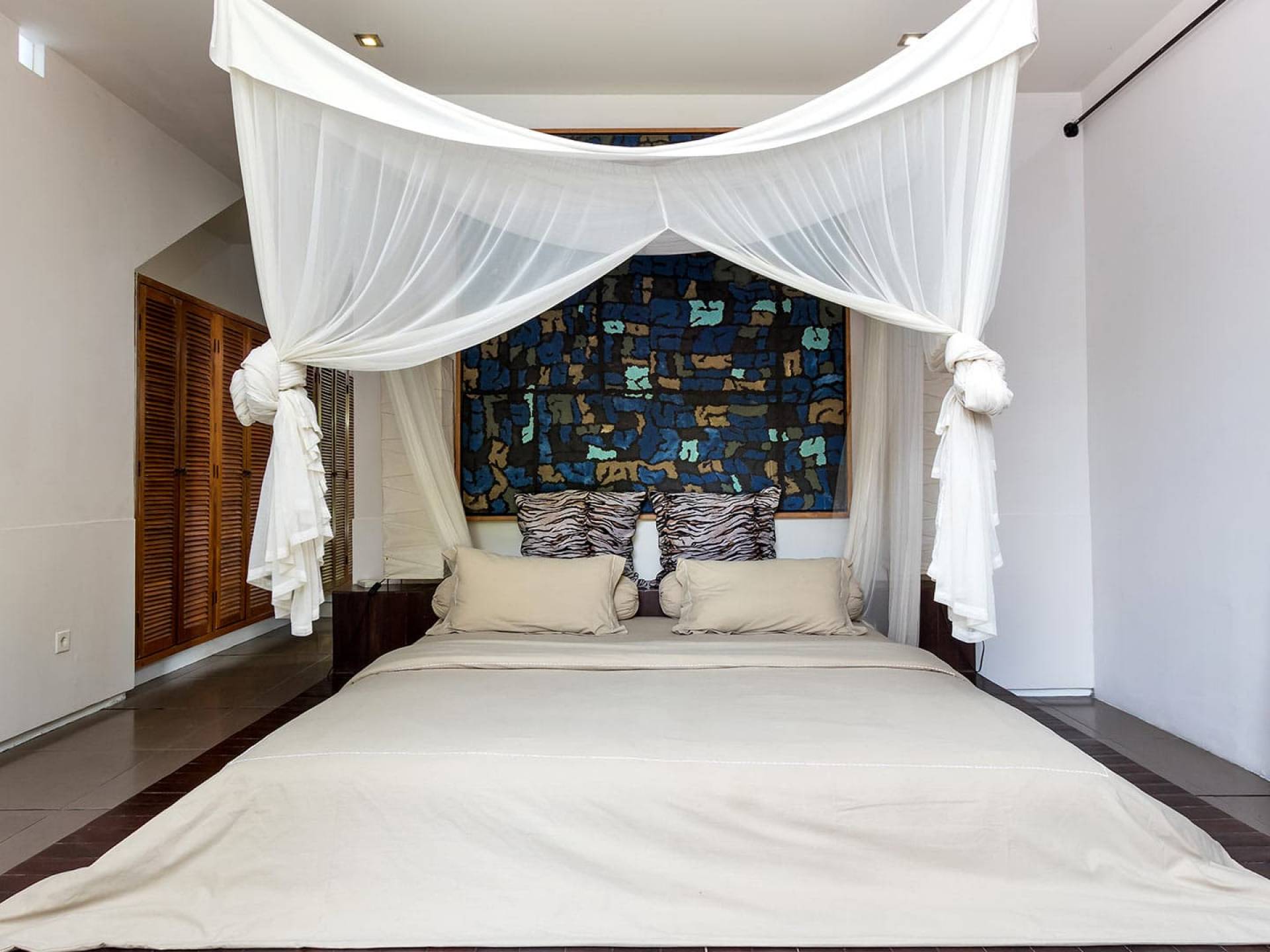 Υπάρχουν 5 τέλεια ξεκούραστες σουίτες βίλας που βρίσκονται μέσα στο κτήμα, η καθεμία πλήρως κλιματιζόμενη και συνοδεύεται από ιδιωτικά τροπικά υπαίθρια ιδιωτικά μπάνια για ντους αλφρέσκο ύφους κάτω από το γαλάζιο ή τον αστέρι. Όλα τα δωμάτια είναι ευρύχωρα, διακοσμημένα με έθνικ έργα τέχνης και υπόκεινται σε φυσικούς γήινους τόνους. Το κύριο υπνοδωμάτιο διαθέτει γυάλινες συρόμενες πόρτες πλήρους μήκους που ανοίγουν κατευθείαν στο κατάστρωμα της πισίνας για εκείνους που τους αρέσει να κάνουν μπάνιο το πρωί. Το king-size κρεβάτι βρίσκεται σε ένα πλάτωμα από ξύλο ντυμένο με κομψές λευκές κουρτίνες. Για ψυχαγωγία, αυτό το δωμάτιο διαθέτει επίσης δορυφορική τηλεόραση με DVD player. Το δωμάτιο συνορεύει με μια ιδιωτική μελέτη, όπου στεγάζεται μια βιβλιοθήκη βιβλίων και DVD. Η μελέτη μετατρέπεται σε επιπλέον υπνοδωμάτιο κατόπιν αιτήματος. Τα δύο υπνοδωμάτια επισκεπτών διαθέτουν επίσης μεγάλα κρεβάτια king size. Η μία από τις συνδέσεις με την κύρια σουίτα, ιδανική για οικογένειες και η άλλη είναι κρυμμένη σε ιδιωτικό στούντιο, με καθιστικό και μικρή κουζίνα.