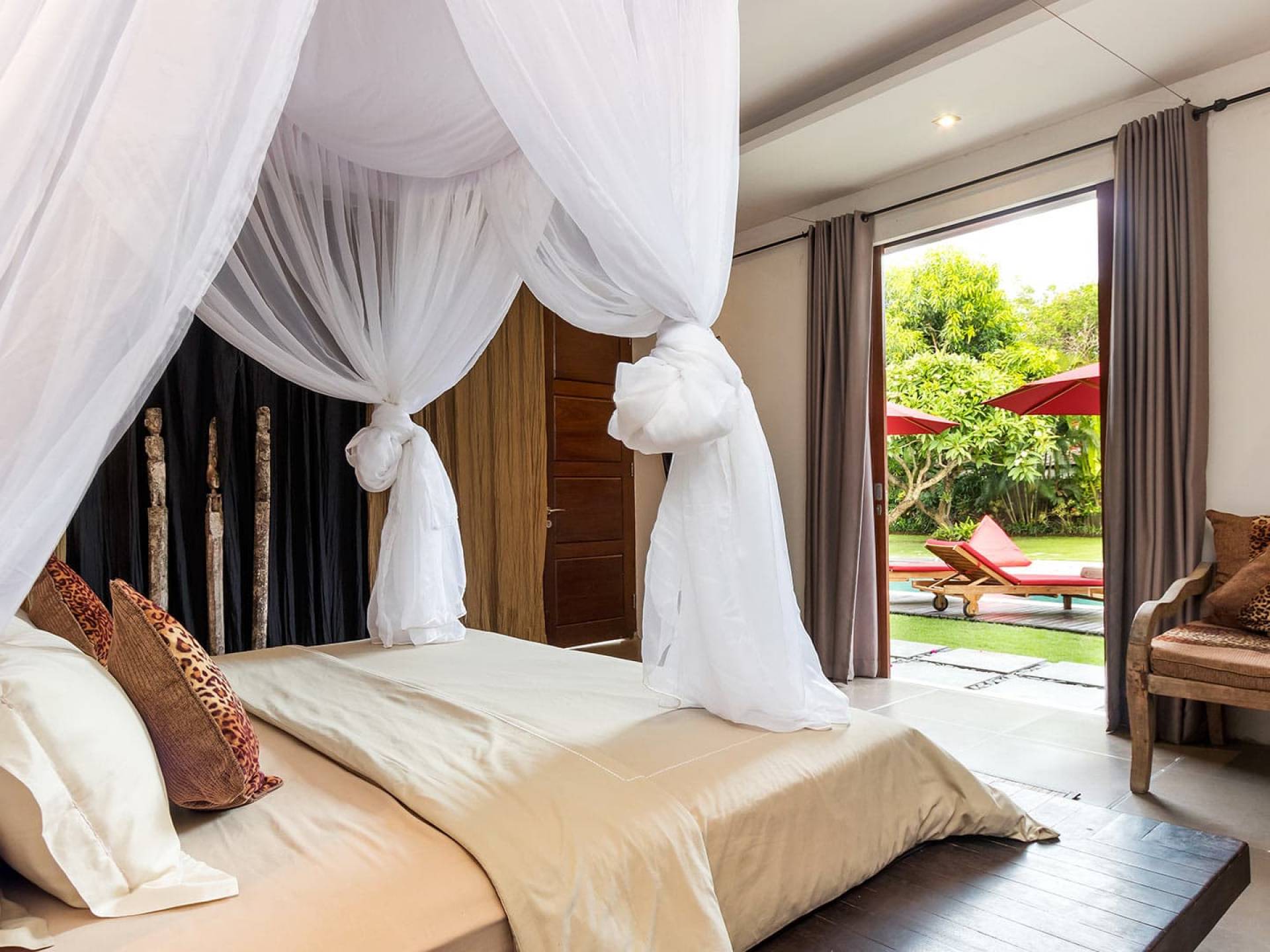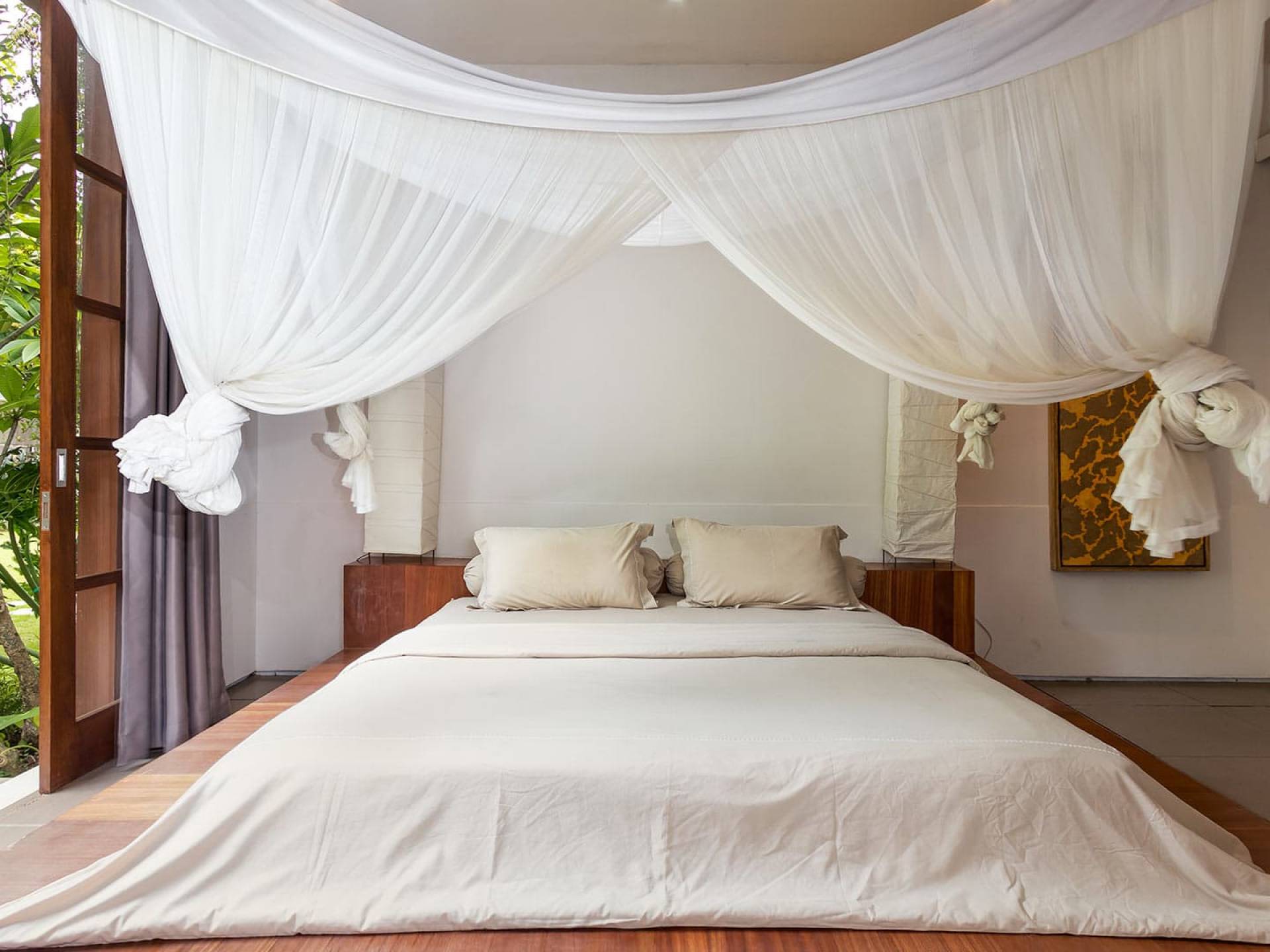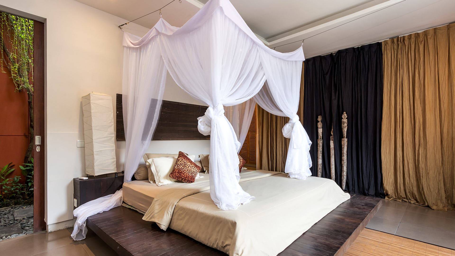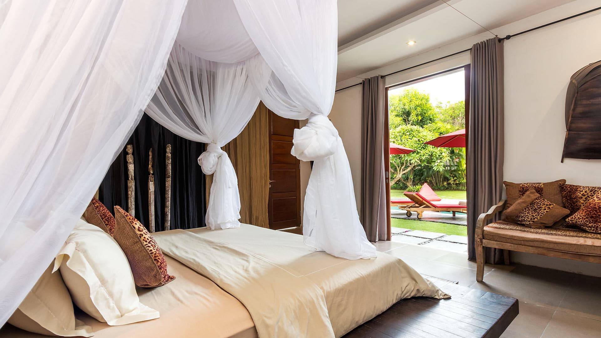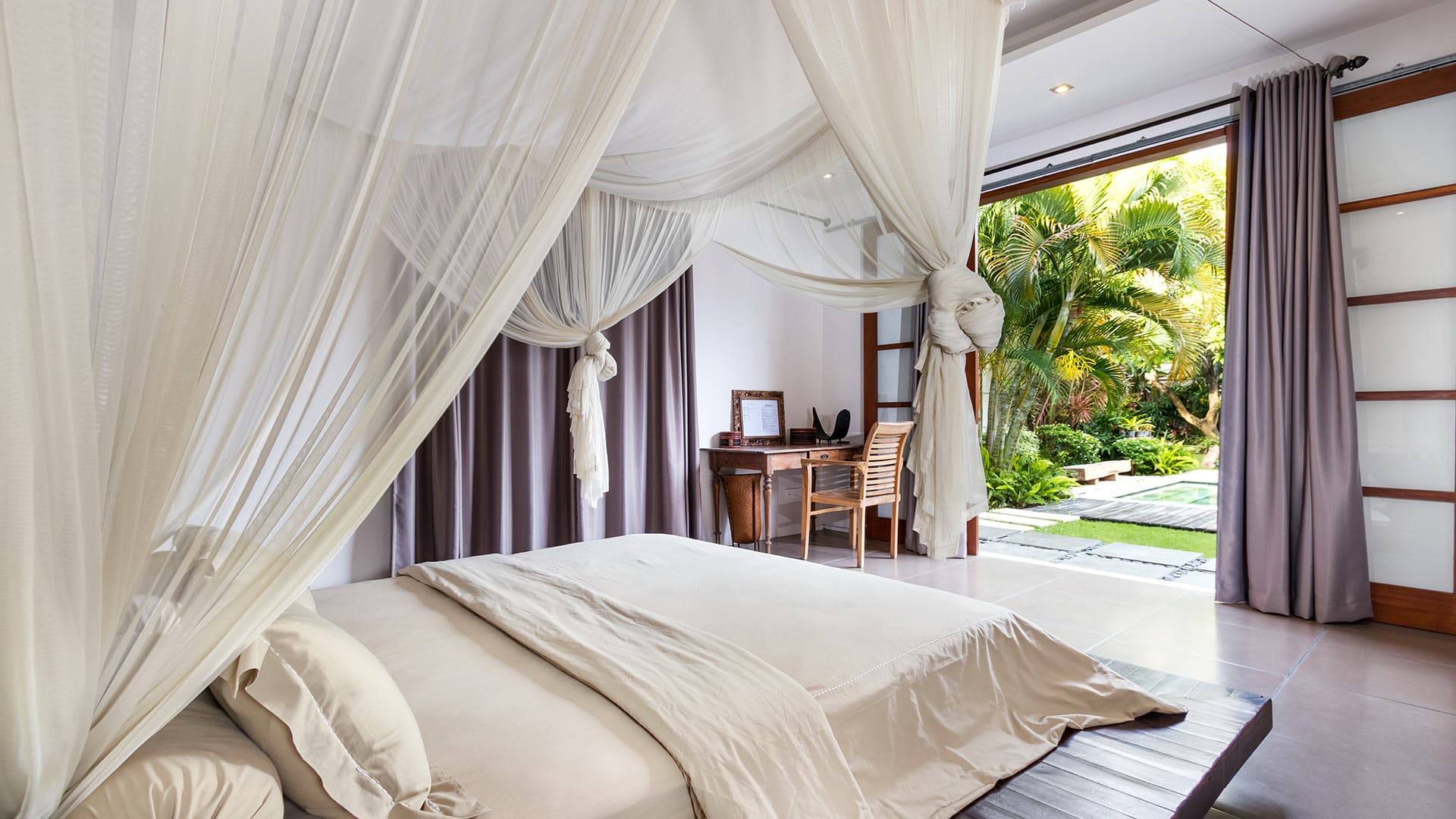 Υπάρχουν 5 τέλεια ξεκούραστες σουίτες βίλας που βρίσκονται μέσα στο κτήμα, η καθεμία πλήρως κλιματιζόμενη και συνοδεύεται από ιδιωτικά τροπικά υπαίθρια ιδιωτικά μπάνια για ντους αλφρέσκο ύφους κάτω από το γαλάζιο ή τον αστέρι. Όλα τα δωμάτια είναι ευρύχωρα, διακοσμημένα με έθνικ έργα τέχνης και υπόκεινται σε φυσικούς γήινους τόνους. Το κύριο υπνοδωμάτιο διαθέτει γυάλινες συρόμενες πόρτες πλήρους μήκους που ανοίγουν κατευθείαν στο κατάστρωμα της πισίνας για εκείνους που τους αρέσει να κάνουν μπάνιο το πρωί. Το king-size κρεβάτι βρίσκεται σε ένα πλάτωμα από ξύλο ντυμένο με κομψές λευκές κουρτίνες. Για ψυχαγωγία, αυτό το δωμάτιο διαθέτει επίσης δορυφορική τηλεόραση με DVD player. Το δωμάτιο συνορεύει με μια ιδιωτική μελέτη, όπου στεγάζεται μια βιβλιοθήκη βιβλίων και DVD. Η μελέτη μετατρέπεται σε επιπλέον υπνοδωμάτιο κατόπιν αιτήματος. Τα δύο υπνοδωμάτια επισκεπτών διαθέτουν επίσης μεγάλα κρεβάτια king size. Η μία από τις συνδέσεις με την κύρια σουίτα, ιδανική για οικογένειες και η άλλη είναι κρυμμένη σε ιδιωτικό στούντιο, με καθιστικό και μικρή κουζίνα.