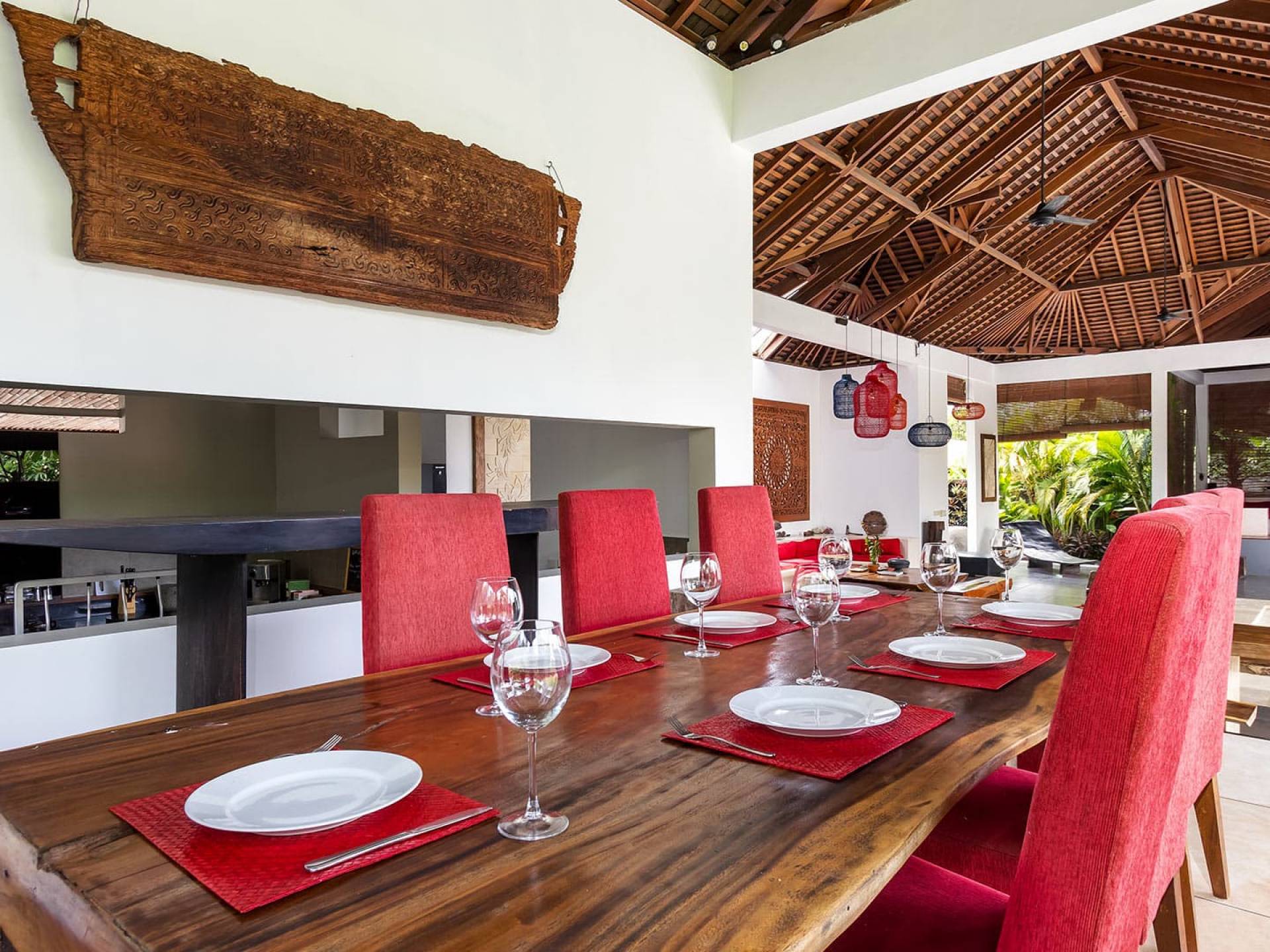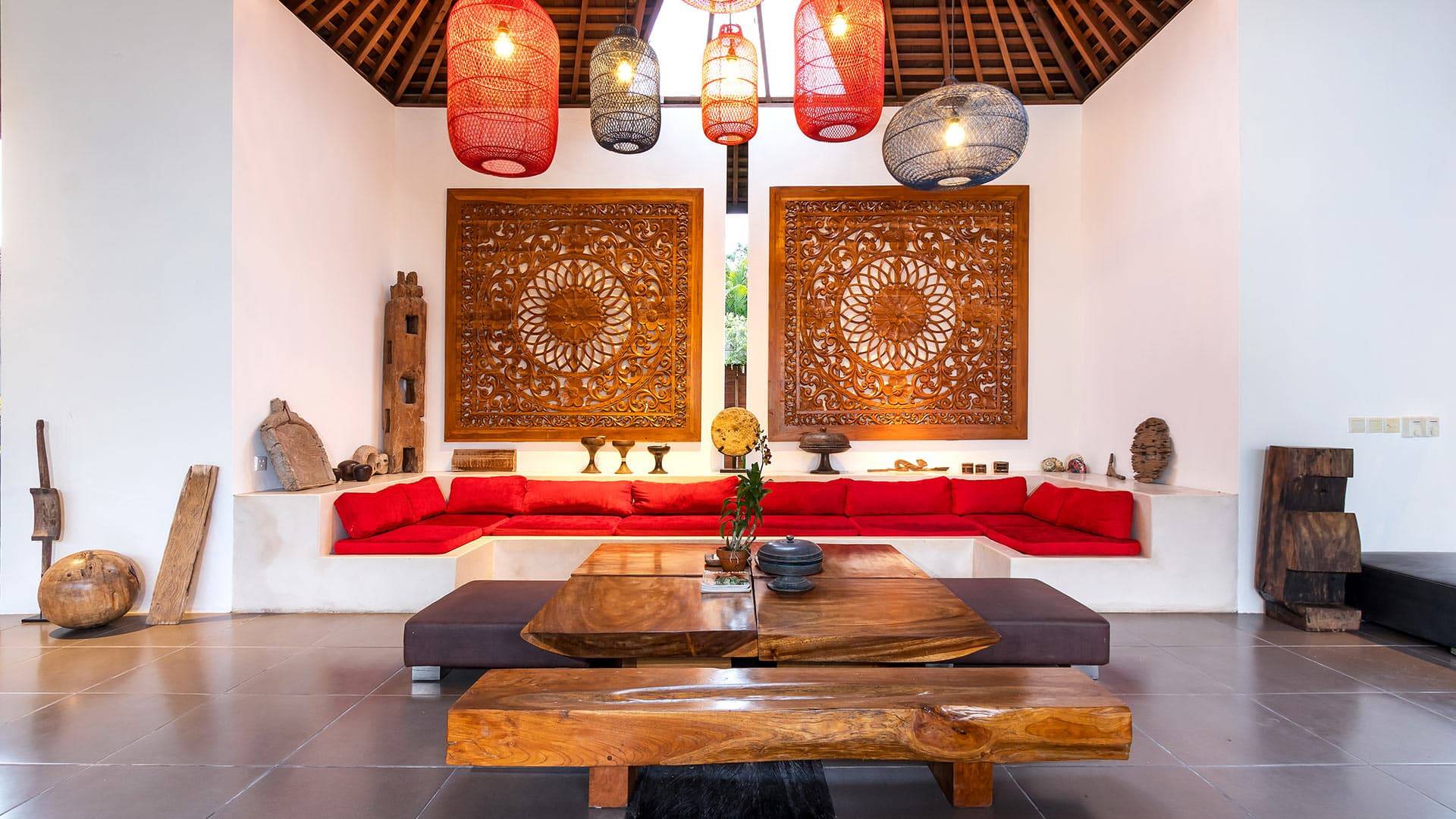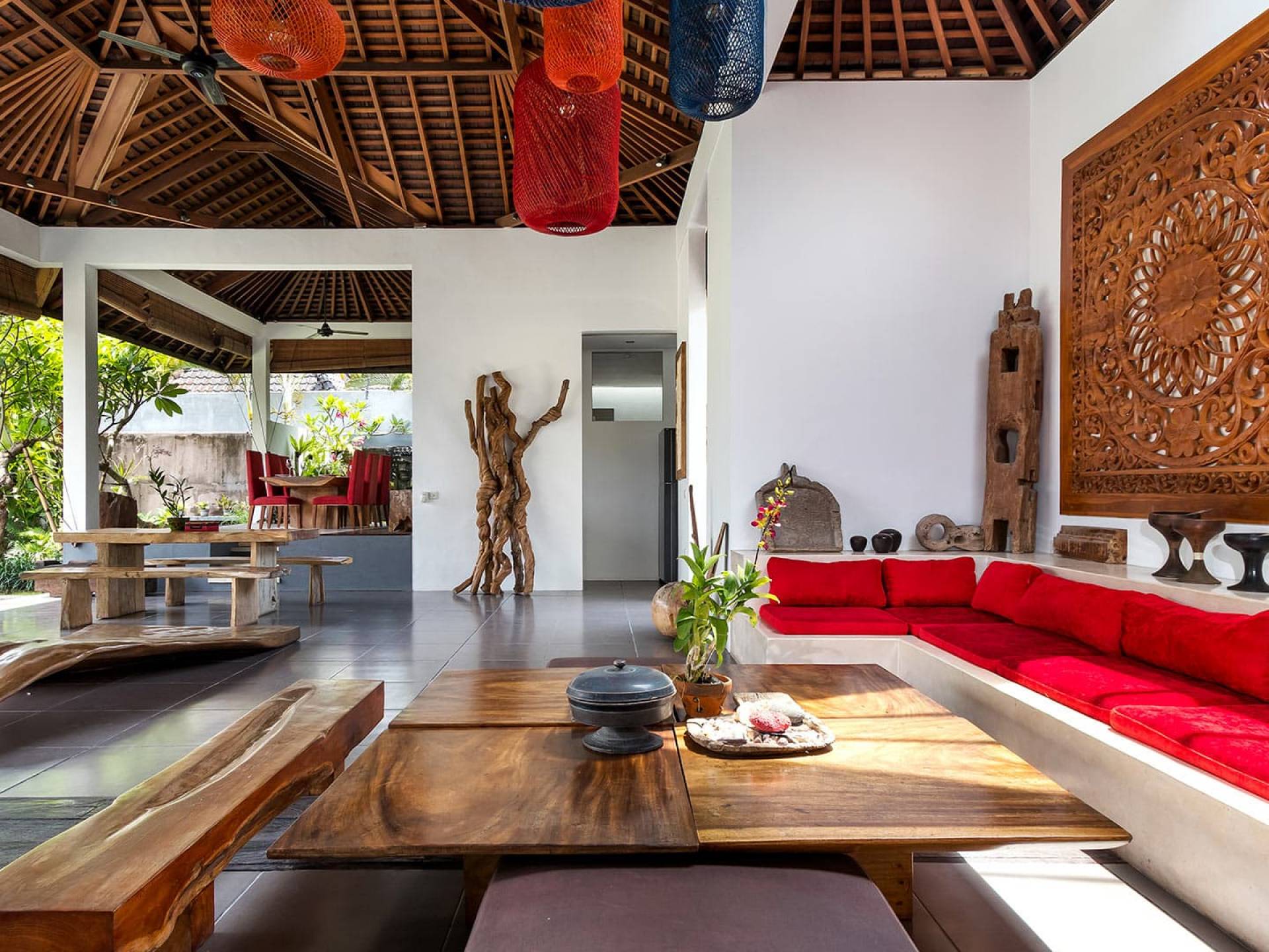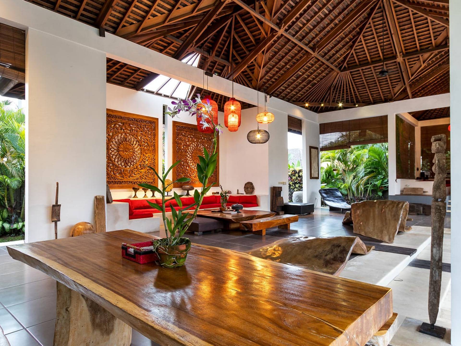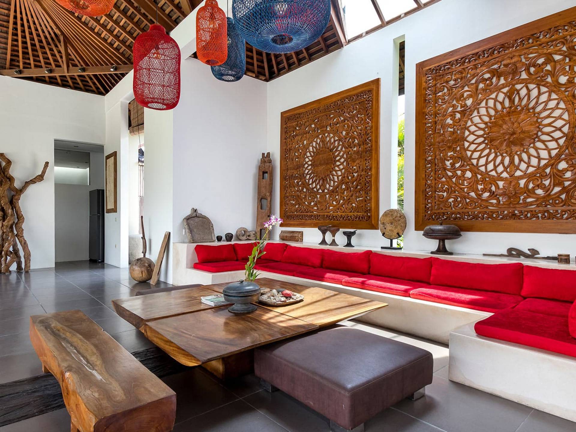 Θα μπείτε στη βίλα Άρτε στο ευρύχωρο και εκλεπτυσμένο, συνδυασμένο σαλόνι και τραπεζαρία της που αγκαλιάζει την τροπική ζωή με υπέροχο αρχιτεκτονικό σχέδιο ενιαίας διαρρύθμισης που δίνει εύκολη πρόσβαση στον όμορφο μεγάλο κήπο και την πισίνα. Ο χώρος έχει ένα εκπληκτικό ανακαινισμένο ξύλινο εσωτερικό από ξύλο τικ, εμπλουτισμένο από μια καταπληκτική συλλογή παραδοσιακών έργων τέχνης και κομψών κόκκινων χρωμάτων, δίνοντας χαρακτήρα. Στη μέση του δωματίου, θα βρείτε τον μεγάλο κόκκινο καναπέ για να χαλαρώσετε, πίνοντας μερικά ωραία κρύα ποτά, ενώ αγναντεύετε τη θέα στον κήπο. Στα δεξιά, υπάρχει η κομψή πτέρυγα τραπεζαρίας τοποθετημένη σε υπερυψωμένη πλατφόρμα και επιπλωμένη με ένα υπέροχο ξύλινο τραπέζι από τικ με 7 κόκκινες καρέκλες. Στην αριστερή γωνία, θα βρείτε το σαλόνι τηλεόρασης, εξοπλισμένο με έναν άλλο μεγάλο κόκκινο καναπέ που βλέπει σε μια τεράστια τηλεόραση επίπεδης οθόνης με DVD player για πλήρη ψυχαγωγία στη βίλα.