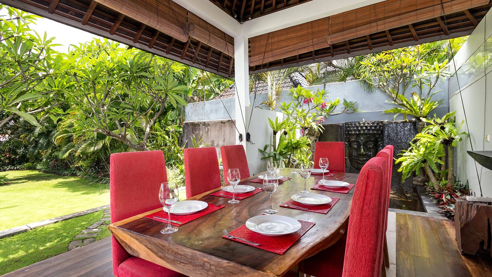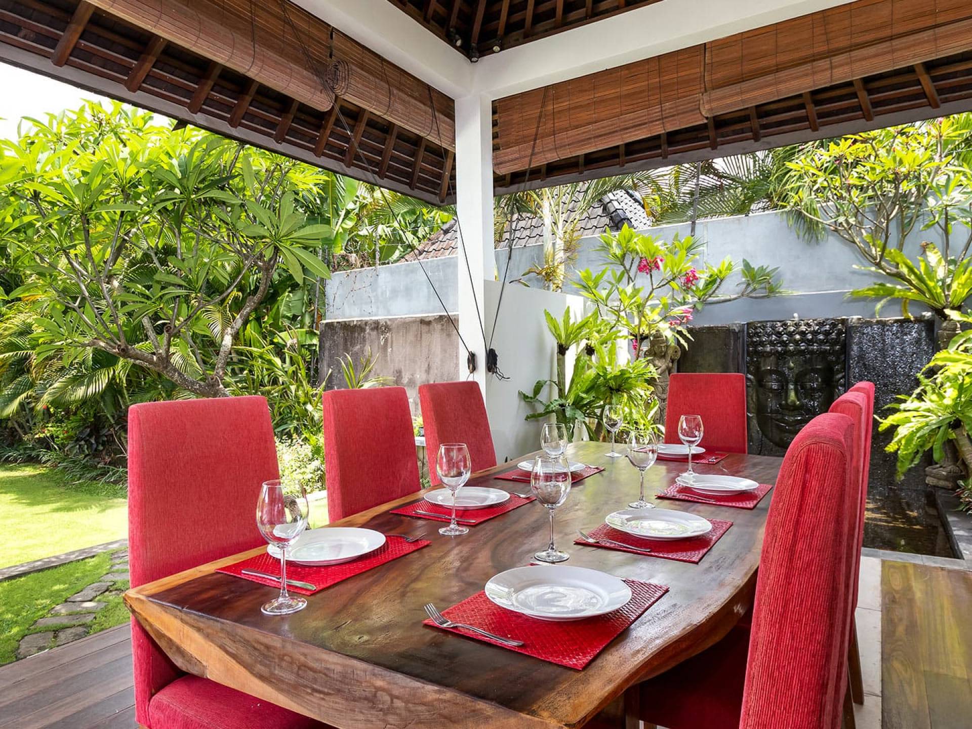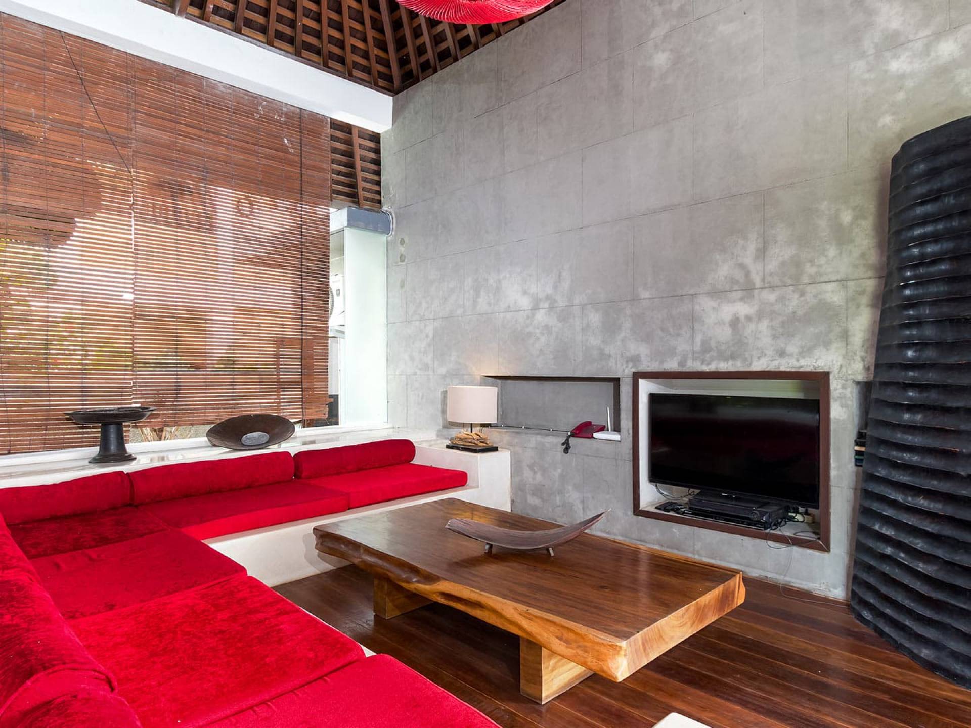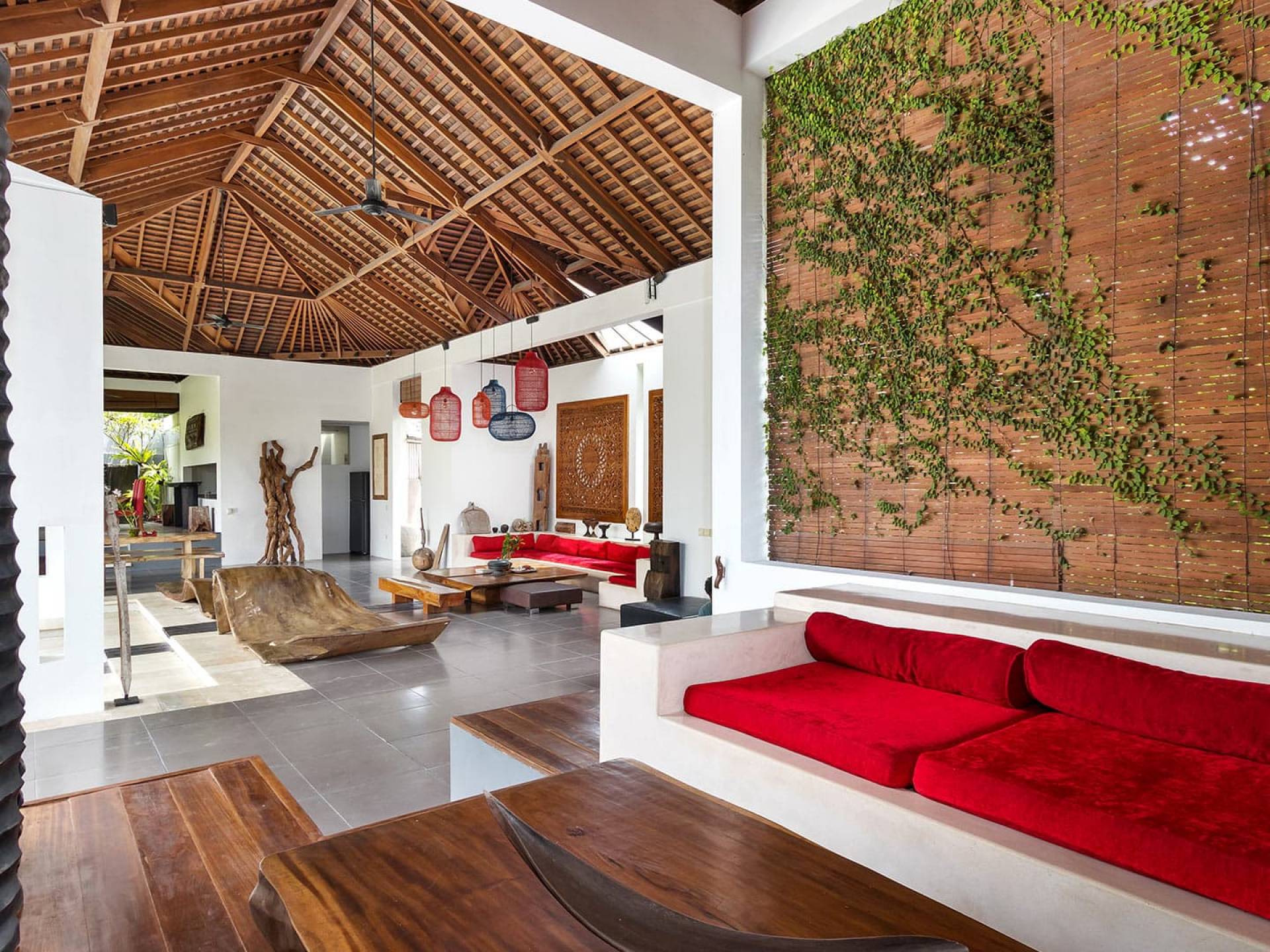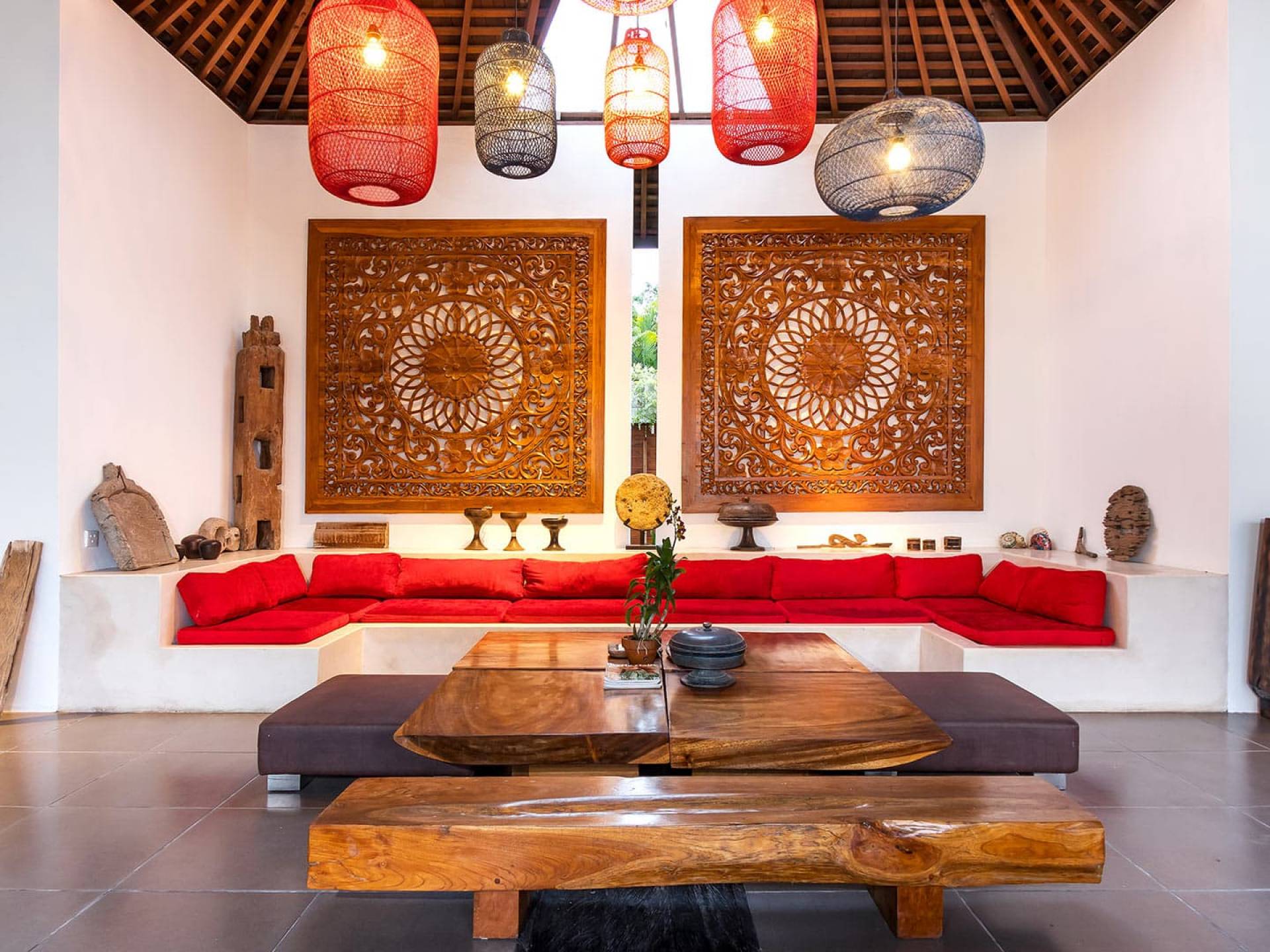 Θα μπείτε στη βίλα Άρτε στο ευρύχωρο και εκλεπτυσμένο, συνδυασμένο σαλόνι και τραπεζαρία της που αγκαλιάζει την τροπική ζωή με υπέροχο αρχιτεκτονικό σχέδιο ενιαίας διαρρύθμισης που δίνει εύκολη πρόσβαση στον όμορφο μεγάλο κήπο και την πισίνα. Ο χώρος έχει ένα εκπληκτικό ανακαινισμένο ξύλινο εσωτερικό από ξύλο τικ, εμπλουτισμένο από μια καταπληκτική συλλογή παραδοσιακών έργων τέχνης και κομψών κόκκινων χρωμάτων, δίνοντας χαρακτήρα. Στη μέση του δωματίου, θα βρείτε τον μεγάλο κόκκινο καναπέ για να χαλαρώσετε, πίνοντας μερικά ωραία κρύα ποτά, ενώ αγναντεύετε τη θέα στον κήπο. Στα δεξιά, υπάρχει η κομψή πτέρυγα τραπεζαρίας τοποθετημένη σε υπερυψωμένη πλατφόρμα και επιπλωμένη με ένα υπέροχο ξύλινο τραπέζι από τικ με 7 κόκκινες καρέκλες. Στην αριστερή γωνία, θα βρείτε το σαλόνι τηλεόρασης, εξοπλισμένο με έναν άλλο μεγάλο κόκκινο καναπέ που βλέπει σε μια τεράστια τηλεόραση επίπεδης οθόνης με DVD player για πλήρη ψυχαγωγία στη βίλα.