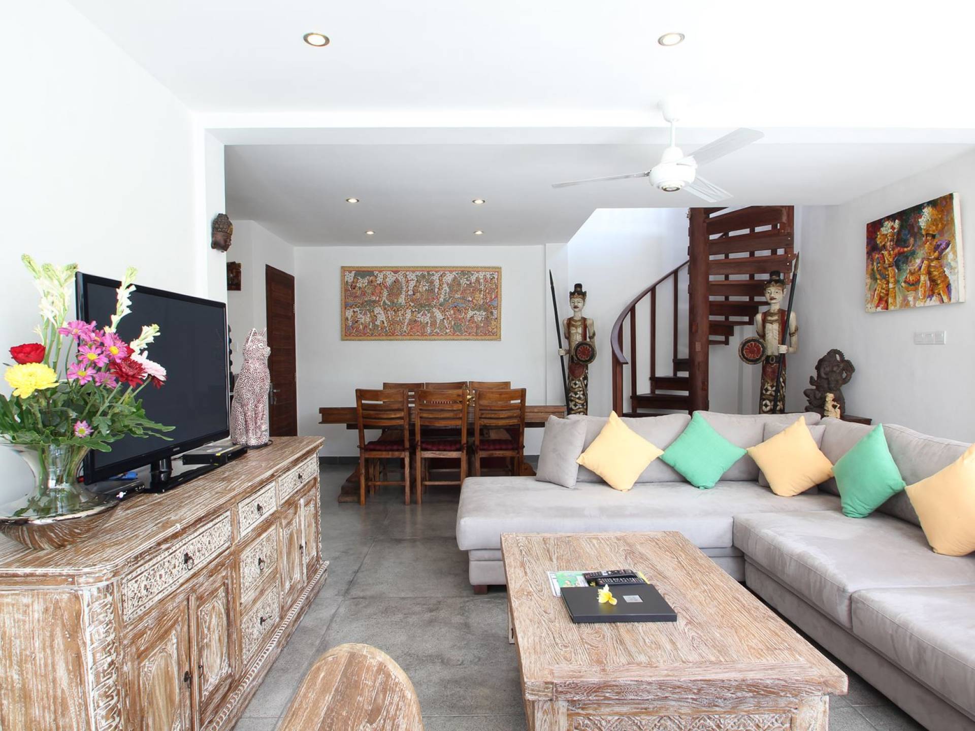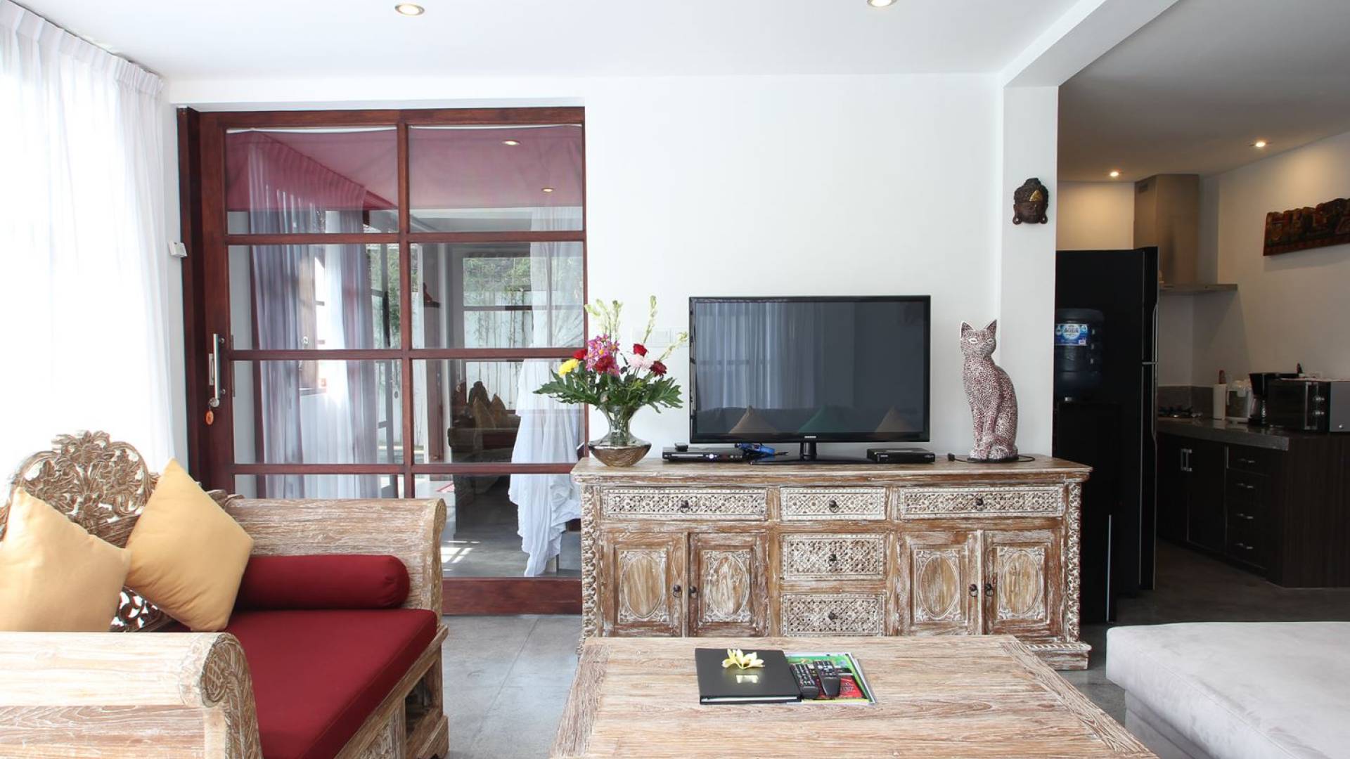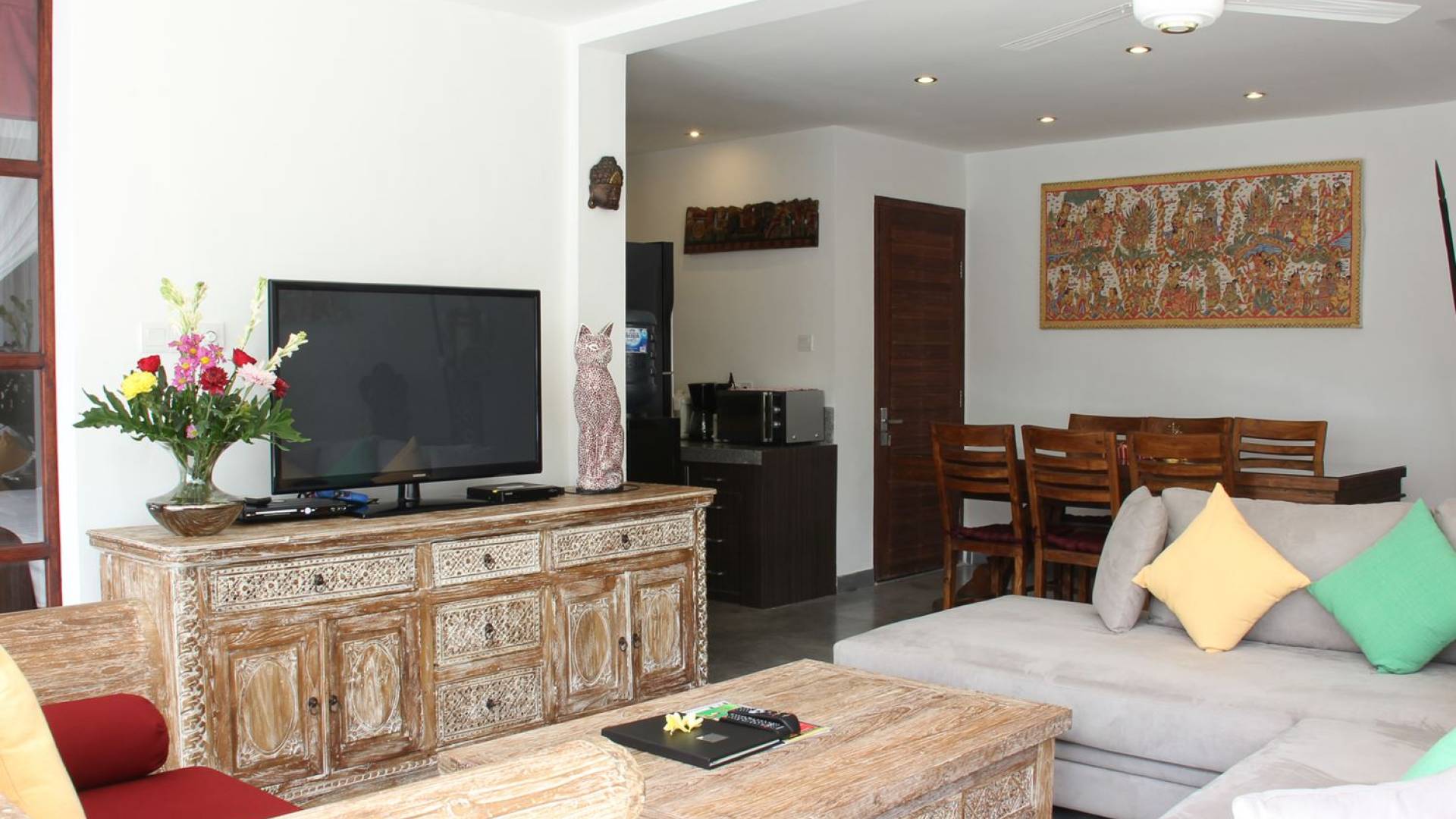 Το φωτεινό σαλόνι έχει σχεδιαστεί με γυάλινες συρόμενες πόρτες σε όλο το μήκος, παρέχοντας εύκολη πρόσβαση στον κήπο και την πισίνα, για μια πραγματική τροπική εμπειρία ζωής. Το σαλόνι είναι επιπλωμένο με έναν όμορφο χειροποίητο μπαλινέζικο καναπέ καθώς και έναν μοντέρνο βελούδινο καναπέ σε σχήμα L για να κουλουριαστεί, ιδανικός για να απολαύσετε ένα φλιτζάνι καφέ το πρωί, επιτρέποντας στον φιλικό πρωινό ήλιο να σας ζεστάνει αργά μέχρι είστε έτοιμοι για την πρώτη σας βουτιά στο αναζωογονητικό νερό της πισίνας. Το βράδυ, αυτό είναι το κοινόχρηστο στέκι της βίλας για να παρακολουθήσετε μια ταινία συνολικά στη μεγάλη τηλεόραση επίπεδης οθόνης με διεθνή κανάλια και ένα DVD player. Πιο πίσω υπάρχει μια τραπεζαρία με γυάλινη κορυφή, σκαλιστή στο χέρι, φτιαγμένη από ανακυκλωμένο ξύλο, που επιτρέπει σε έως και 6 άτομα να δειπνήσουν μαζί ή να απολαύσουν το φρεσκοφτιαγμένο δωρεάν πρωινό που θα σας σερβίρεται κάθε πρωί από το φιλικό προσωπικό της βίλας Βήτα. Η ανοιχτή κουζίνα είναι πλήρως εξοπλισμένη με όλα όσα χρειάζεται η εξοχική σας κατοικία