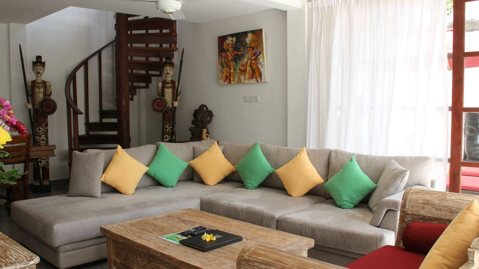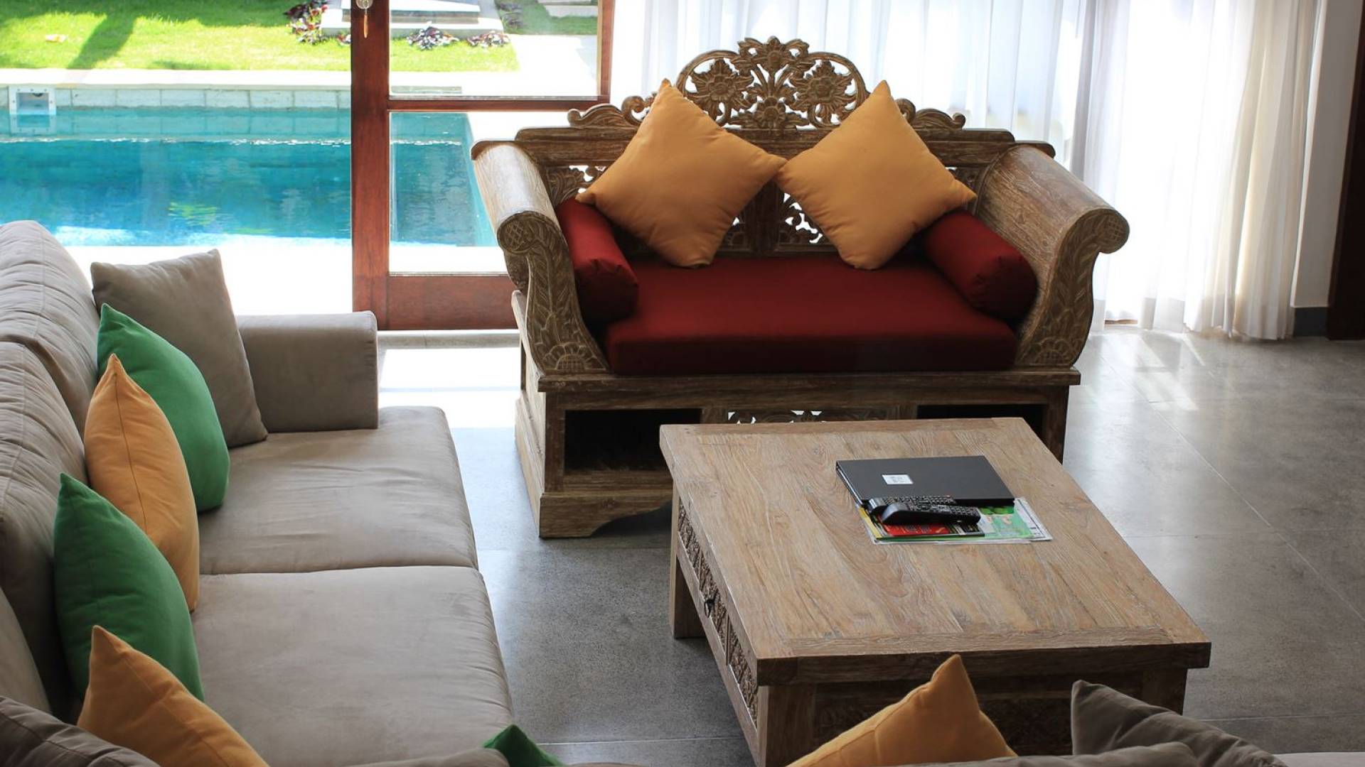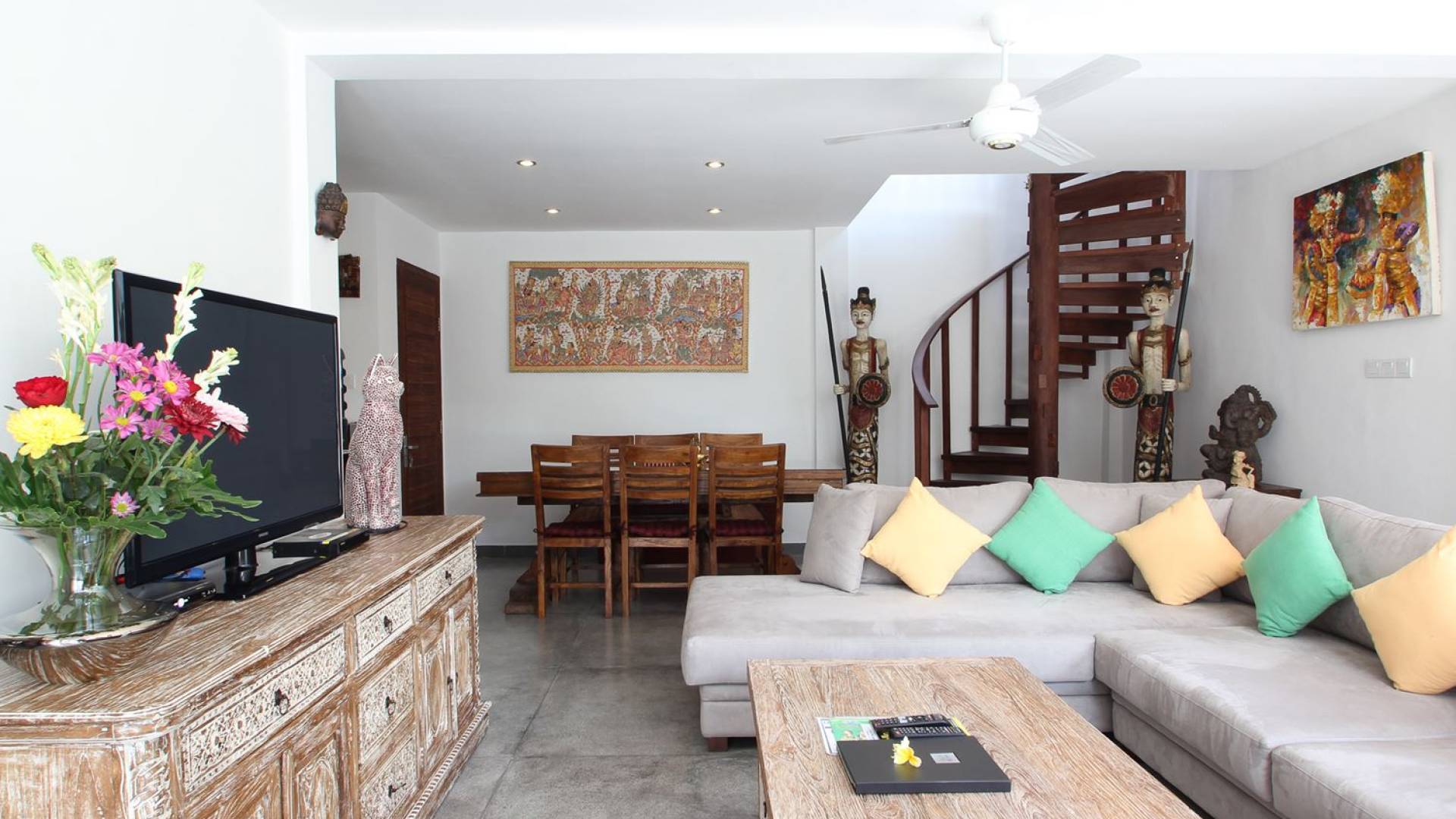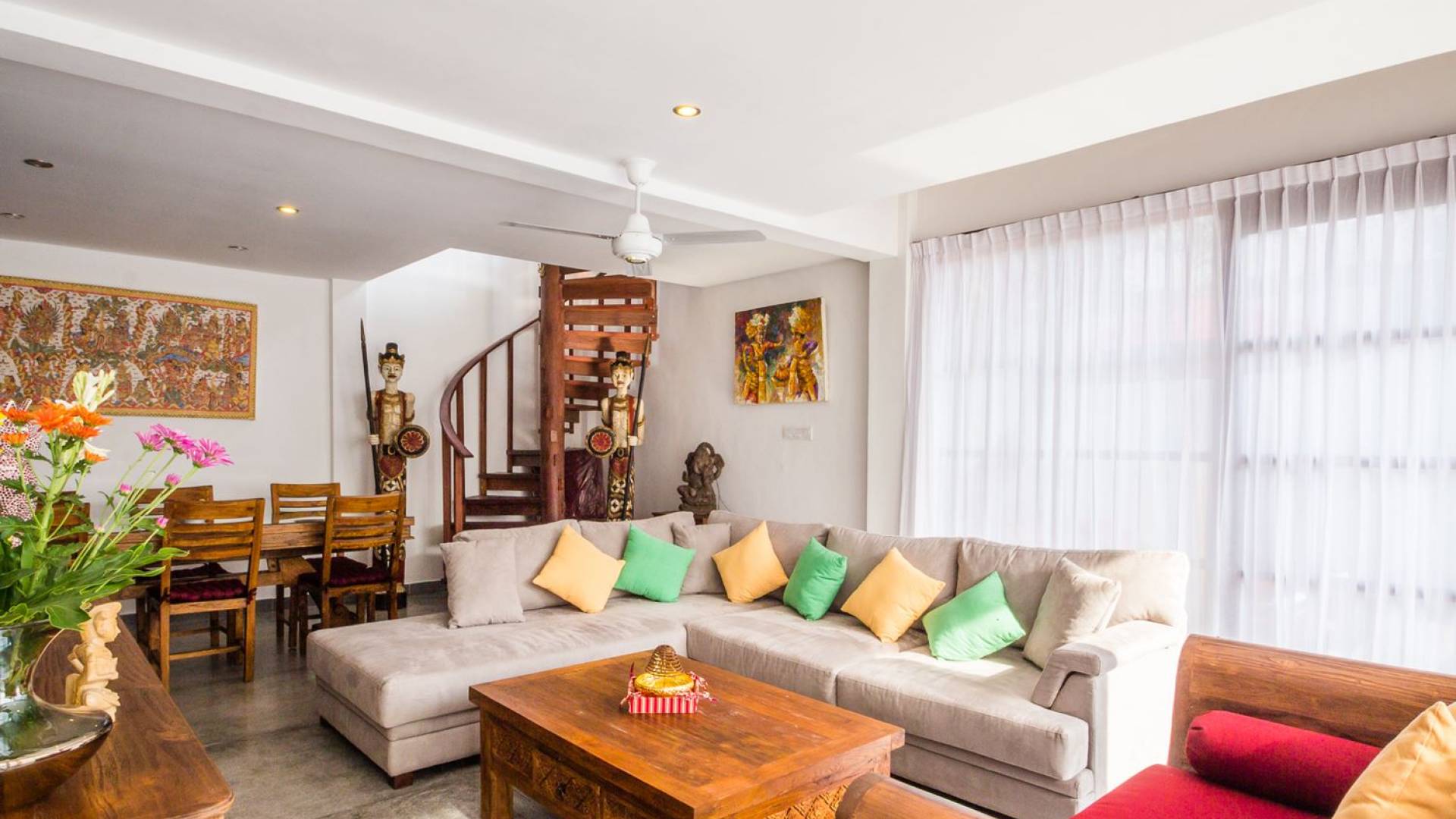 Το φωτεινό σαλόνι έχει σχεδιαστεί με γυάλινες συρόμενες πόρτες σε όλο το μήκος, παρέχοντας εύκολη πρόσβαση στον κήπο και την πισίνα, για μια πραγματική τροπική εμπειρία ζωής. Το σαλόνι είναι επιπλωμένο με έναν όμορφο χειροποίητο μπαλινέζικο καναπέ καθώς και έναν μοντέρνο βελούδινο καναπέ σε σχήμα L για να κουλουριαστεί, ιδανικός για να απολαύσετε ένα φλιτζάνι καφέ το πρωί, επιτρέποντας στον φιλικό πρωινό ήλιο να σας ζεστάνει αργά μέχρι είστε έτοιμοι για την πρώτη σας βουτιά στο αναζωογονητικό νερό της πισίνας. Το βράδυ, αυτό είναι το κοινόχρηστο στέκι της βίλας για να παρακολουθήσετε μια ταινία συνολικά στη μεγάλη τηλεόραση επίπεδης οθόνης με διεθνή κανάλια και ένα DVD player. Πιο πίσω υπάρχει μια τραπεζαρία με γυάλινη κορυφή, σκαλιστή στο χέρι, φτιαγμένη από ανακυκλωμένο ξύλο, που επιτρέπει σε έως και 6 άτομα να δειπνήσουν μαζί ή να απολαύσουν το φρεσκοφτιαγμένο δωρεάν πρωινό που θα σας σερβίρεται κάθε πρωί από το φιλικό προσωπικό της βίλας Βήτα. Η ανοιχτή κουζίνα είναι πλήρως εξοπλισμένη με όλα όσα χρειάζεται η εξοχική σας κατοικία