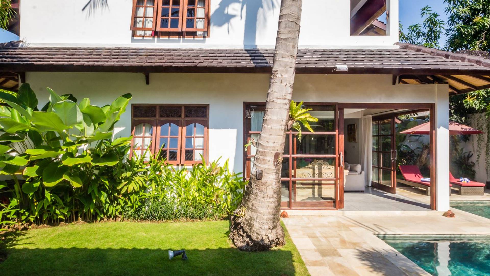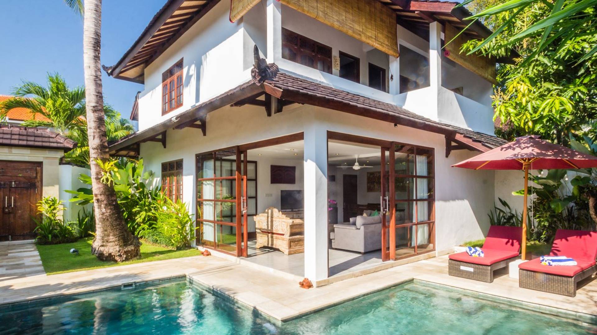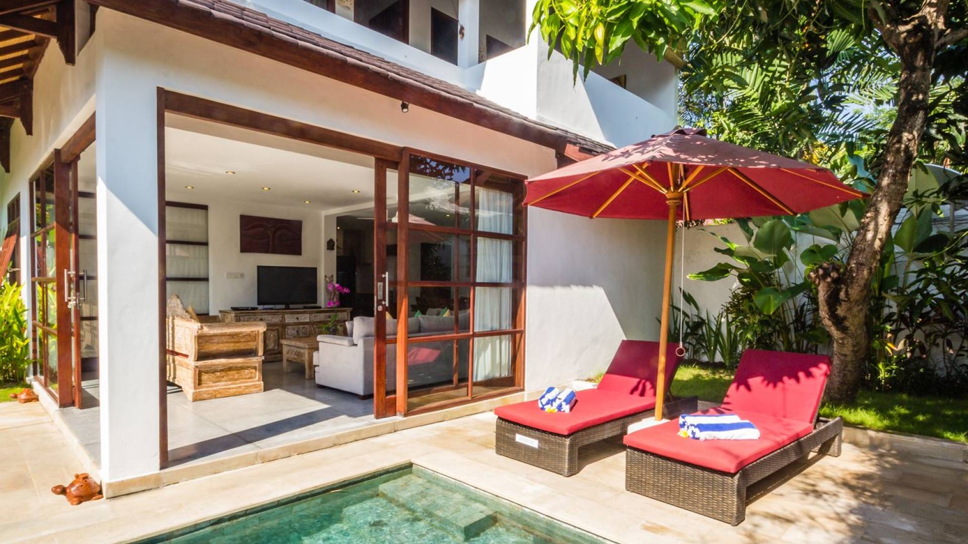 Σας καλωσορίζουμε στον ήσυχο περιφραγμένο κήπο της βίλας, που είναι φυτεμένος με πολλά τροπικά φυτά και πανύψηλα δέντρα. Η αστραφτερή πισίνα σε σχήμα L περιβάλλεται από μια πέτρινη βεράντα με ξαπλώστρες, όπου μπορείτε να χαλαρώσετε τη μέρα, κάνοντας ηλιοθεραπεία υπό τον ήχο του κυματισμού του νερού από τον καταρράκτη με το πρόσωπο του Βούδα ή διαβάζοντας ένα βιβλίο στη σκιά του μεγάλη κόκκινη ομπρέλα. Το κιόσκι με ανάκλιντρο, κρυμμένο στη γωνία του κήπου, είναι απλά τέλειο για να απολαύσετε ένα παραδοσιακό μπαλινέζικο μασάζ στην άνετη ατμόσφαιρα του δικού σας εξοχικού σπιτιού για να νιώσετε ξανά αναγεννημένοι.