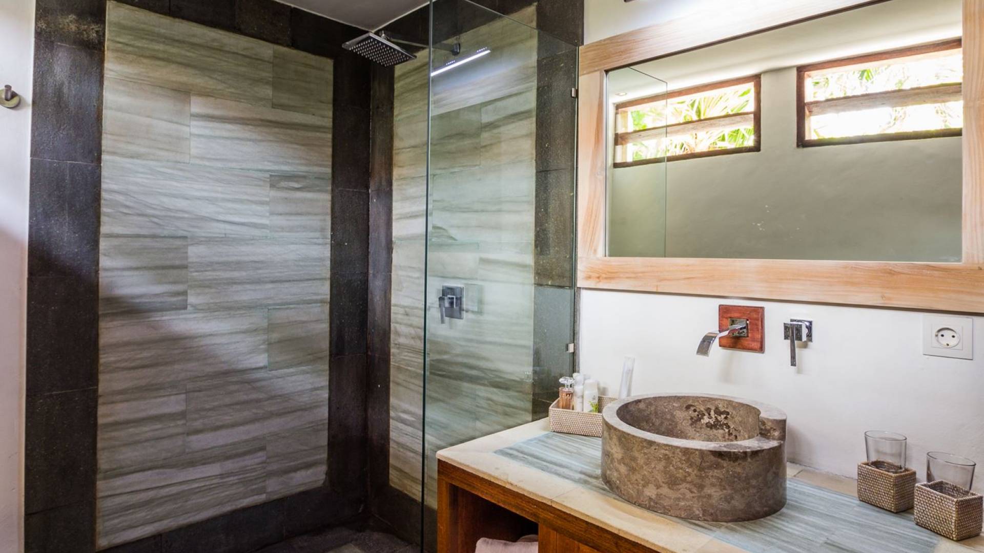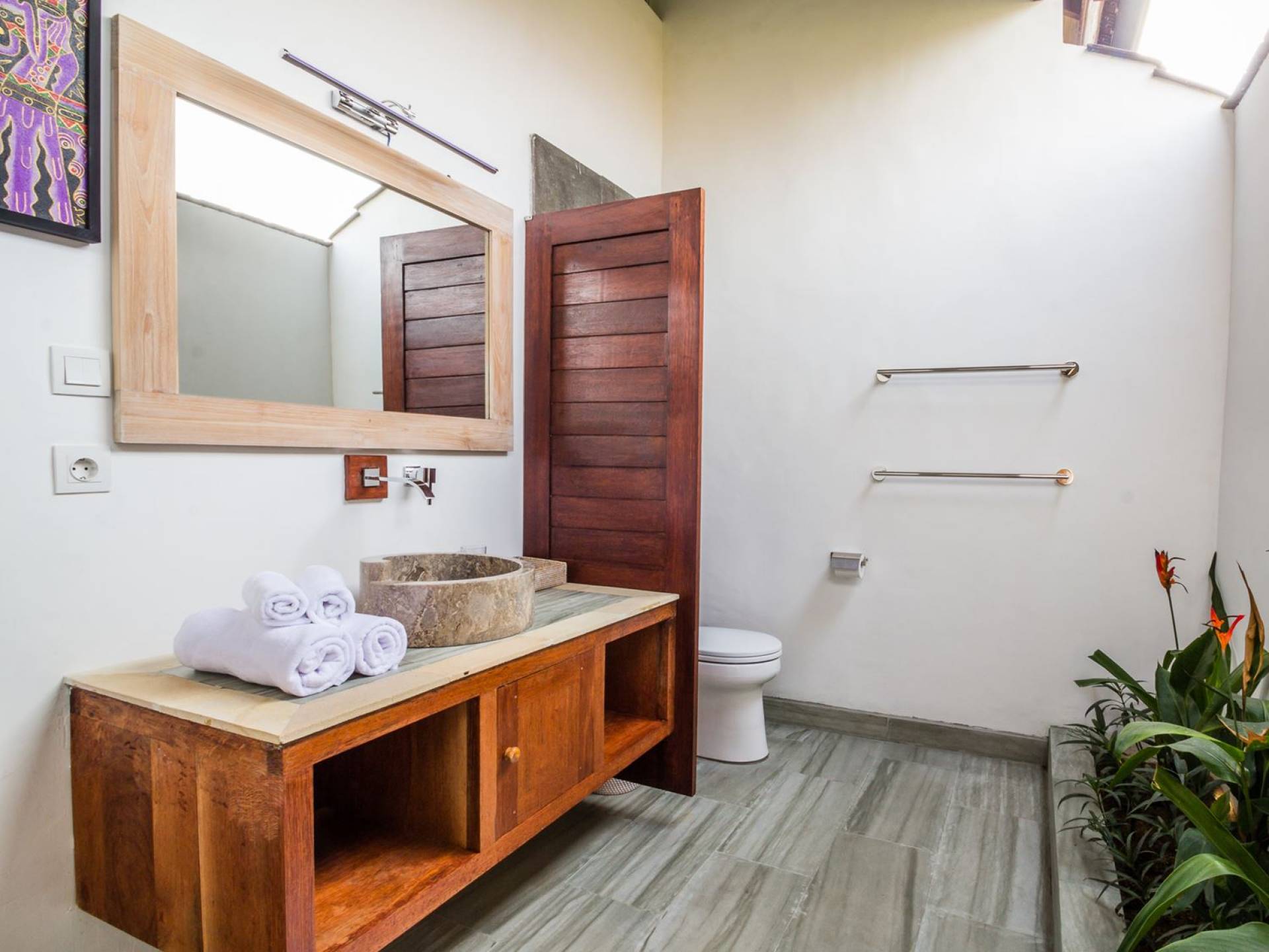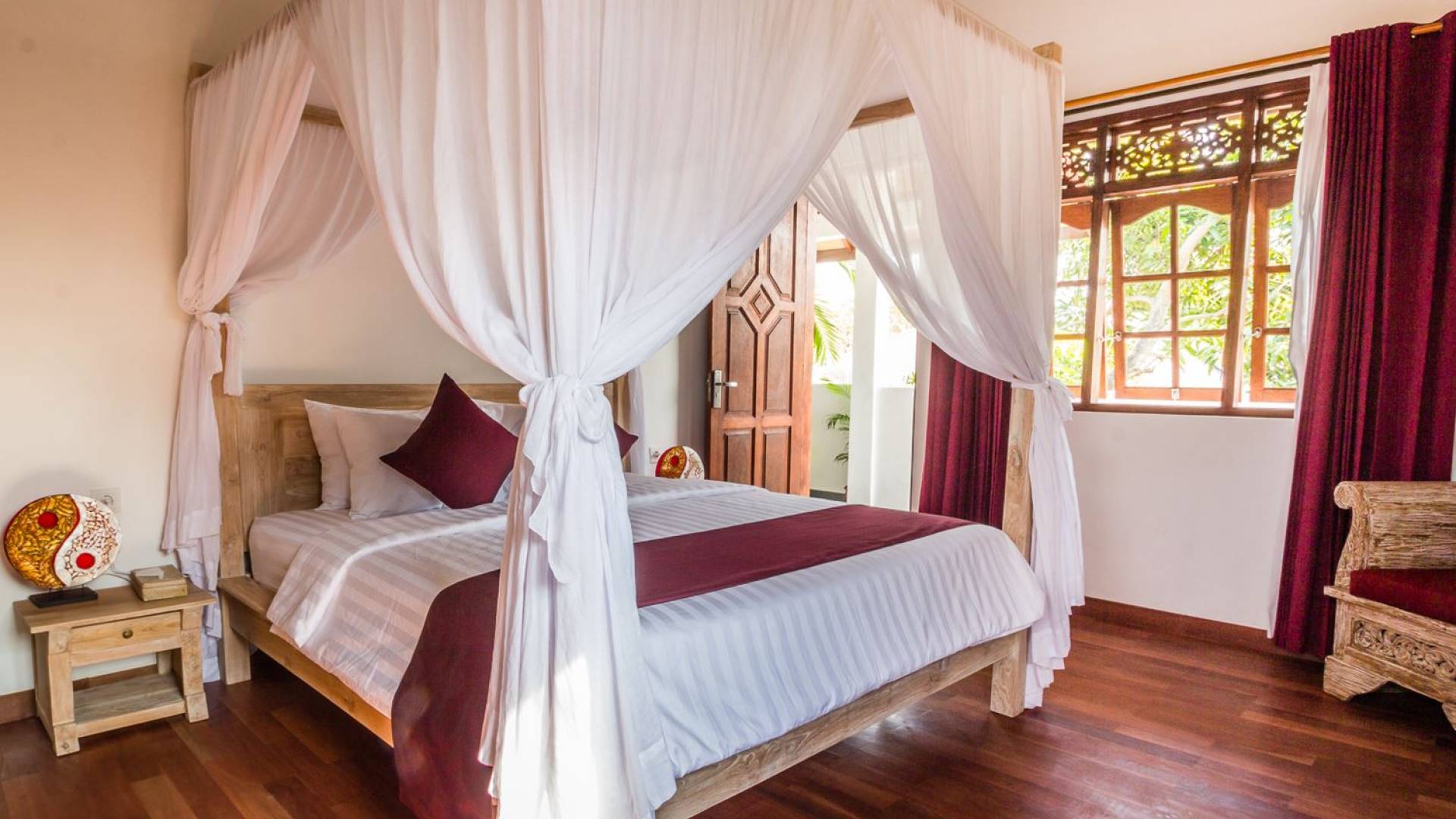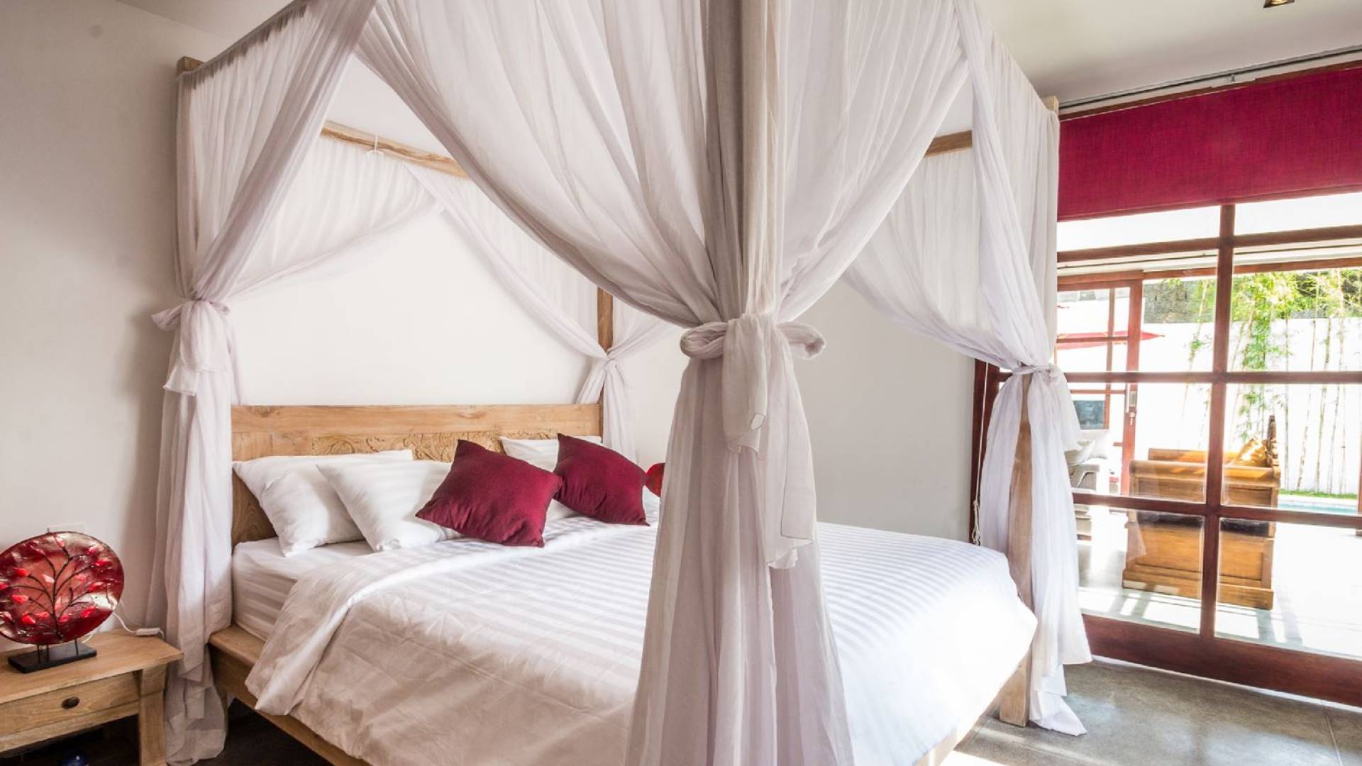 Σας καλωσορίζουμε στον ήσυχο περιφραγμένο κήπο της βίλας, που είναι φυτεμένος με πολλά τροπικά φυτά και πανύψηλα δέντρα. Η αστραφτερή πισίνα σε σχήμα L περιβάλλεται από μια πέτρινη βεράντα με ξαπλώστρες, όπου μπορείτε να χαλαρώσετε τη μέρα, κάνοντας ηλιοθεραπεία υπό τον ήχο του κυματισμού του νερού από τον καταρράκτη με το πρόσωπο του Βούδα ή διαβάζοντας ένα βιβλίο στη σκιά του μεγάλη κόκκινη ομπρέλα. Το κιόσκι με ανάκλιντρο, κρυμμένο στη γωνία του κήπου, είναι απλά τέλειο για να απολαύσετε ένα παραδοσιακό μπαλινέζικο μασάζ στην άνετη ατμόσφαιρα του δικού σας εξοχικού σπιτιού για να νιώσετε ξανά αναγεννημένοι.
