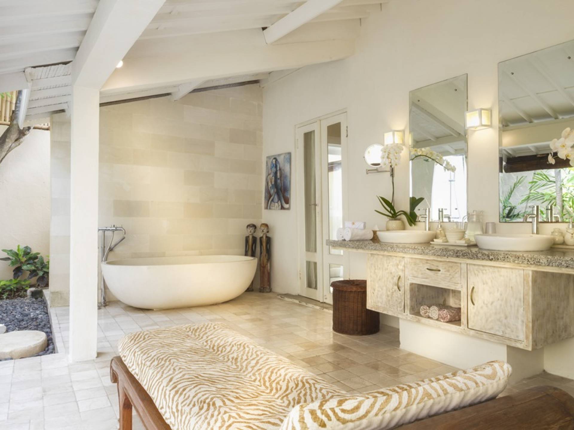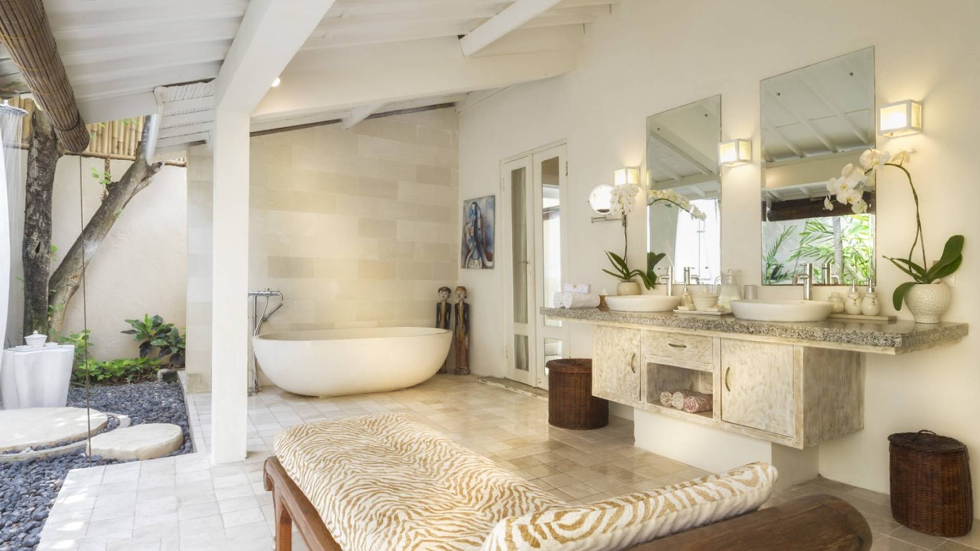 Ένα υπαίθριο μπάνιο διαθέτει αυτόνομη μπανιέρα από βεράντα, όπου οι επισκέπτες μπορούν να χαλαρώσουν και να απολαύσουν το αεράκι σε αυτόν τον μπαλινέζικο παράδεισο της ηρεμίας. Ένας πολυτελής πολυθρόνας με εκτύπωση στη ζούγκλα βλέπει σε έναν πέτρινο και φυτεμένο κήπο με υπαίθριο ντους.