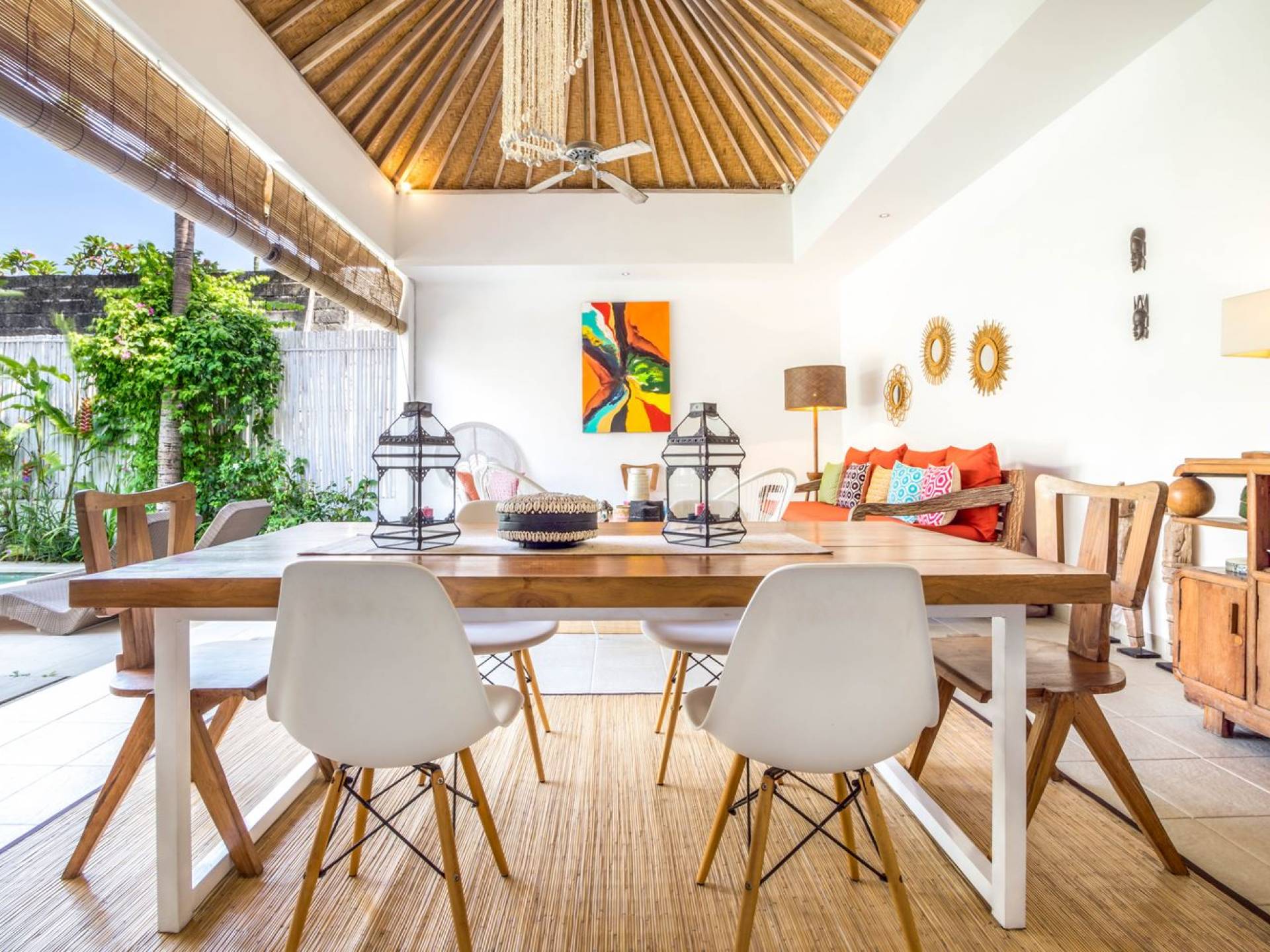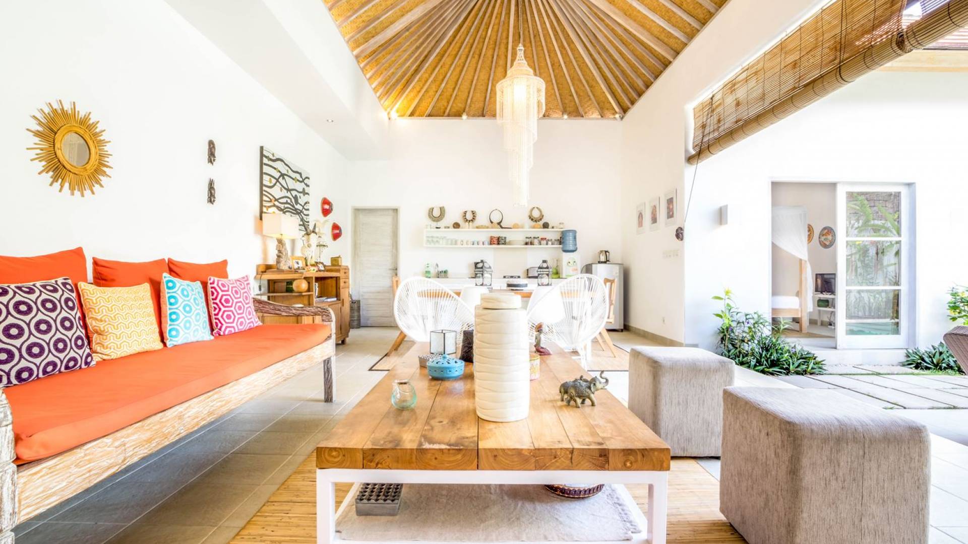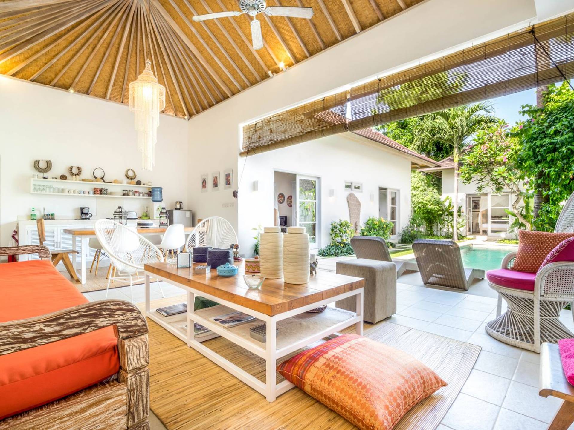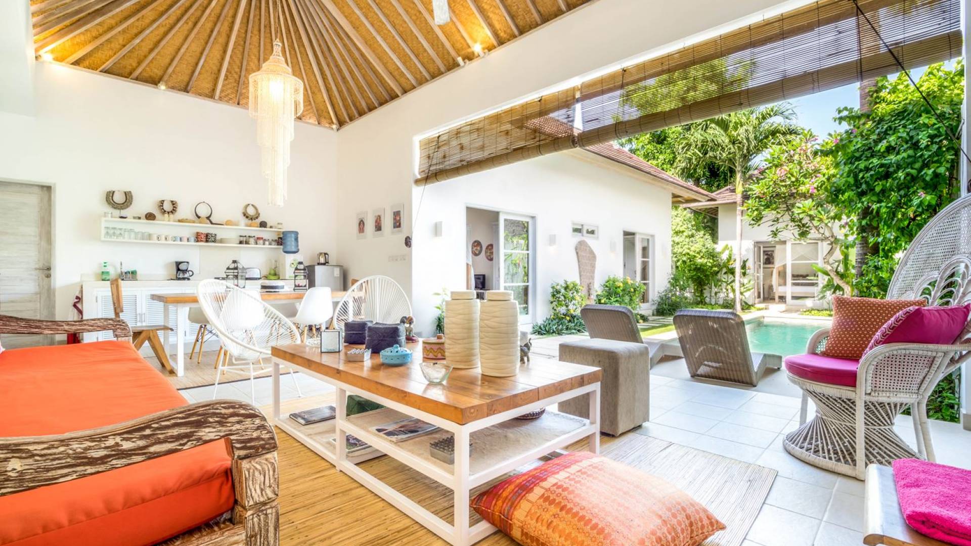 Το ζωντανό κιόσκι έχει υπέροχο σχεδιασμό ενιαίας διαρρύθμισης, που αγκαλιάζει τον τροπικό τρόπο ζωής και παρέχει εύκολη πρόσβαση στην πισίνα. Αυτό είναι επίσης χρήσιμο όταν οι γονείς θέλουν να χαλαρώσουν με ένα καλό ποτήρι κρασί, έχοντας ακόμα τη δυνατότητα να παρακολουθούν τα παιδιά που παίζουν έξω στην πισίνα. Κάτω από την ψηλή παραδοσιακή ταράτσα, η εσωτερική διακόσμηση του σαλονιού κυριαρχείται από έντονα χρώματα, έργα τέχνης και έπιπλα από το Μπαλί. Στη μία πλευρά βρίσκεται μια άνετη, άνετη γωνιά σαλονιού με έναν μπαλινέζικο καναπέ, μια δερμάτινη καρέκλα και μια μοναδική καρέκλα βασιλιά, όλα στρωμένα με μαξιλάρια σε φωτεινά χρώματα. Αυτό κάνει το τέλειο μέρος για να καθίσετε μαζί, να απολαύσετε ποτά, να διαβάσετε ένα βιβλίο ή να παρακολουθήσετε τηλεόραση το βράδυ. Τα γεύματα απολαμβάνετε στην όμορφη τραπεζαρία από ξύλο τικ για έξι άτομα και η κουζίνα είναι καλά εξοπλισμένη για την απόλυτη άνεση στο σπίτι σας στο νησί του Μπαλί.
