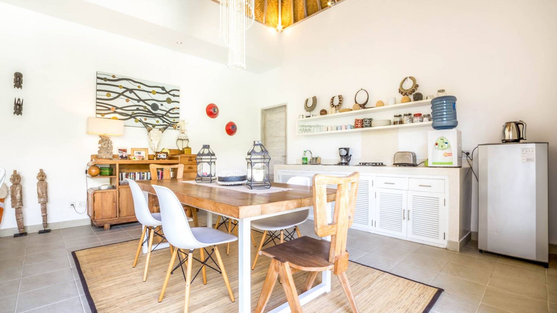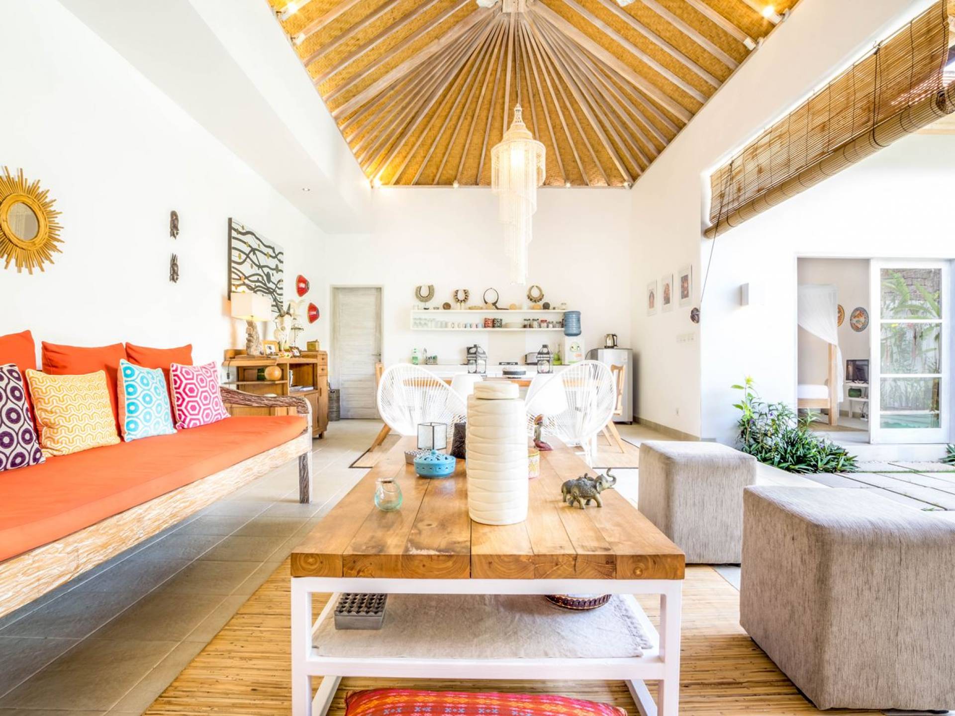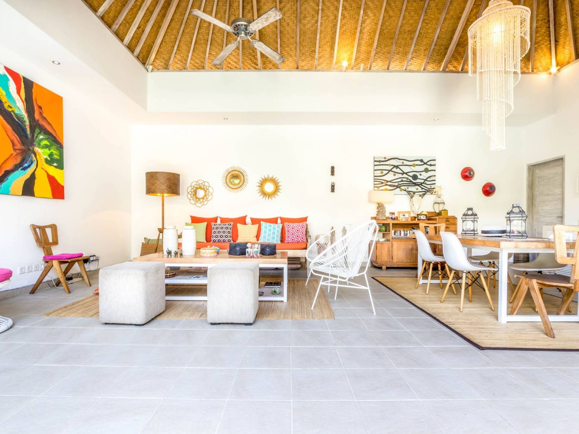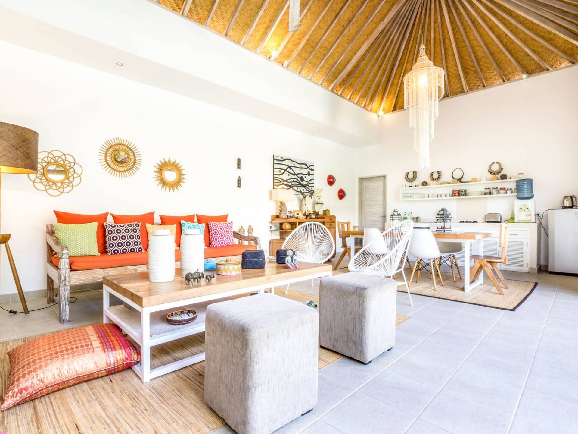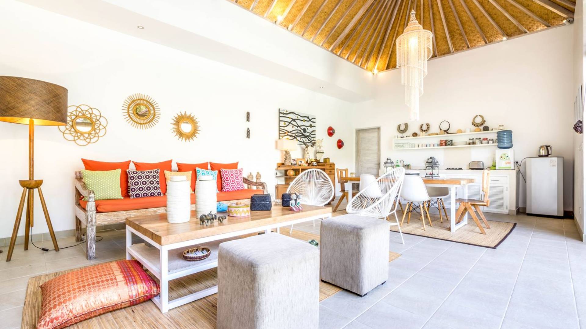 Το ζωντανό κιόσκι έχει υπέροχο σχεδιασμό ενιαίας διαρρύθμισης, που αγκαλιάζει τον τροπικό τρόπο ζωής και παρέχει εύκολη πρόσβαση στην πισίνα. Αυτό είναι επίσης χρήσιμο όταν οι γονείς θέλουν να χαλαρώσουν με ένα καλό ποτήρι κρασί, έχοντας ακόμα τη δυνατότητα να παρακολουθούν τα παιδιά που παίζουν έξω στην πισίνα. Κάτω από την ψηλή παραδοσιακή ταράτσα, η εσωτερική διακόσμηση του σαλονιού κυριαρχείται από έντονα χρώματα, έργα τέχνης και έπιπλα από το Μπαλί. Στη μία πλευρά βρίσκεται μια άνετη, άνετη γωνιά σαλονιού με έναν μπαλινέζικο καναπέ, μια δερμάτινη καρέκλα και μια μοναδική καρέκλα βασιλιά, όλα στρωμένα με μαξιλάρια σε φωτεινά χρώματα. Αυτό κάνει το τέλειο μέρος για να καθίσετε μαζί, να απολαύσετε ποτά, να διαβάσετε ένα βιβλίο ή να παρακολουθήσετε τηλεόραση το βράδυ. Τα γεύματα απολαμβάνετε στην όμορφη τραπεζαρία από ξύλο τικ για έξι άτομα και η κουζίνα είναι καλά εξοπλισμένη για την απόλυτη άνεση στο σπίτι σας στο νησί του Μπαλί.